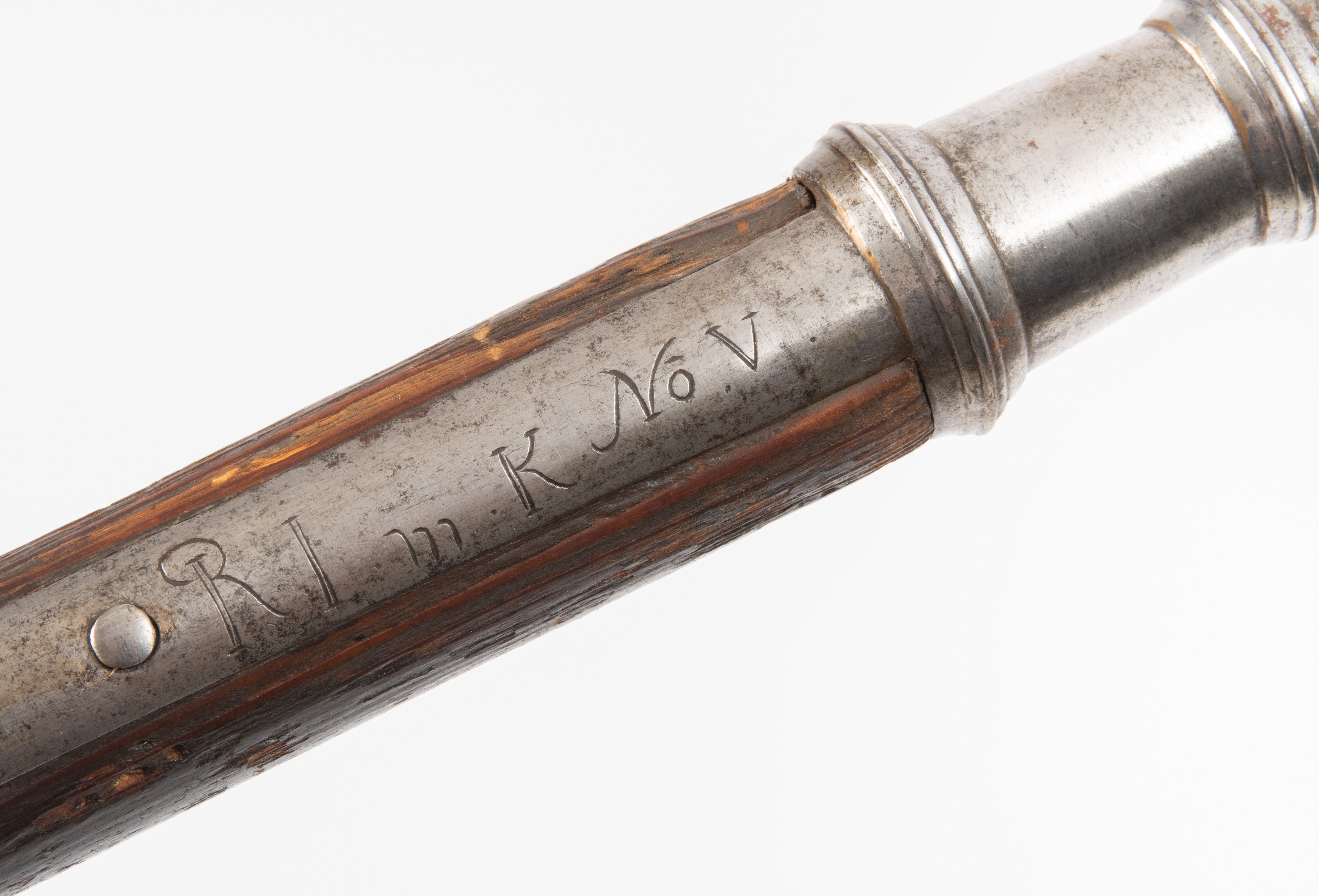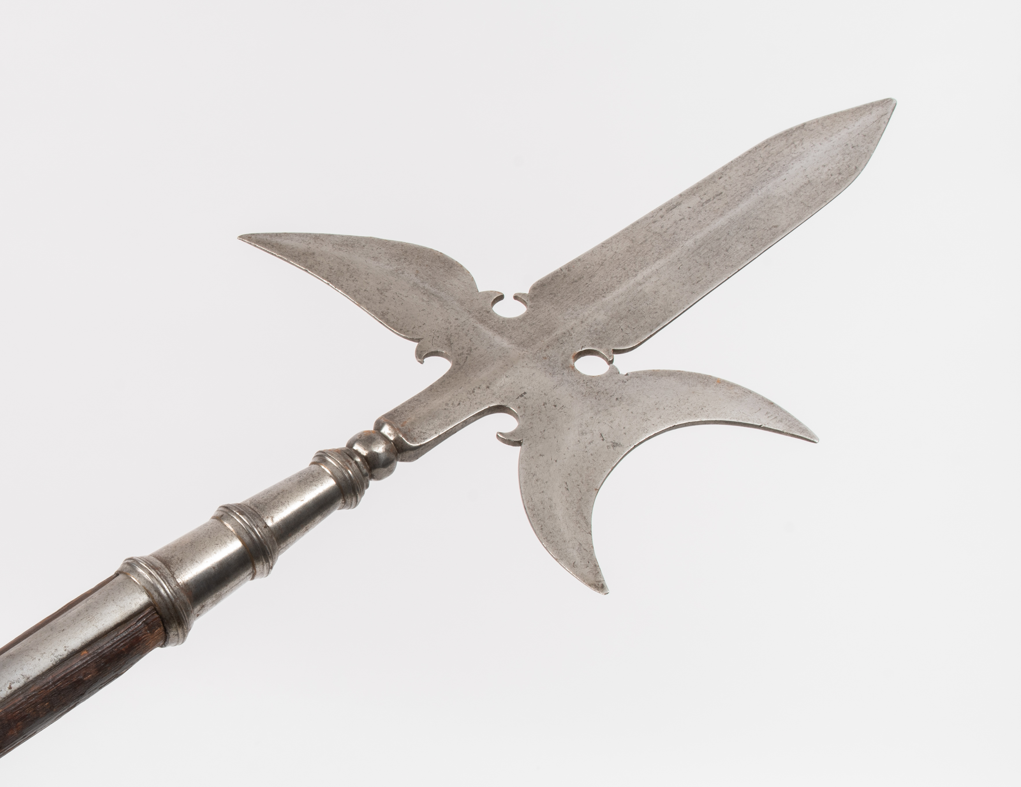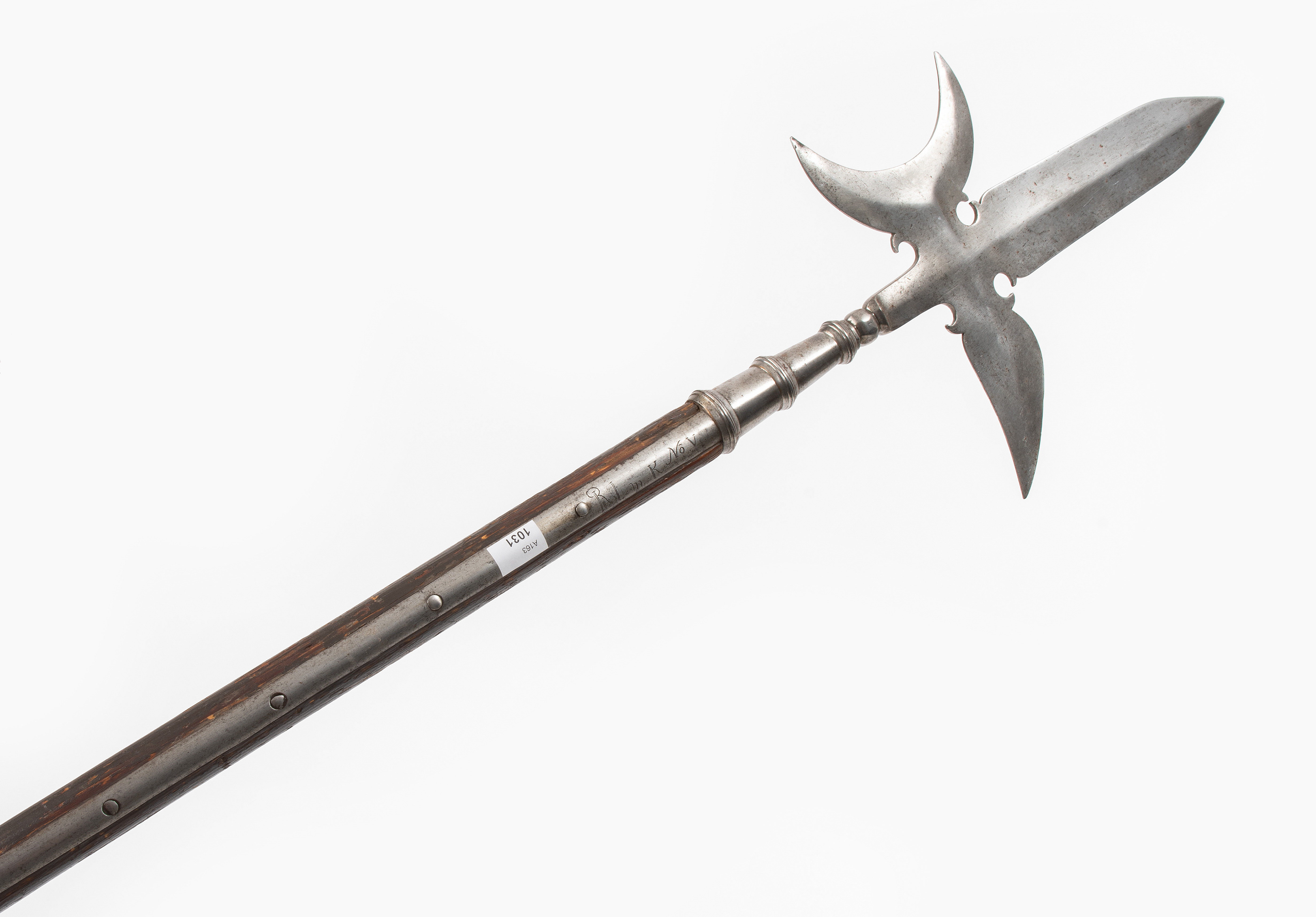 Deutschland 18. Jh. Eisen (L 29 cm) mit hohl geschliffenem Spontonblatt, halbmondförmigem Axtblatt mit konkaver Schneide und einem tropfenförmigen Schnabelhaken über einem Ziernodus. Letzterer sitzt auf der durch drei Zierwülste gegliederten Rundtülle, von der 49 cm lange Schaftfedern abgehen. Auf der quartseitigen ist eine Einheitsbezeichnung graviert: "R I m K No. V". Wohl originaler Rundschaft. L ca. 222 cm.