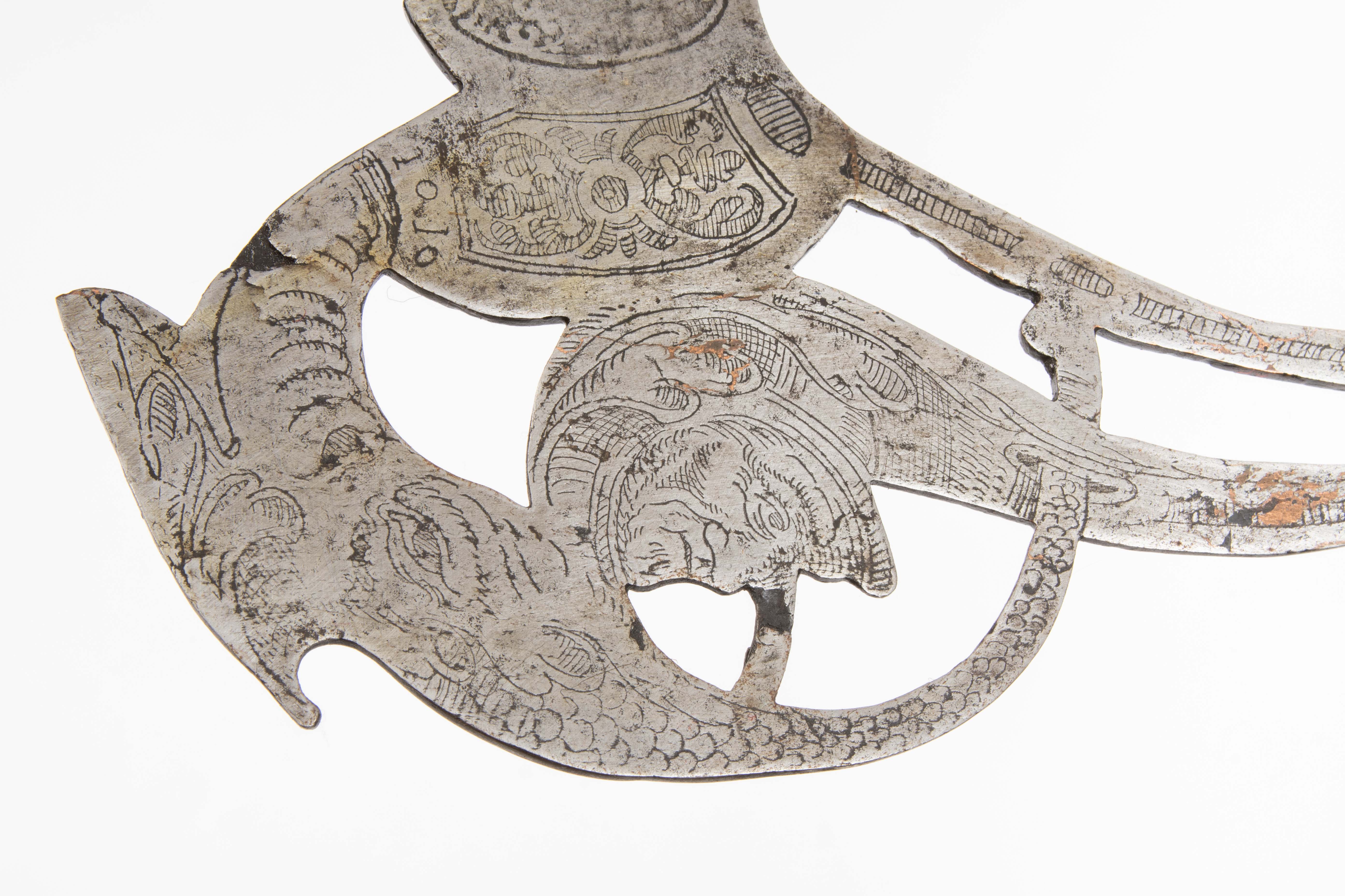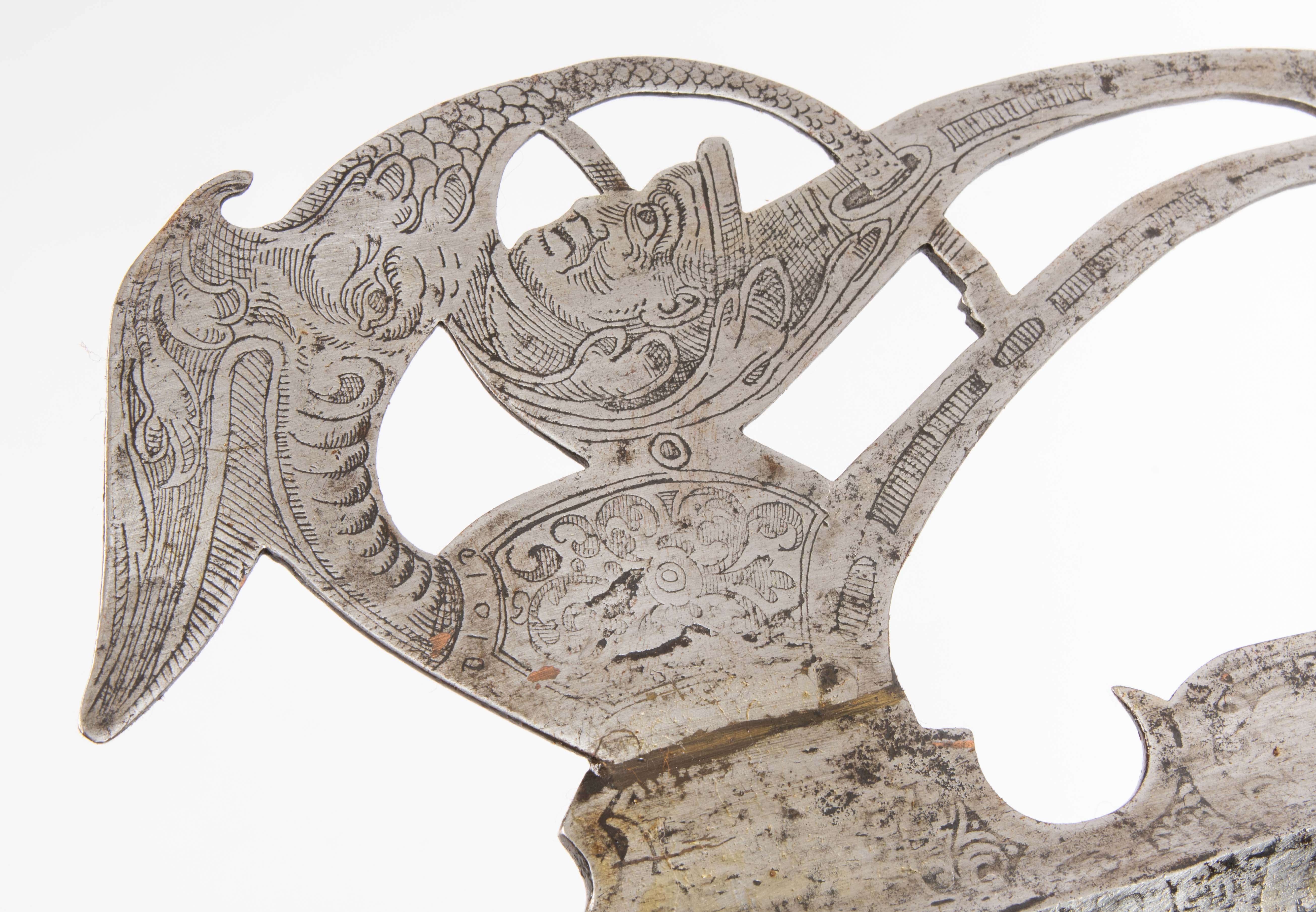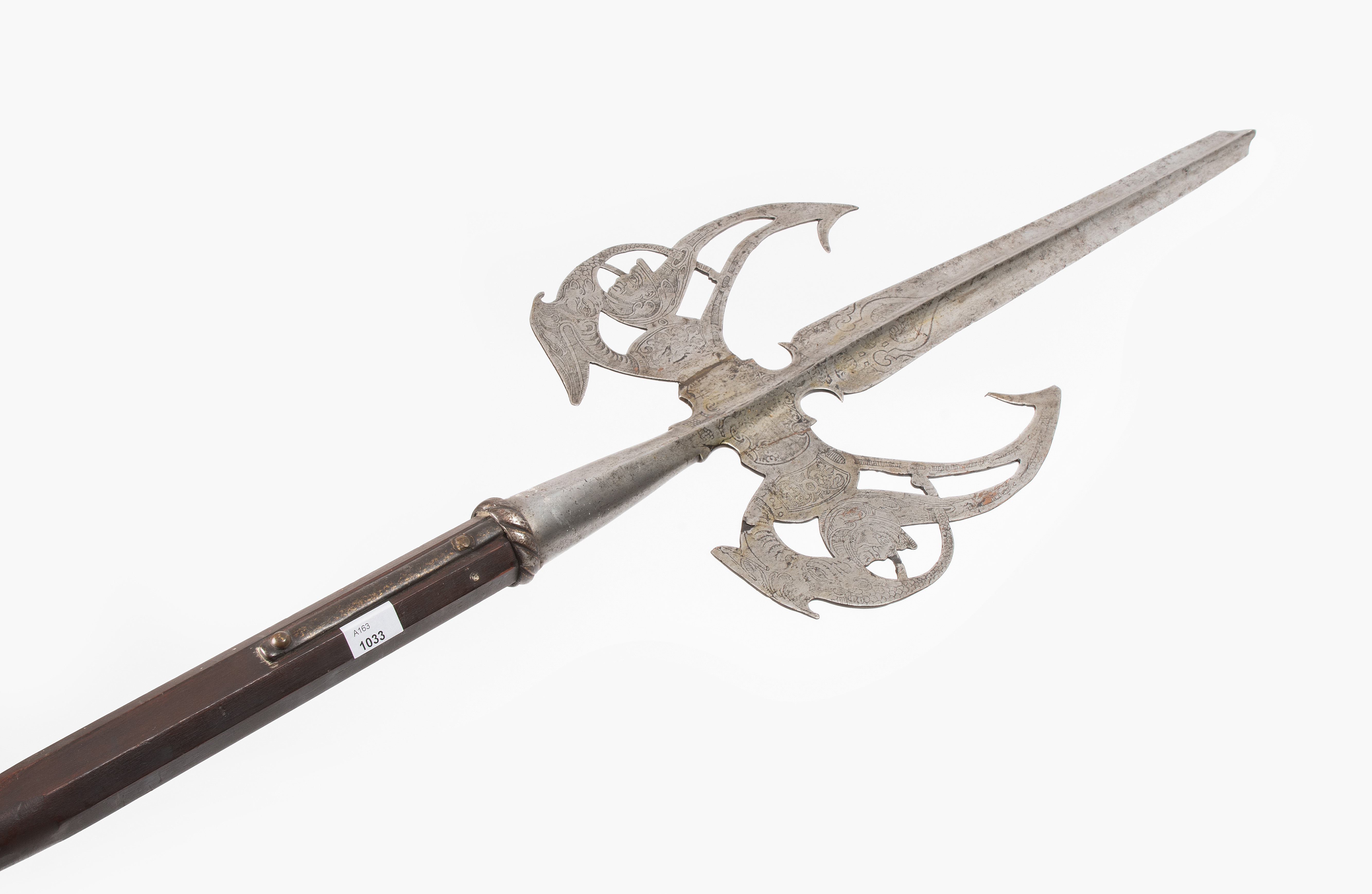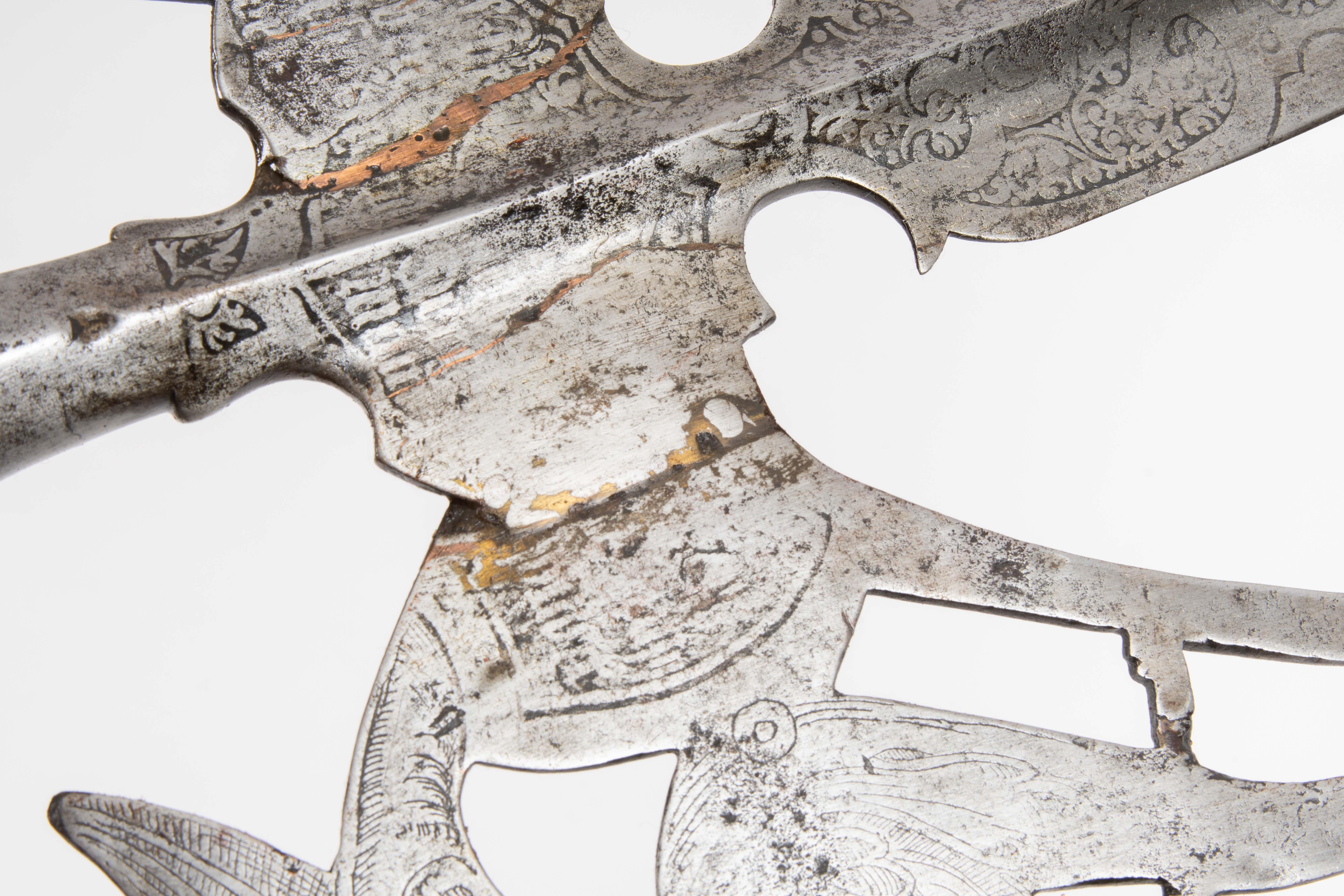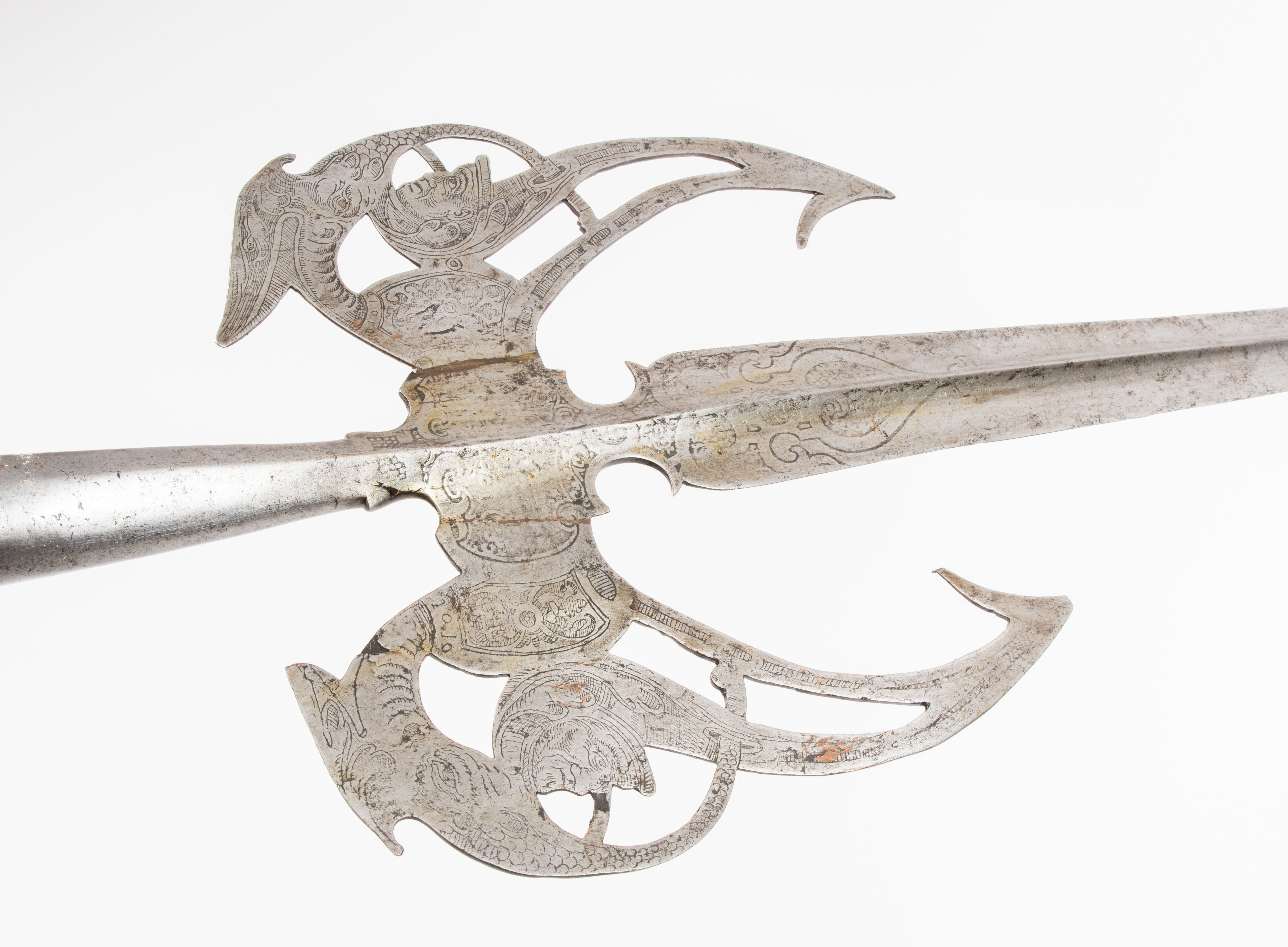 Deutschland/Österreich, ca. 1590 - 1640. Typologisch kaum exakt einzugrenzende Partisanenform (Eisen L 62,5 cm) der Spätrenaissance mit grossen, durchbrochen gearbeiteten "Flügeln" (keine Axtblätter), welche mit Mascarons und "Delphinen/Monstern/Drachen" graviert, sowie mit floralen Ranken und einem weitgehend unleserlichen Textfeld geätzt sind. Die Verzierungen sind stark berieben, die im Verlauf der Herstellung angesetzten "Flügel" weisen Messinglotnahten auf. Das Partisanenblatt ist mit einem akzentuierten Mittelgrat hohl geschliffen. Die Rundtülle schliesst mit einer geschnürlten Manschette ab, an der - wohl ergänzte - 12,5 cm lange Schaftfedern ansetzen. Im 19./20. Jh. ergänzter Rundschaft mit Standfuss. L ca. 246 cm.