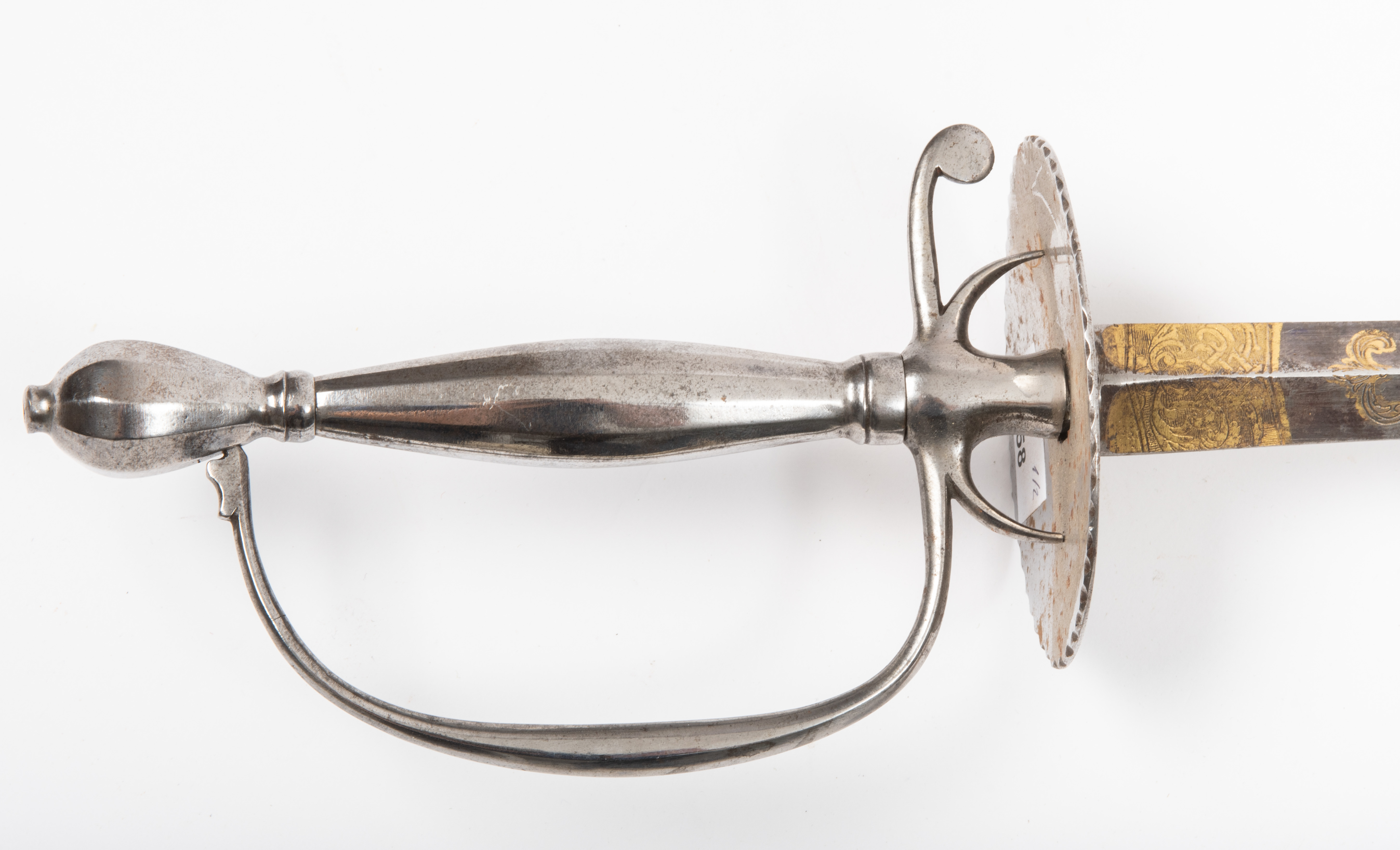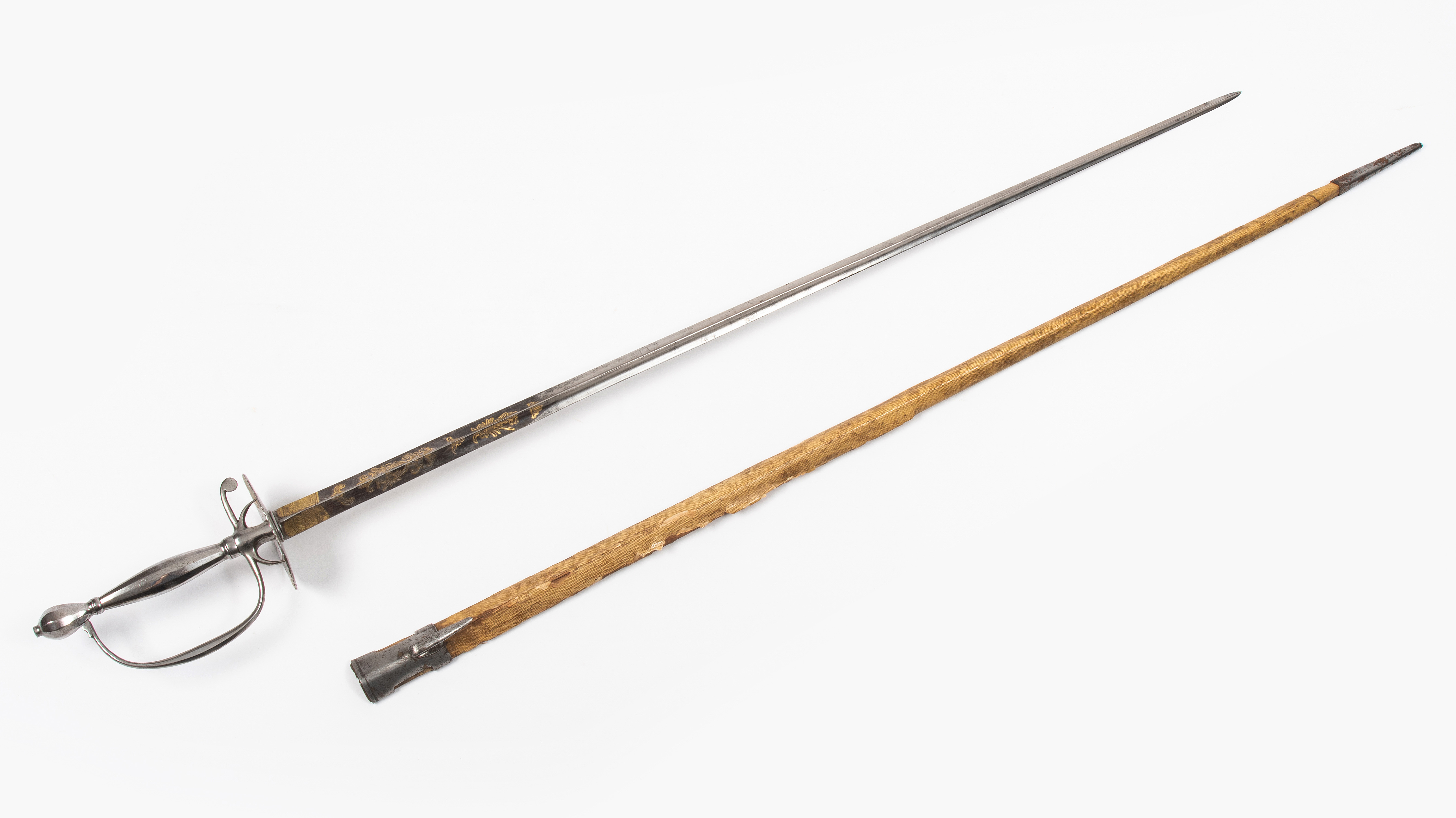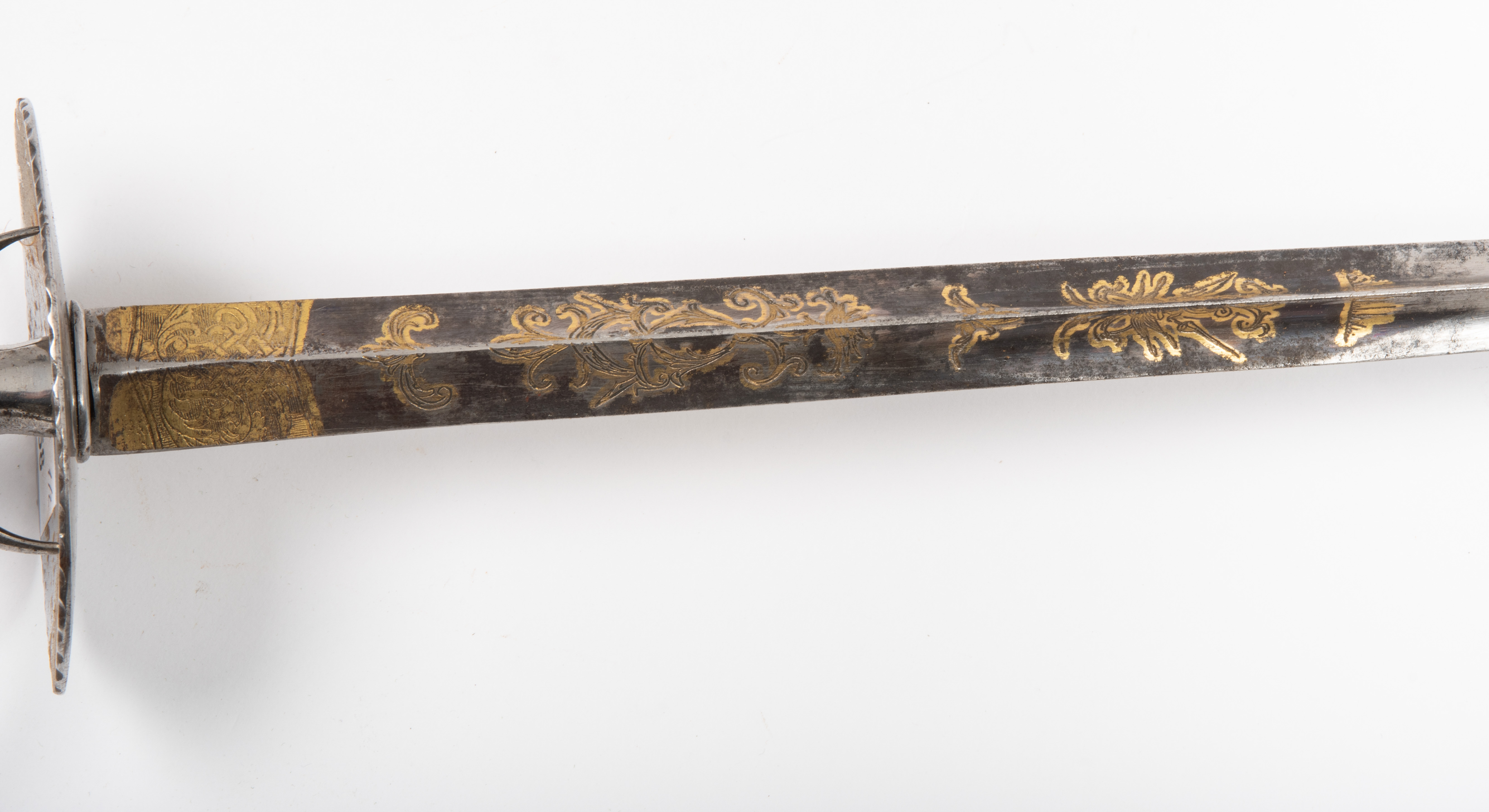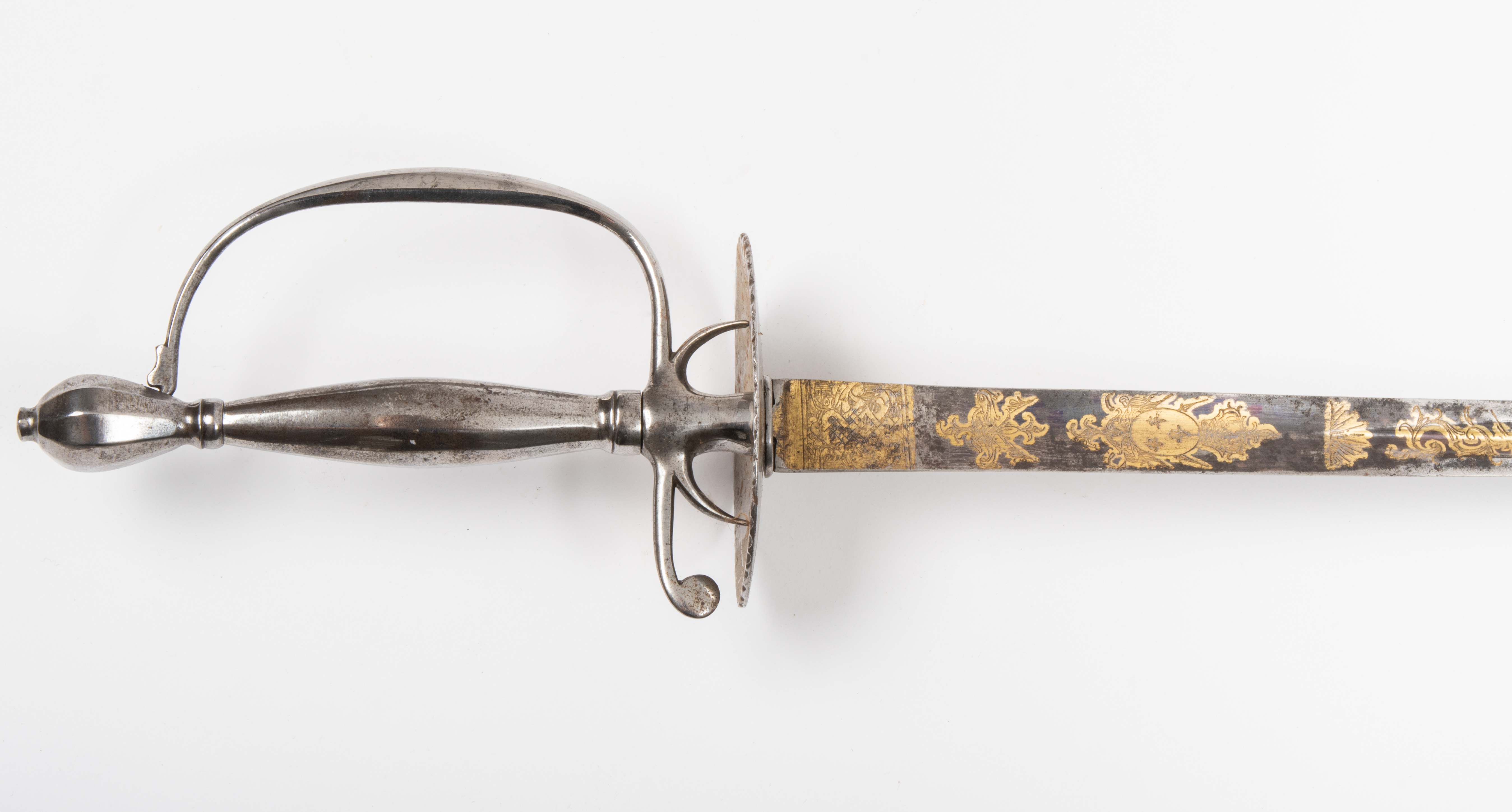 Frankreich, um 1820, Klinge wohl vor 1789. Versilbertes Gefäss mit facettiertem Birnknauf, ovalem Stichblatt, angedeuteten Fingerbügeln und facettierter, bauchiger Hilze. Hohl geschliffene Dreikantklinge mit gut erhaltener Bläuung und Vergoldung auf der Stärke. Dargestellt sind das französische Königswappen, florale Ranken, militärische Trophäen und Beschlagwerk. Originale Scheide mit Reptilienleder bespannt, Ortband und Mundblech mit Traghaken aus Eisen. L 89 cm.