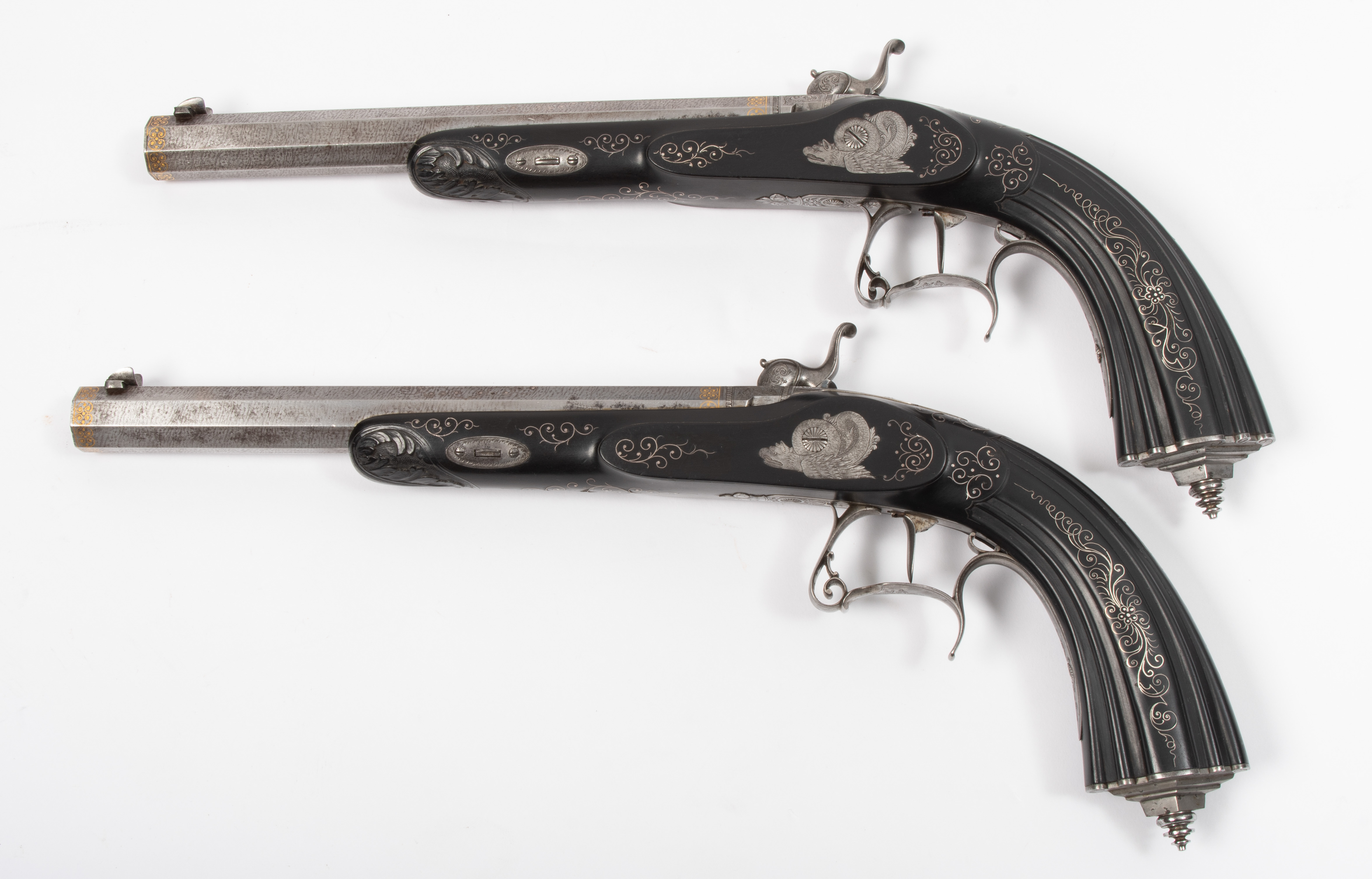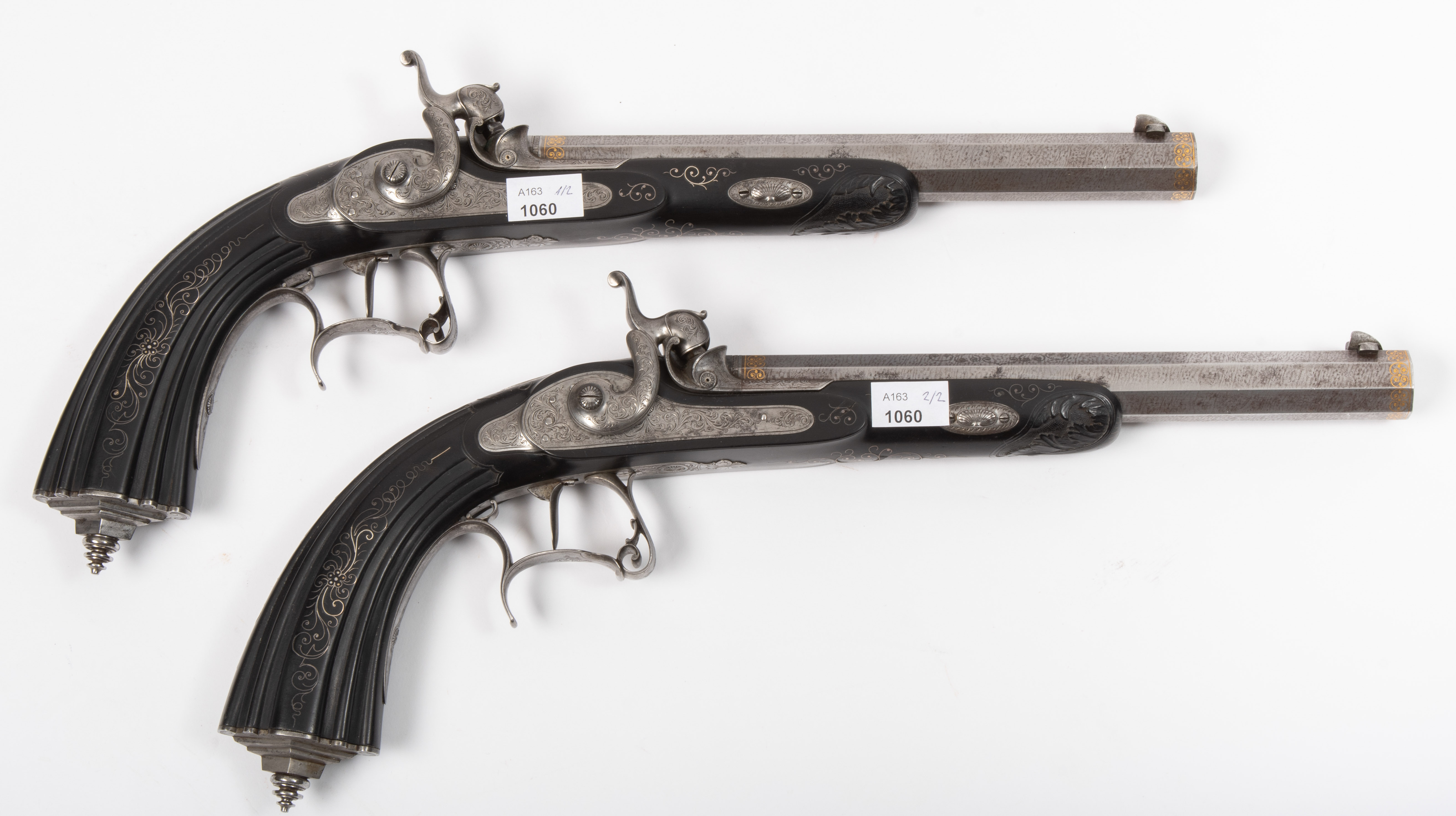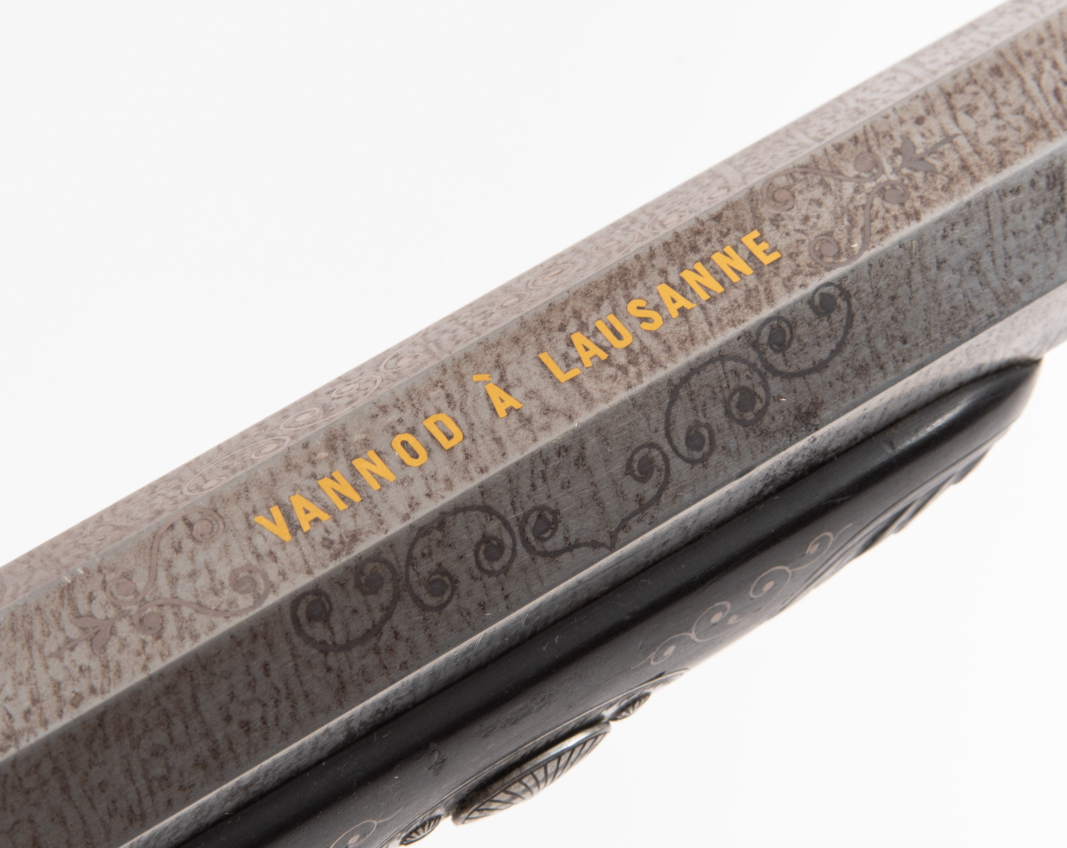 Lausanne, um 1840. Oktogonalläufe (L 22 cm) mit Patentschwanzschraube, aufgeätztem Damastmuster, Visier und geschobenem "Halbtunnelkorn", Kal. 10 mm gezogen. Laufoberseiten mit goldtauschierter Signatur "VANNOD À LAUSANNE" und in Gold nummeriert "1", "2". Ansatz und Mündung mit floraler Goldtauschierung. Schlossplatten und Hähne floral graviert, Seitenbleche in Drachengestalt graviert. Mechanismen tadellos.Floral gravierte Eisengarnitur. Fein beschnitzte Ebenholz-Halbschäfte mit Siberdrahteinlagen in Rankenform. L 39 cm. Mit grünem Tuch ausgeschlagener Palisanderholzkasten mit Messingbeschlägen. Darin Ladestock, Putzstock, Kugelzange, zwei Büchsen, Pflastereisen, Schraubendreher, zwei Abteile für Kugeln. Sehr aufwändig gestaltetes und gut erhaltenes Paar.