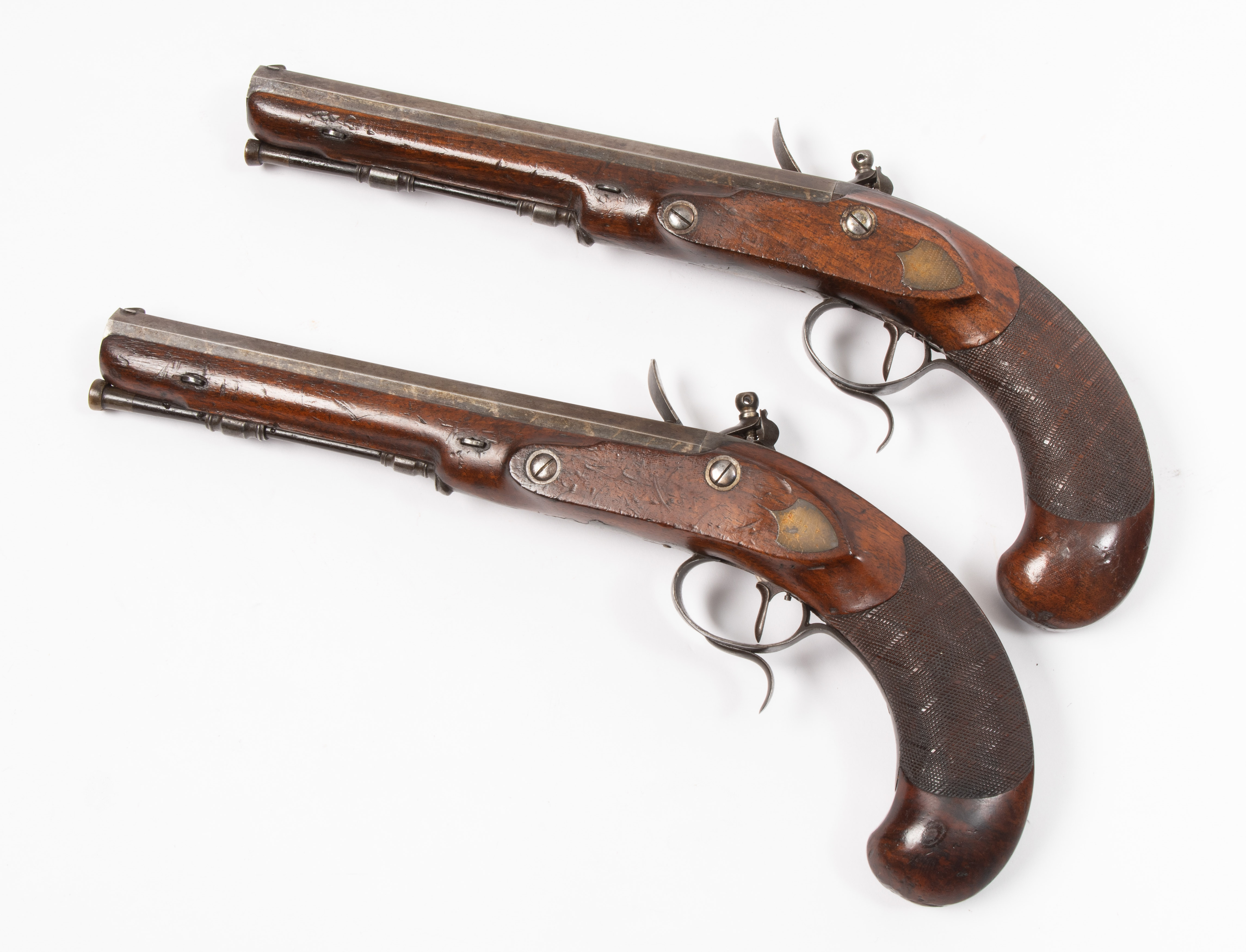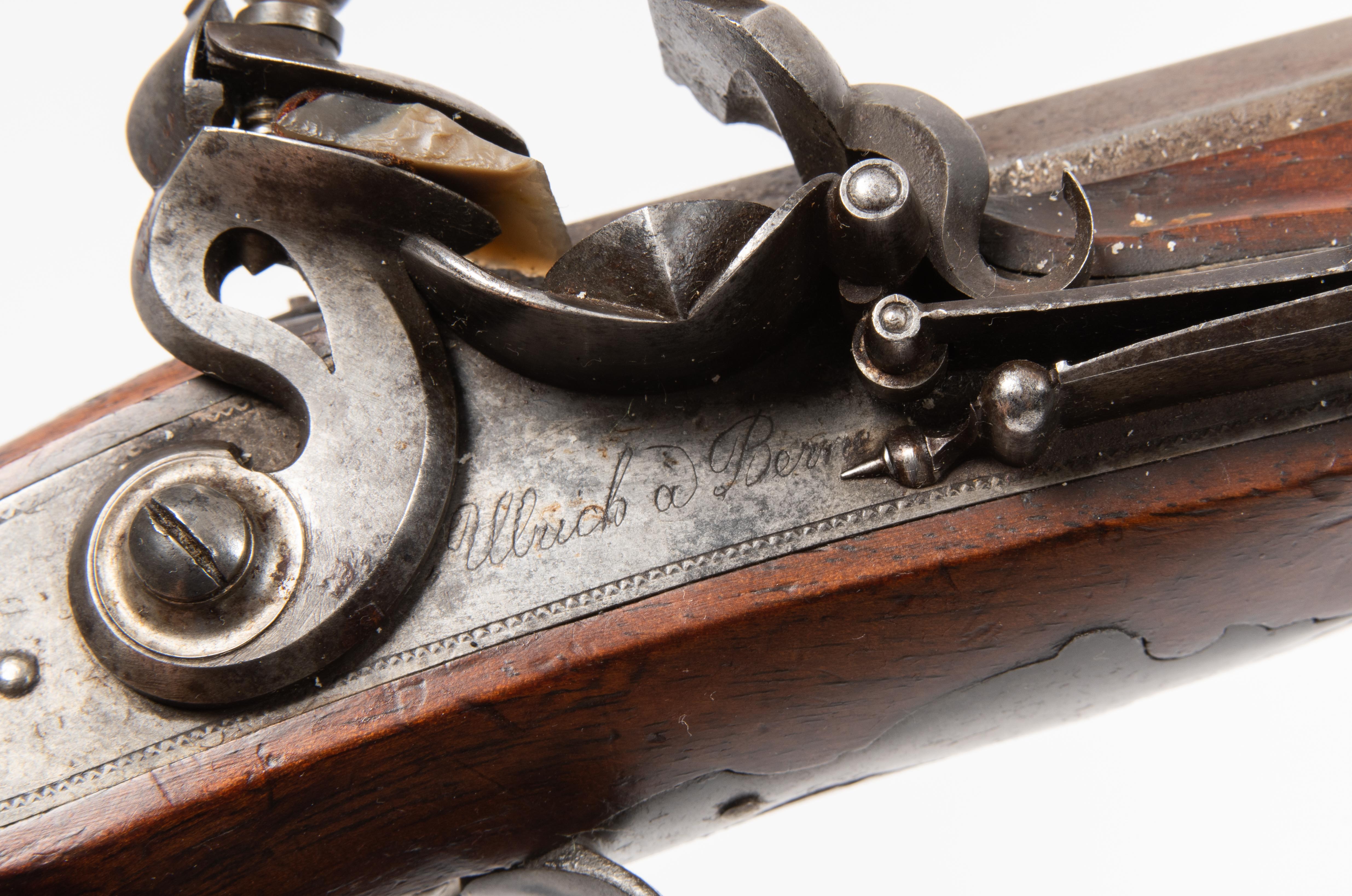 Schweiz, Bern, um 1800. Oktogonalläufe mit originaler, beriebener Brünierung (L 20 cm), Visier und geschobenem Korn, Kal. 12 mm. Oberseite sign. "F. Ulrich à Berne", am Ansatz in Gold eingelegte Prüfmarke. Schlossplatten und Hähne flach, erstere sign. "F. Ulrich à Berne". Mechanismen funktionstüchtig. Unverzierte Eisengarnituren. Anstelle des Seitenblechs wappenförmige Messingmedaillons. Leicht bestossene Nussbaum-Vollschäfte mit gewaffeltem Griffstück. Holzladestöcke mit Horndoppern. Der Berner Büchsenmacher Franz Ulrich (1771 - 1845) wanderte 1812 nach Württemberg aus, wo er zunächst als ein Inspektor der Königlich Württembergischen Waffenfabrik in Oberndorf am Neckar tätig war.(https://www.waffensammler-kuratorium.de/Ulrich%20Pistolen/Ulrichge.html). L 33 cm.