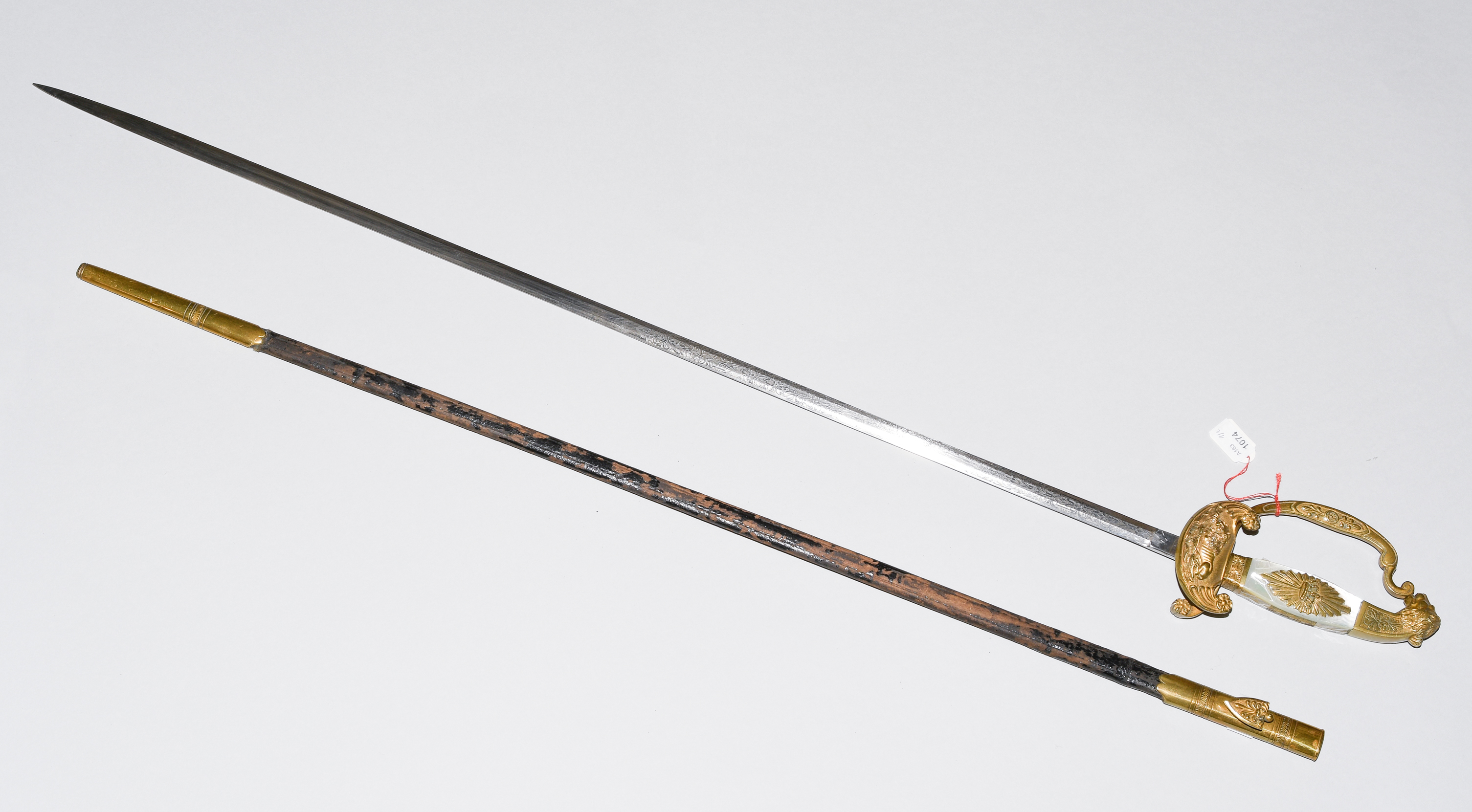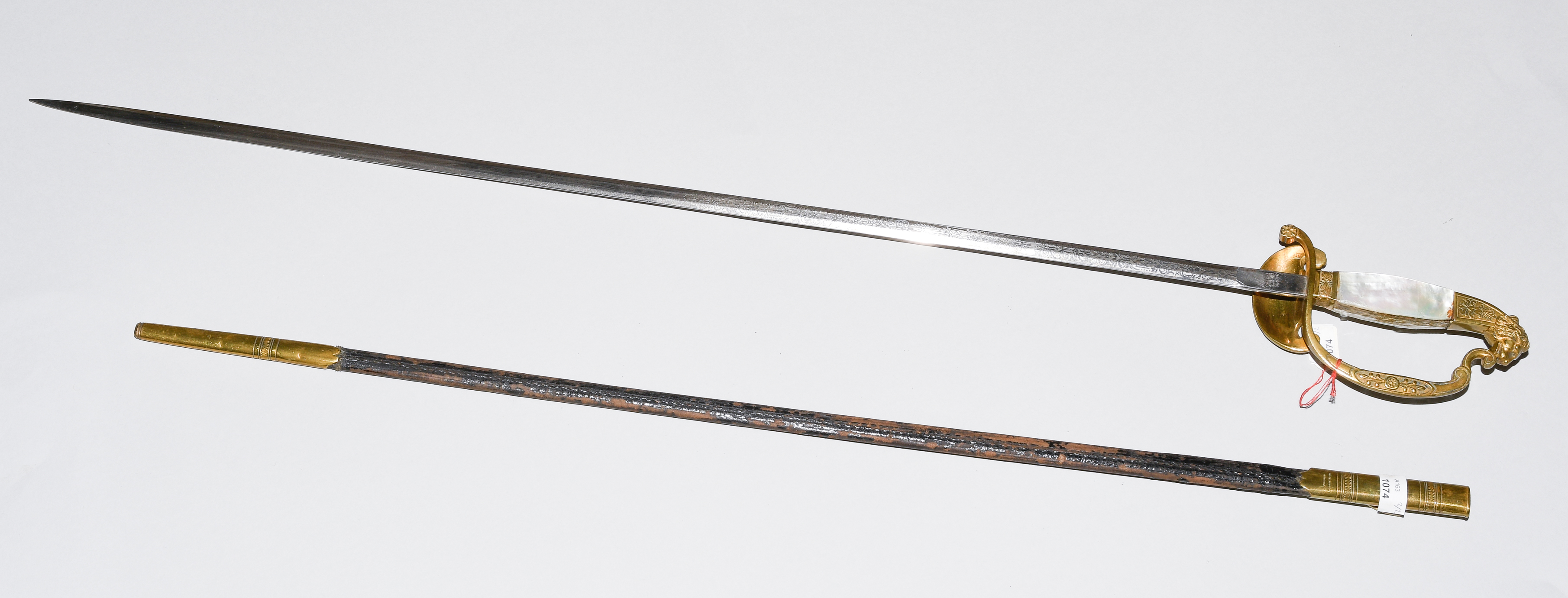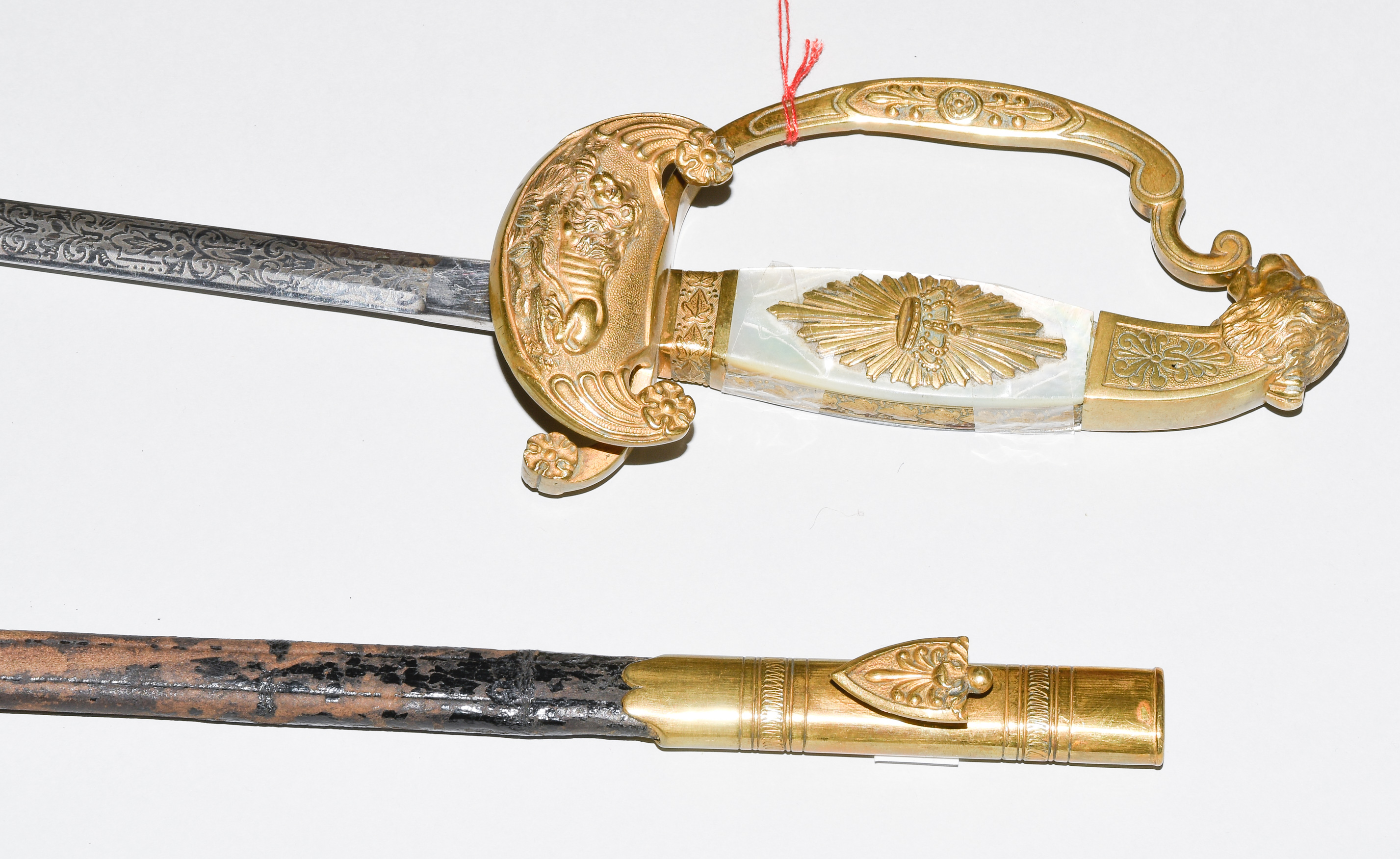 Bayern, 2. Hälfte 19. Jh. für Mitglieder des Hofes und Hofbeamte. Vergoldetes Messinggefäss mit Löwenkopf-Knaufkappe und Stichblatt mit plastisch ausgearbeitetem liegendem Löwen. Griffschalen aus Perlmutt mit terzseitig aufgelegter - mit Klebeband fixierter - Krone im Strahlenkranz. Gut erhaltene Stossklinge von hexagonalem Querschnitt mit floral und trophäengeätzter Stärke. Auf der Fehlschärfe terzseitig das Herstellersignet W.K. & C. (Weyersberg Kirschbaum & Companie). Schwarze Lederscheide mit Ortband und Mundblech aus vergoldetem Messing. L 88 cm.