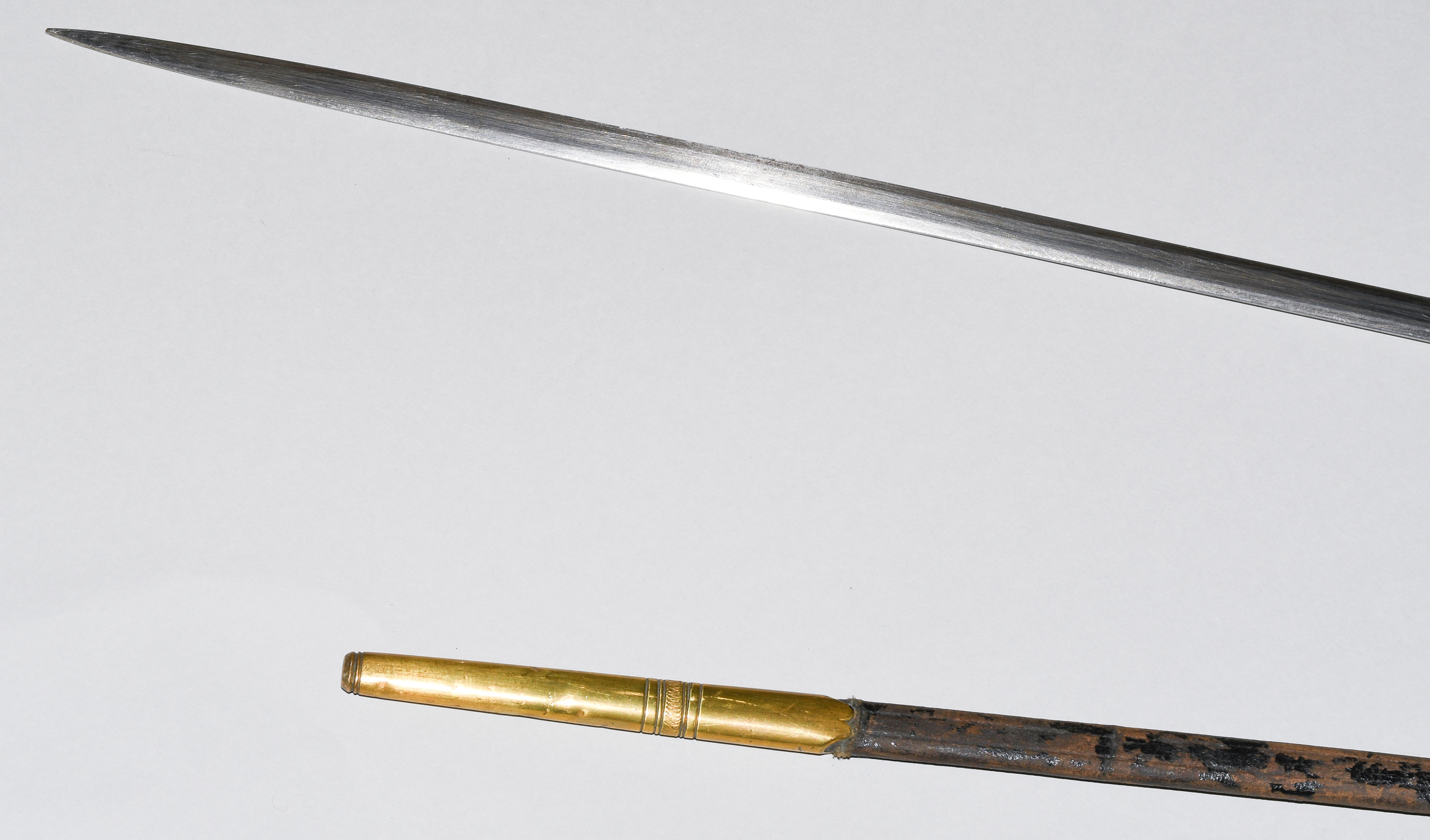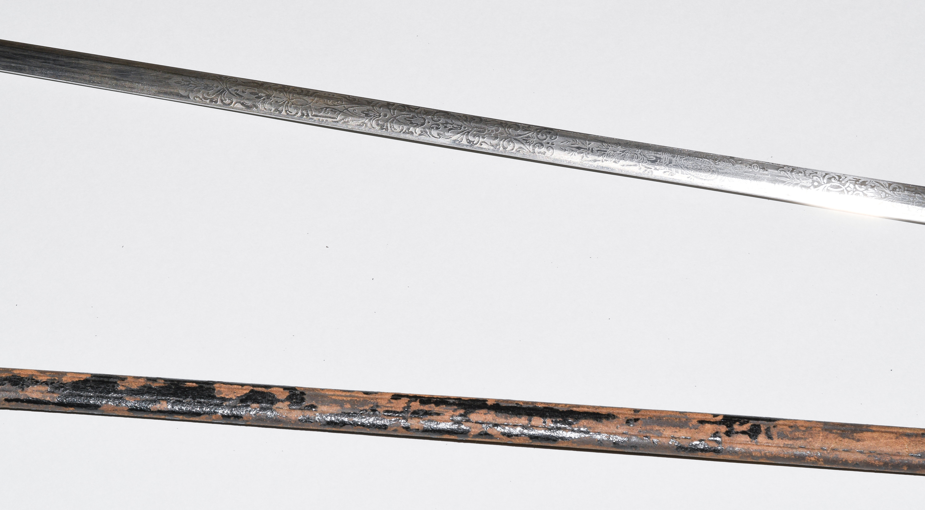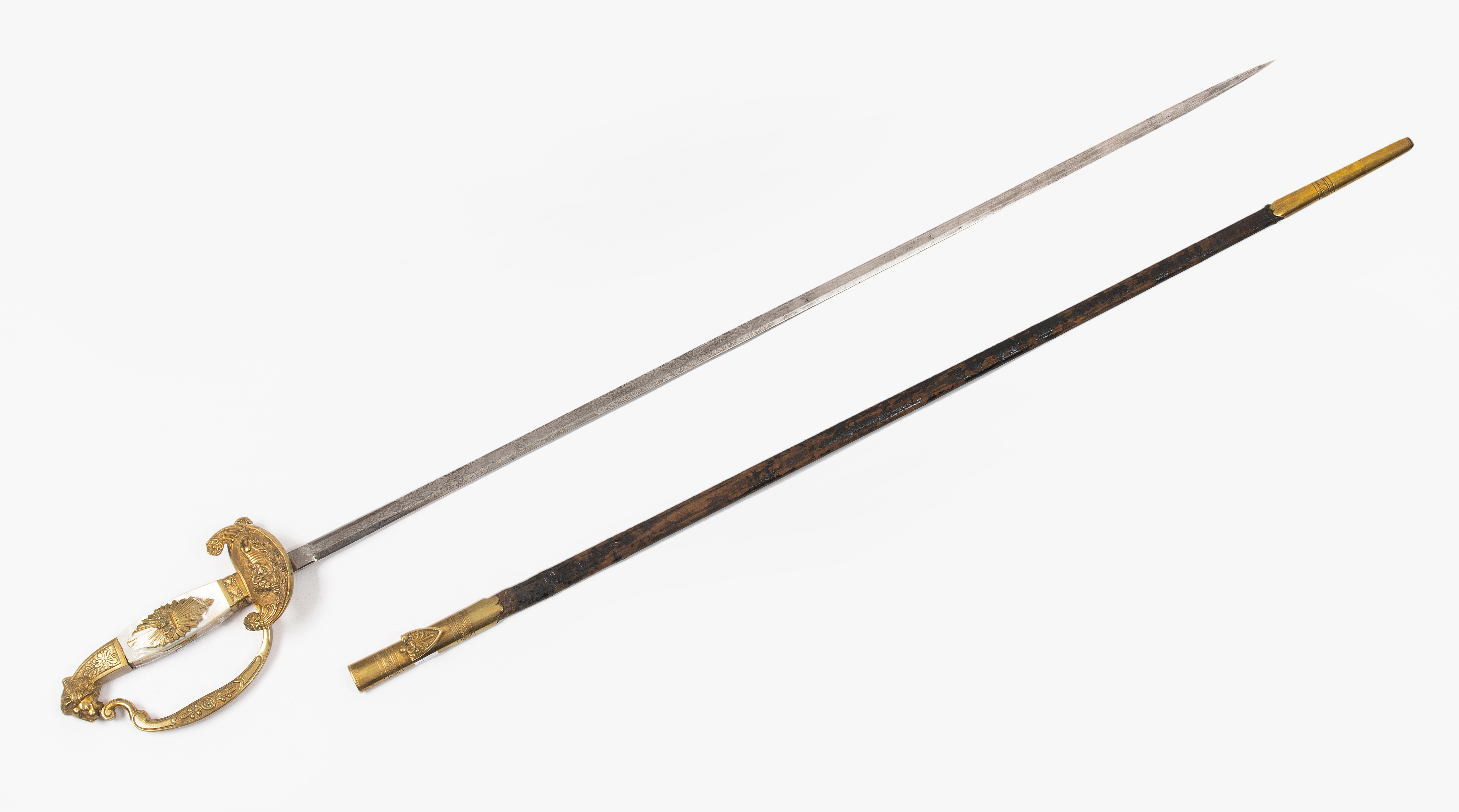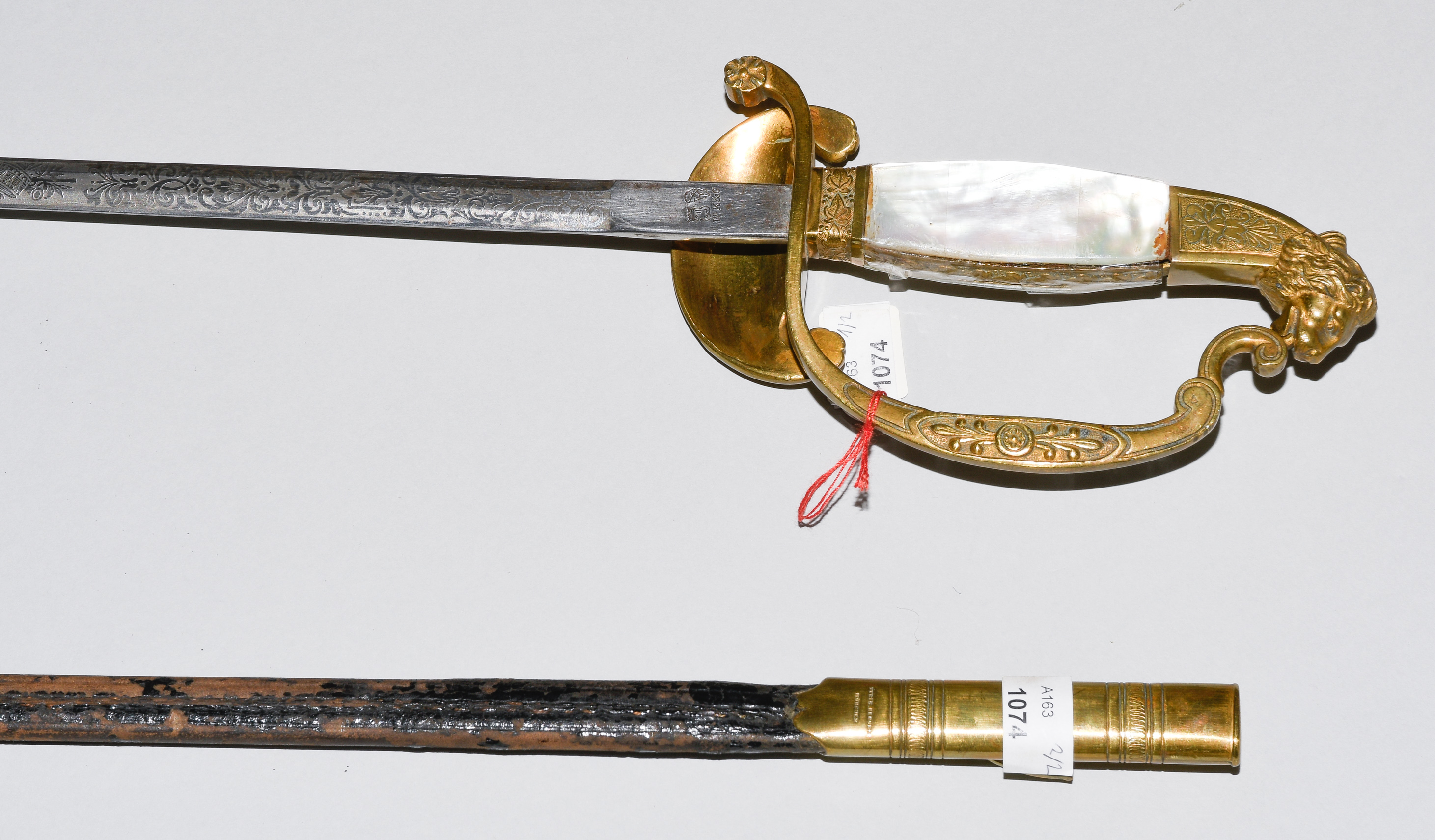 Bayern, 2. Hälfte 19. Jh. für Mitglieder des Hofes und Hofbeamte. Vergoldetes Messinggefäss mit Löwenkopf-Knaufkappe und Stichblatt mit plastisch ausgearbeitetem liegendem Löwen. Griffschalen aus Perlmutt mit terzseitig aufgelegter - mit Klebeband fixierter - Krone im Strahlenkranz. Gut erhaltene Stossklinge von hexagonalem Querschnitt mit floral und trophäengeätzter Stärke. Auf der Fehlschärfe terzseitig das Herstellersignet W.K. & C. (Weyersberg Kirschbaum & Companie). Schwarze Lederscheide mit Ortband und Mundblech aus vergoldetem Messing. L 88 cm.