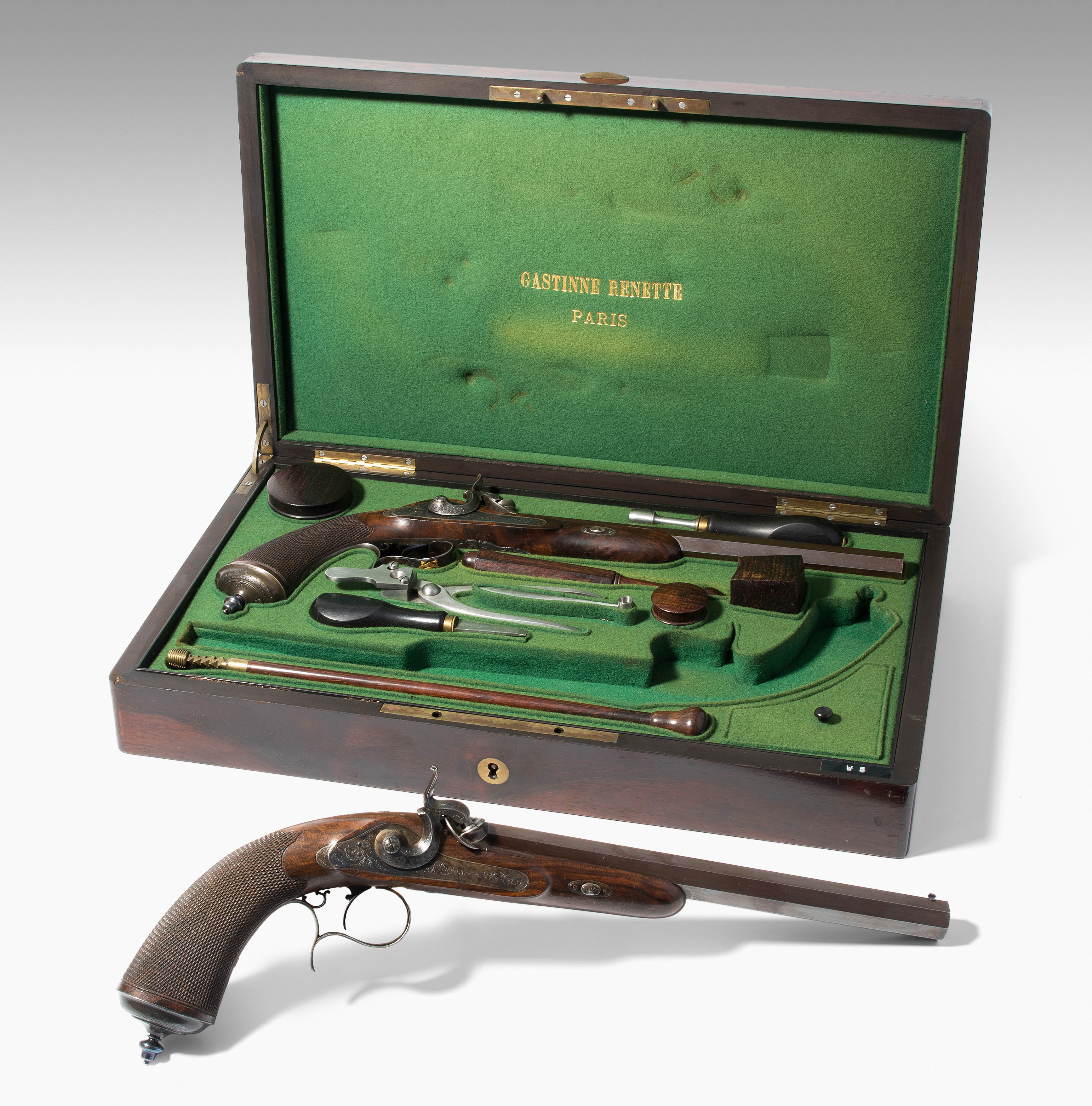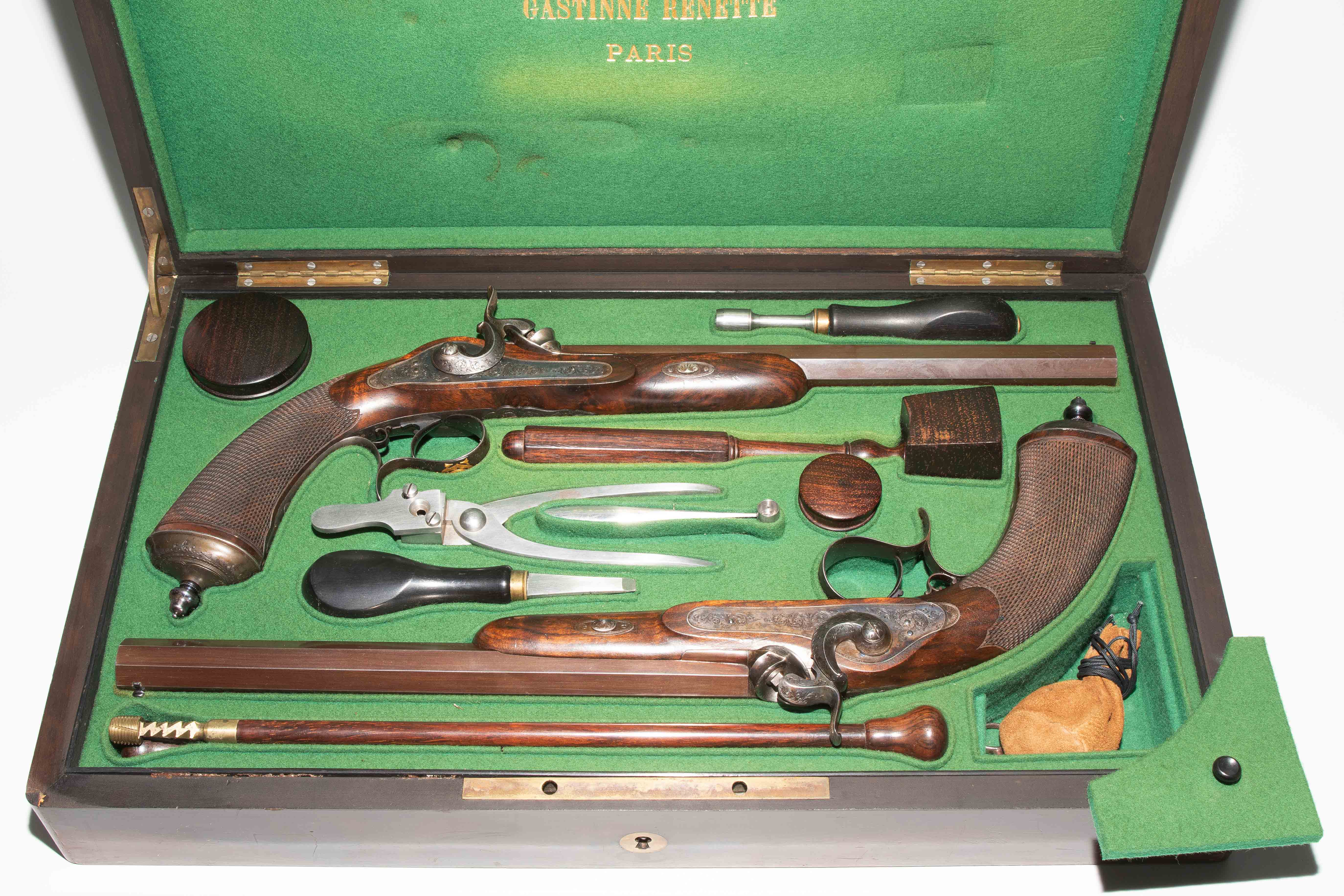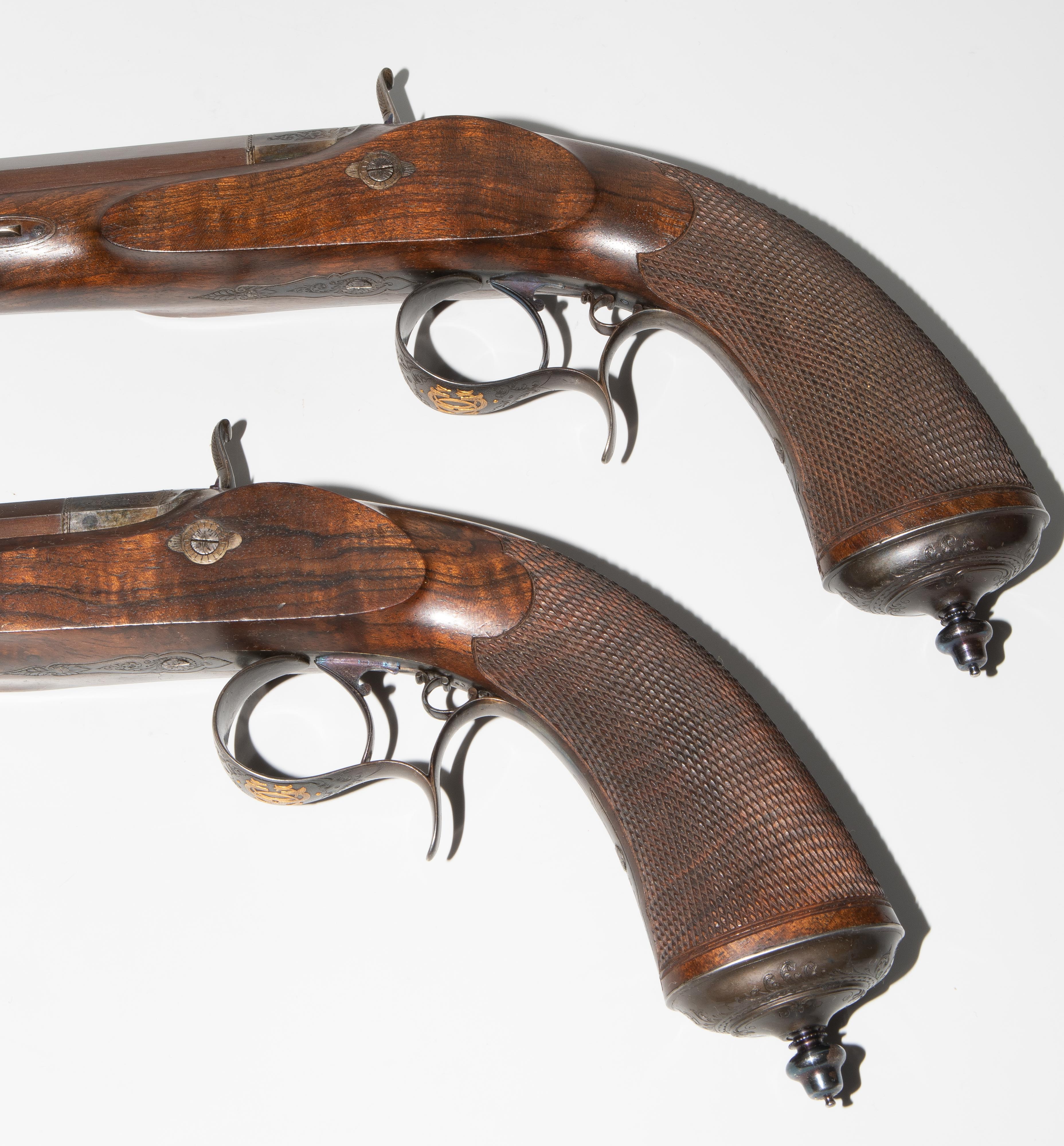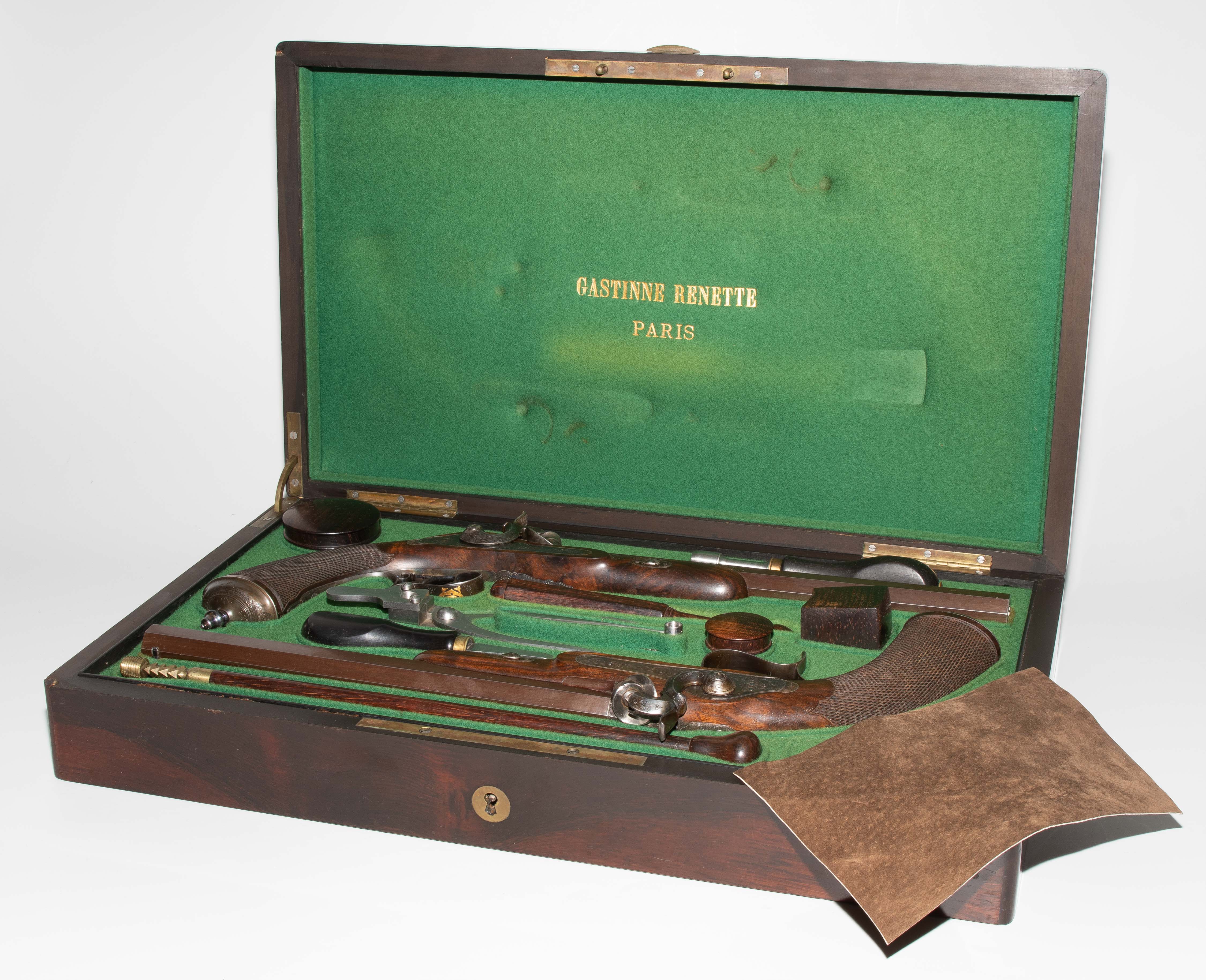 Frankreich, Paris, um 1845, private Duellpistolen. Nummerierte, brünierte Oktogonalläufe (L 26,6 cm) mit Standvisier und geschobenem, gebläutem Korn, Kal. 14 mm, gezogen. Laufoberseiten bez. "F(our)ni par Gastinne Renette à Paris". Schlossplatten flach, Hähne mit Mittelgrat, beides wie die Eisengarnituren brüniert und floral graviert. Am Abzugbügel jeweils in Gold aufgelegt ein Besitzermonogramm "CCG(?)". Dunkel gebeizte Nussbaum-Halbschäfte mit gewaffeltem Griffstück. L 41,5 cm. Palisander-Kasten mit goldeingelegtem Deckel und Monogramm "CCG". Innen mit grünem Samt bespannt und im Deckel die Herstellerbezeichng. "GASTINNE RENETTE PARIS". Komplett erhaltenes Zubehör inklusive Zündhütchen und Kugelbeutel. Masse Kasten: 46 x 27 x 9 cm.