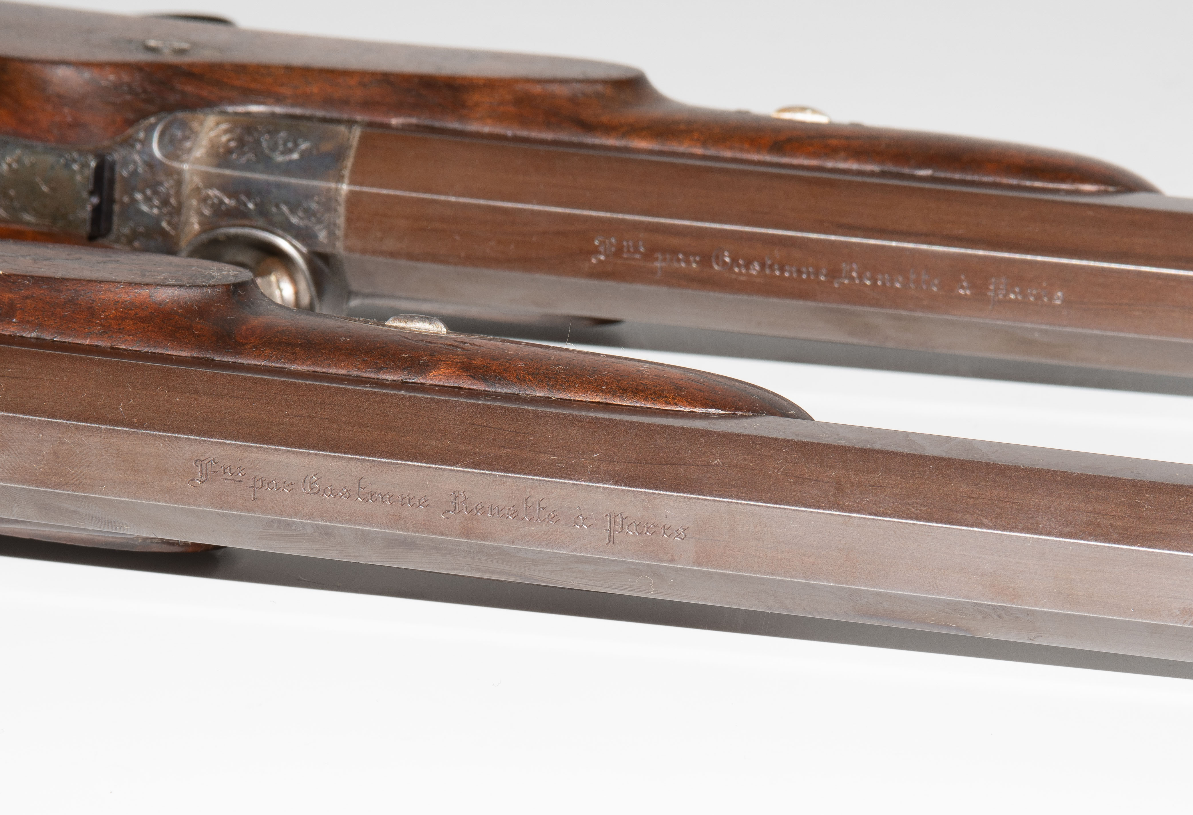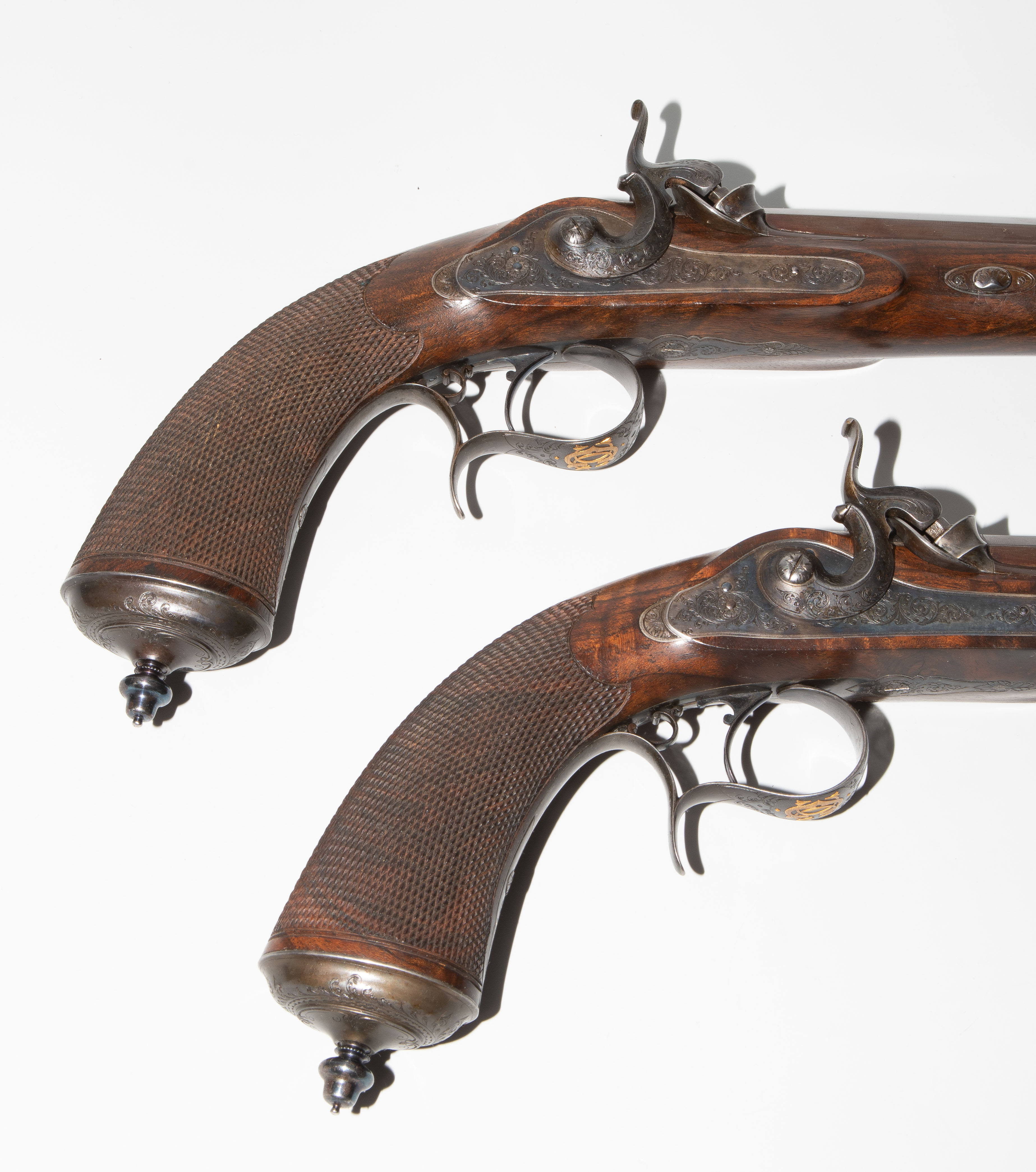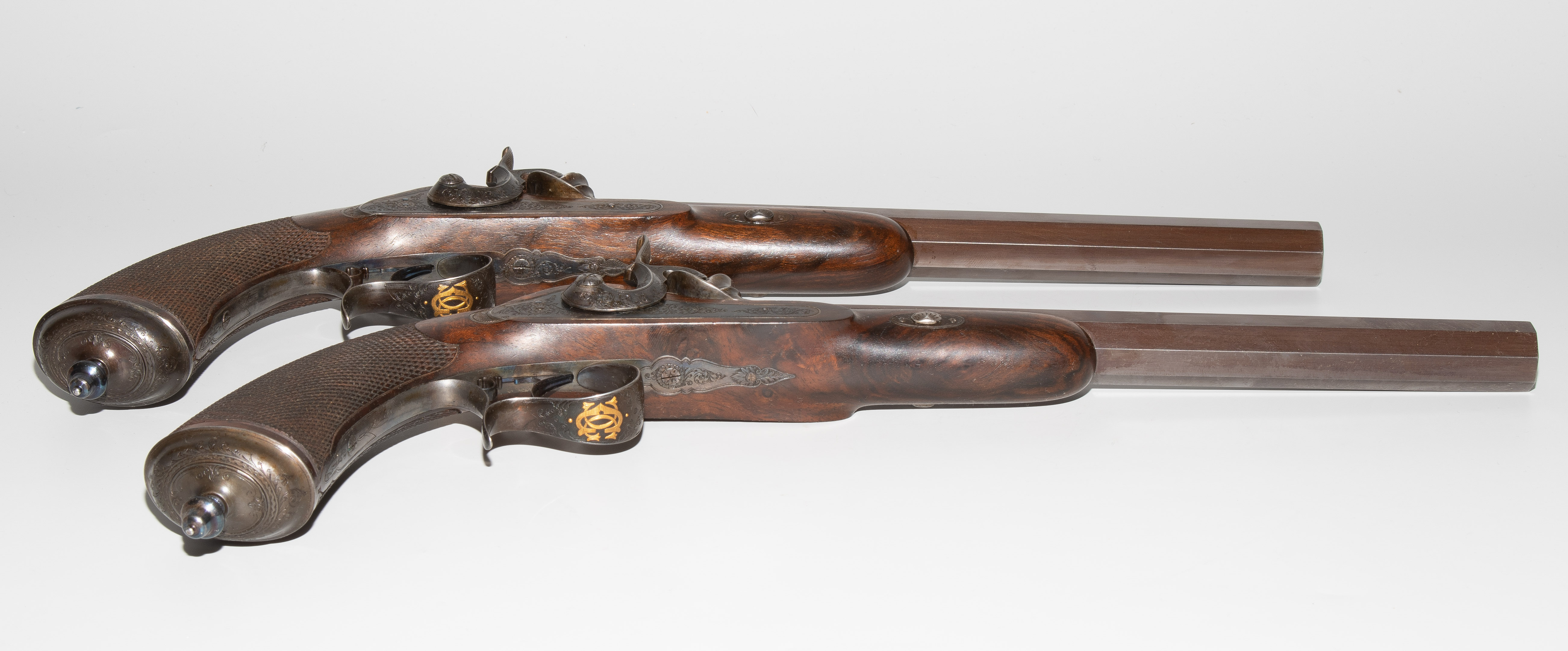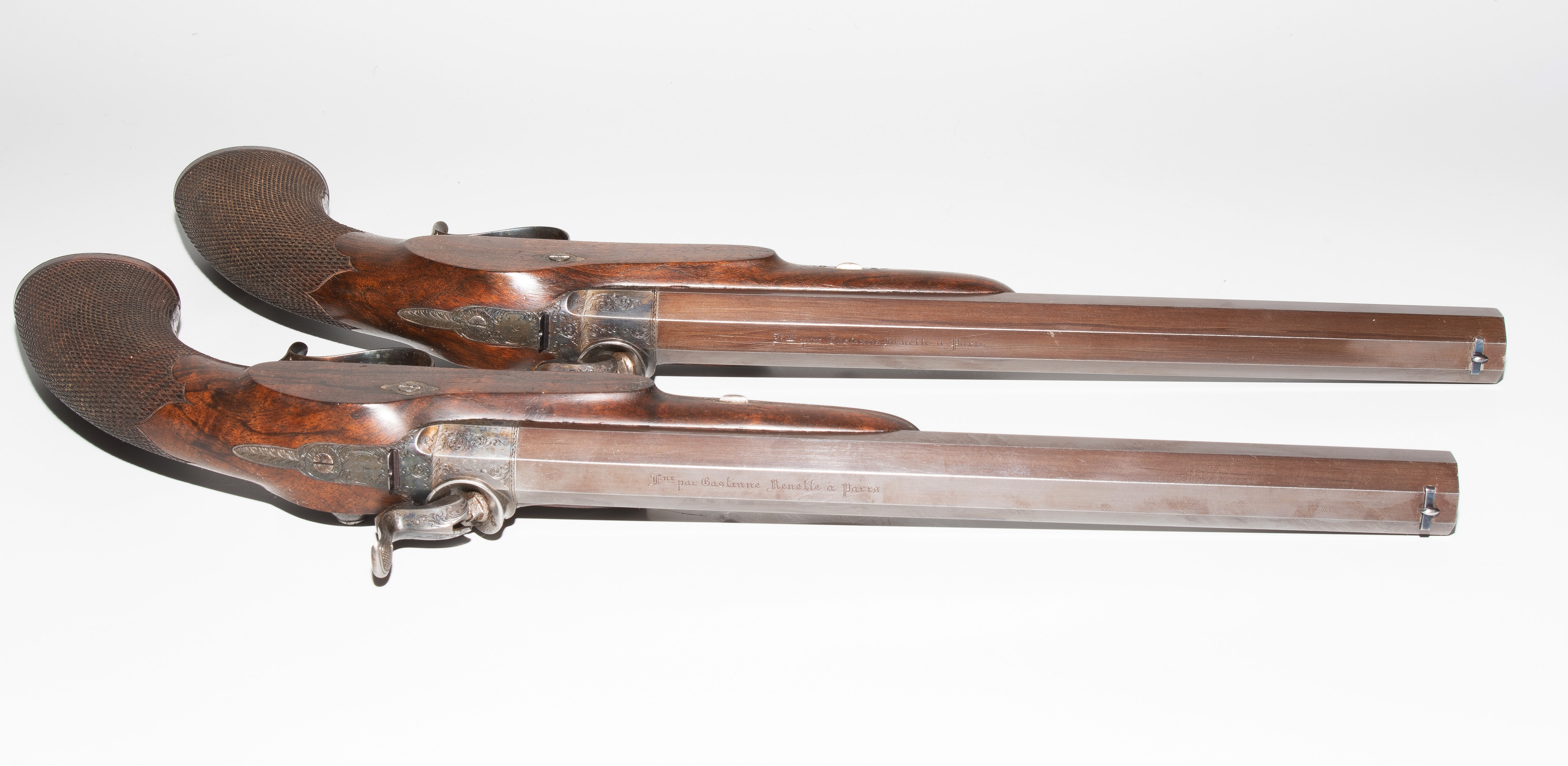 Frankreich, Paris, um 1845, private Duellpistolen. Nummerierte, brünierte Oktogonalläufe (L 26,6 cm) mit Standvisier und geschobenem, gebläutem Korn, Kal. 14 mm, gezogen. Laufoberseiten bez. "F(our)ni par Gastinne Renette à Paris". Schlossplatten flach, Hähne mit Mittelgrat, beides wie die Eisengarnituren brüniert und floral graviert. Am Abzugbügel jeweils in Gold aufgelegt ein Besitzermonogramm "CCG(?)". Dunkel gebeizte Nussbaum-Halbschäfte mit gewaffeltem Griffstück. L 41,5 cm. Palisander-Kasten mit goldeingelegtem Deckel und Monogramm "CCG". Innen mit grünem Samt bespannt und im Deckel die Herstellerbezeichng. "GASTINNE RENETTE PARIS". Komplett erhaltenes Zubehör inklusive Zündhütchen und Kugelbeutel. Masse Kasten: 46 x 27 x 9 cm.