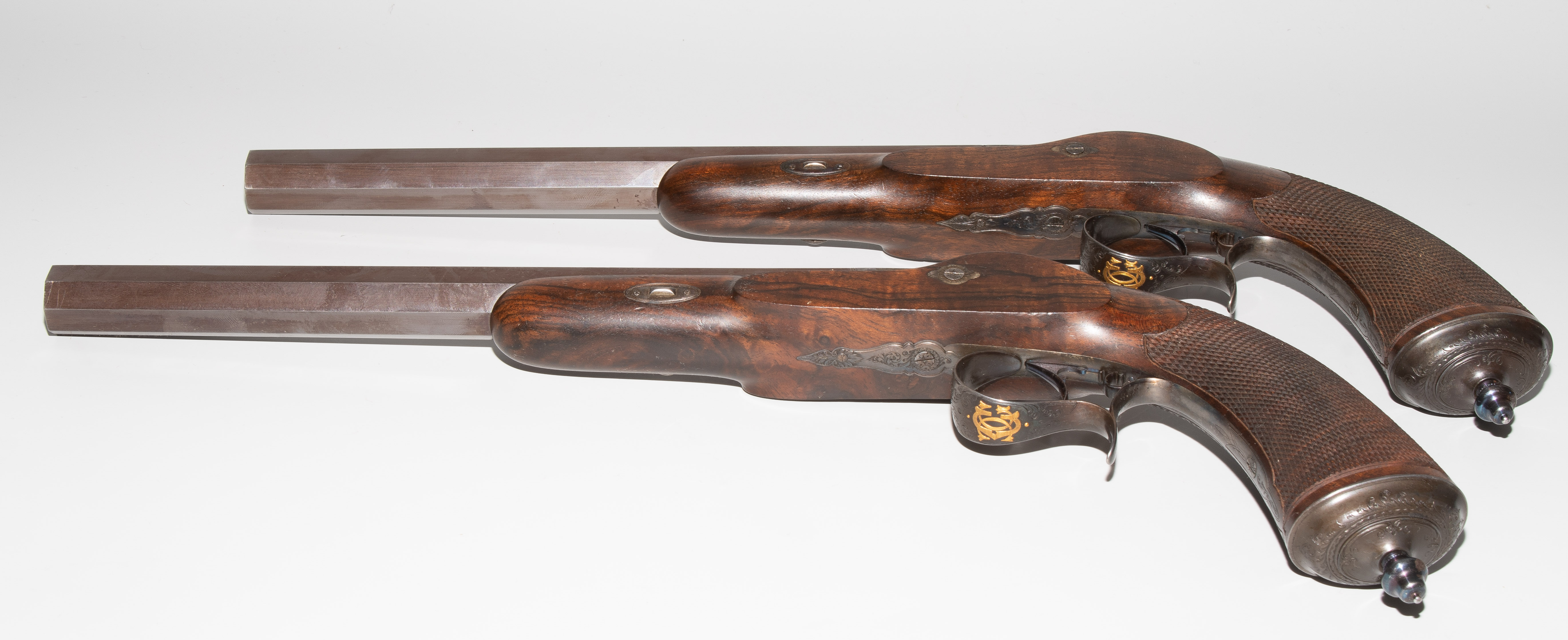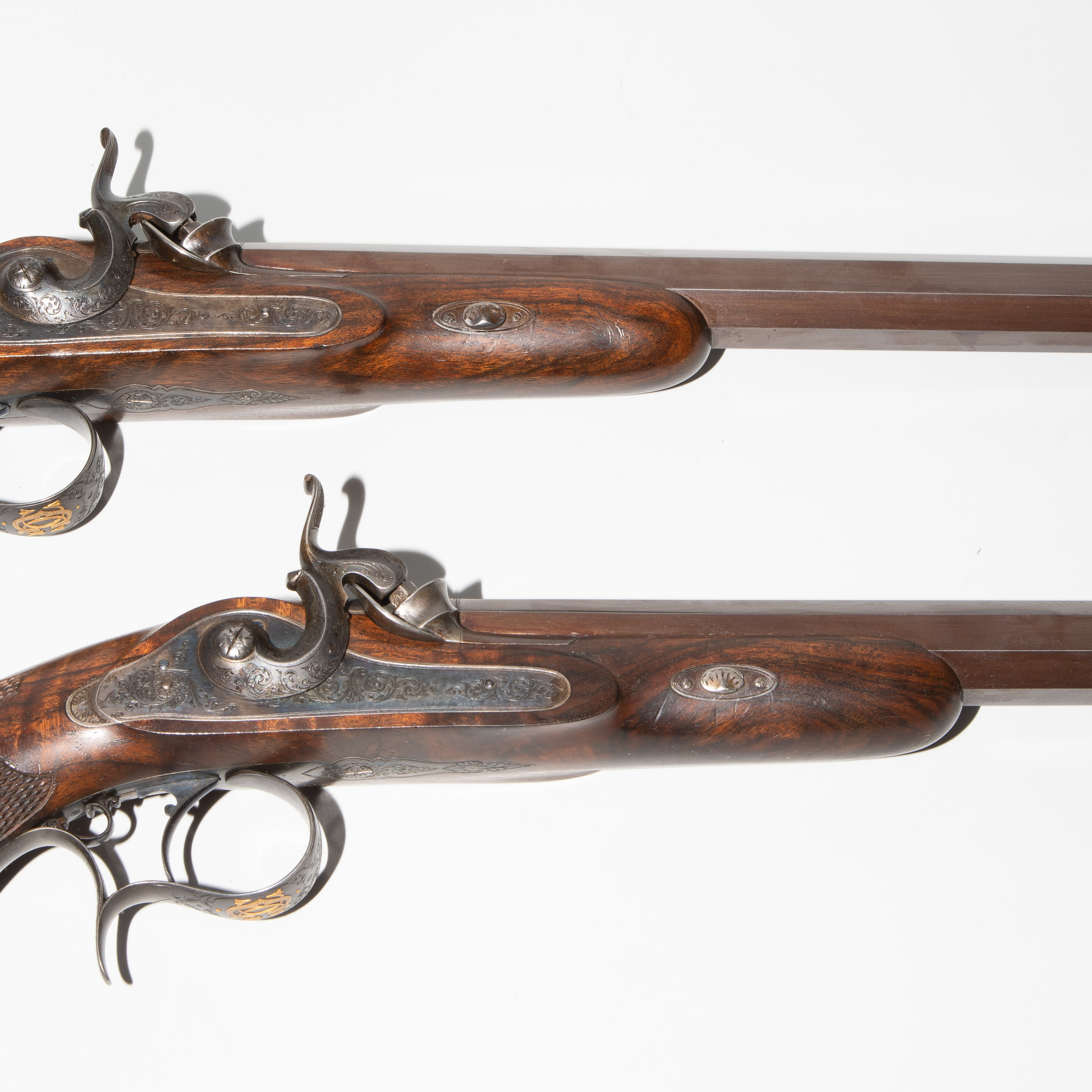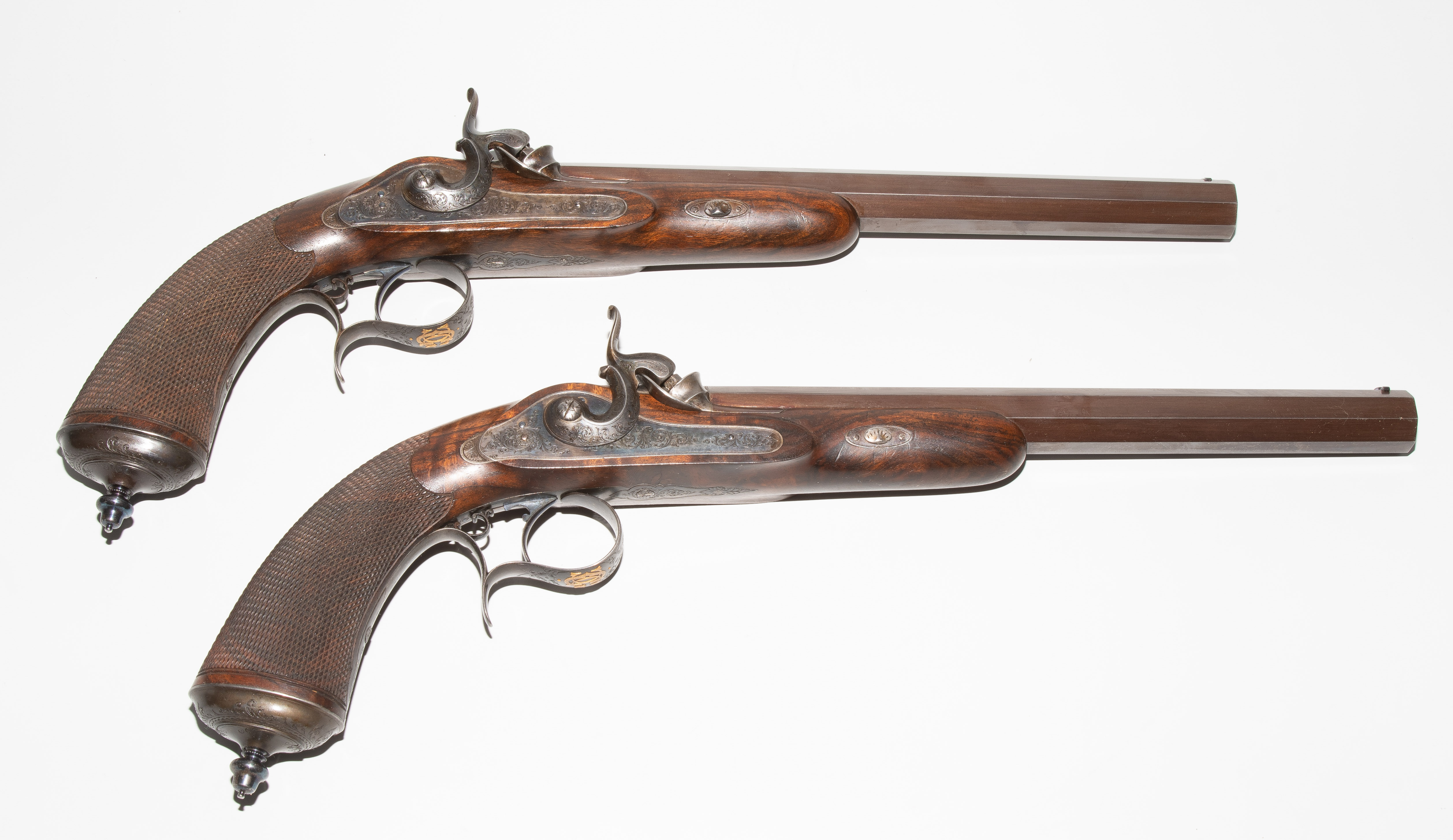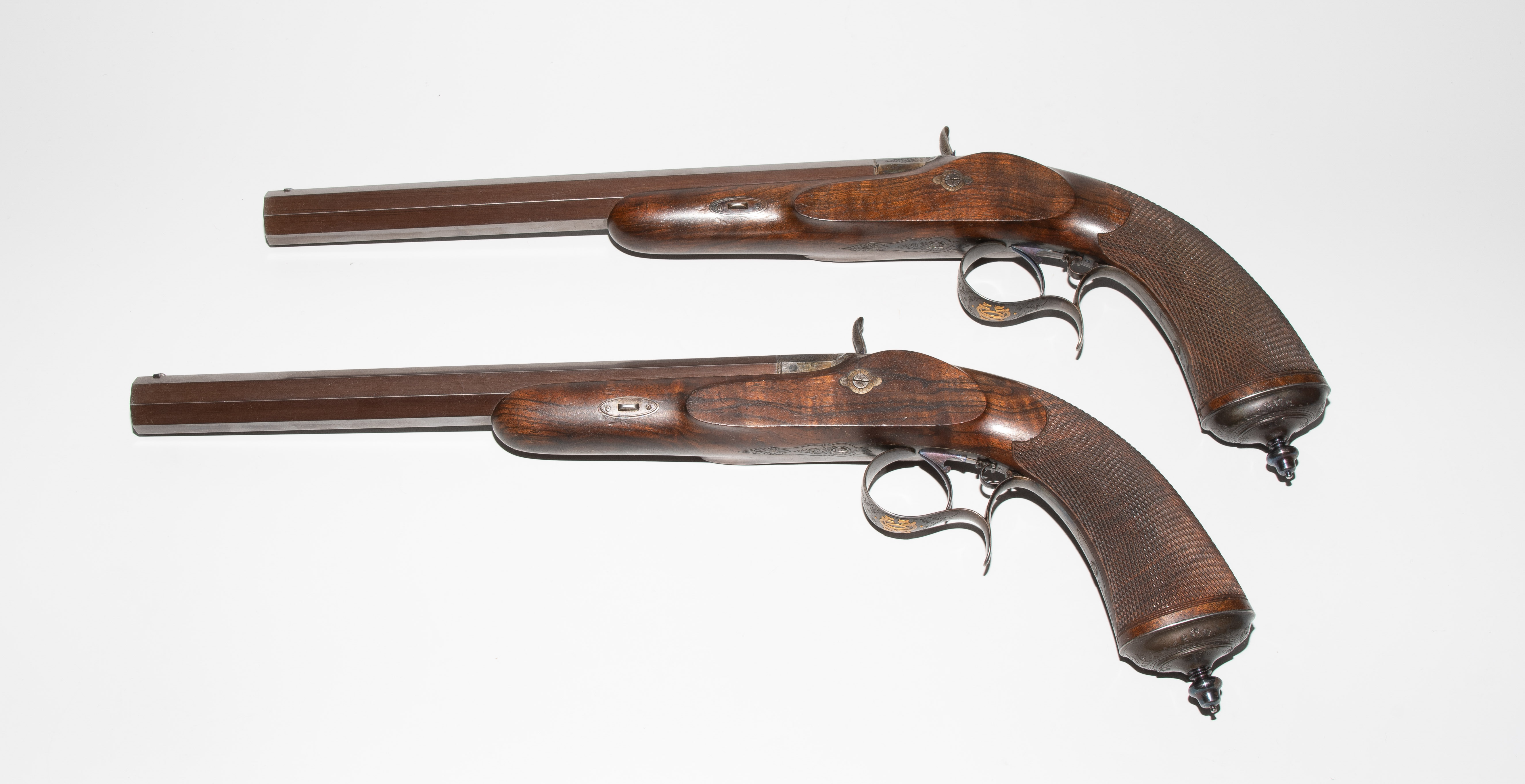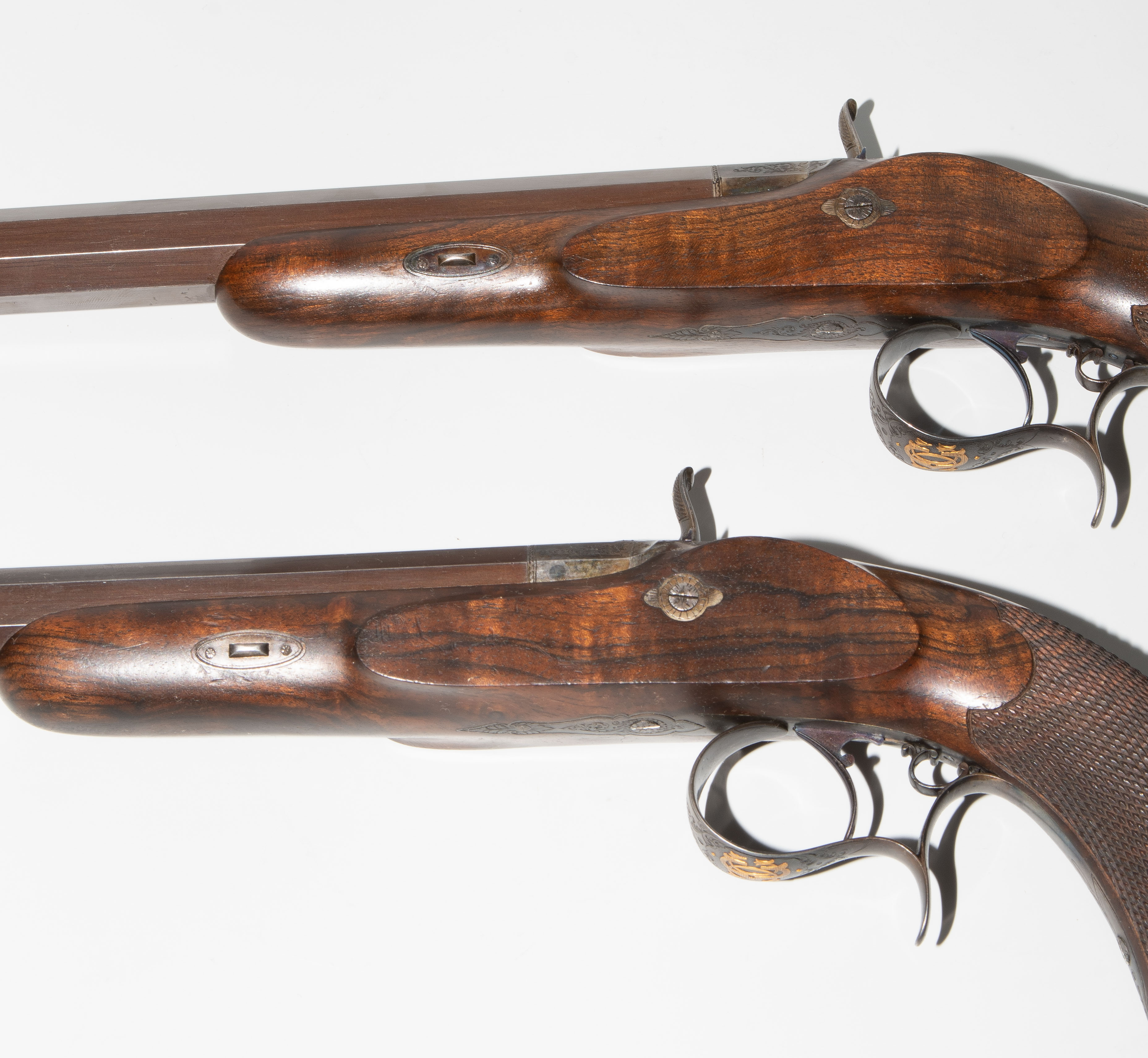 Frankreich, Paris, um 1845, private Duellpistolen. Nummerierte, brünierte Oktogonalläufe (L 26,6 cm) mit Standvisier und geschobenem, gebläutem Korn, Kal. 14 mm, gezogen. Laufoberseiten bez. "F(our)ni par Gastinne Renette à Paris". Schlossplatten flach, Hähne mit Mittelgrat, beides wie die Eisengarnituren brüniert und floral graviert. Am Abzugbügel jeweils in Gold aufgelegt ein Besitzermonogramm "CCG(?)". Dunkel gebeizte Nussbaum-Halbschäfte mit gewaffeltem Griffstück. L 41,5 cm. Palisander-Kasten mit goldeingelegtem Deckel und Monogramm "CCG". Innen mit grünem Samt bespannt und im Deckel die Herstellerbezeichng. "GASTINNE RENETTE PARIS". Komplett erhaltenes Zubehör inklusive Zündhütchen und Kugelbeutel. Masse Kasten: 46 x 27 x 9 cm.