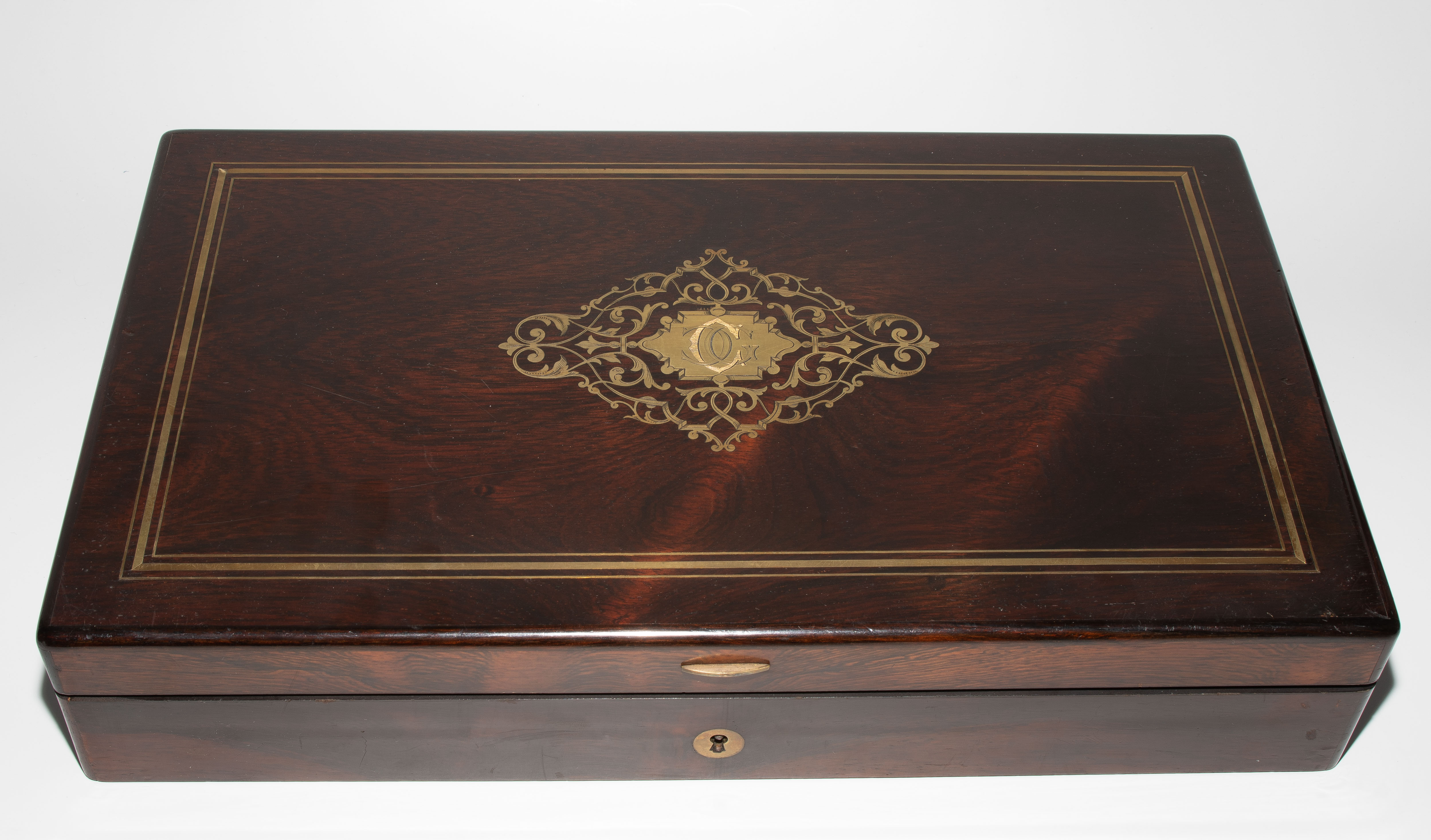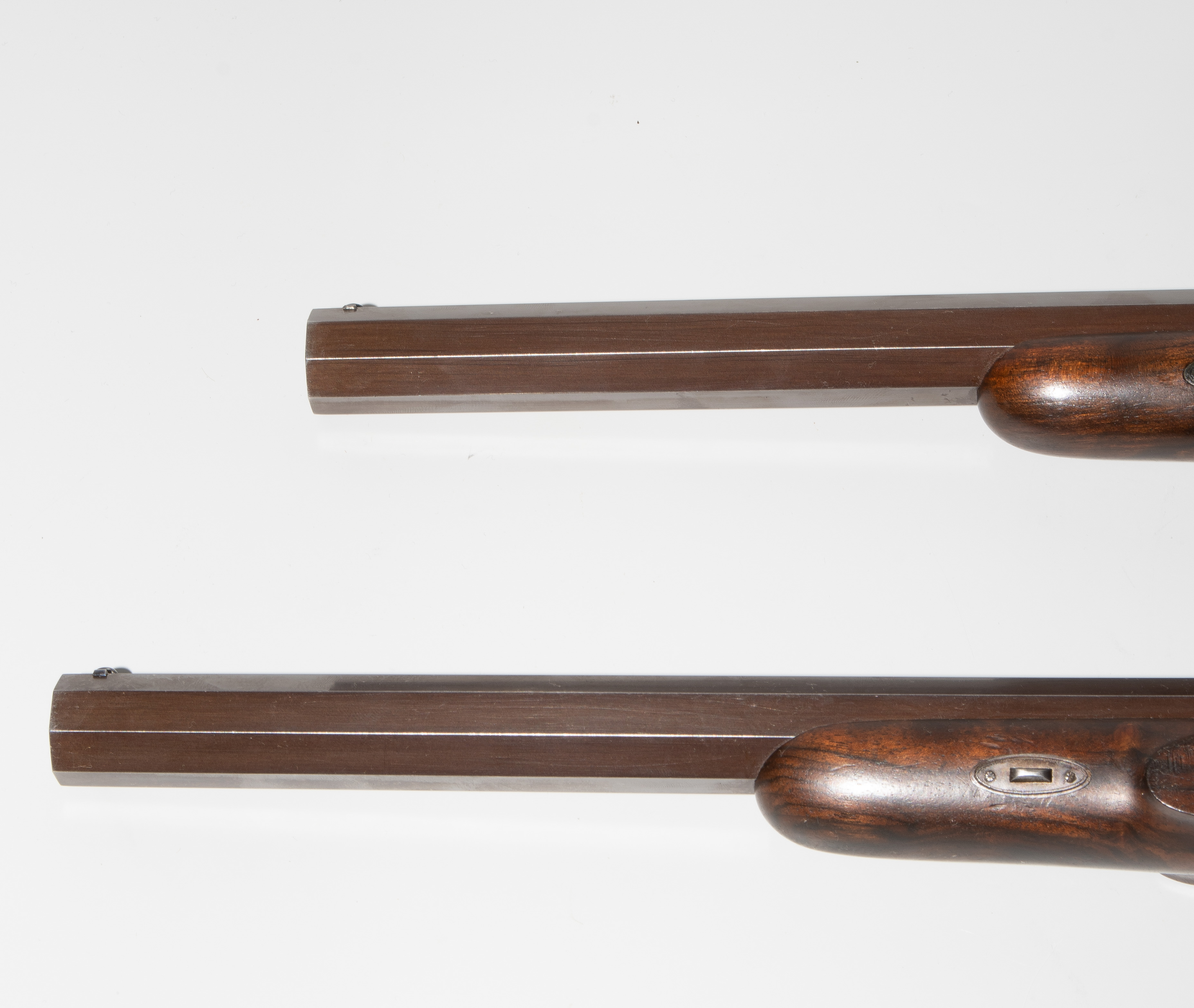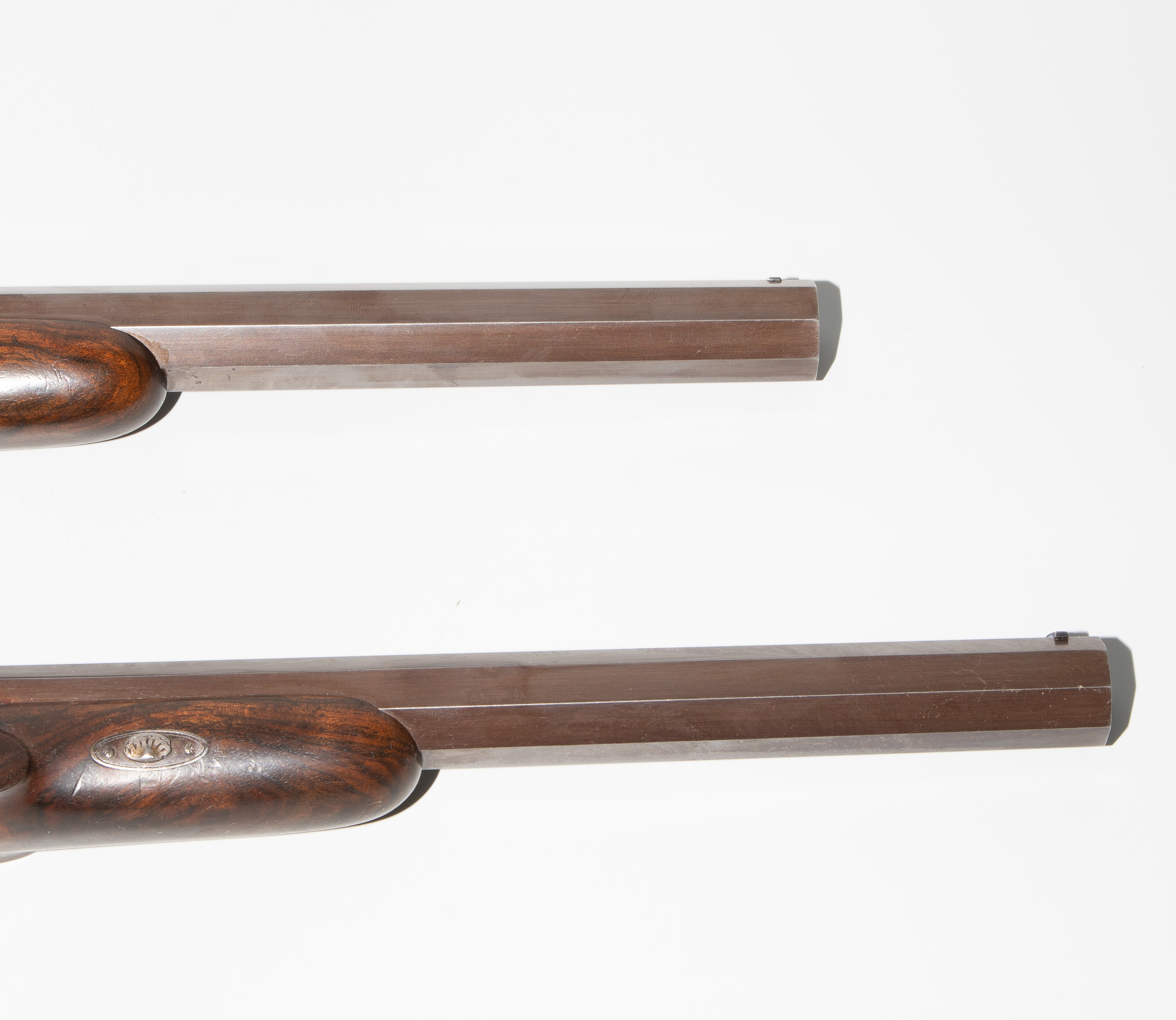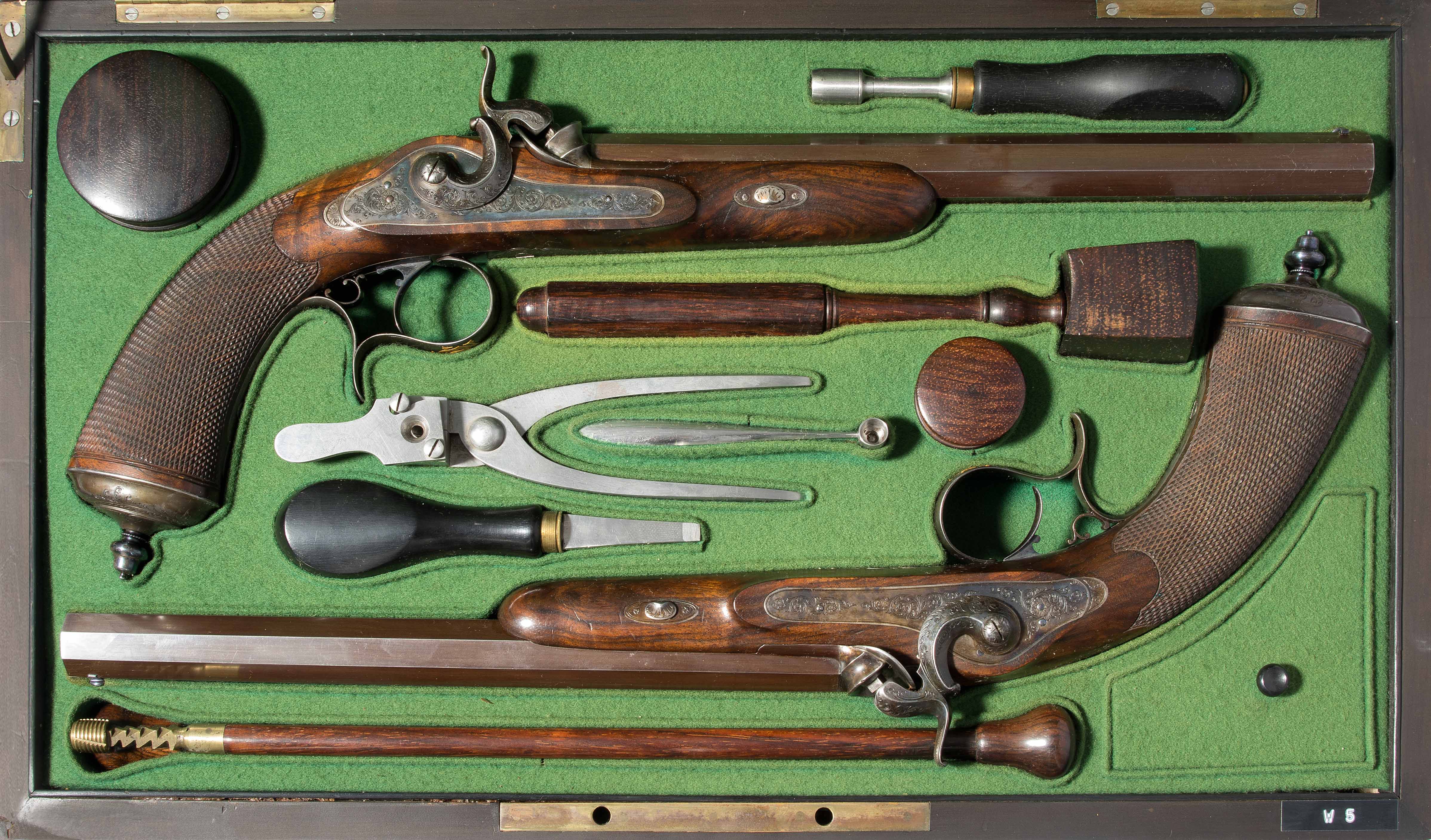 Frankreich, Paris, um 1845, private Duellpistolen. Nummerierte, brünierte Oktogonalläufe (L 26,6 cm) mit Standvisier und geschobenem, gebläutem Korn, Kal. 14 mm, gezogen. Laufoberseiten bez. "F(our)ni par Gastinne Renette à Paris". Schlossplatten flach, Hähne mit Mittelgrat, beides wie die Eisengarnituren brüniert und floral graviert. Am Abzugbügel jeweils in Gold aufgelegt ein Besitzermonogramm "CCG(?)". Dunkel gebeizte Nussbaum-Halbschäfte mit gewaffeltem Griffstück. L 41,5 cm. Palisander-Kasten mit goldeingelegtem Deckel und Monogramm "CCG". Innen mit grünem Samt bespannt und im Deckel die Herstellerbezeichng. "GASTINNE RENETTE PARIS". Komplett erhaltenes Zubehör inklusive Zündhütchen und Kugelbeutel. Masse Kasten: 46 x 27 x 9 cm.