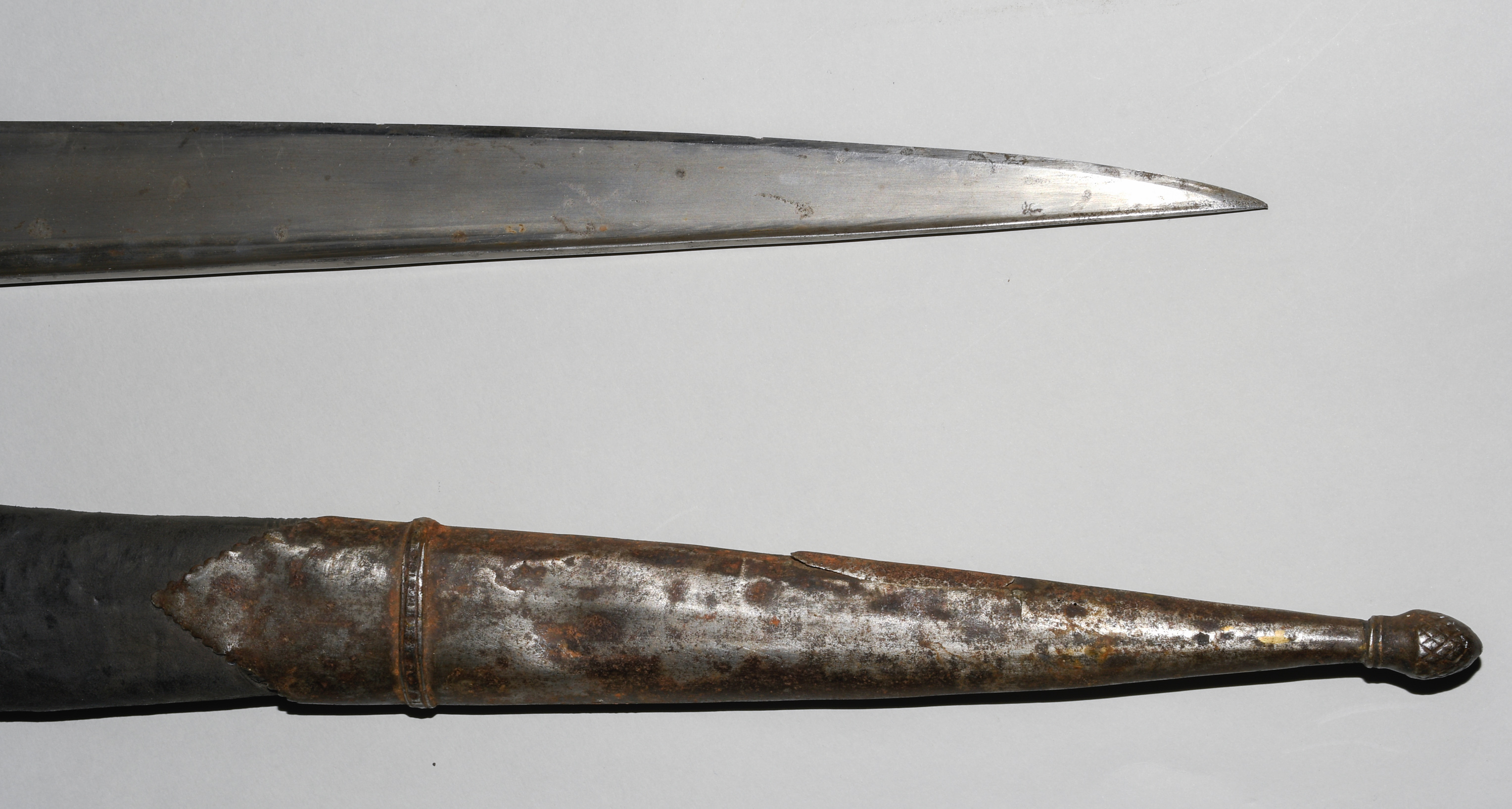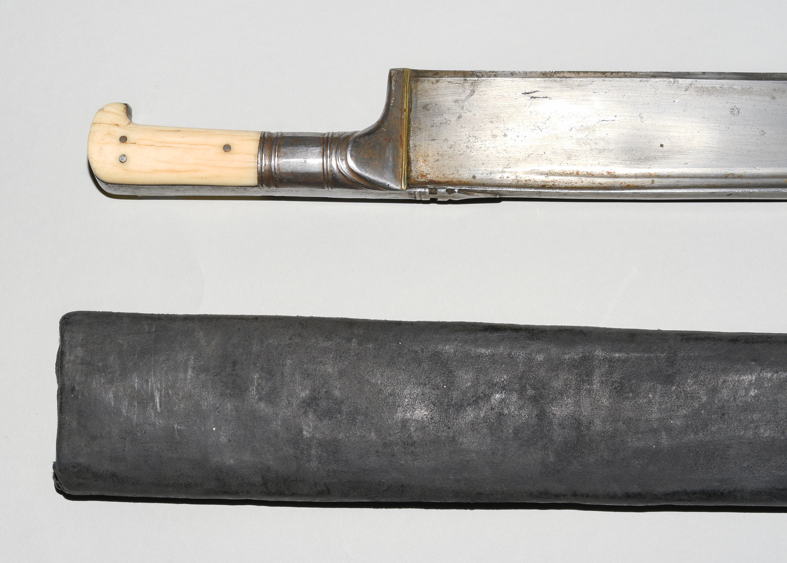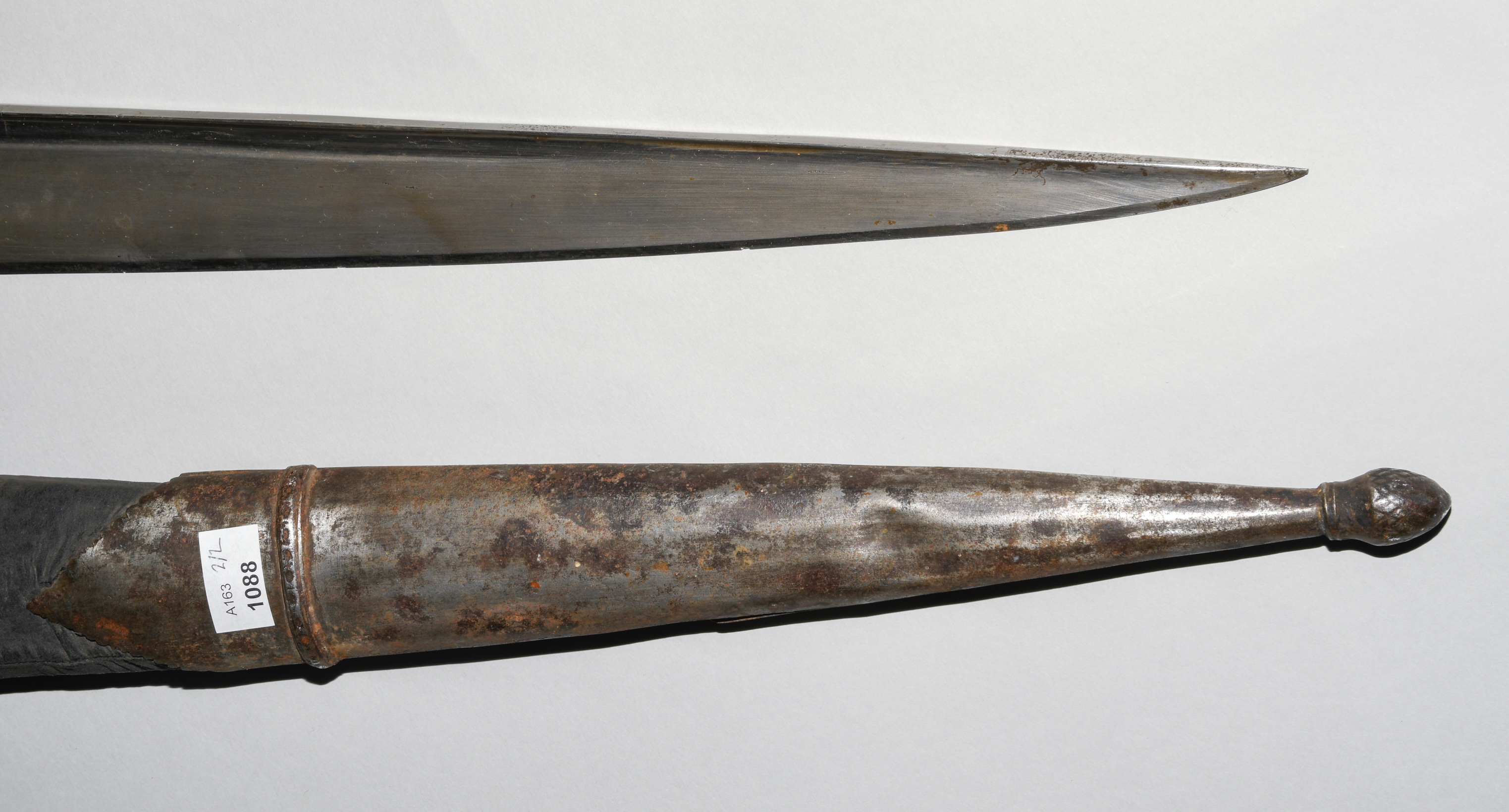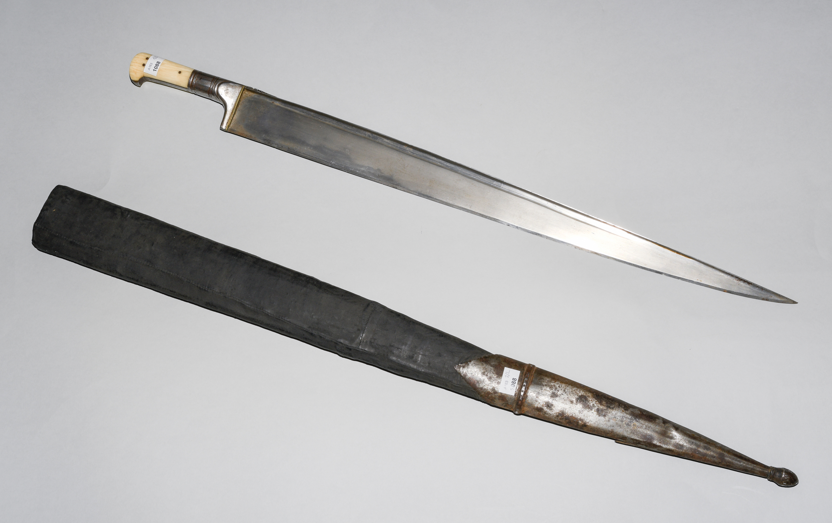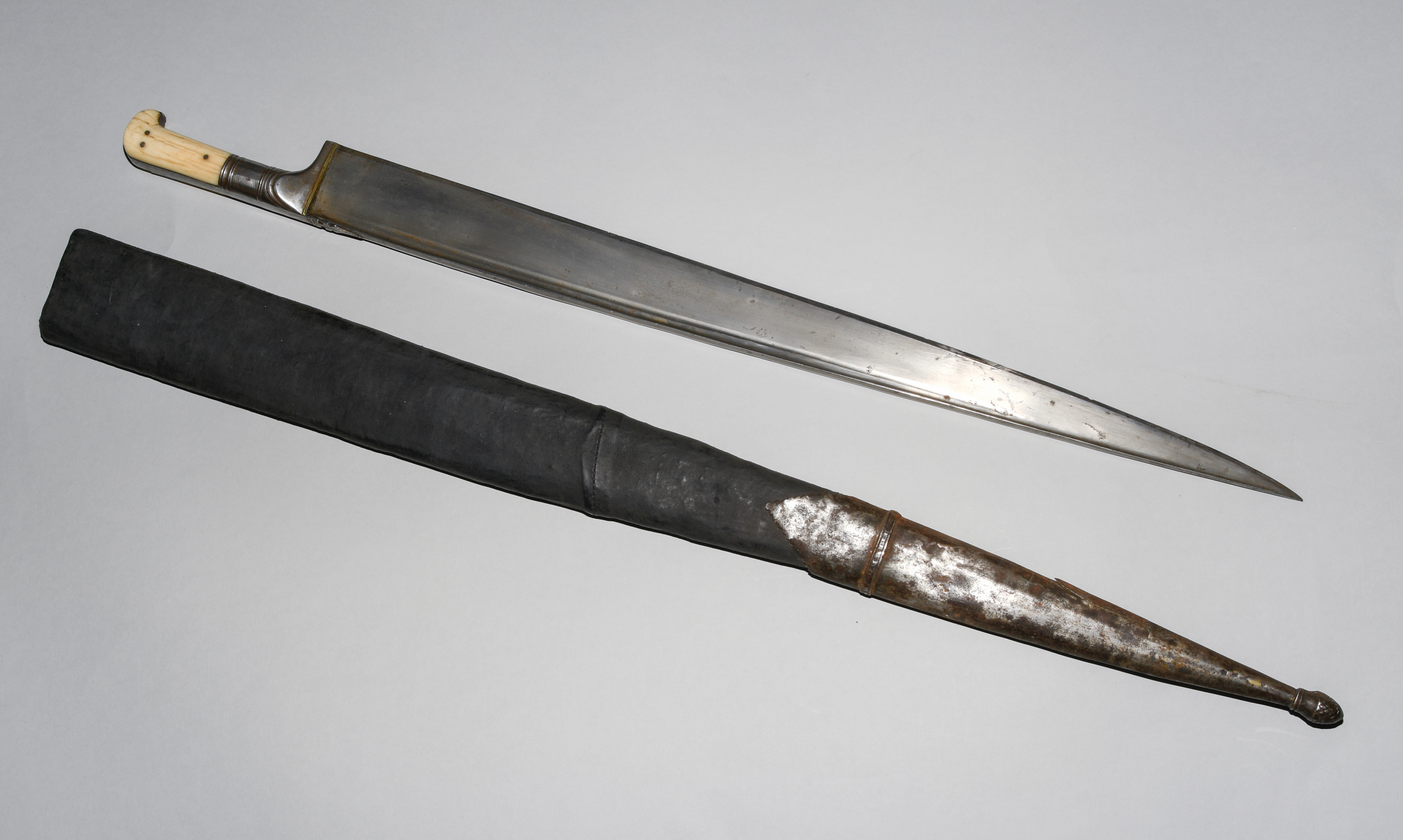 Afghanistan, 19. Jh. Gefäss aus poliertem Bein und befeiltem Eisen. T-Rückenklinge aus dichtem Wootz mit beidseits je einer Kehlung und „Härteschatten“. Schwarz lederbezogene Holzscheide mit korrodiertem und etwas beschädigtem Ortblech. L ca. 72,5 cm.
