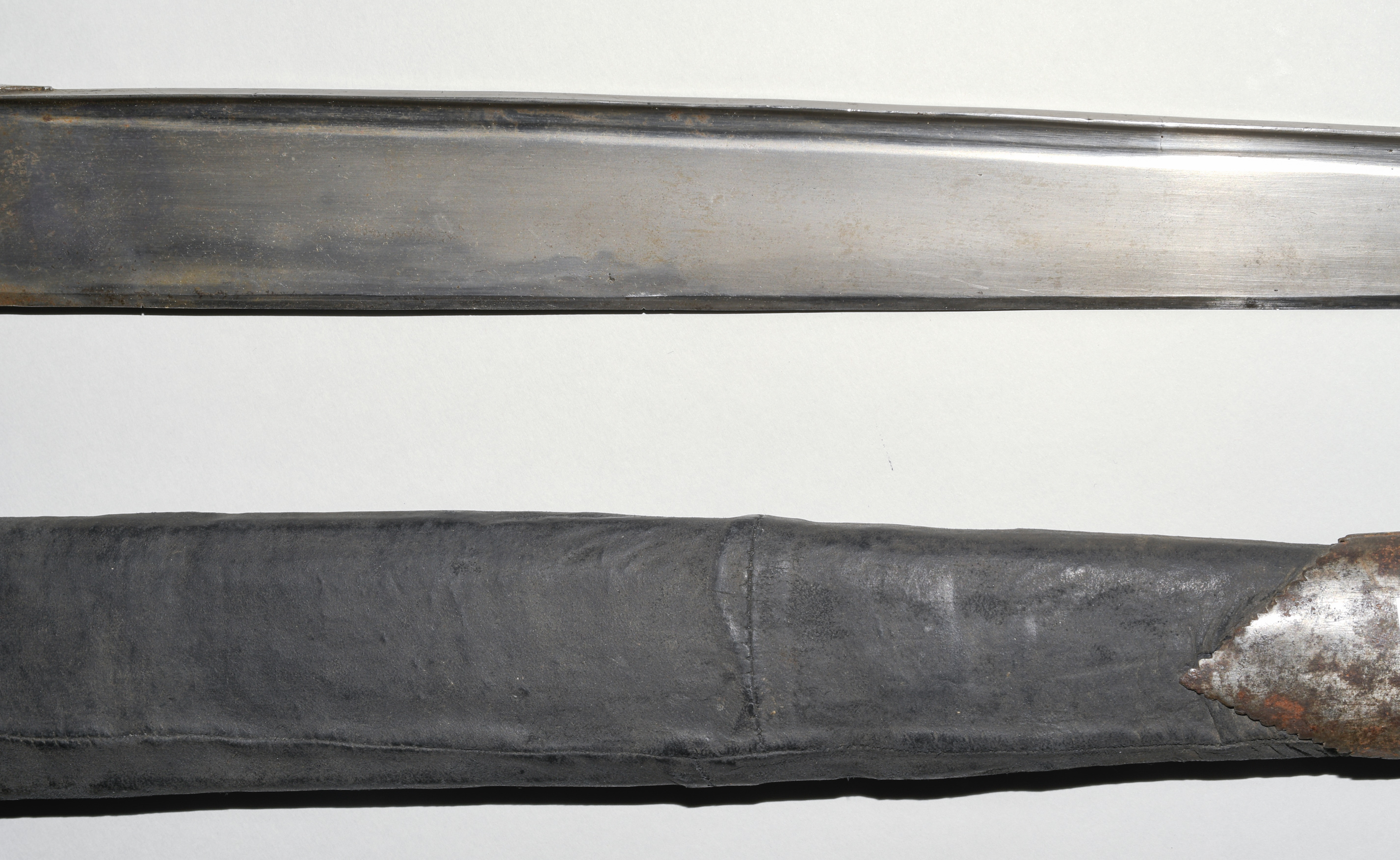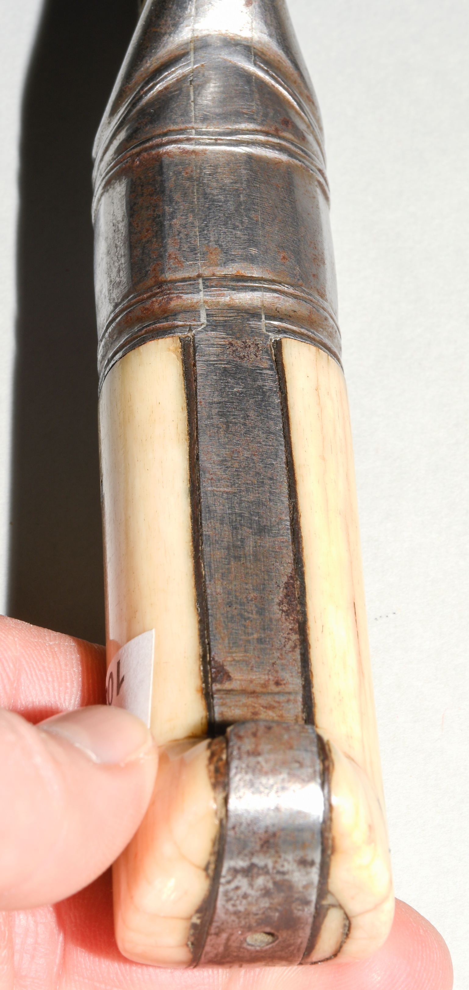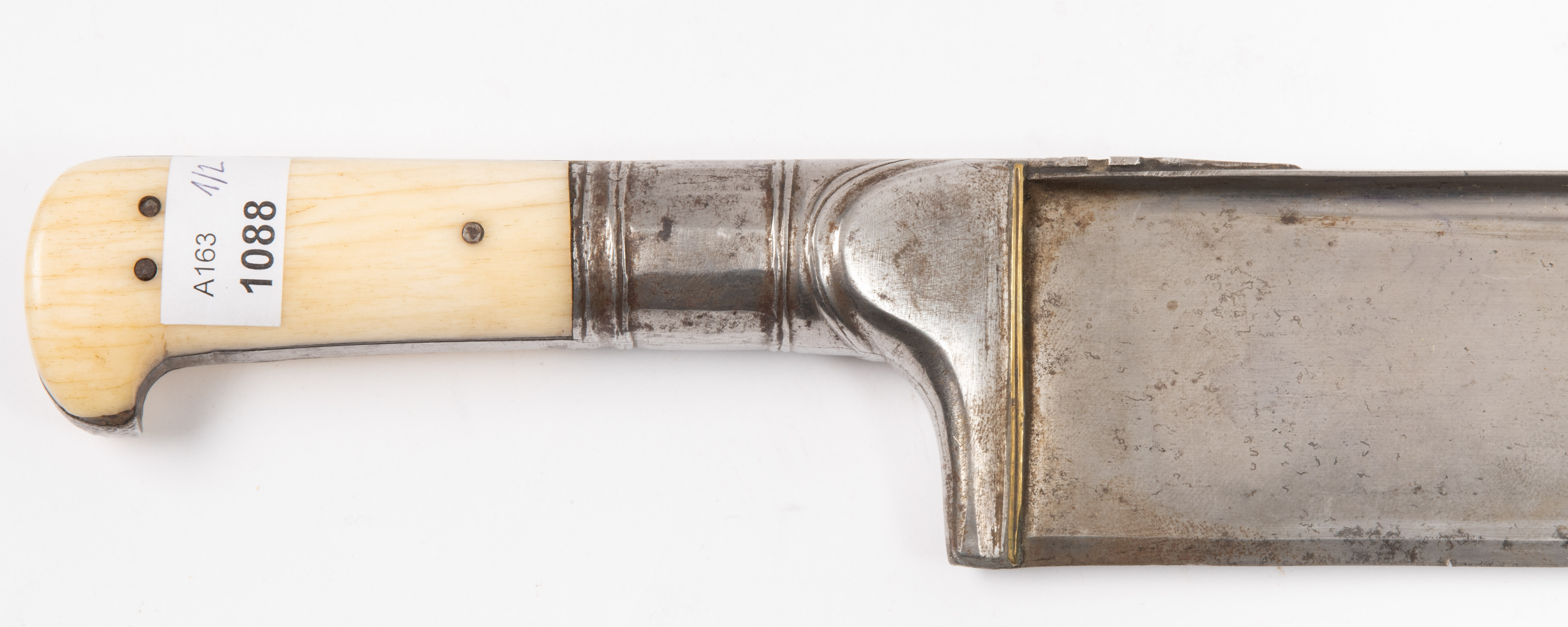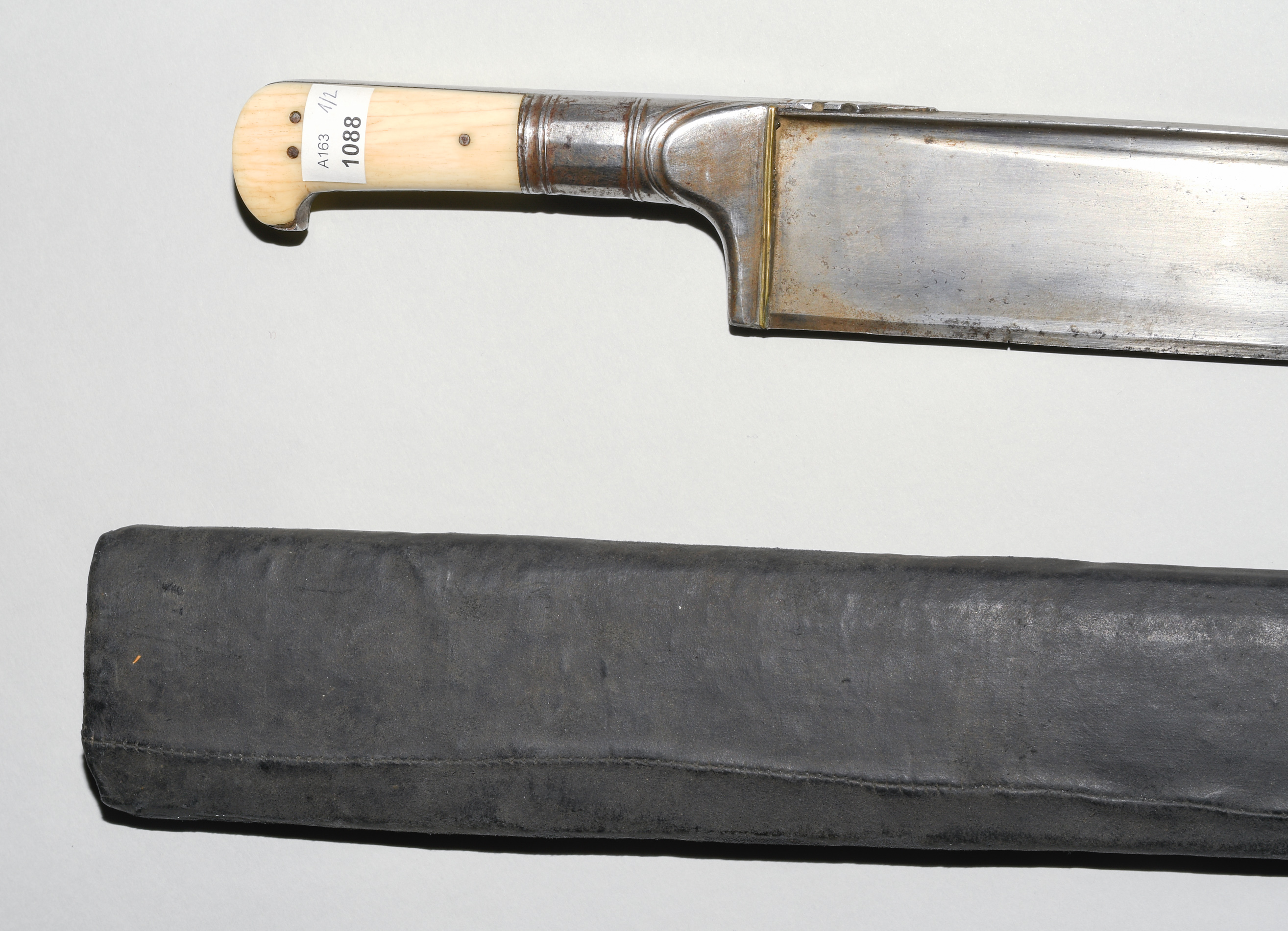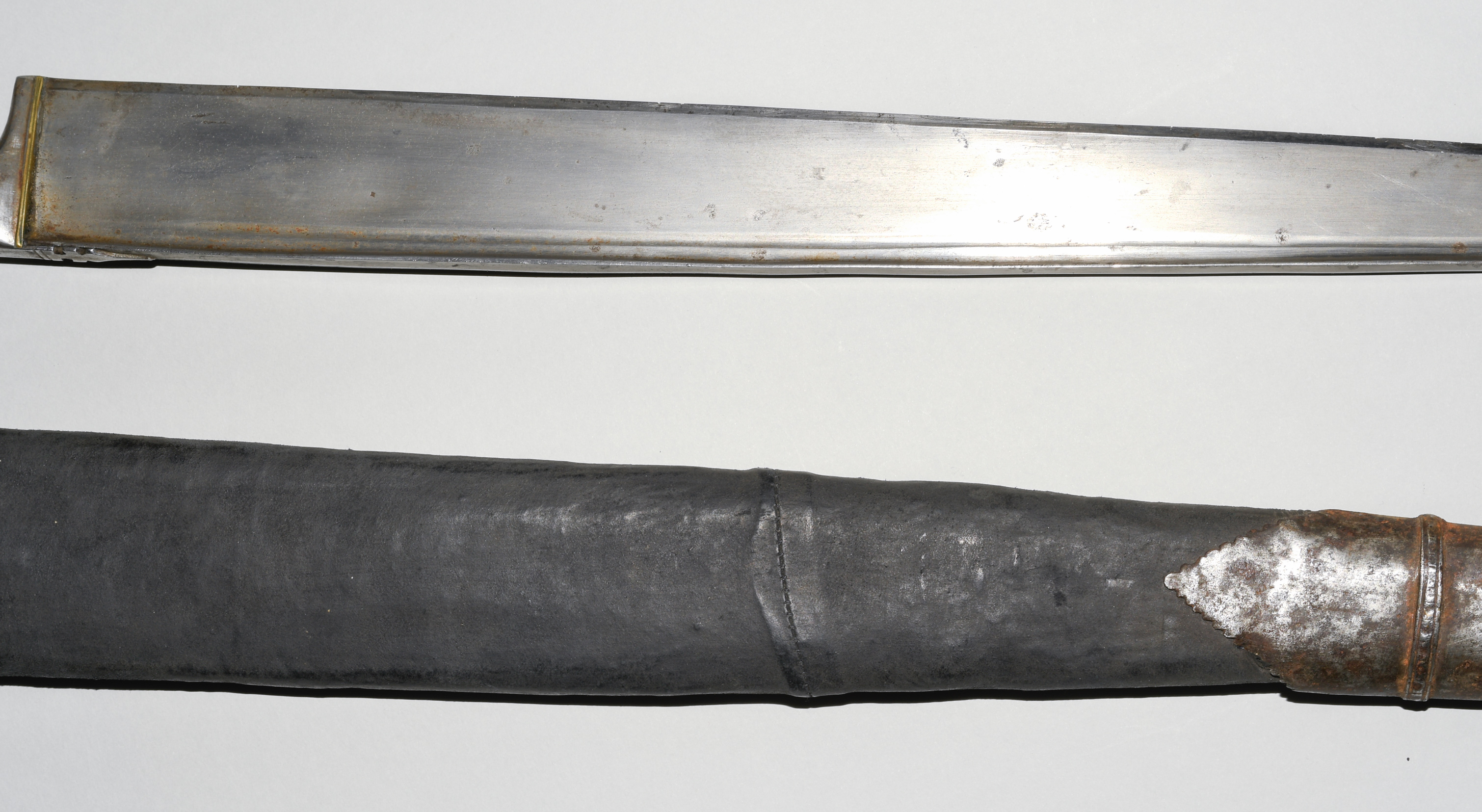 Afghanistan, 19. Jh. Gefäss aus poliertem Bein und befeiltem Eisen. T-Rückenklinge aus dichtem Wootz mit beidseits je einer Kehlung und „Härteschatten“. Schwarz lederbezogene Holzscheide mit korrodiertem und etwas beschädigtem Ortblech. L ca. 72,5 cm.