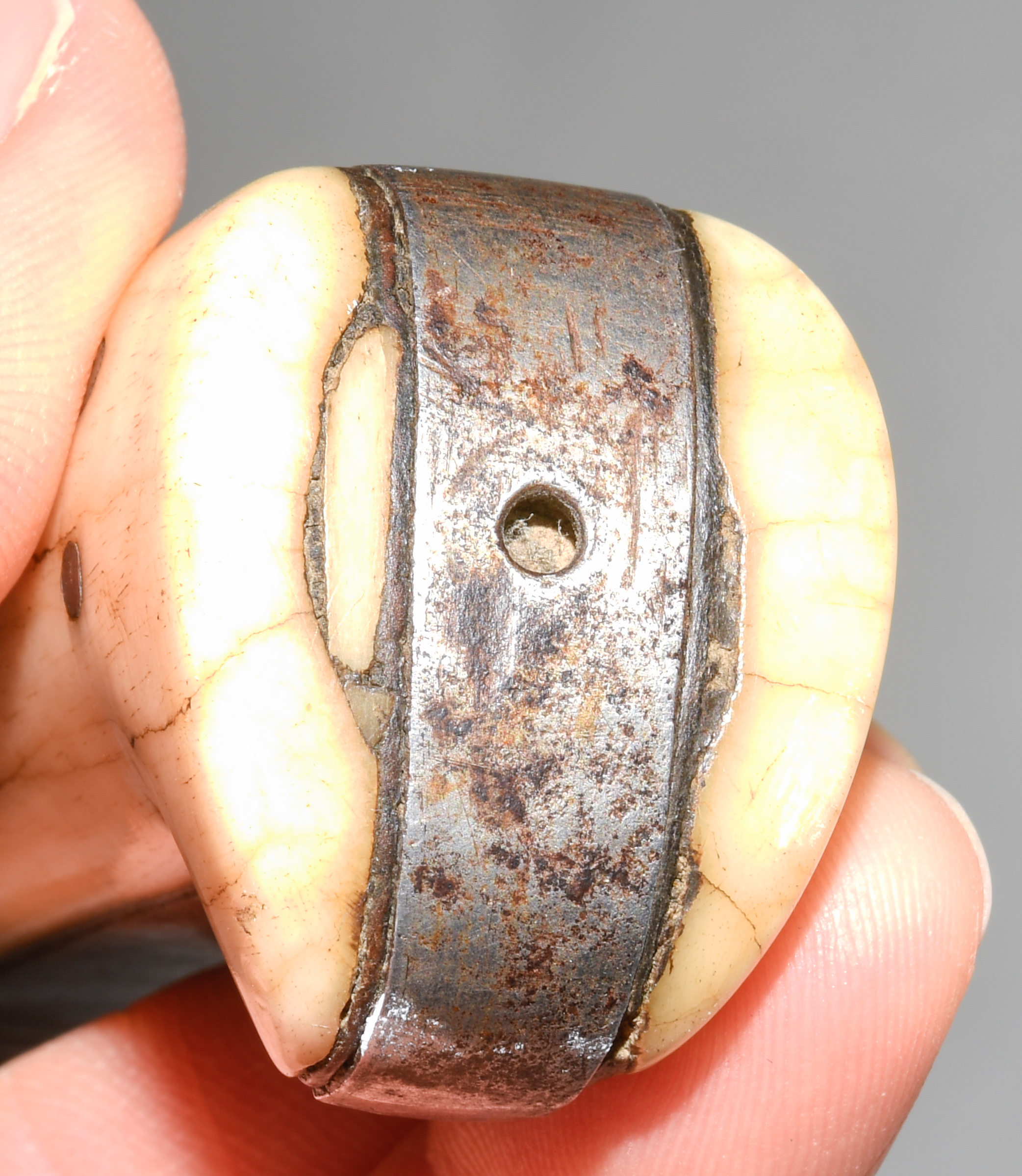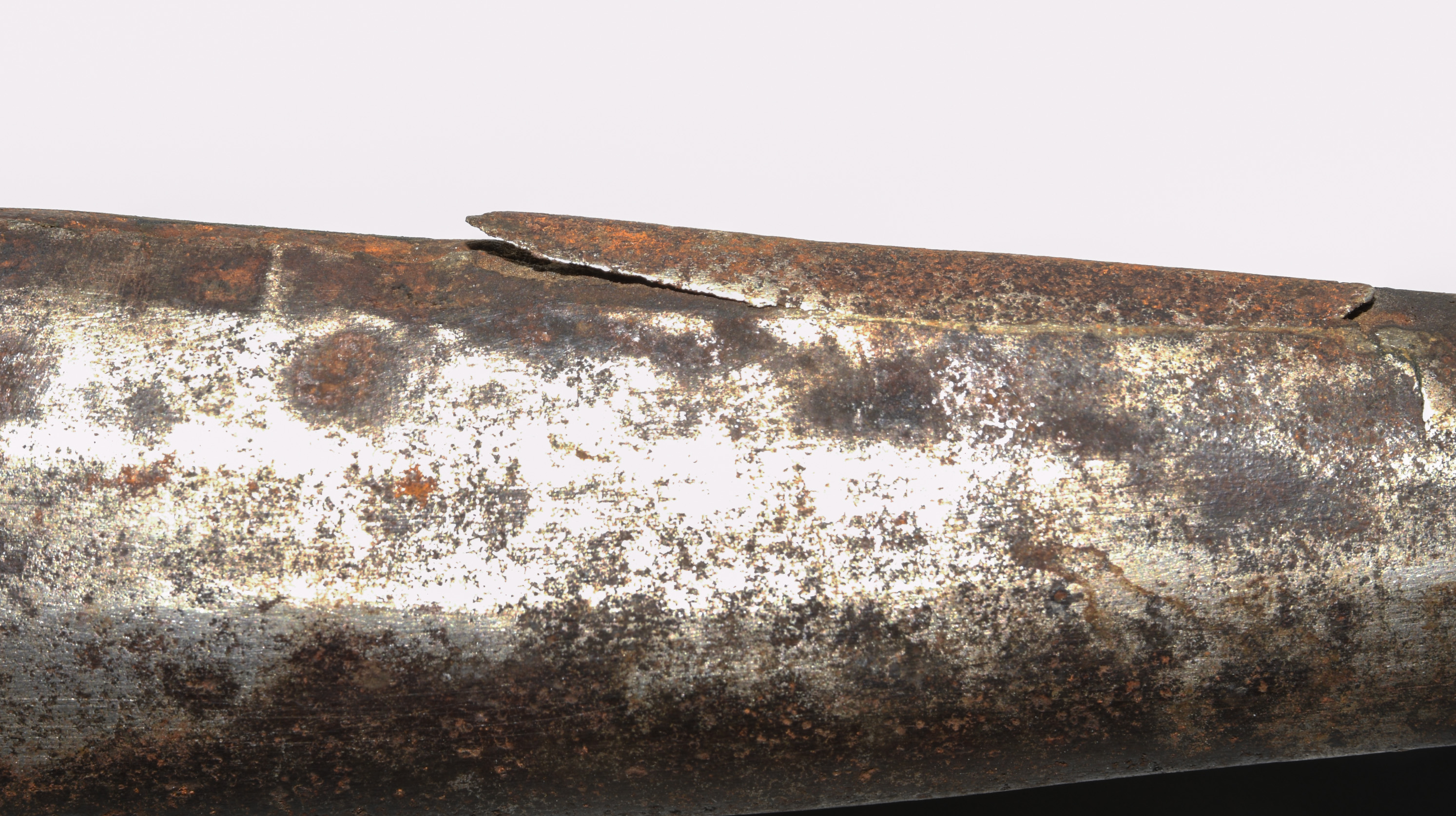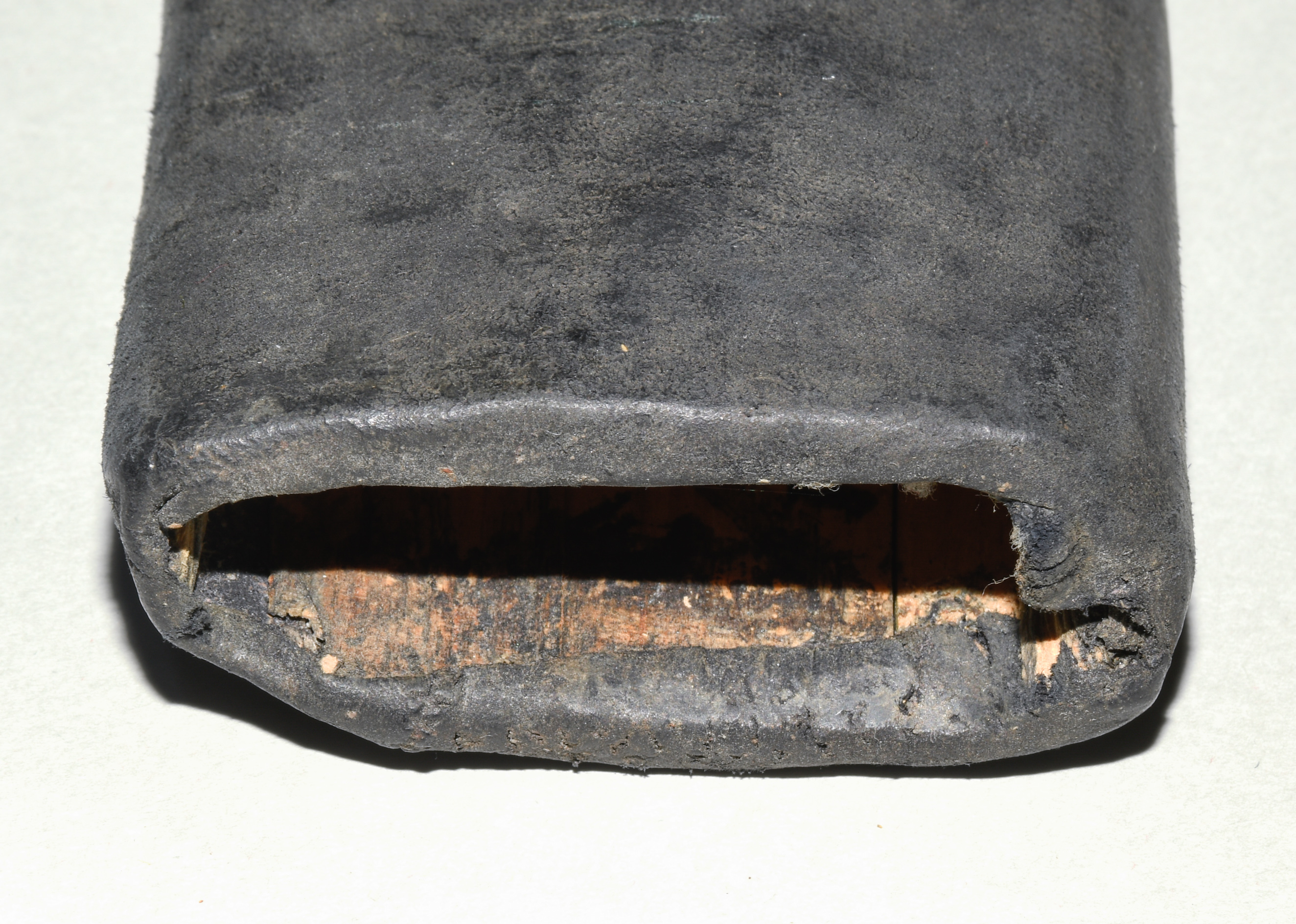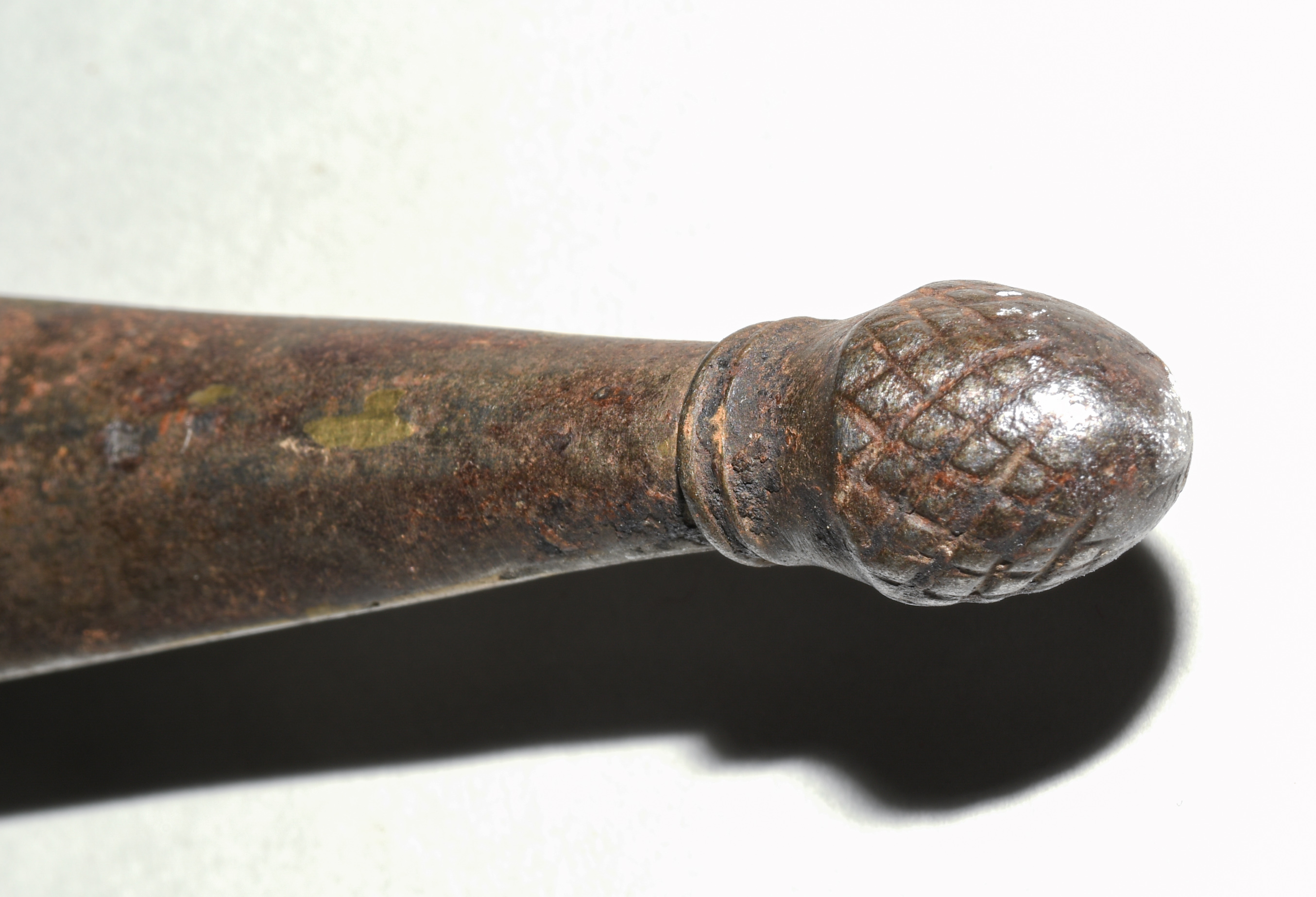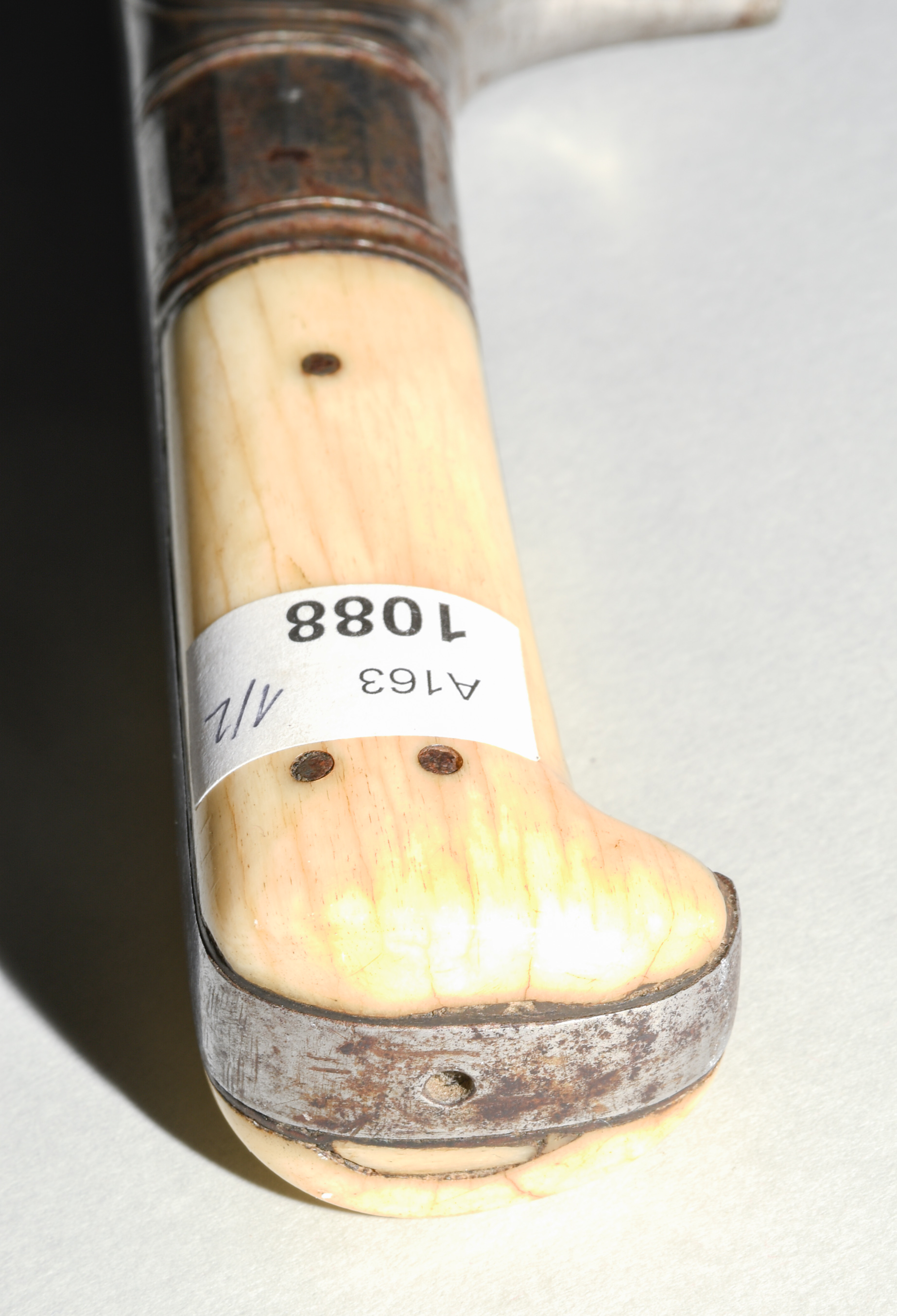 Afghanistan, 19. Jh. Gefäss aus poliertem Bein und befeiltem Eisen. T-Rückenklinge aus dichtem Wootz mit beidseits je einer Kehlung und „Härteschatten“. Schwarz lederbezogene Holzscheide mit korrodiertem und etwas beschädigtem Ortblech. L ca. 72,5 cm.