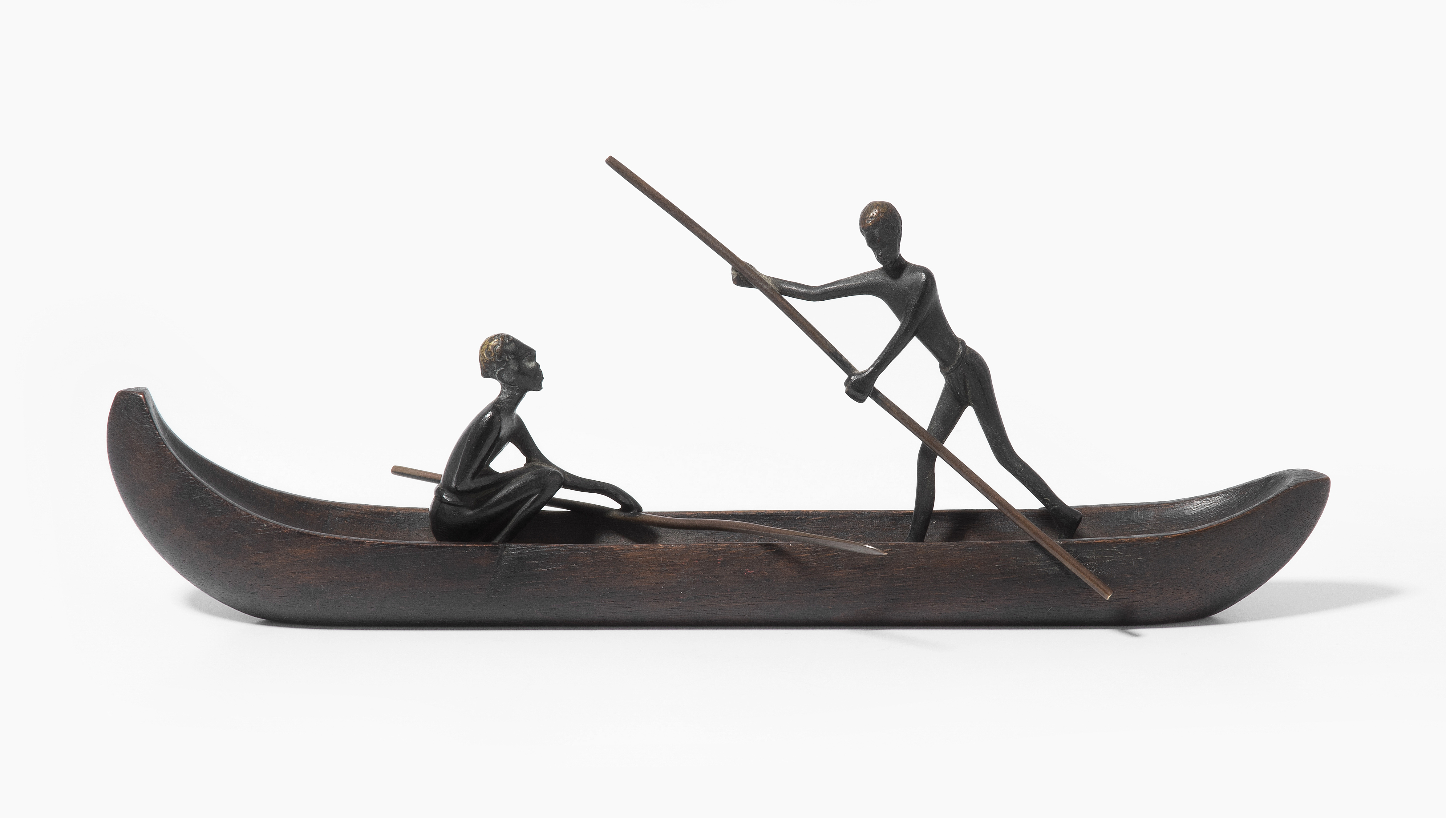 Wien, 1940/50er Jahre. Holz/Bronze, dunkel patiniert. Unbezeichnet. Kanufahrer. L 22,5 cm.