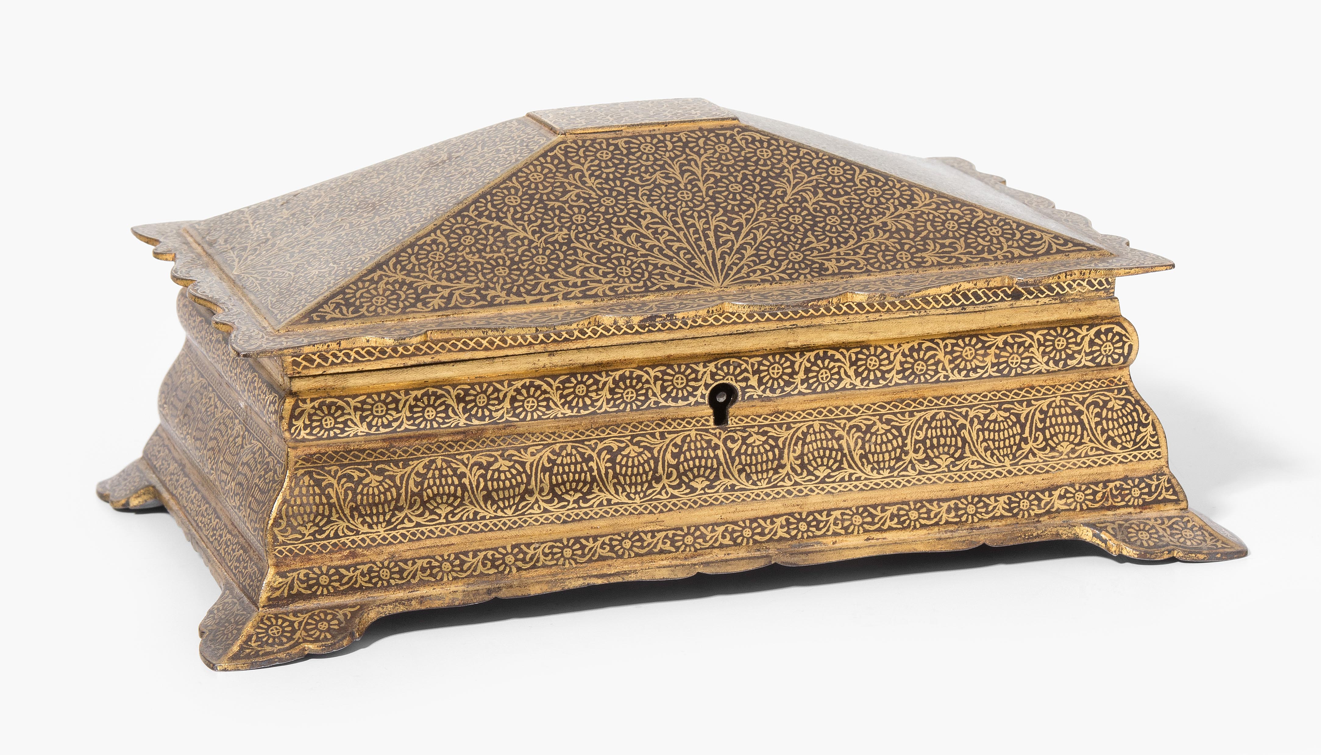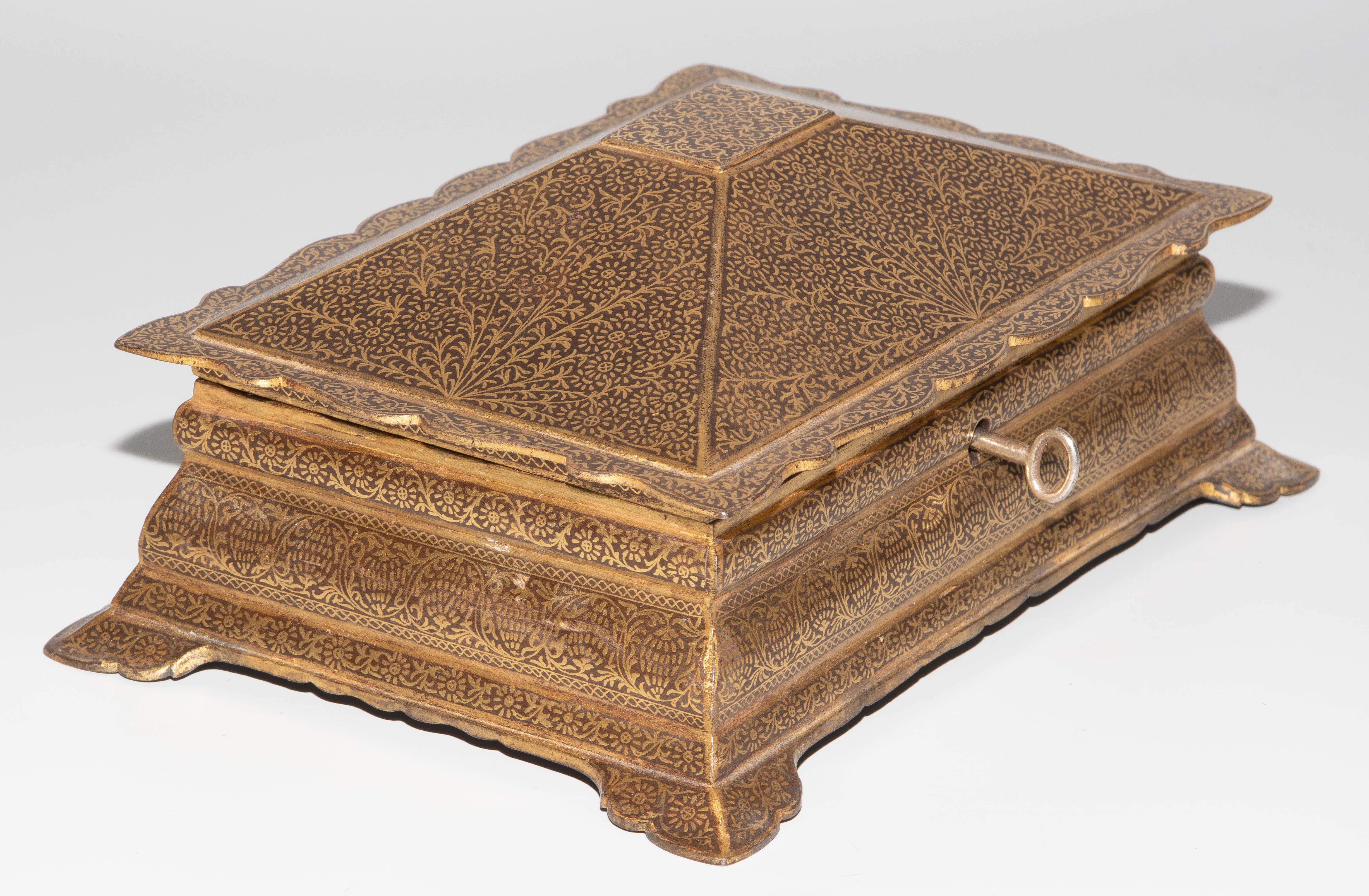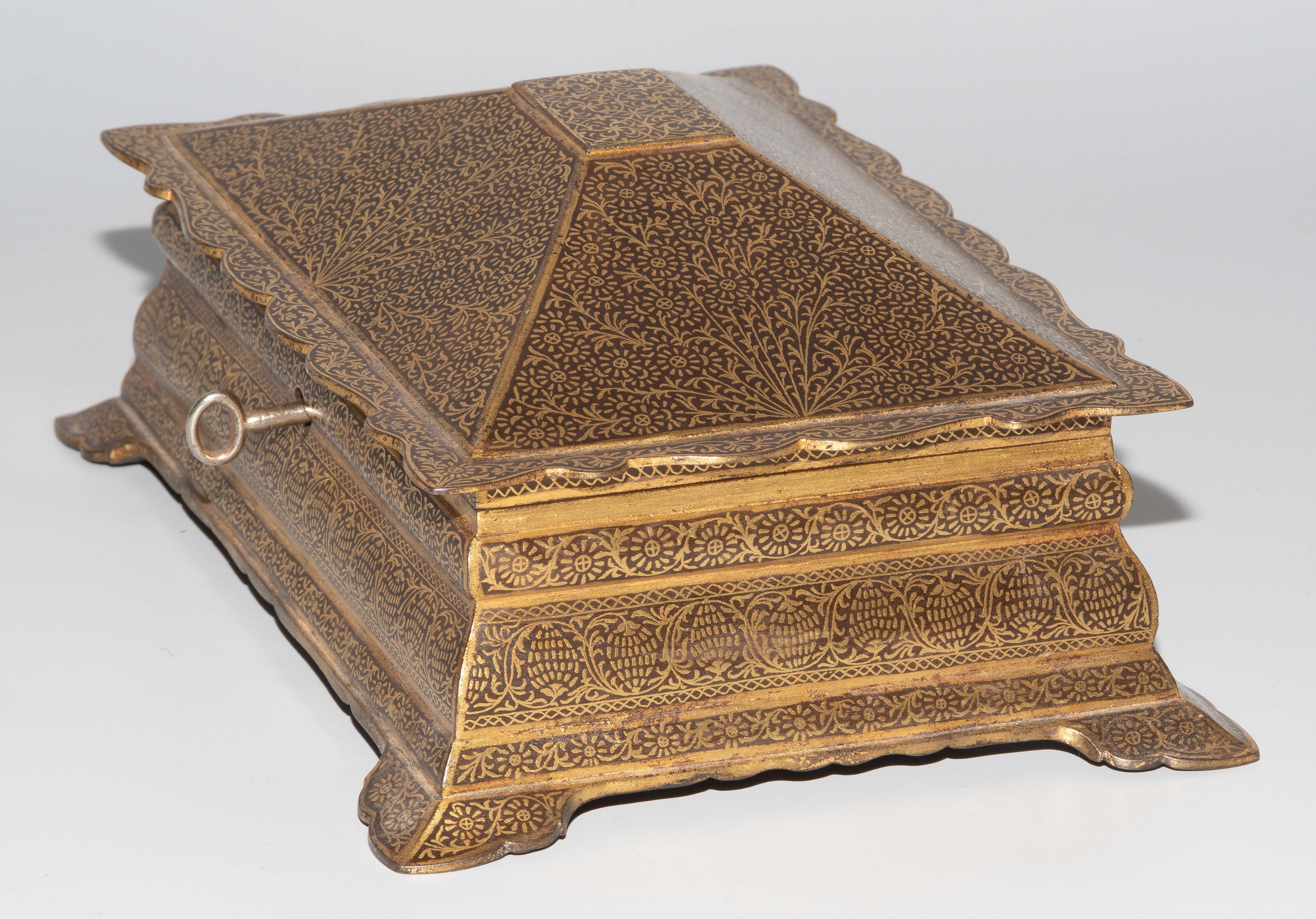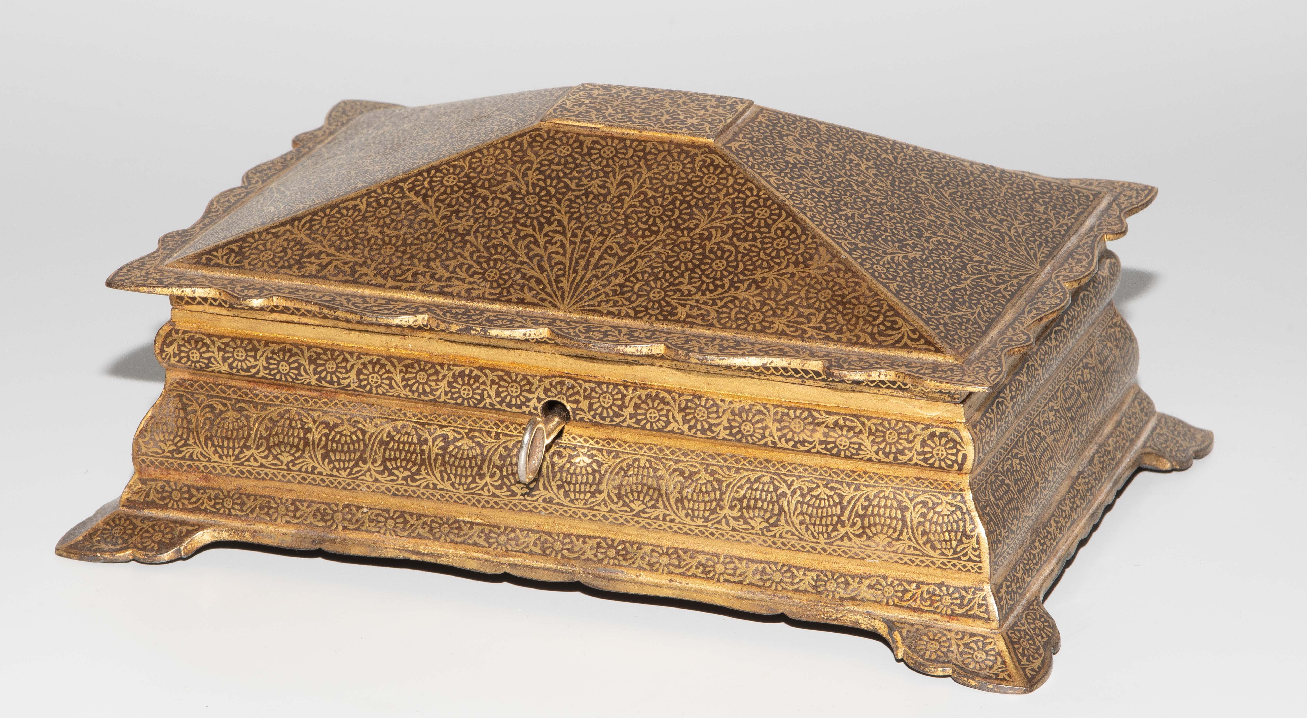 Orientalisch, wohl 19.Jh. Eisen, tlw. Geätzt. Goldornamentik mit pflanzlichem Dekor. Stufiger Korpus auf vier Füssen. Scharnierdeckel dachförmig mit geschweiftem Rand. Mit Schlüssel. 19x13,5x8 cm.