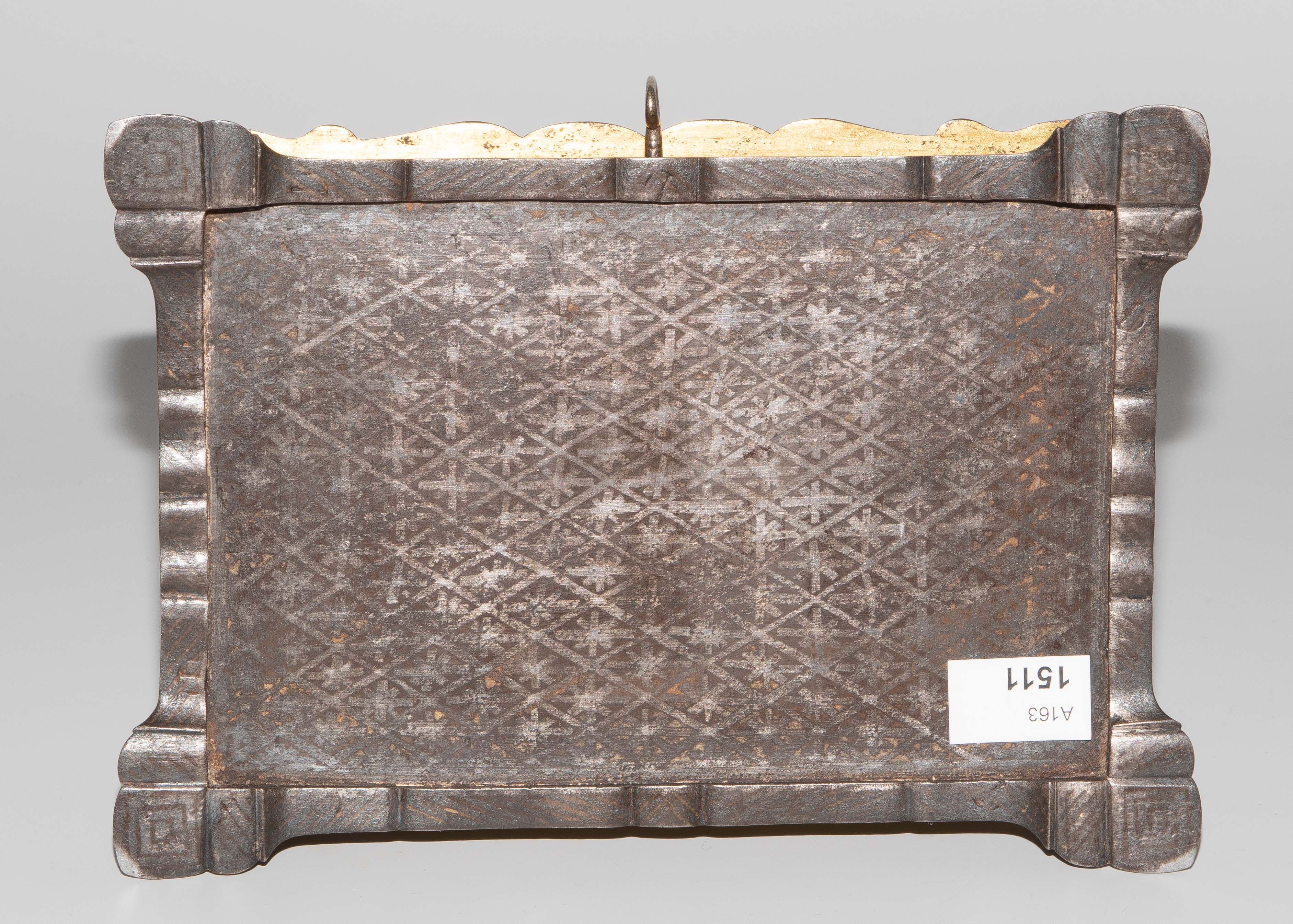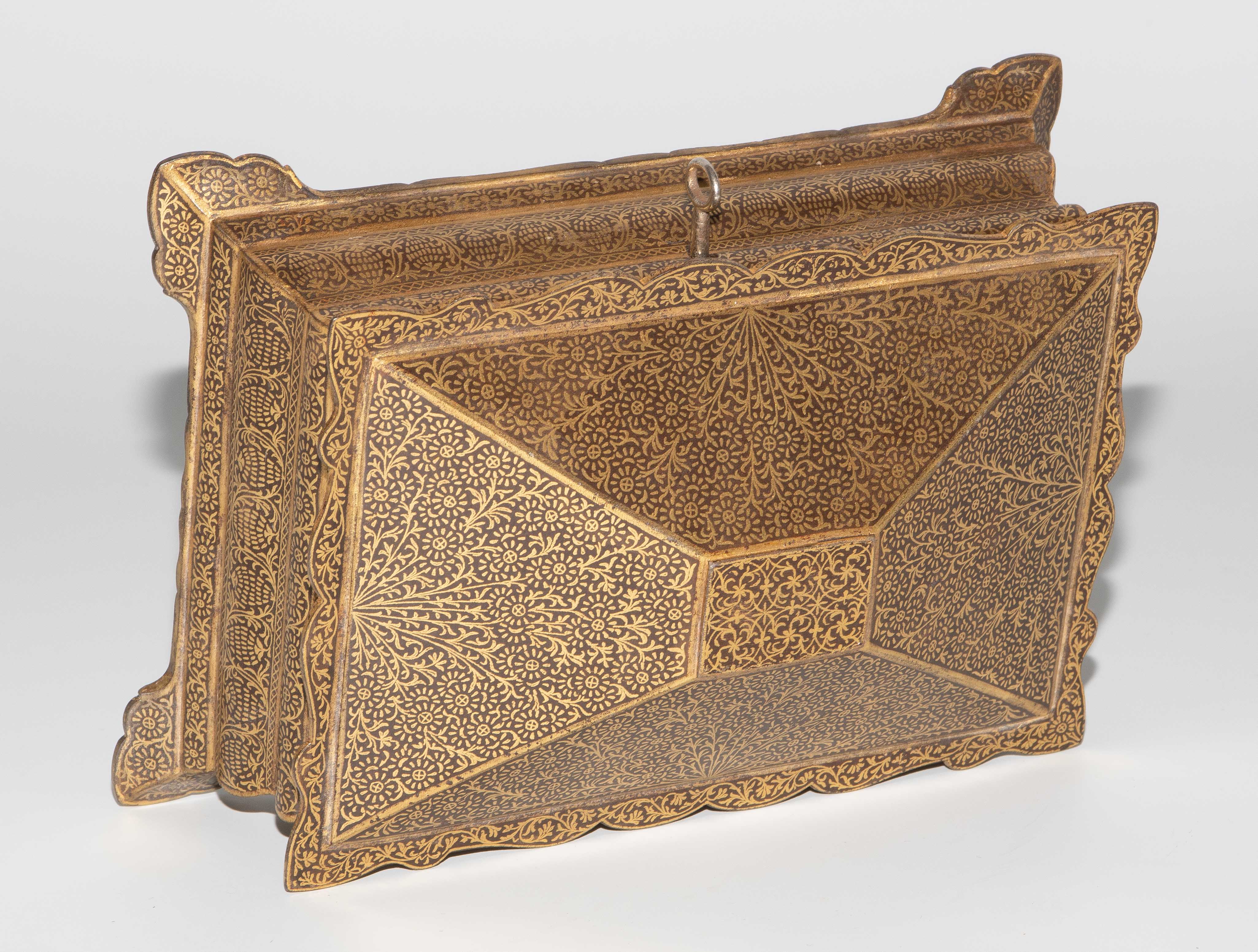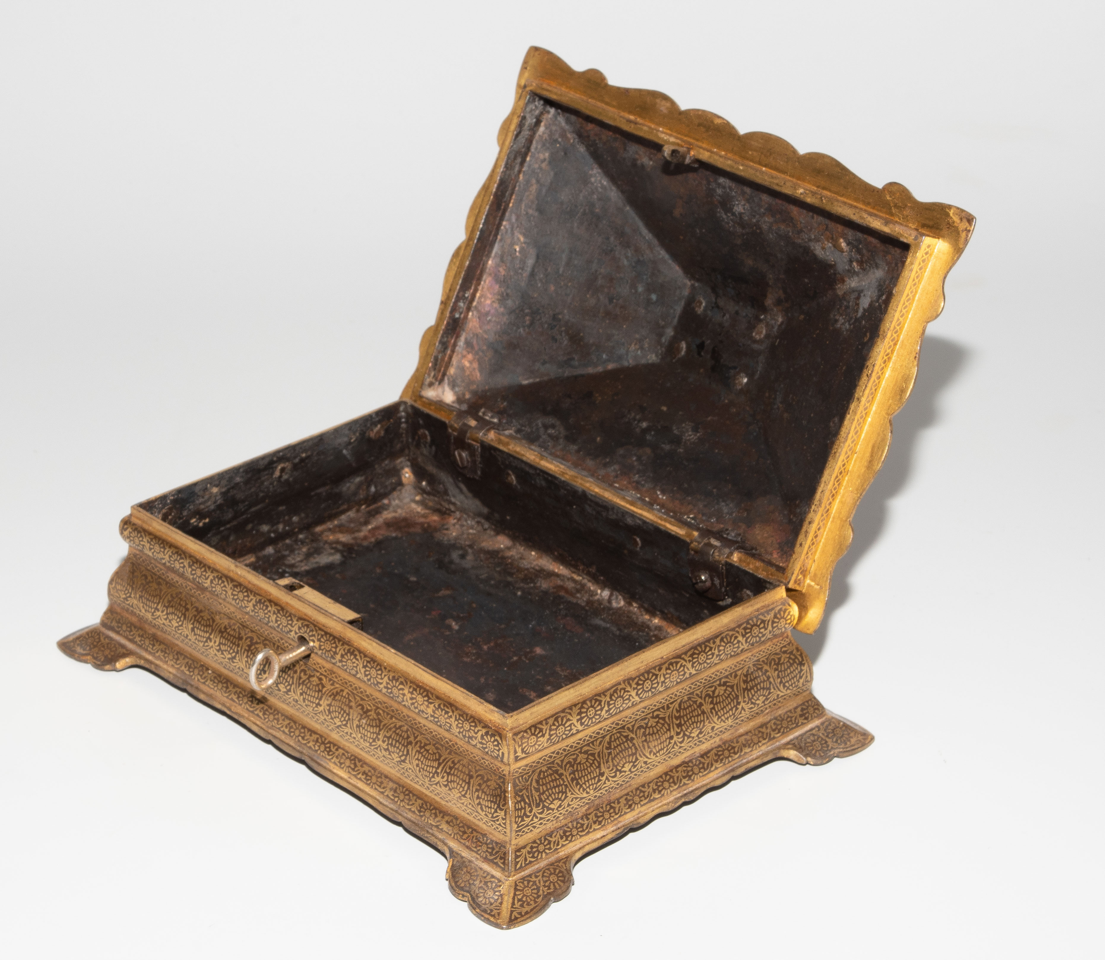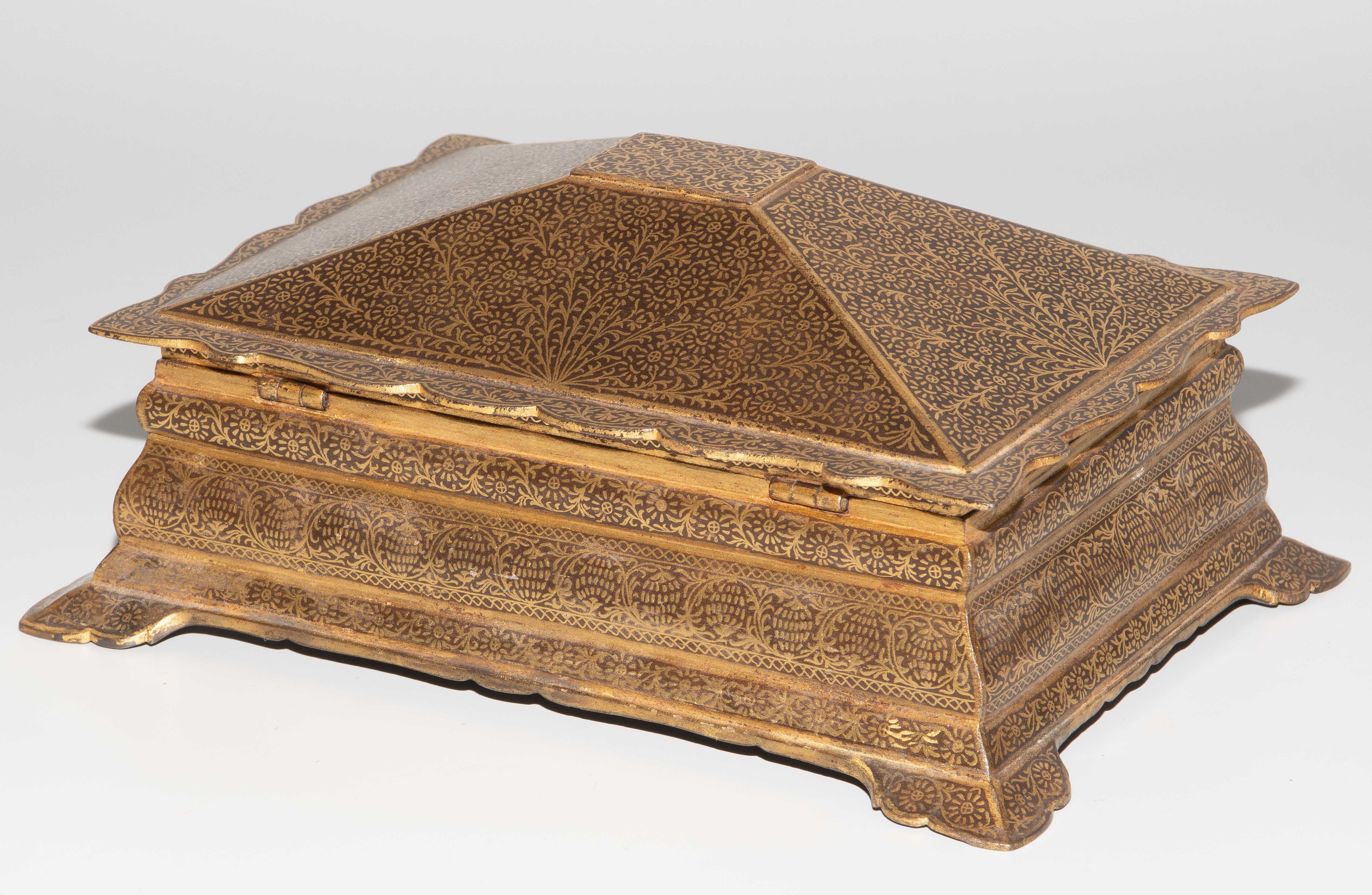Orientalisch, wohl 19.Jh. Eisen, tlw. Geätzt. Goldornamentik mit pflanzlichem Dekor. Stufiger Korpus auf vier Füssen. Scharnierdeckel dachförmig mit geschweiftem Rand. Mit Schlüssel. 19x13,5x8 cm.