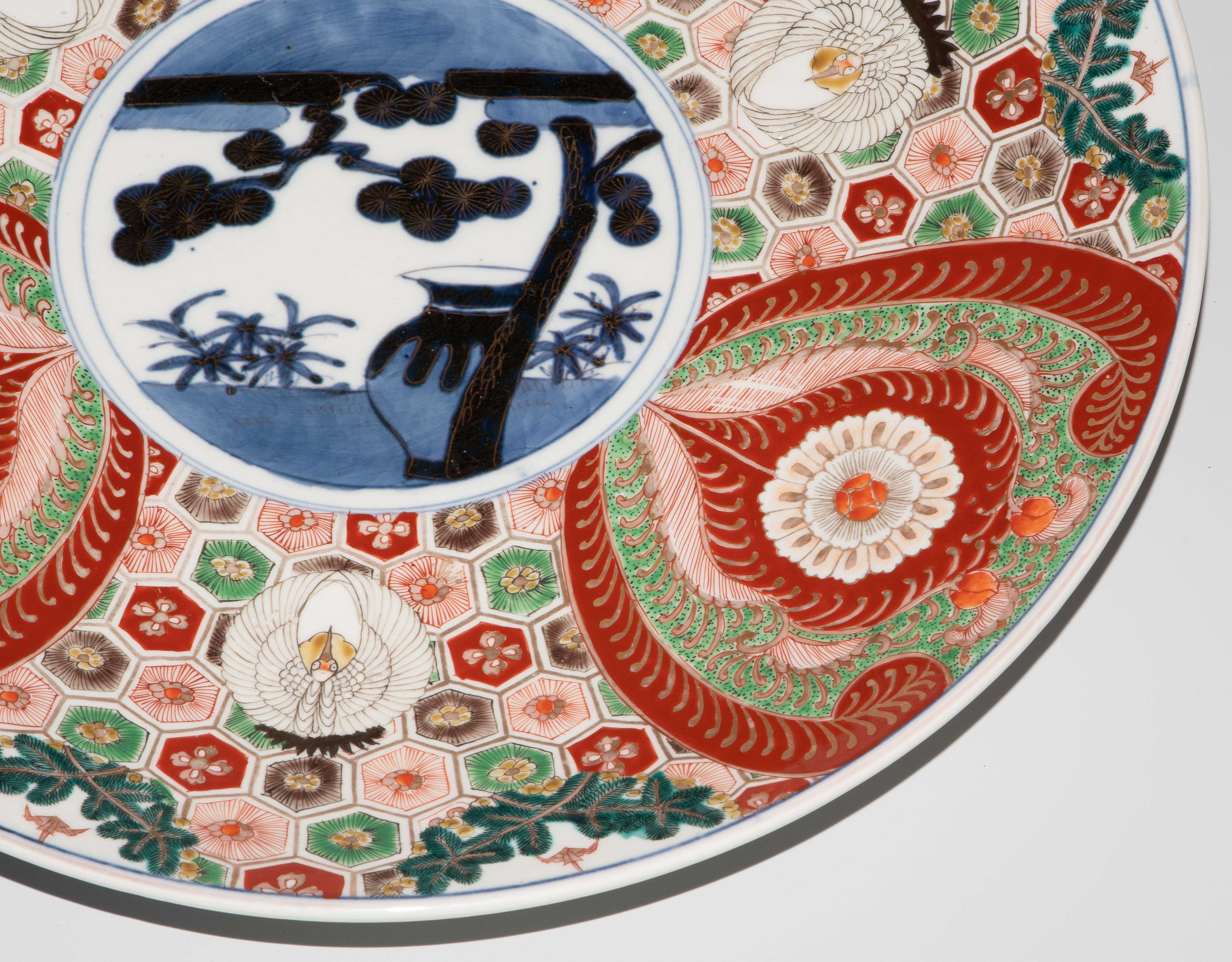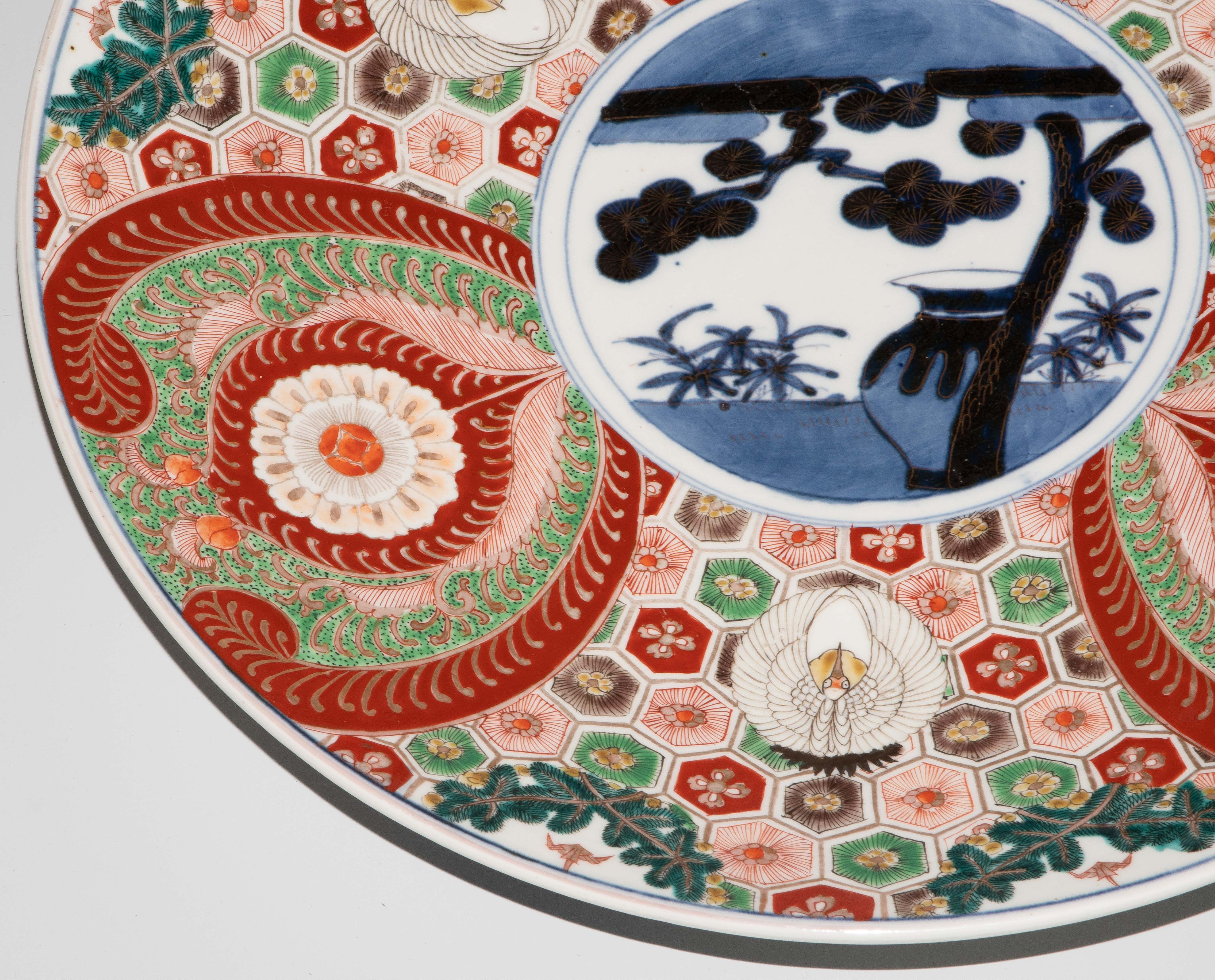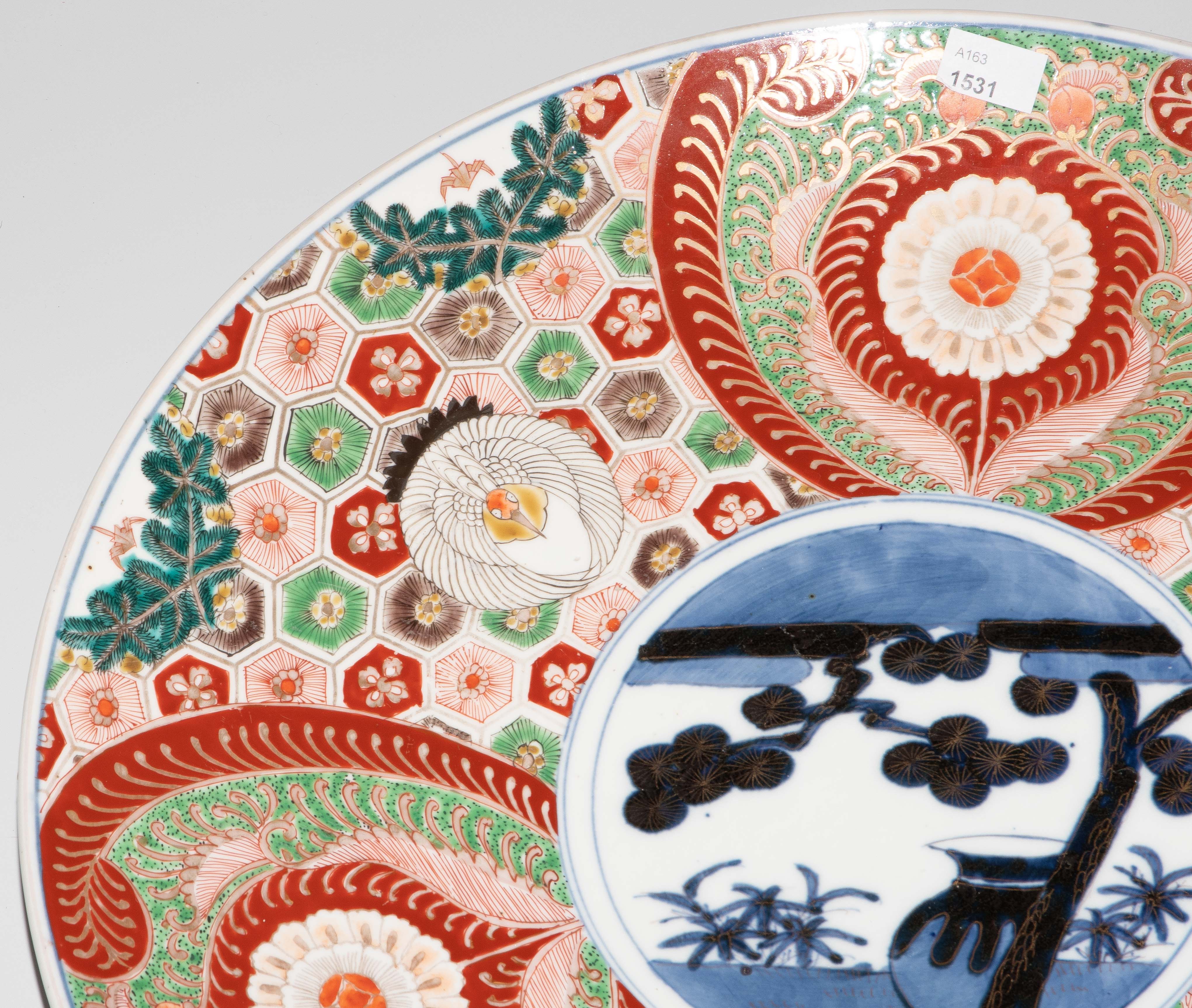 Japan, 19.Jh. Porzellan. Imari-Dekor. Mit eisenrotem Fuku-Zeichen. Dekor mit Kiefern und stilisierten Kranichen. D 41 cm.