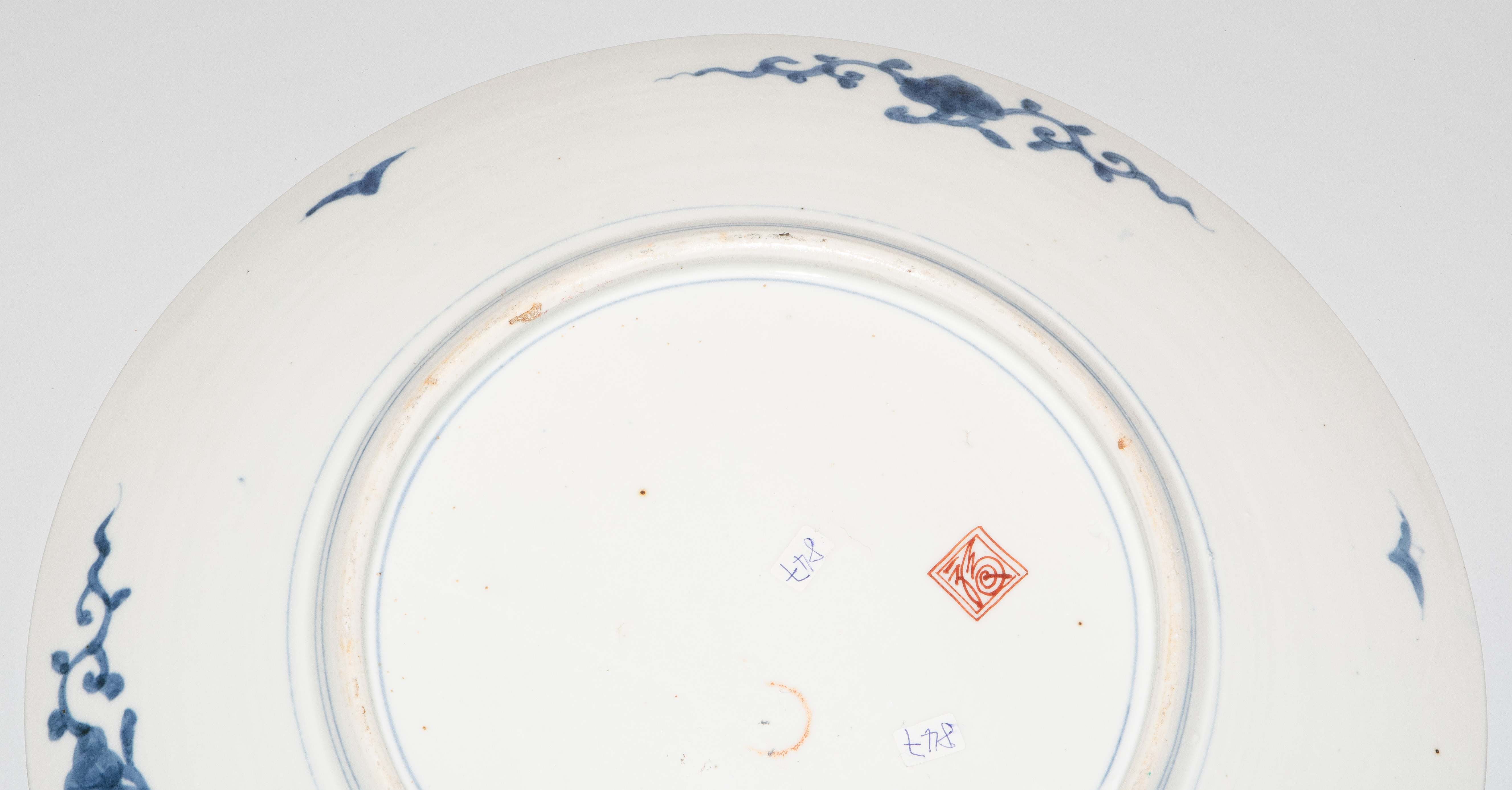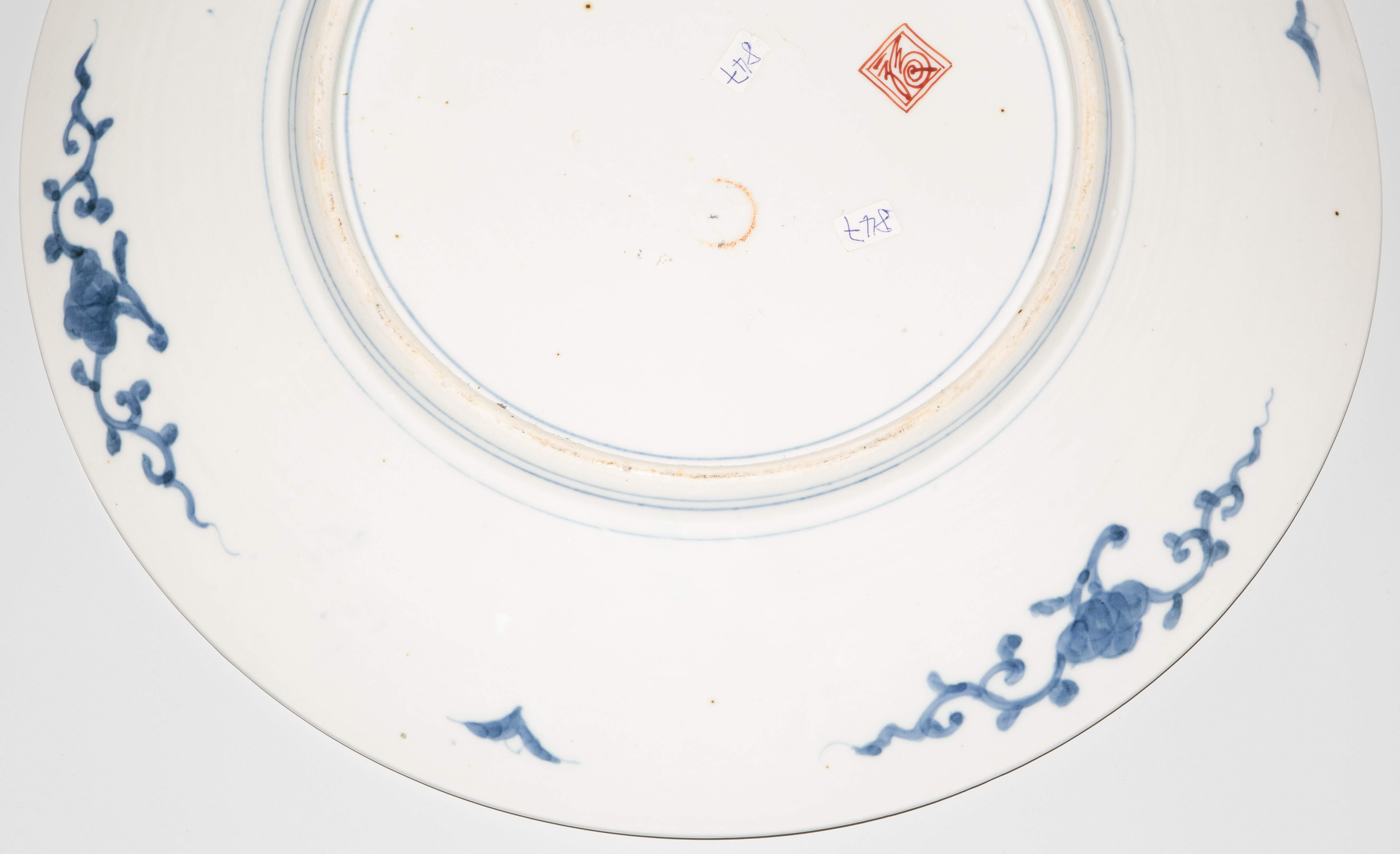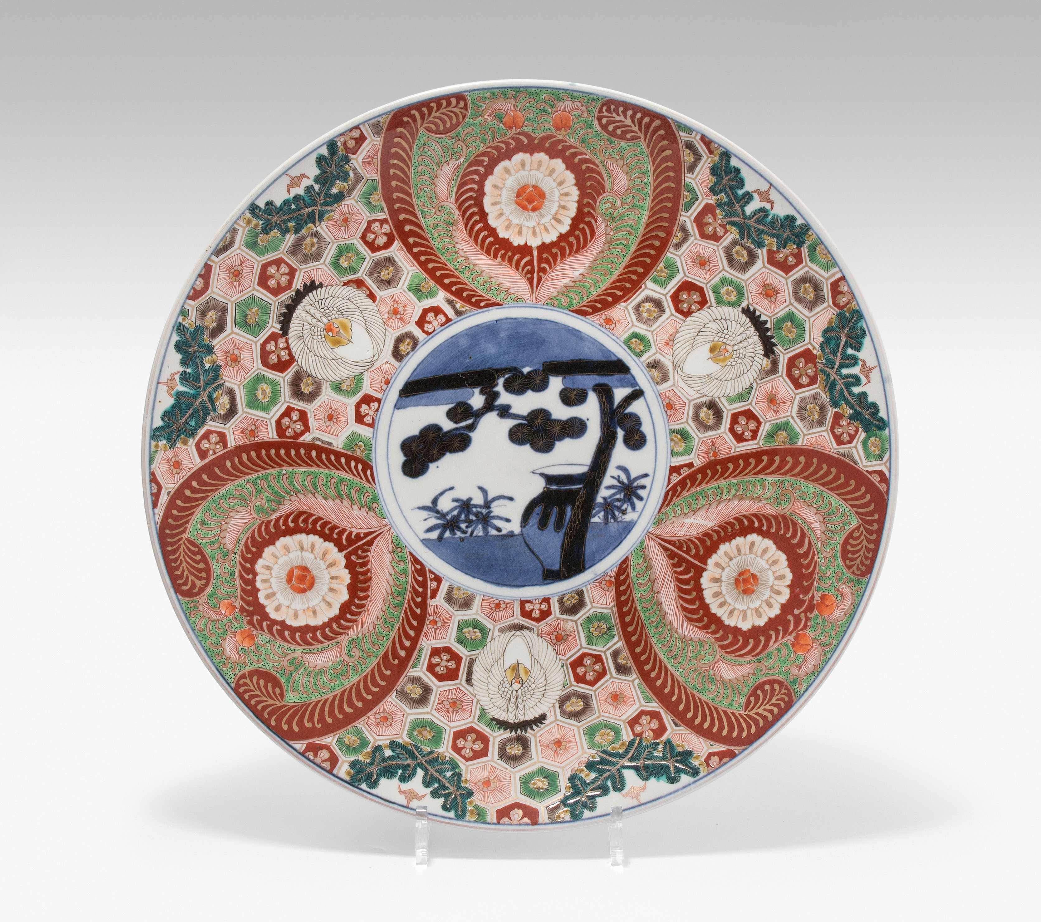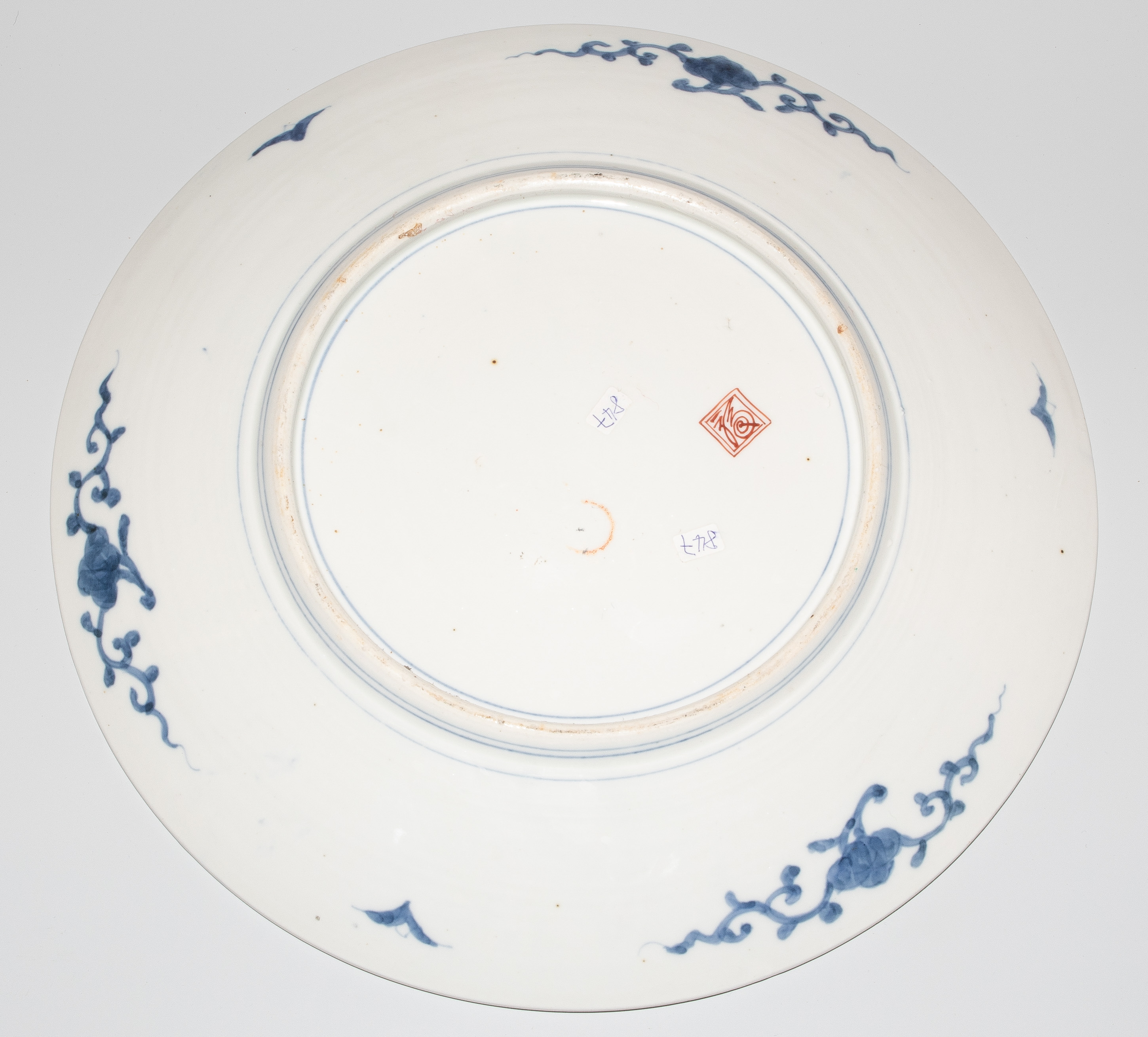 Japan, 19.Jh. Porzellan. Imari-Dekor. Mit eisenrotem Fuku-Zeichen. Dekor mit Kiefern und stilisierten Kranichen. D 41 cm.