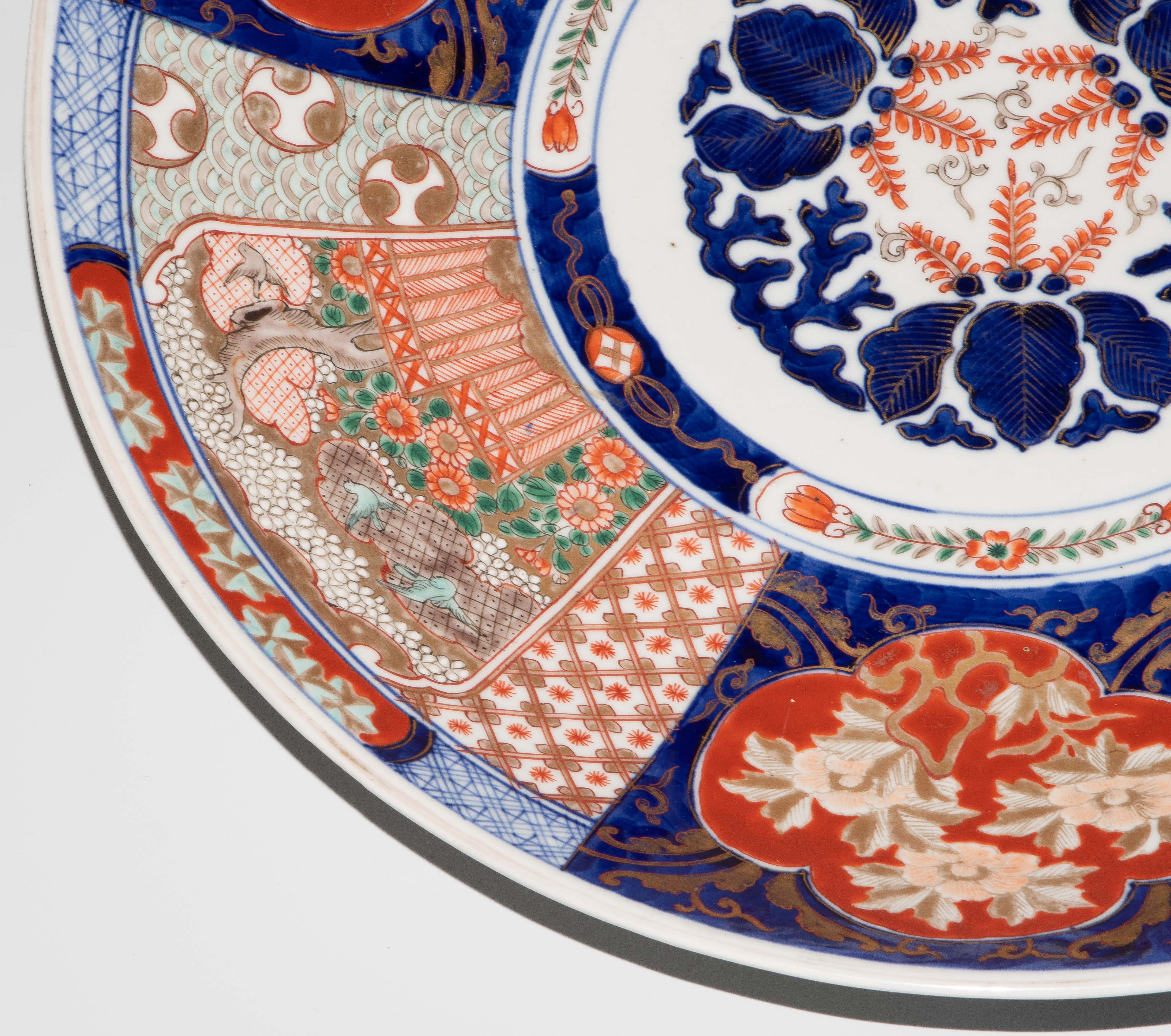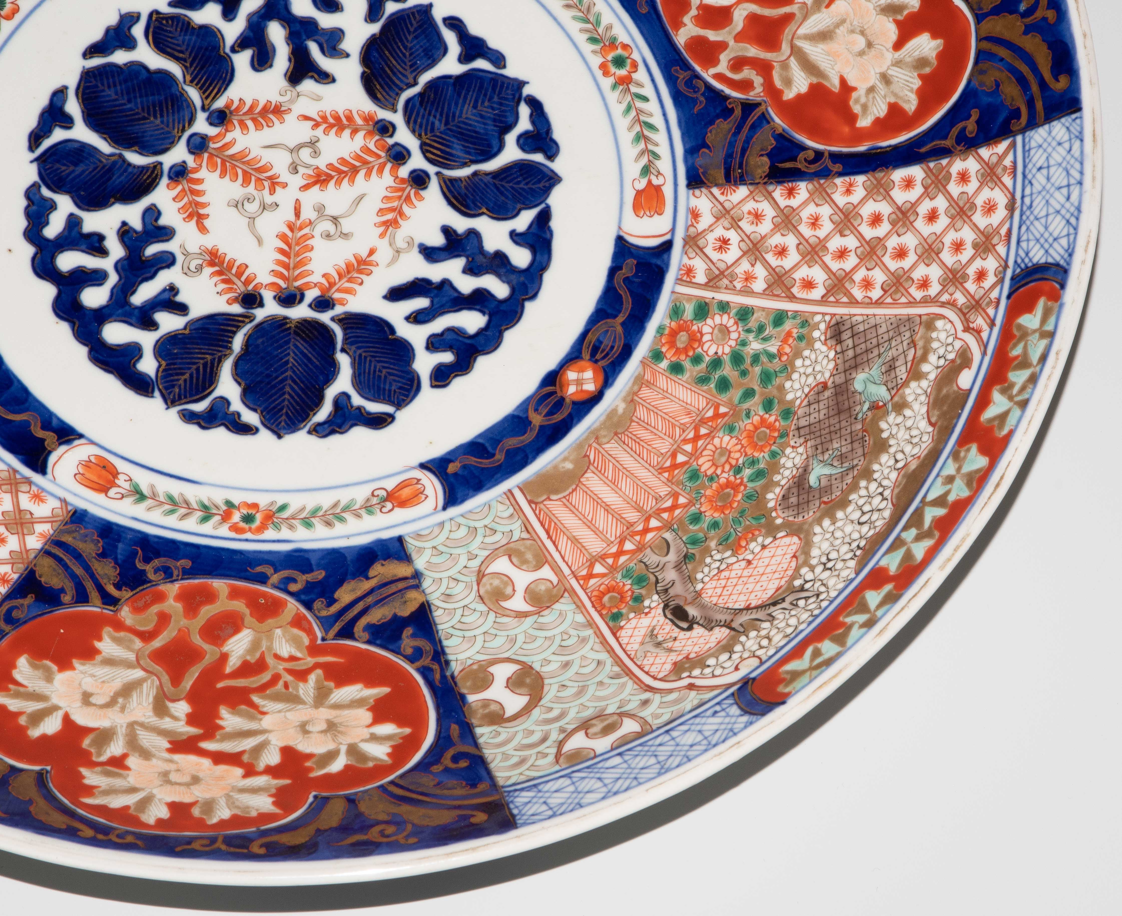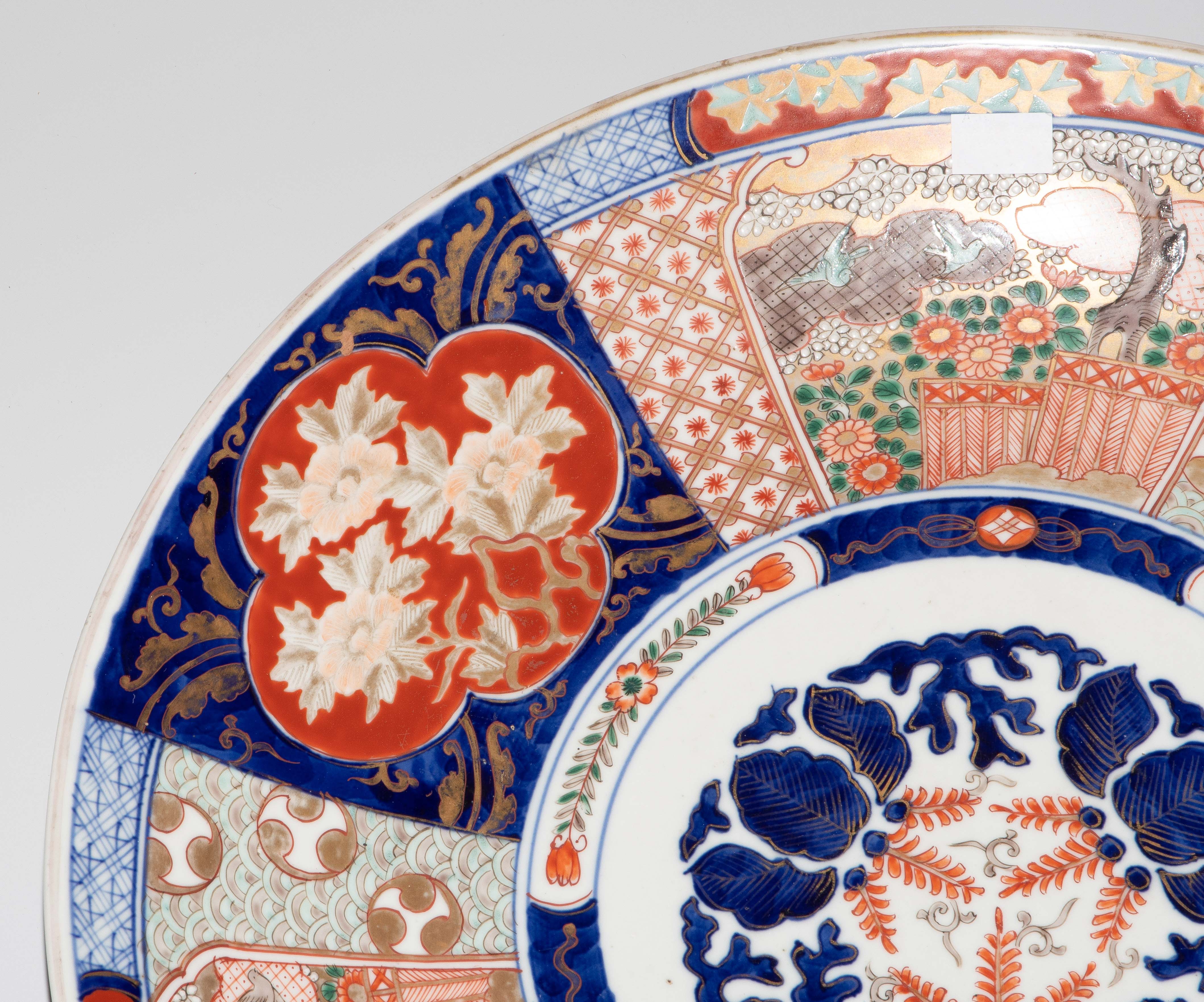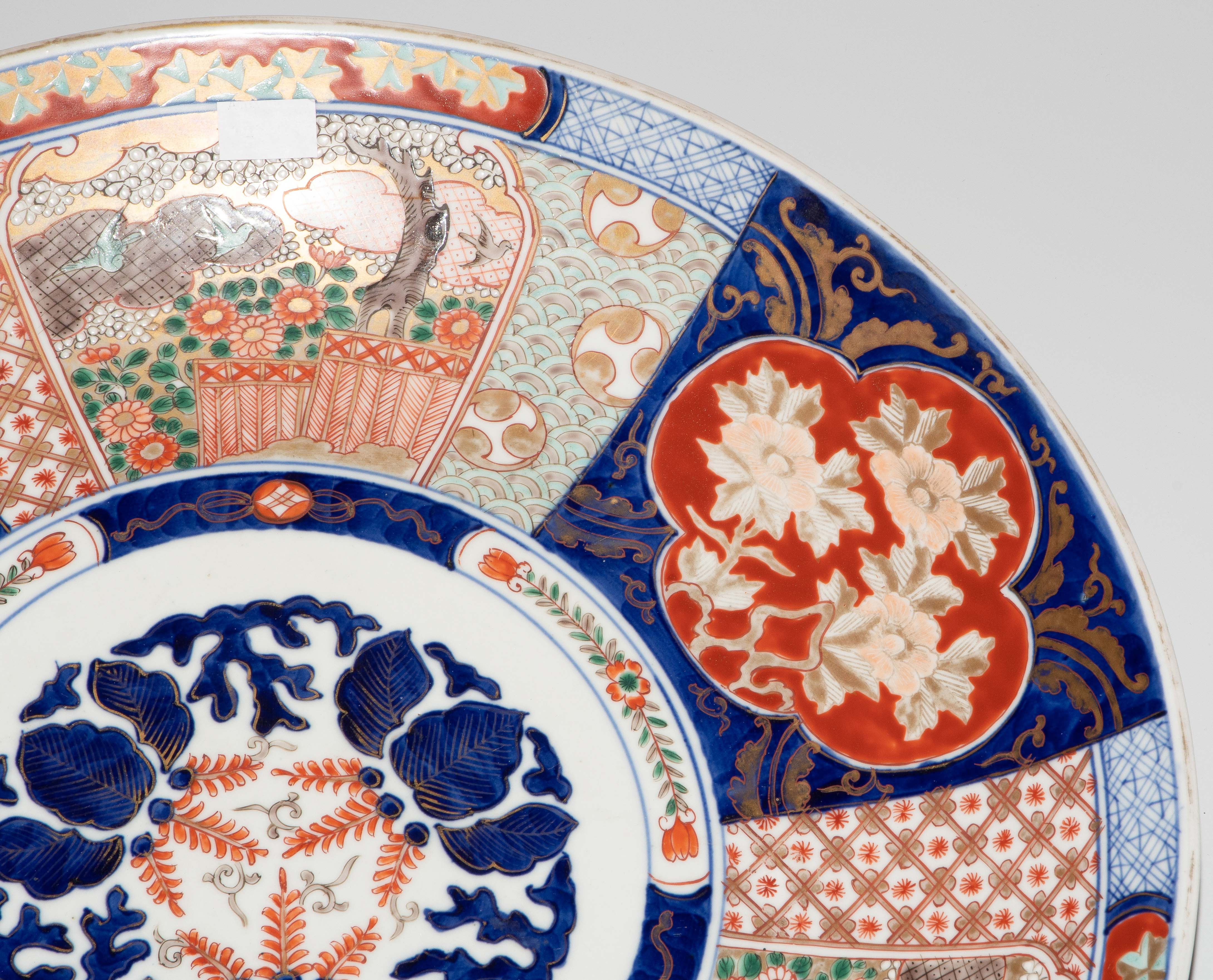Japan, 19.Jh. Porzellan. Imari-Dekor. Kiri-Blätterdekor im Spiegel, Gärten mit Chrysanthemen und Vögeln sowie Päonien in den Reserven der Fahne. D 44 cm.