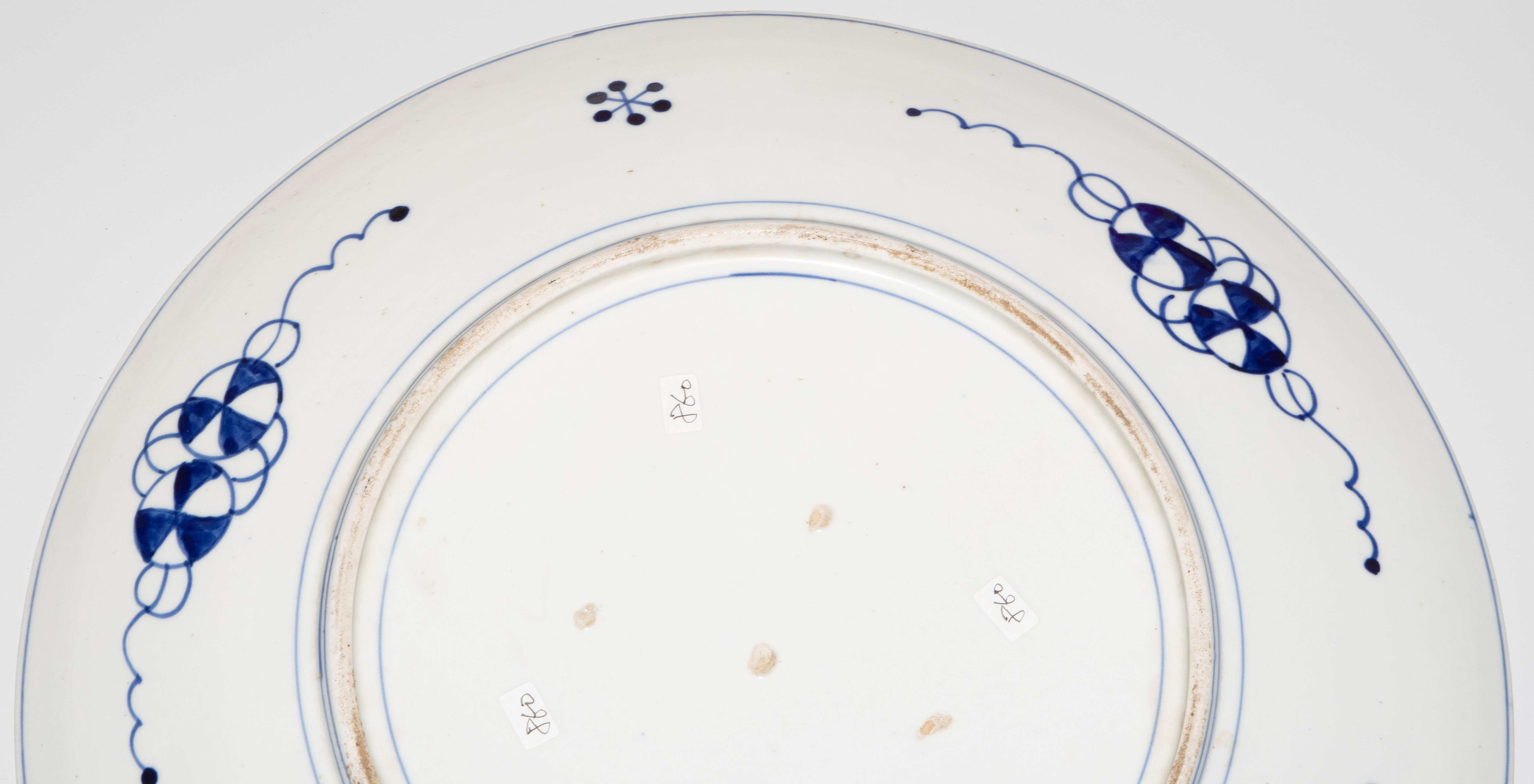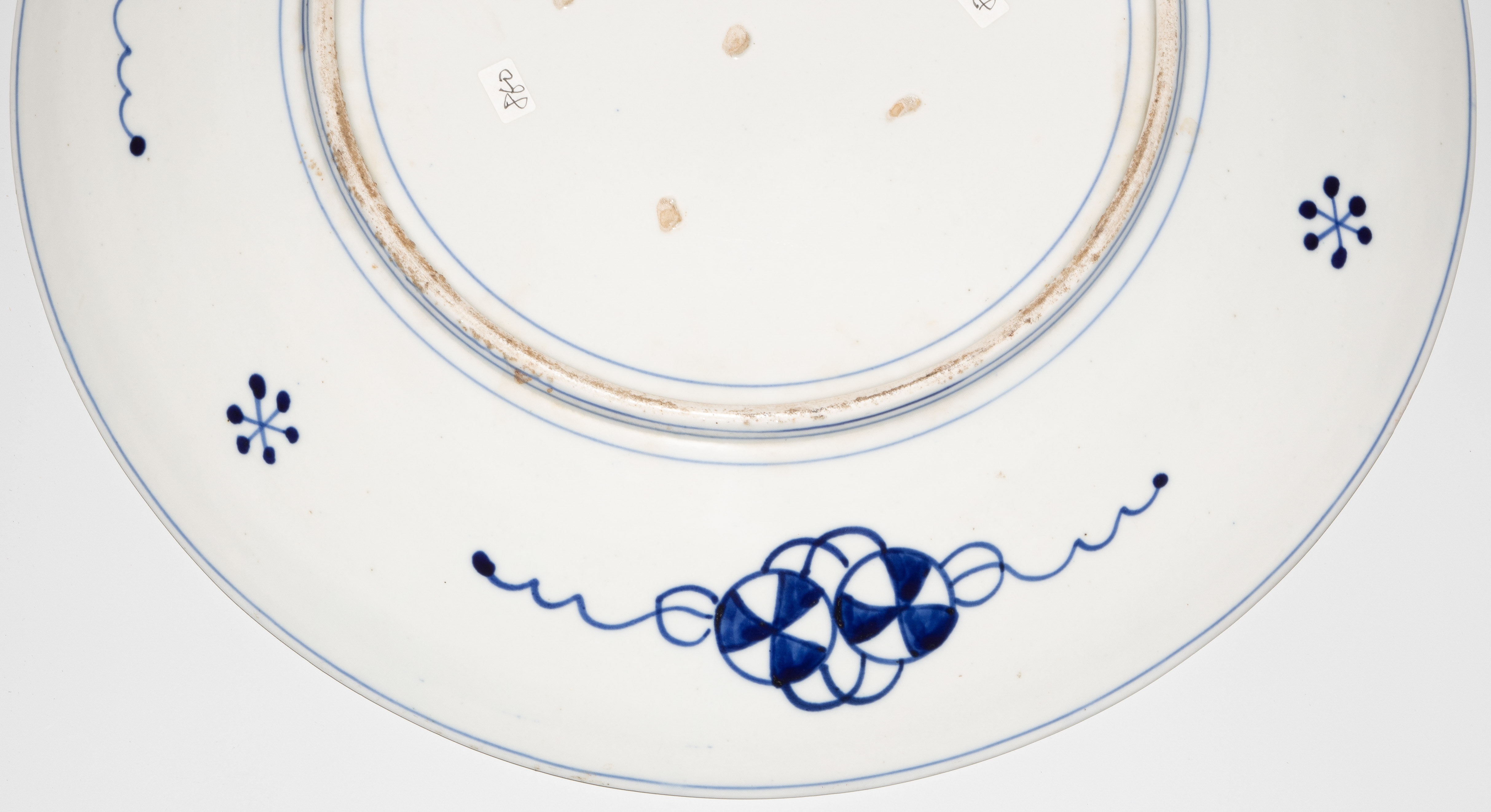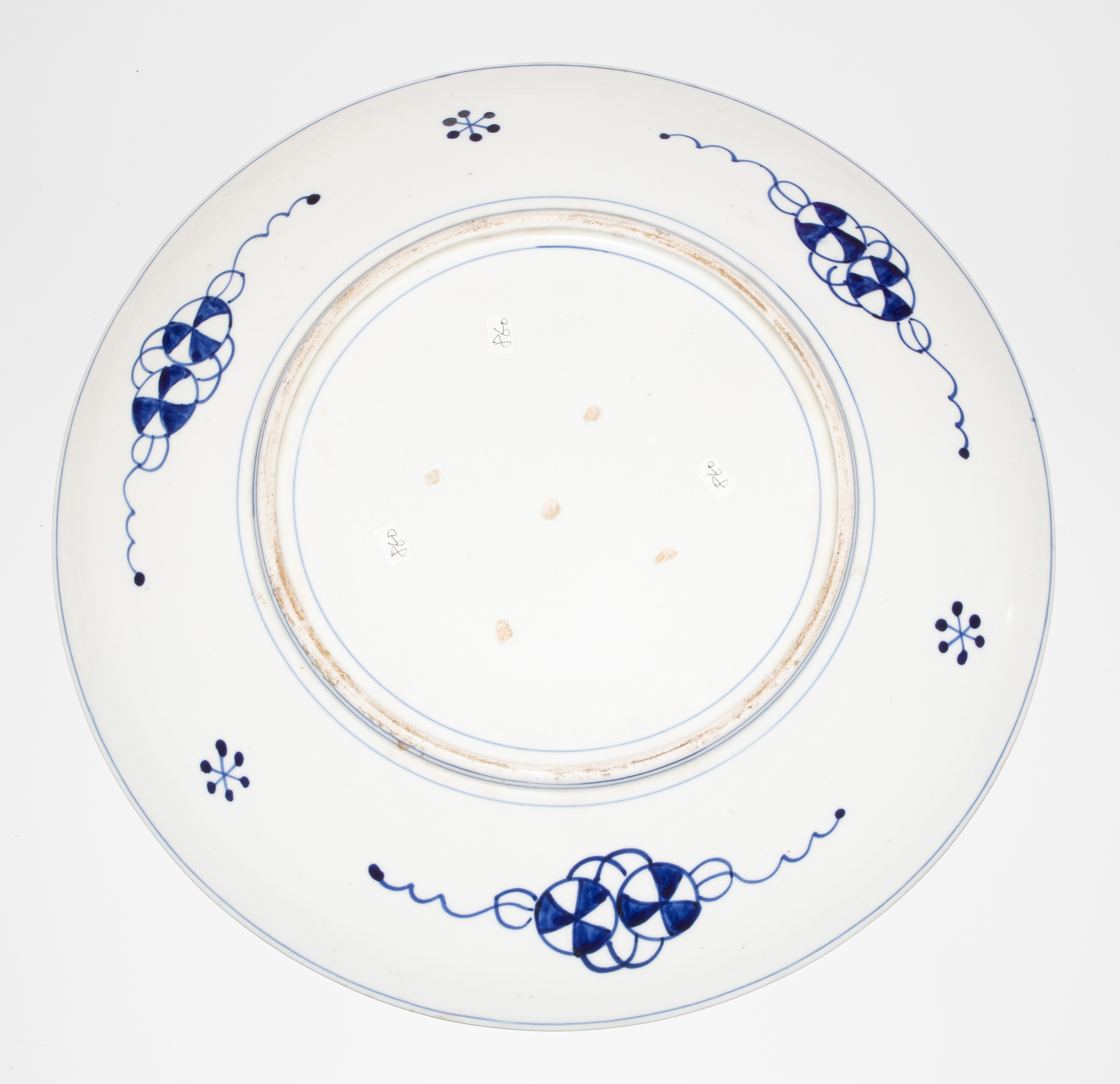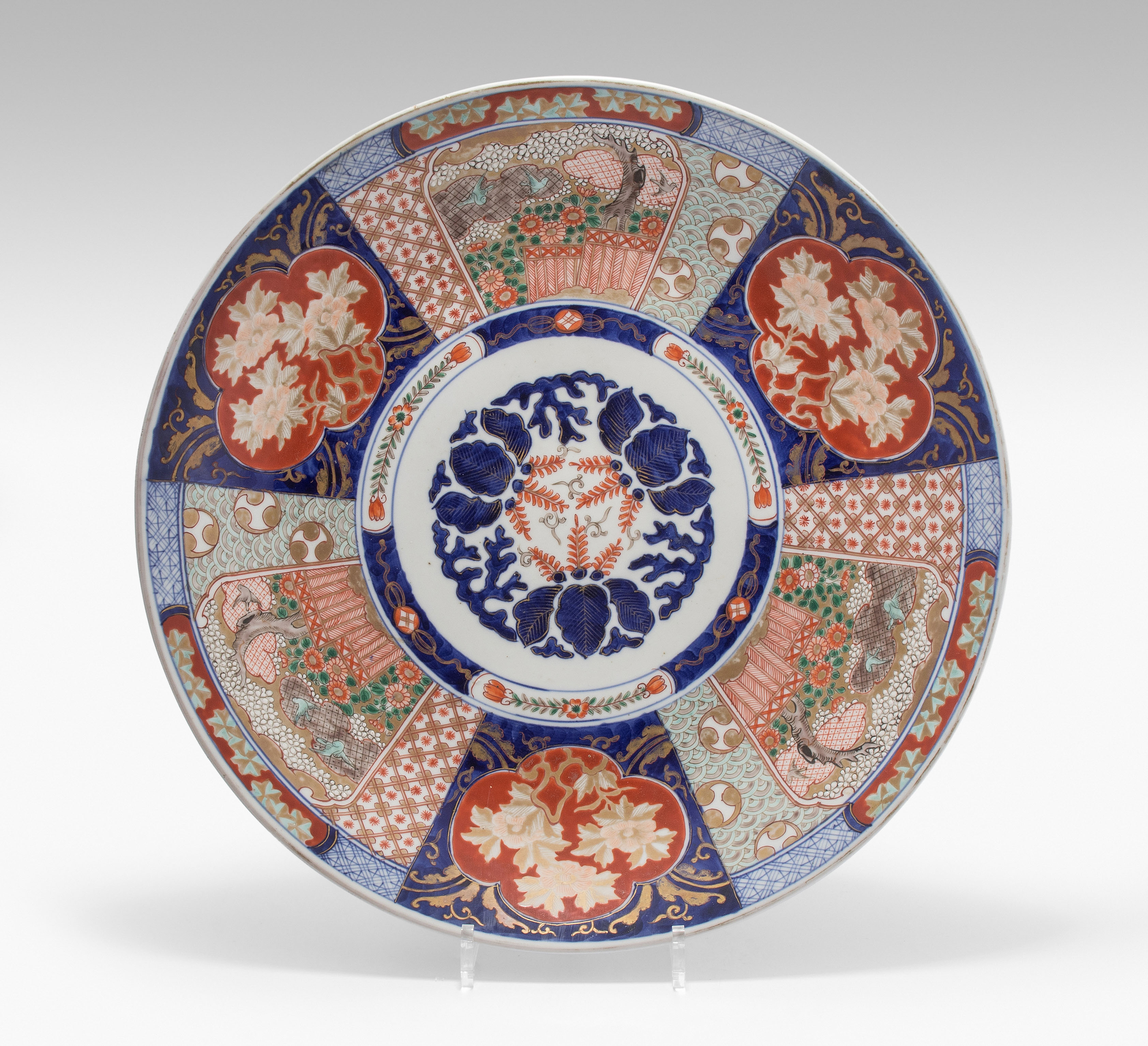 Japan, 19.Jh. Porzellan. Imari-Dekor. Kiri-Blätterdekor im Spiegel, Gärten mit Chrysanthemen und Vögeln sowie Päonien in den Reserven der Fahne. D 44 cm.
