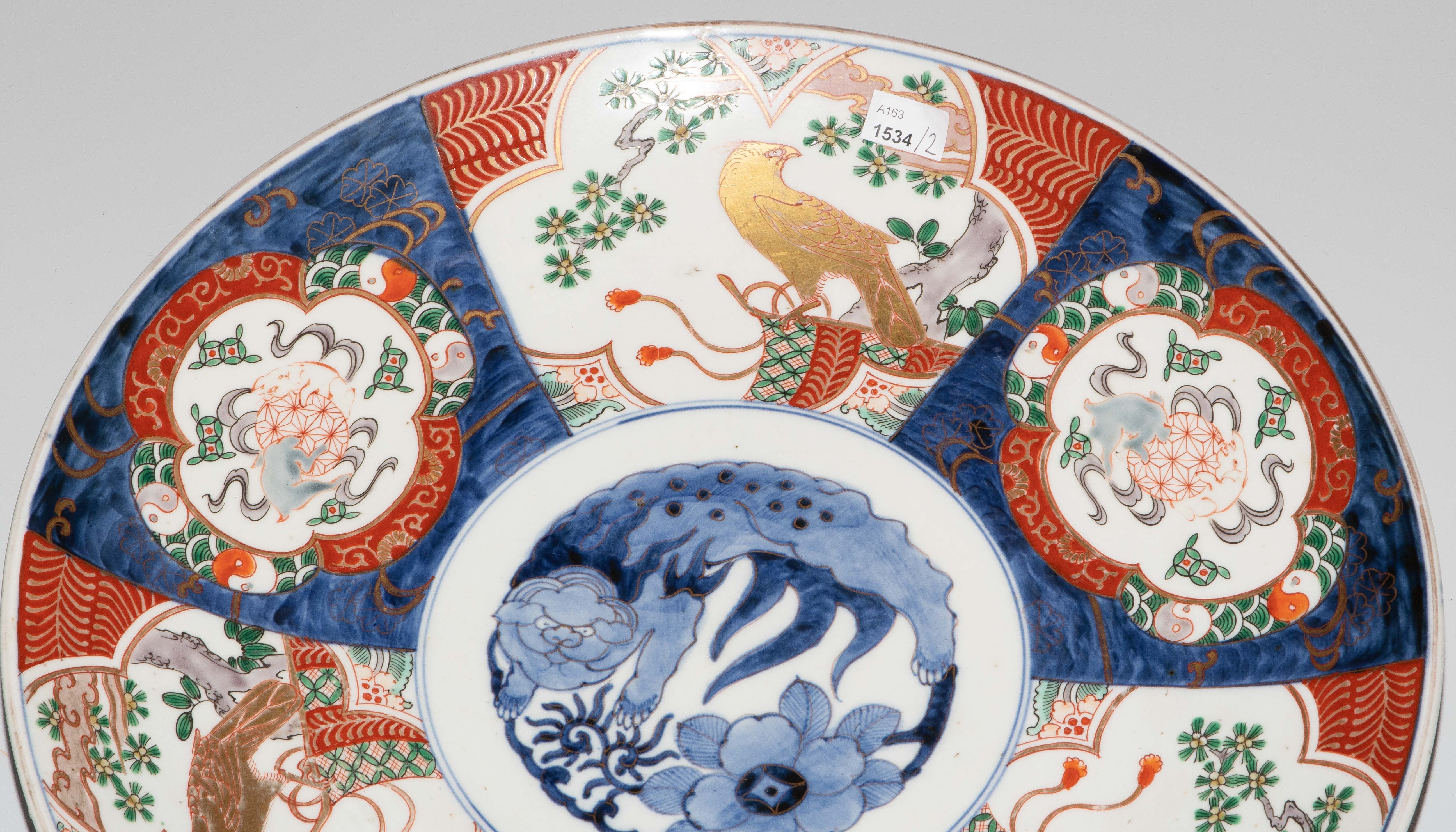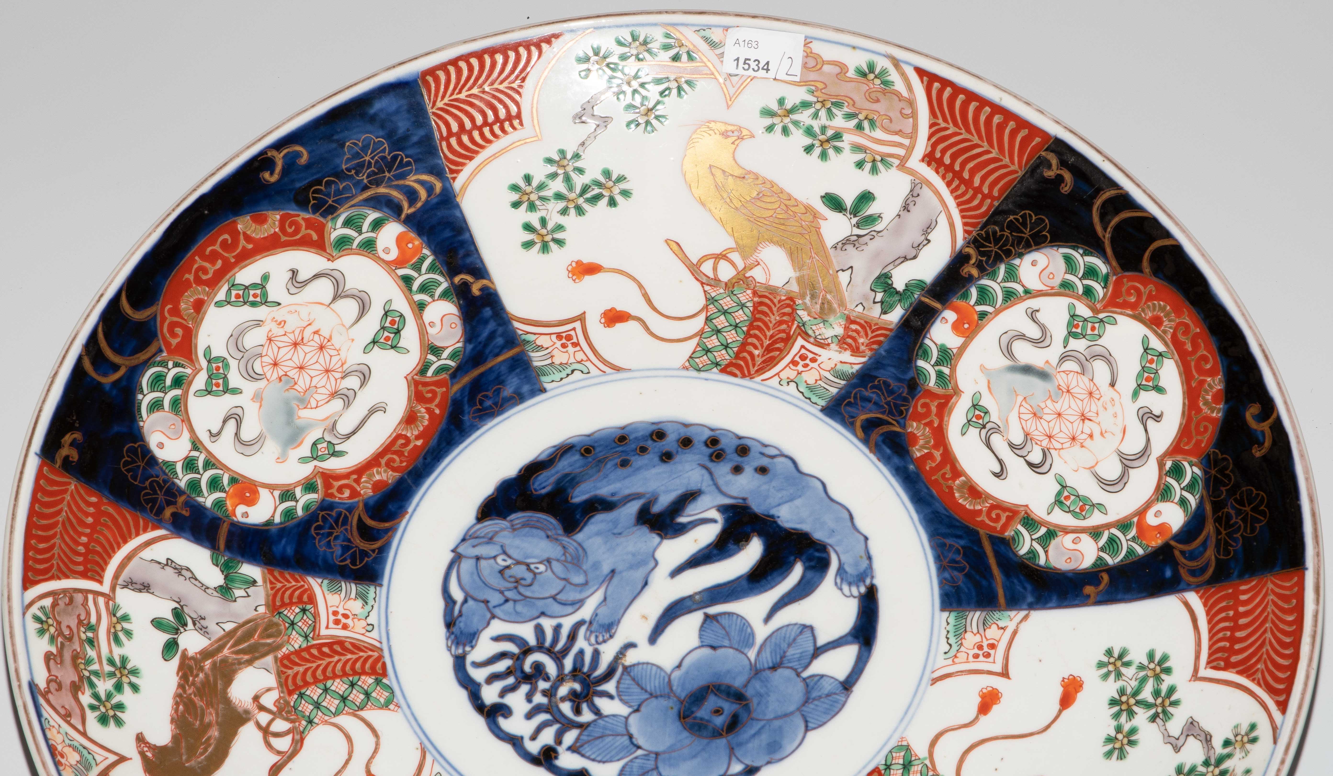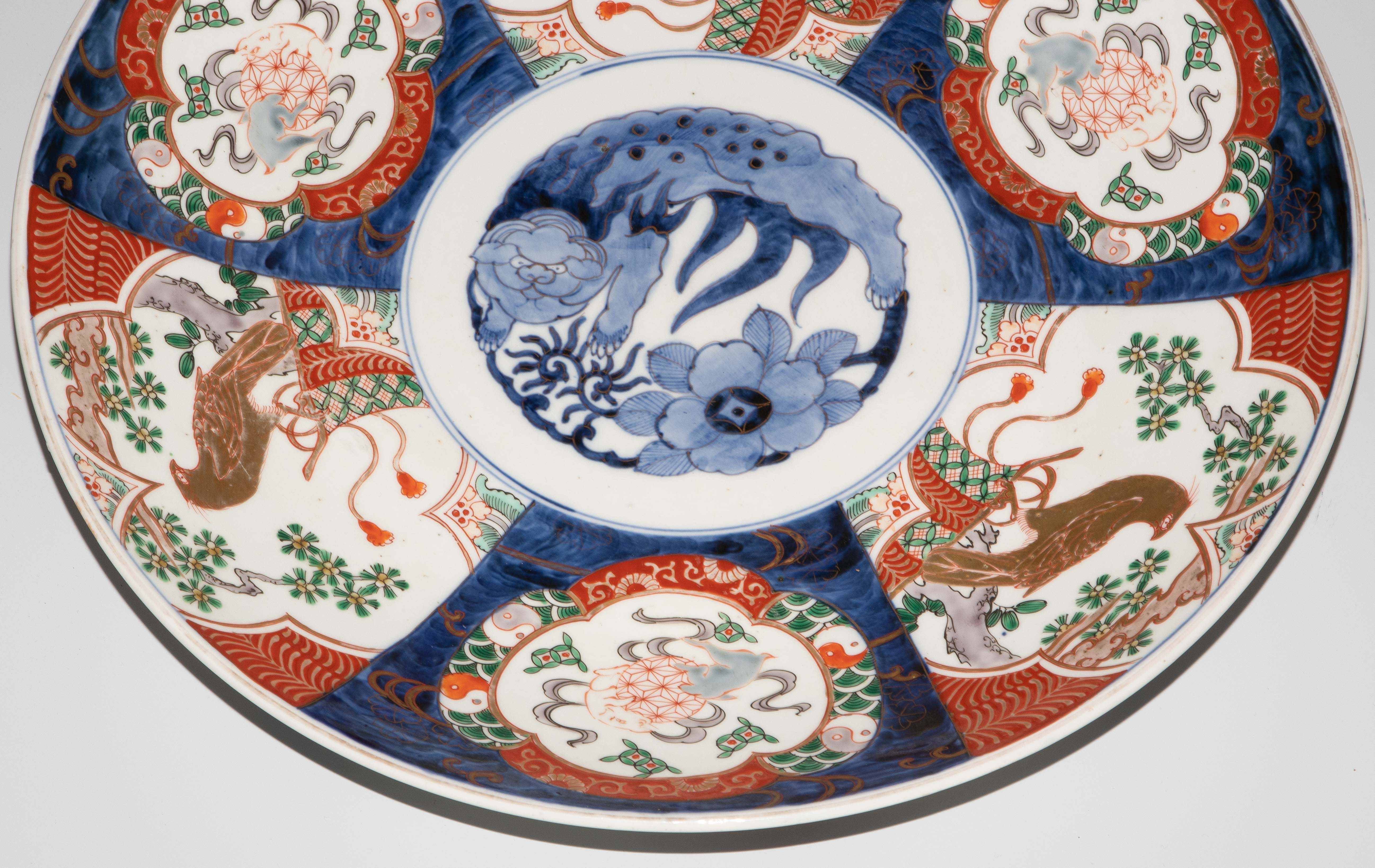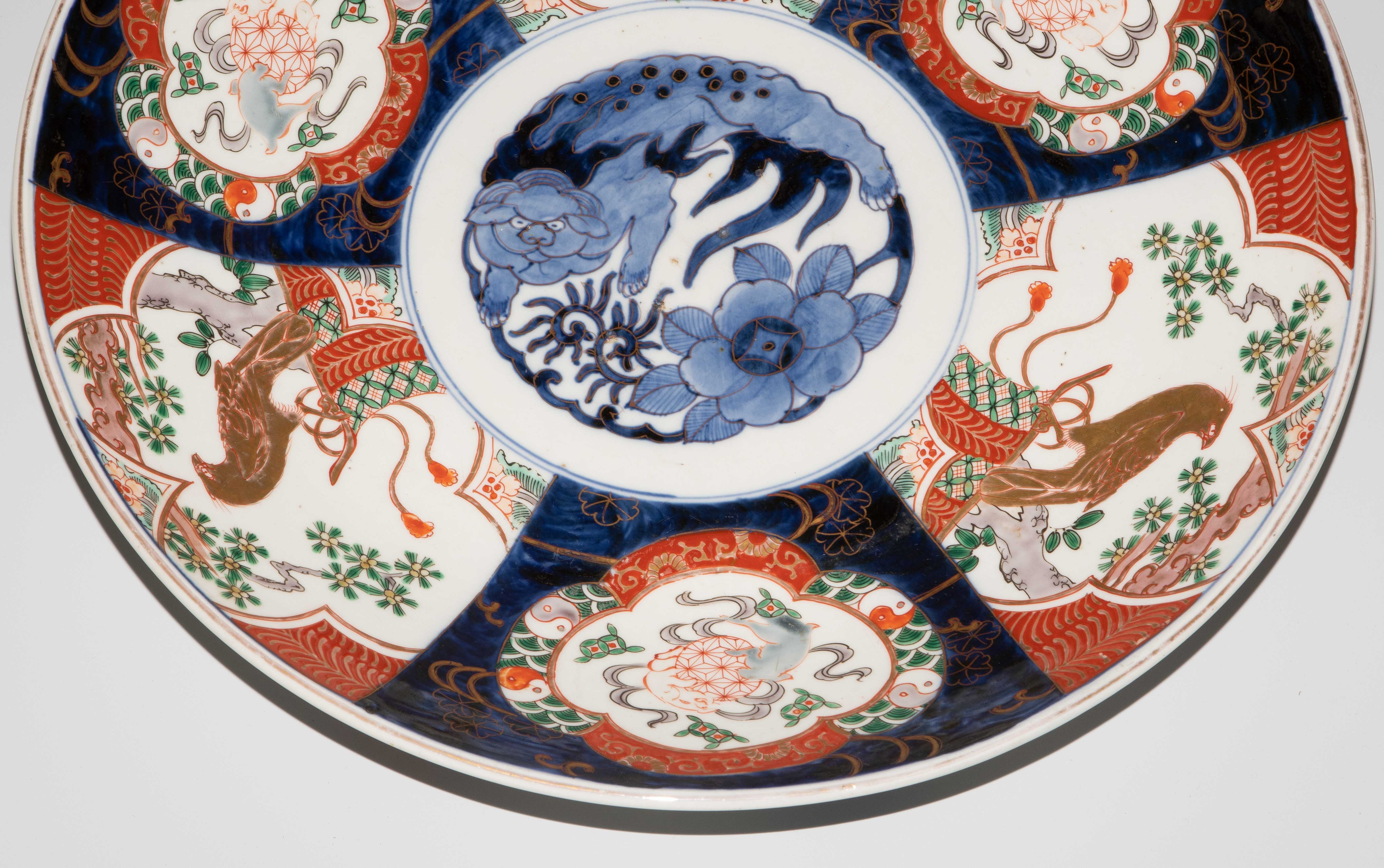 Japan, 19.Jh. Porzellan. Imari-Dekor. Mit unterglasurblauem Tomi-Zeichen. Verziert mit einem Shishi-Löwen im Spiegel sowie abwechselnd spielende Wachlöwen und Falken im Kieferbaum sitzend in den Reserven der Fahne. D 39 cm.