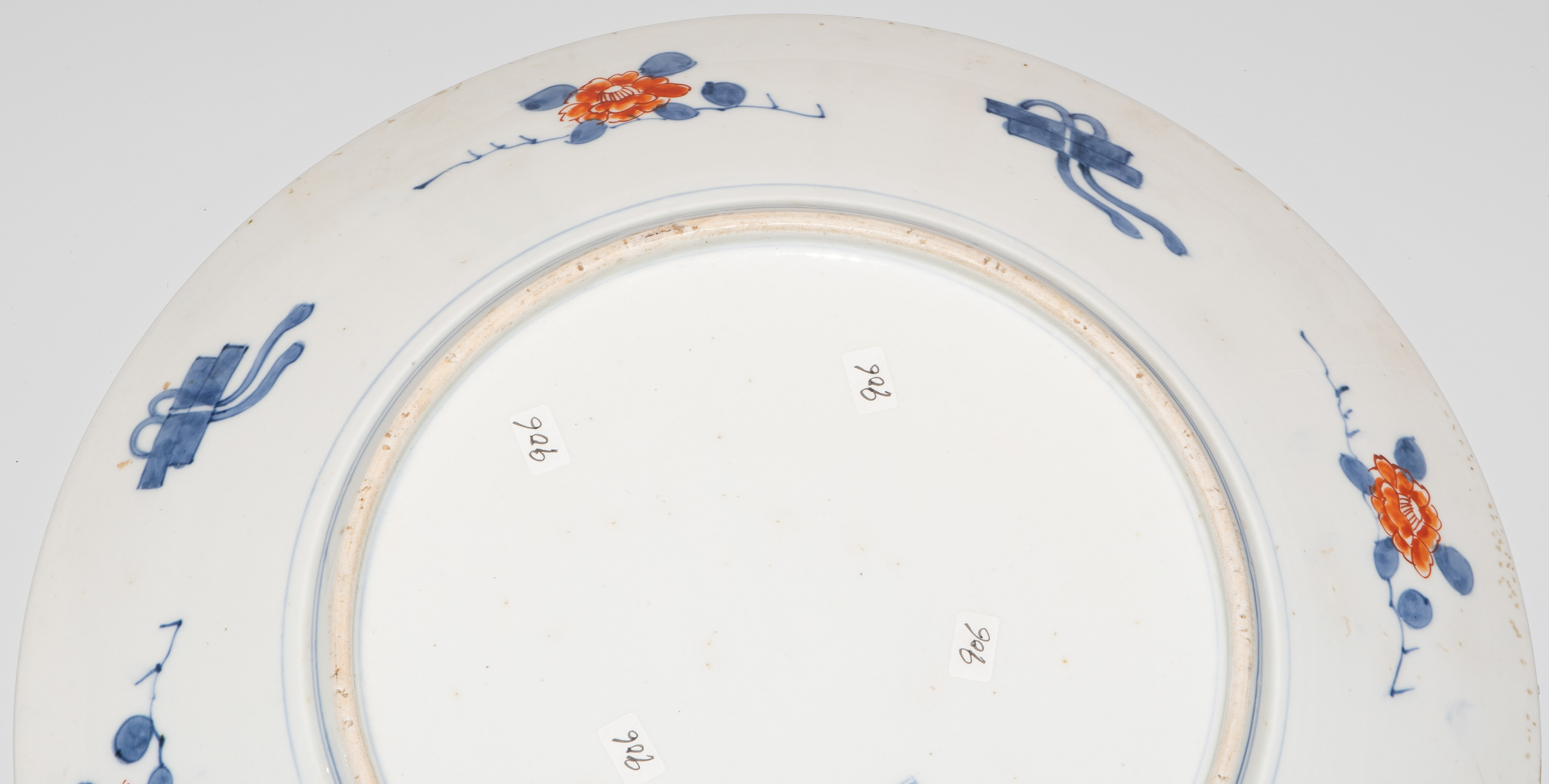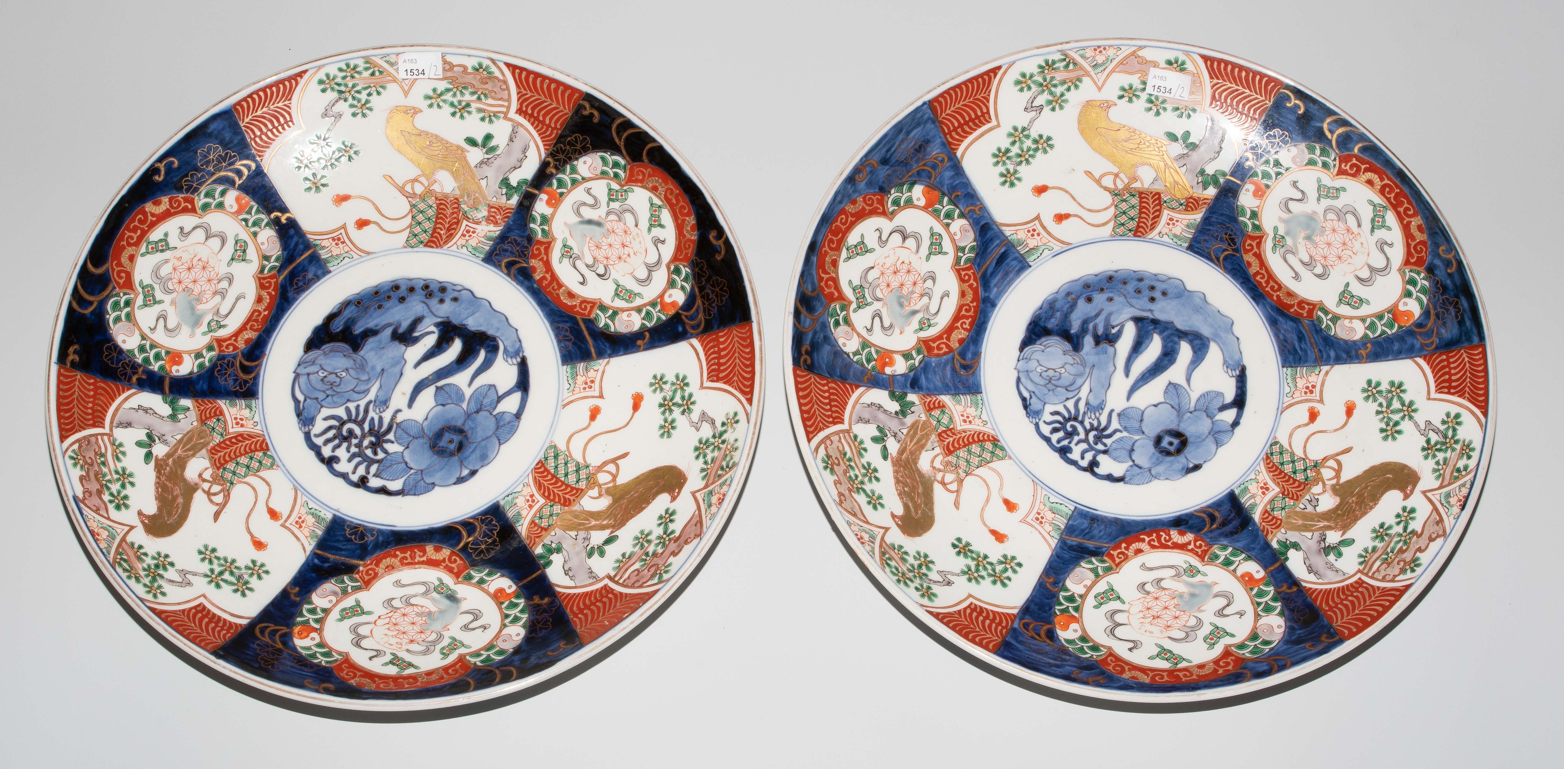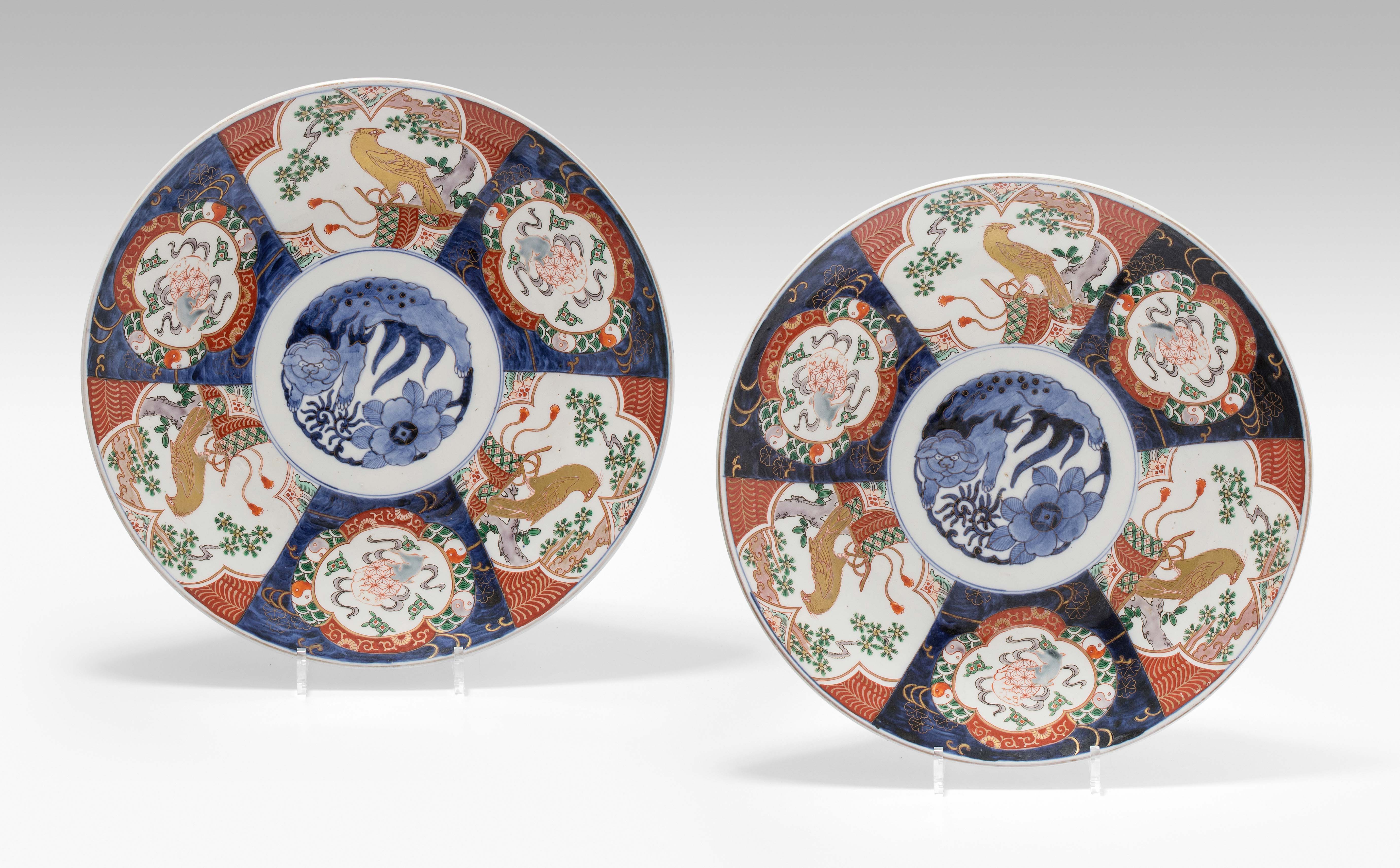 Japan, 19.Jh. Porzellan. Imari-Dekor. Mit unterglasurblauem Tomi-Zeichen. Verziert mit einem Shishi-Löwen im Spiegel sowie abwechselnd spielende Wachlöwen und Falken im Kieferbaum sitzend in den Reserven der Fahne. D 39 cm.