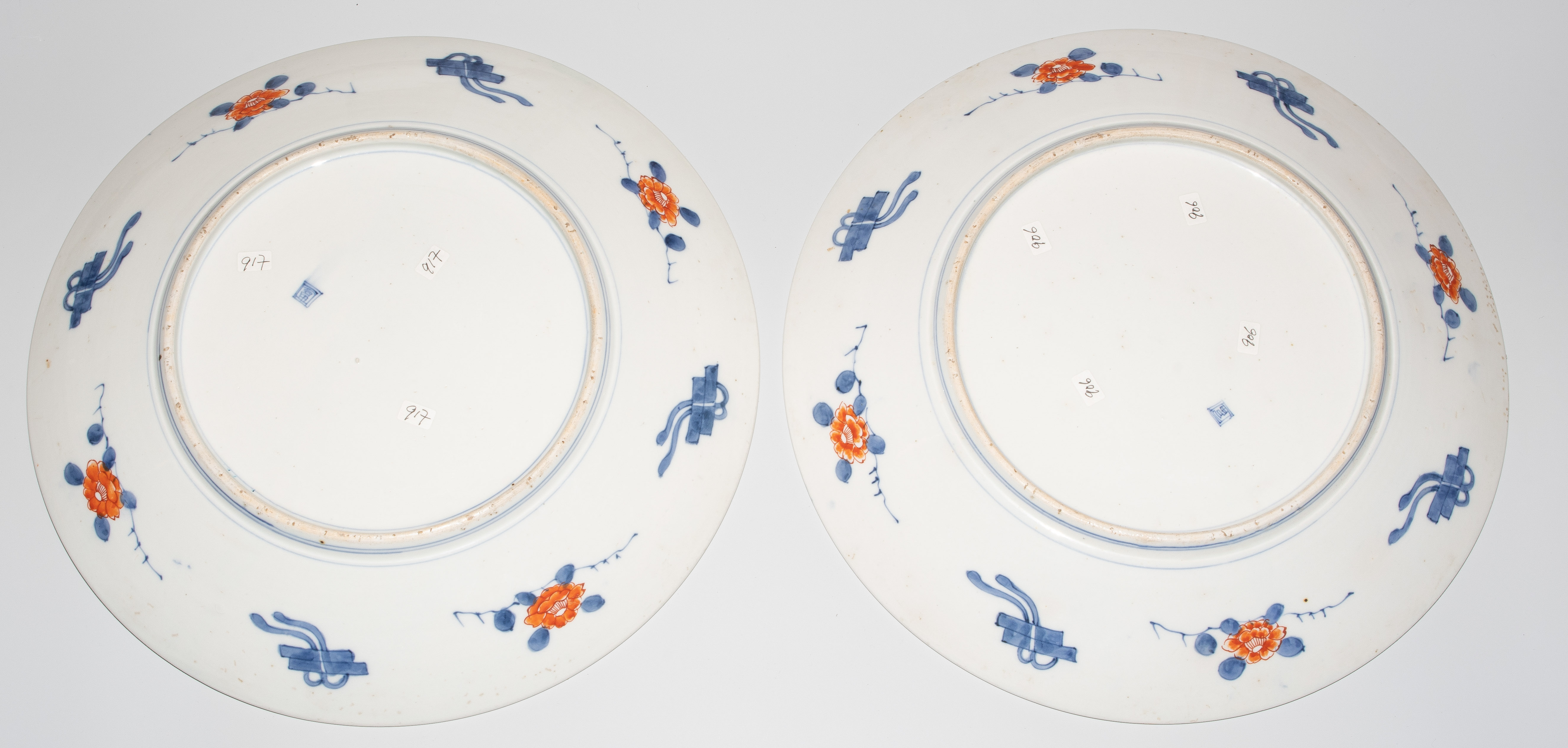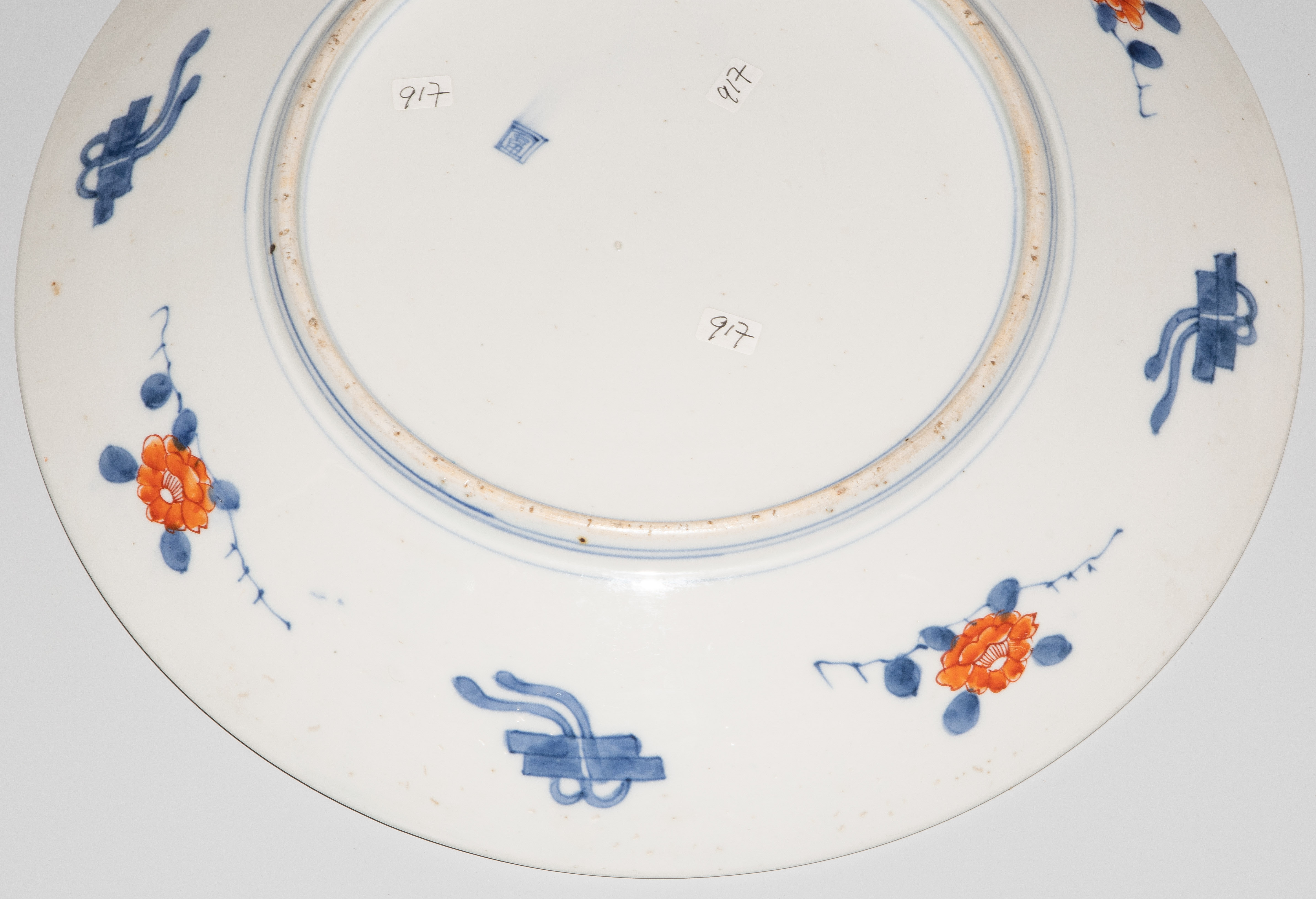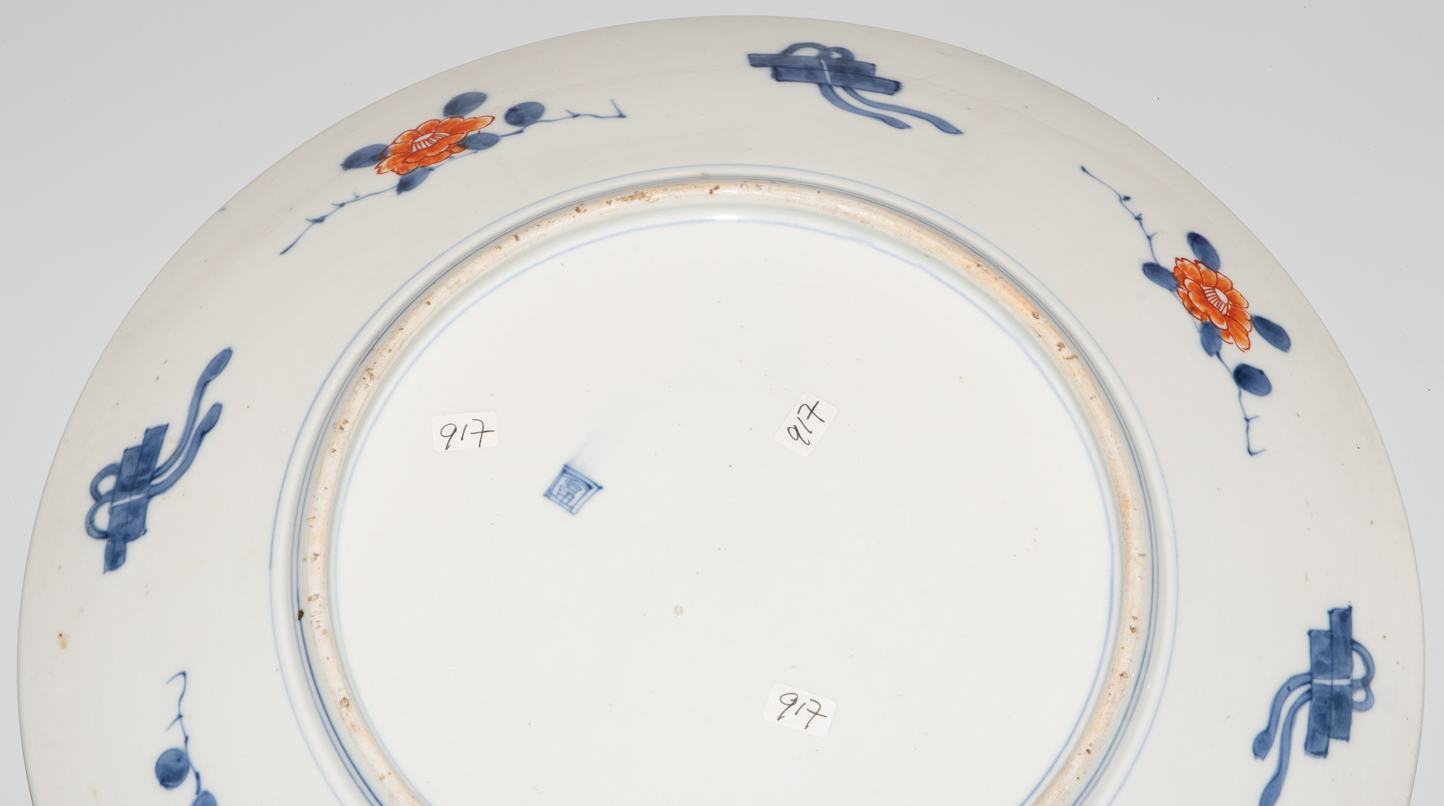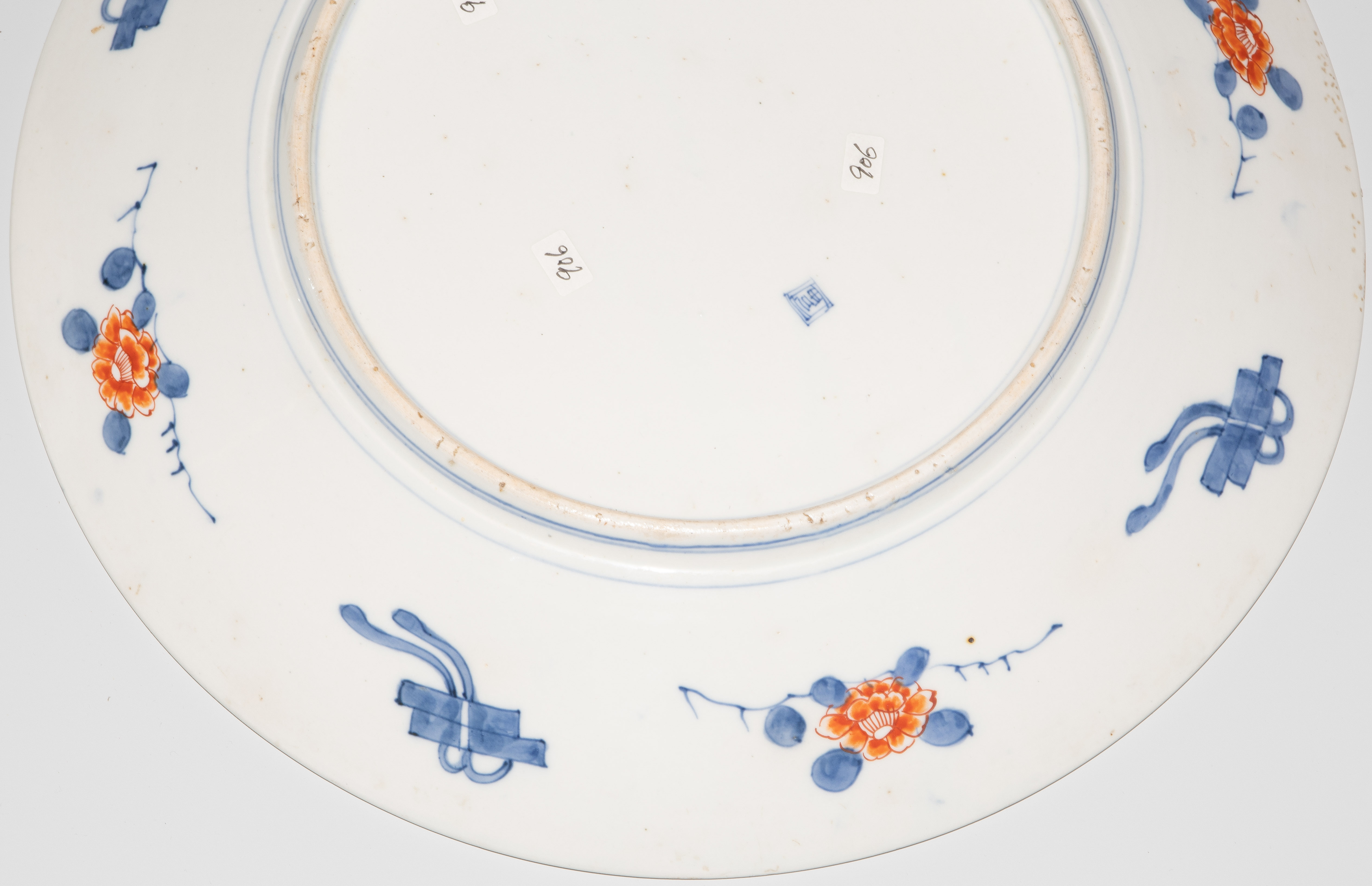 Japan, 19.Jh. Porzellan. Imari-Dekor. Mit unterglasurblauem Tomi-Zeichen. Verziert mit einem Shishi-Löwen im Spiegel sowie abwechselnd spielende Wachlöwen und Falken im Kieferbaum sitzend in den Reserven der Fahne. D 39 cm.