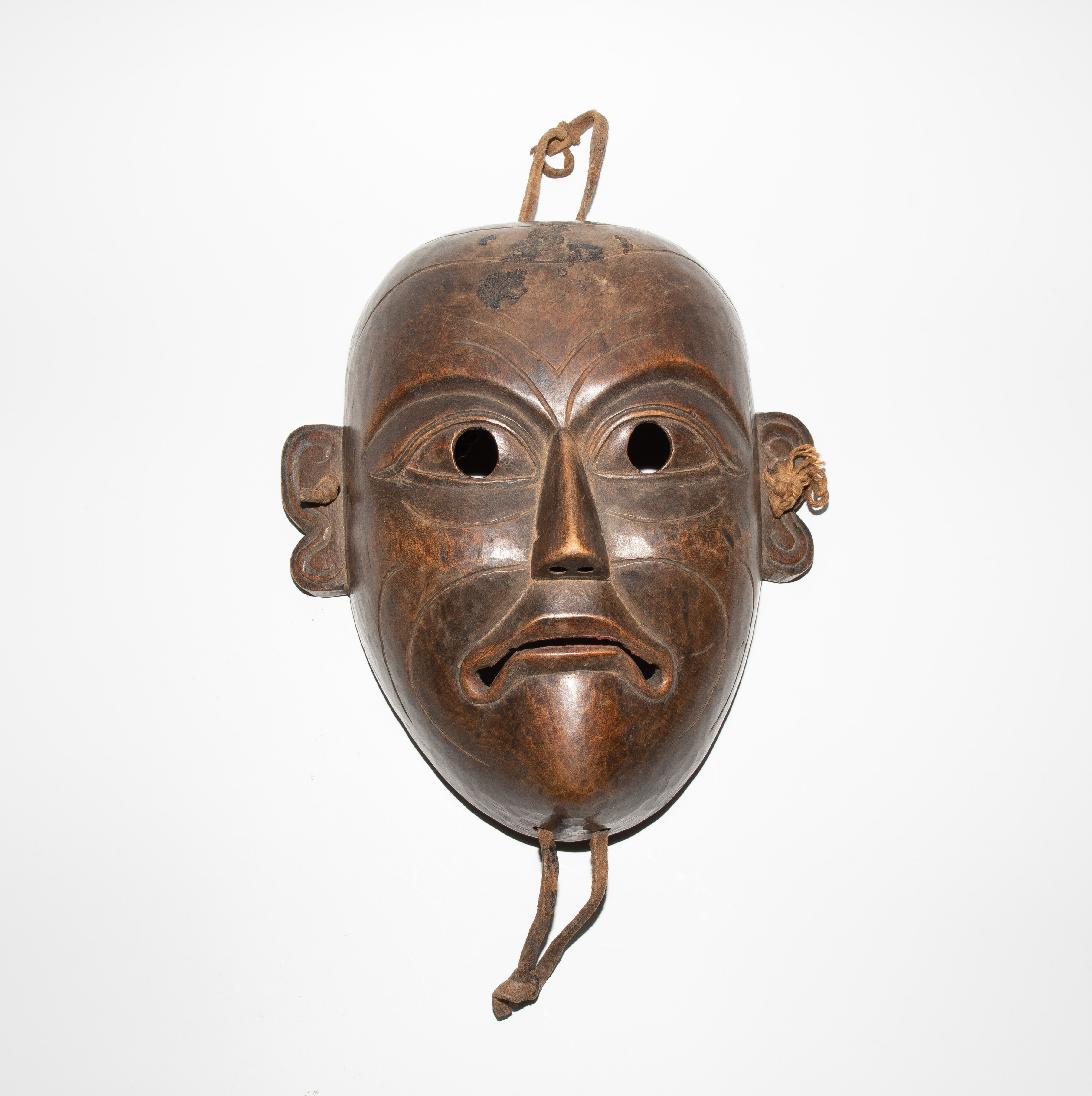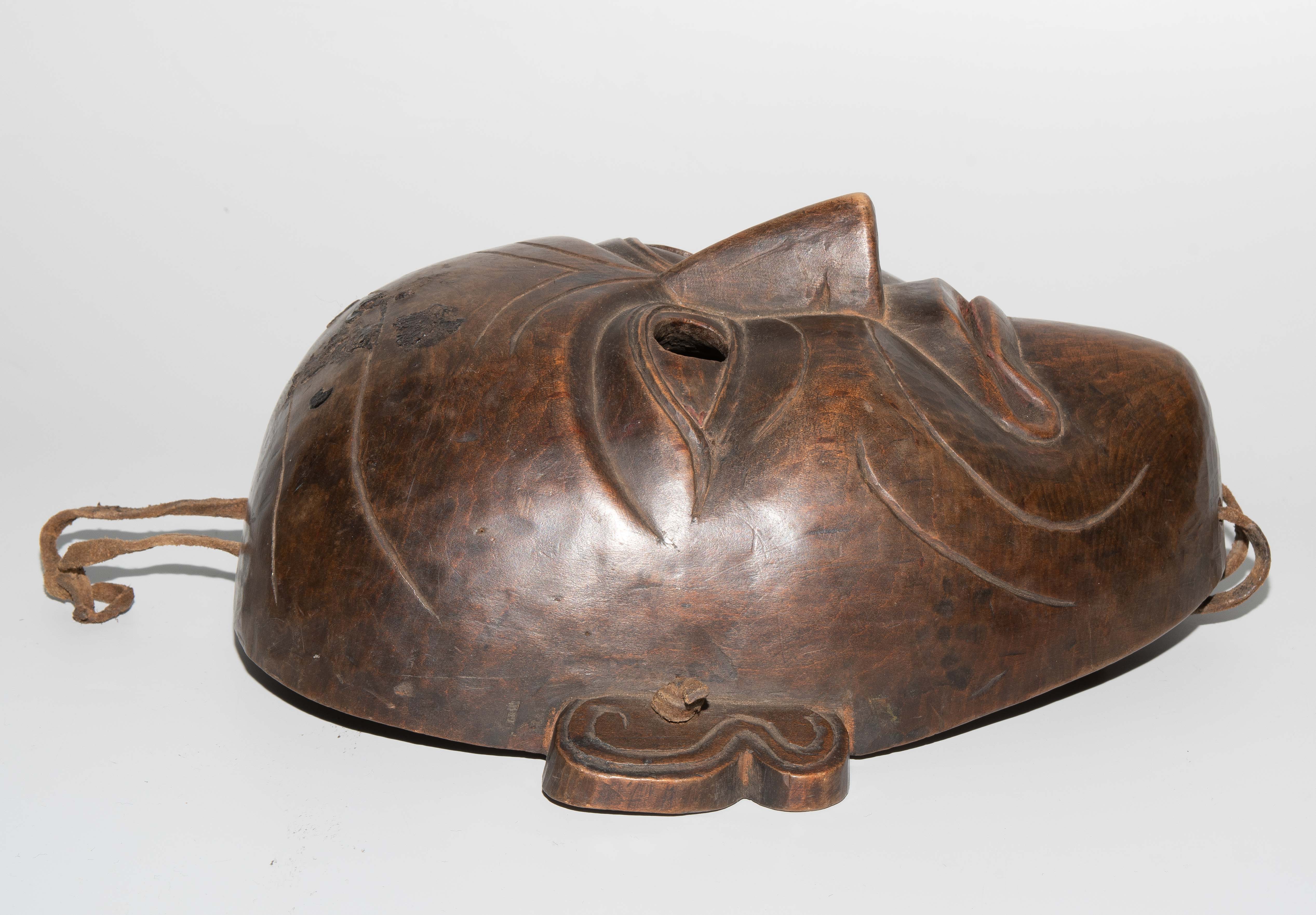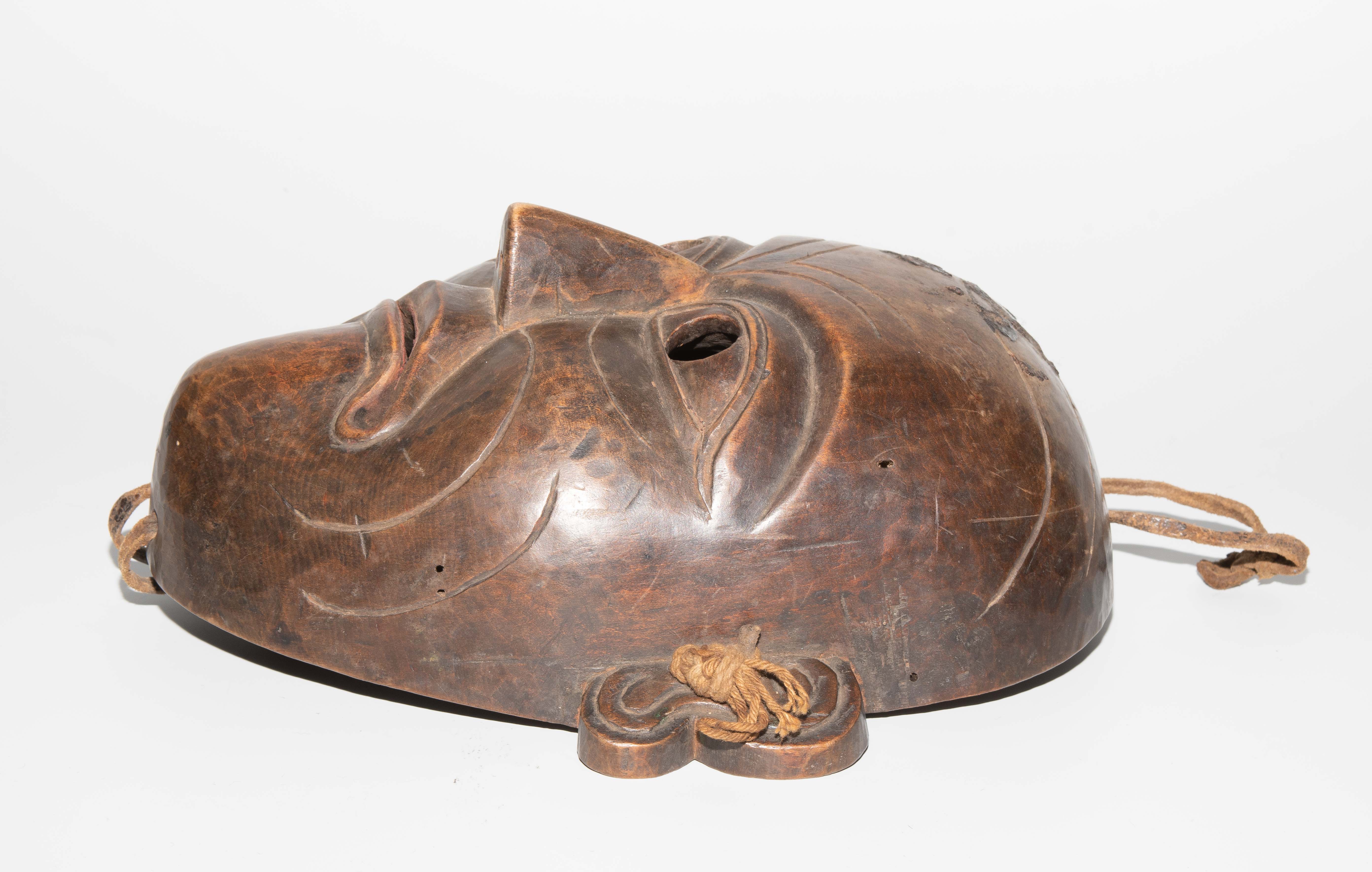 Tibet. Holz. Gesicht mit ernsten Gesichtszügen. Mit Lederbandbefestigung. H 24 cm. - Auf Stirn Fremdstoffflecken, Löcher, Kratzer.