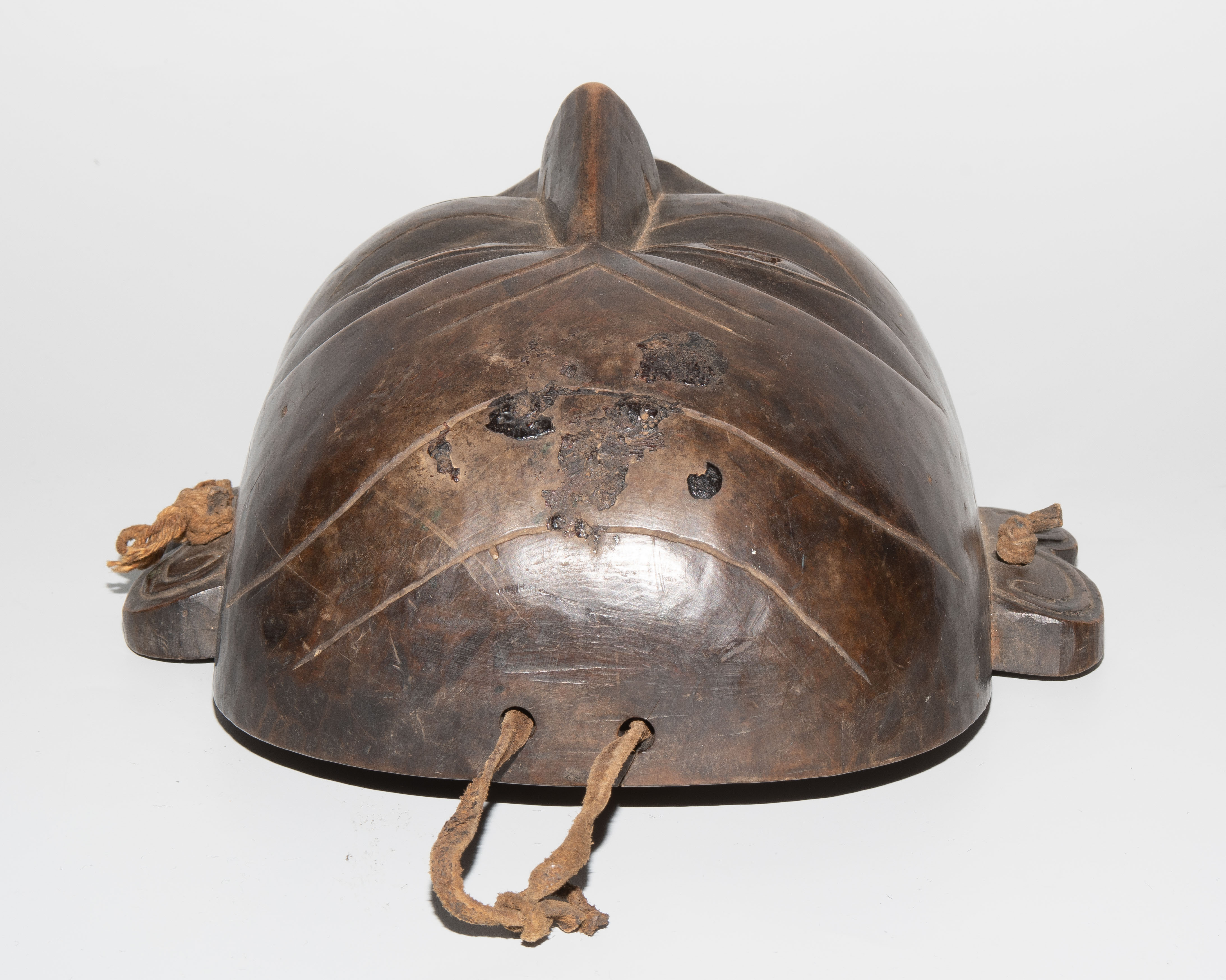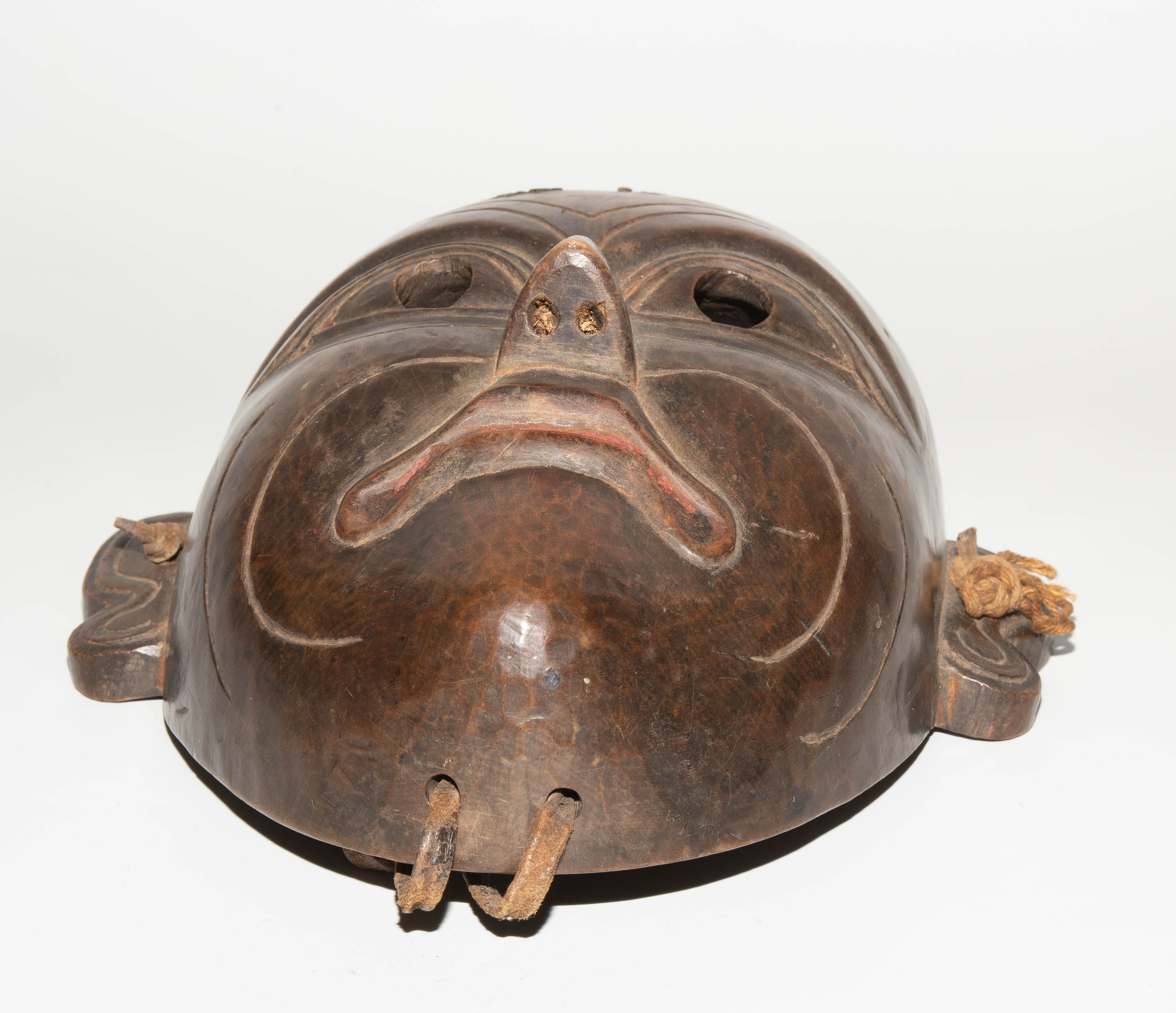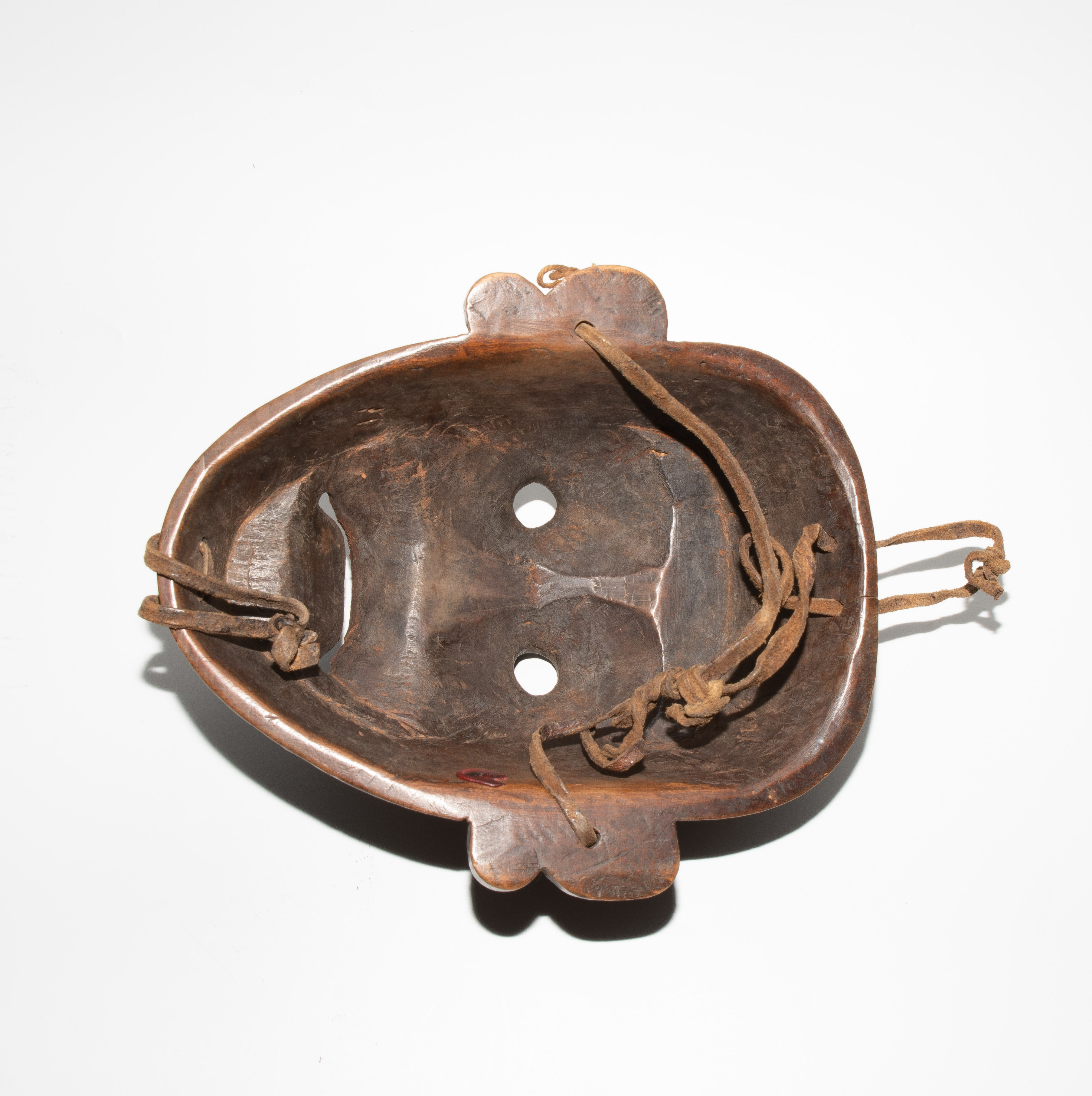 Tibet. Holz. Gesicht mit ernsten Gesichtszügen. Mit Lederbandbefestigung. H 24 cm. - Auf Stirn Fremdstoffflecken, Löcher, Kratzer.