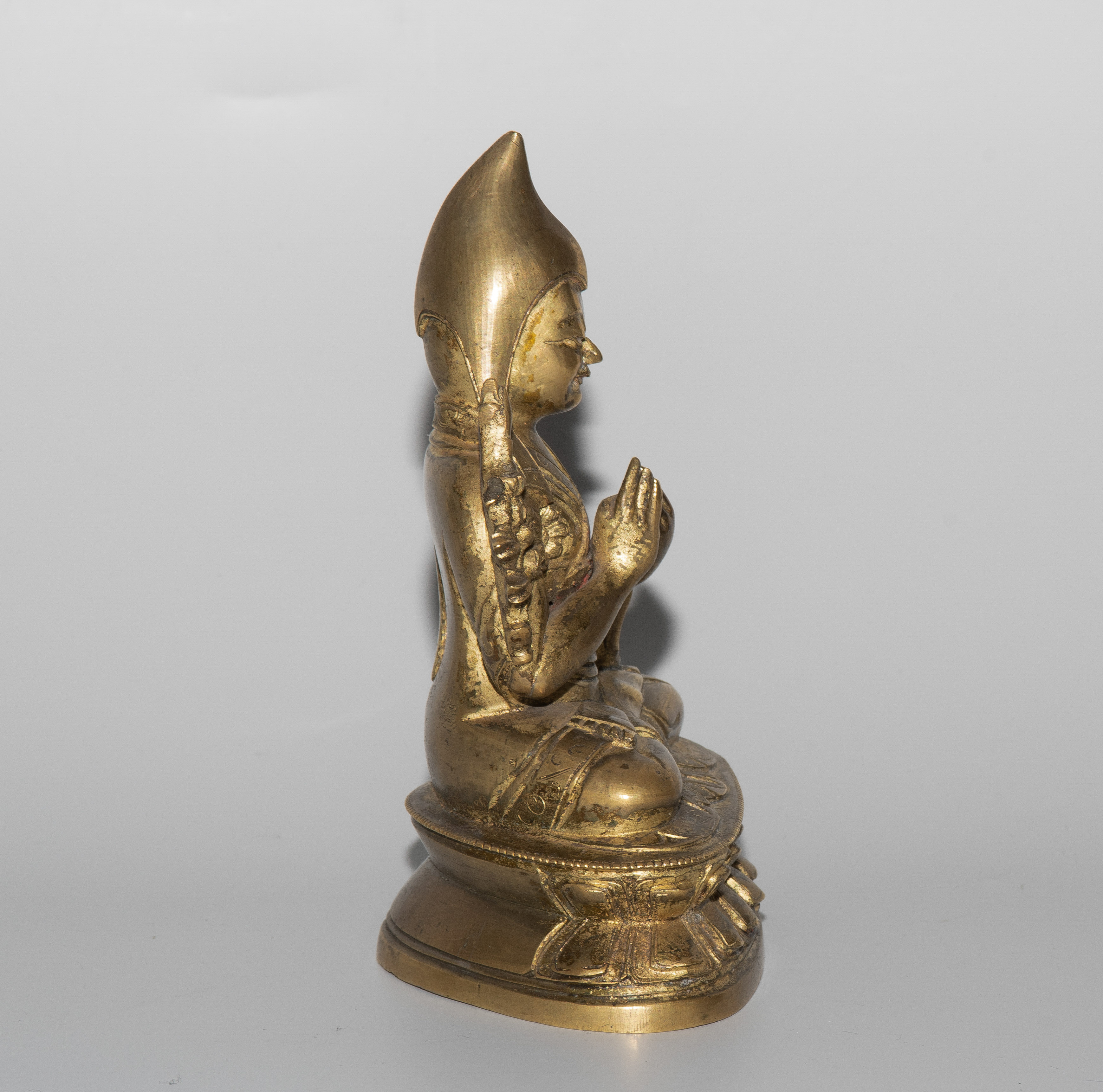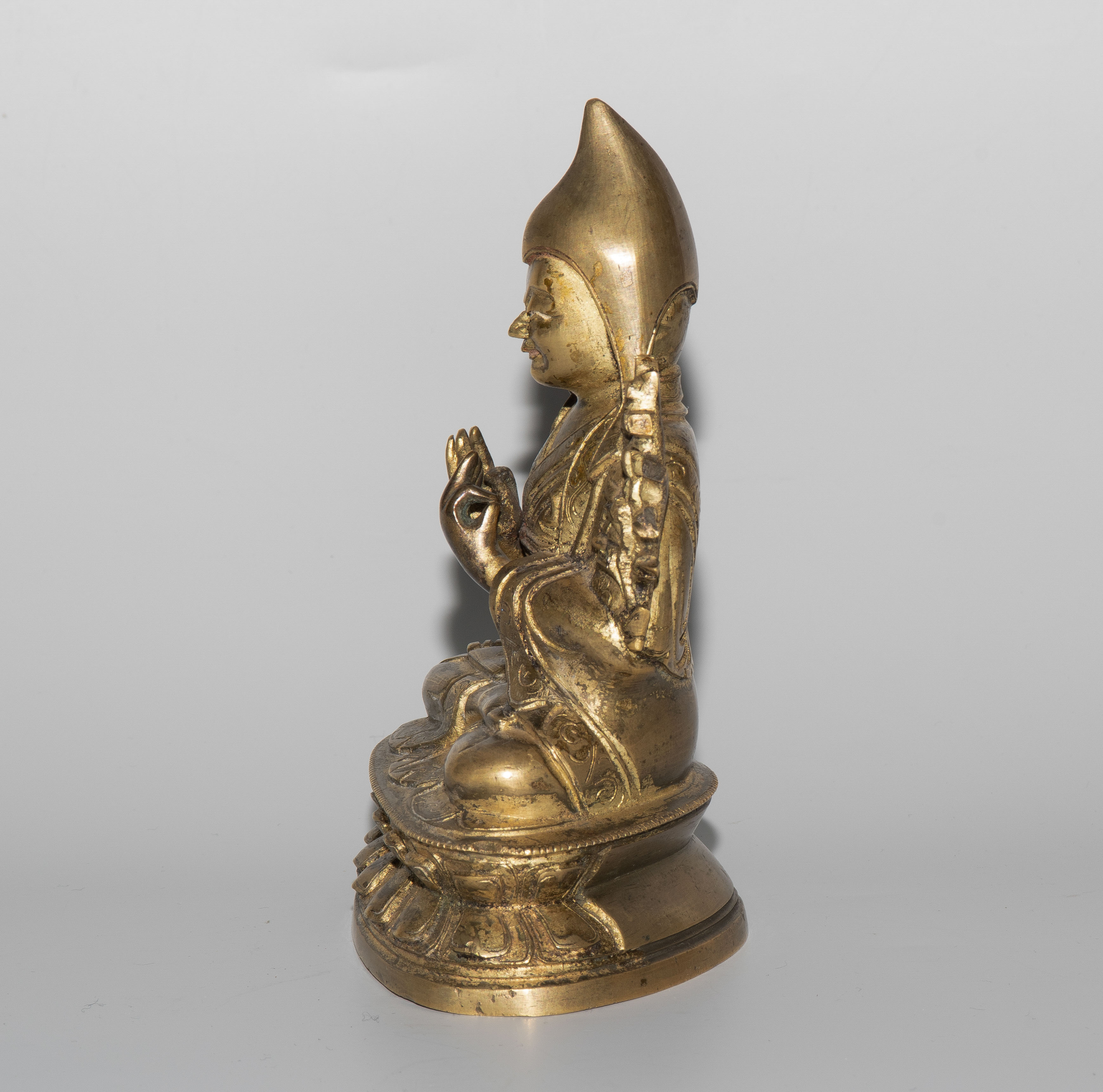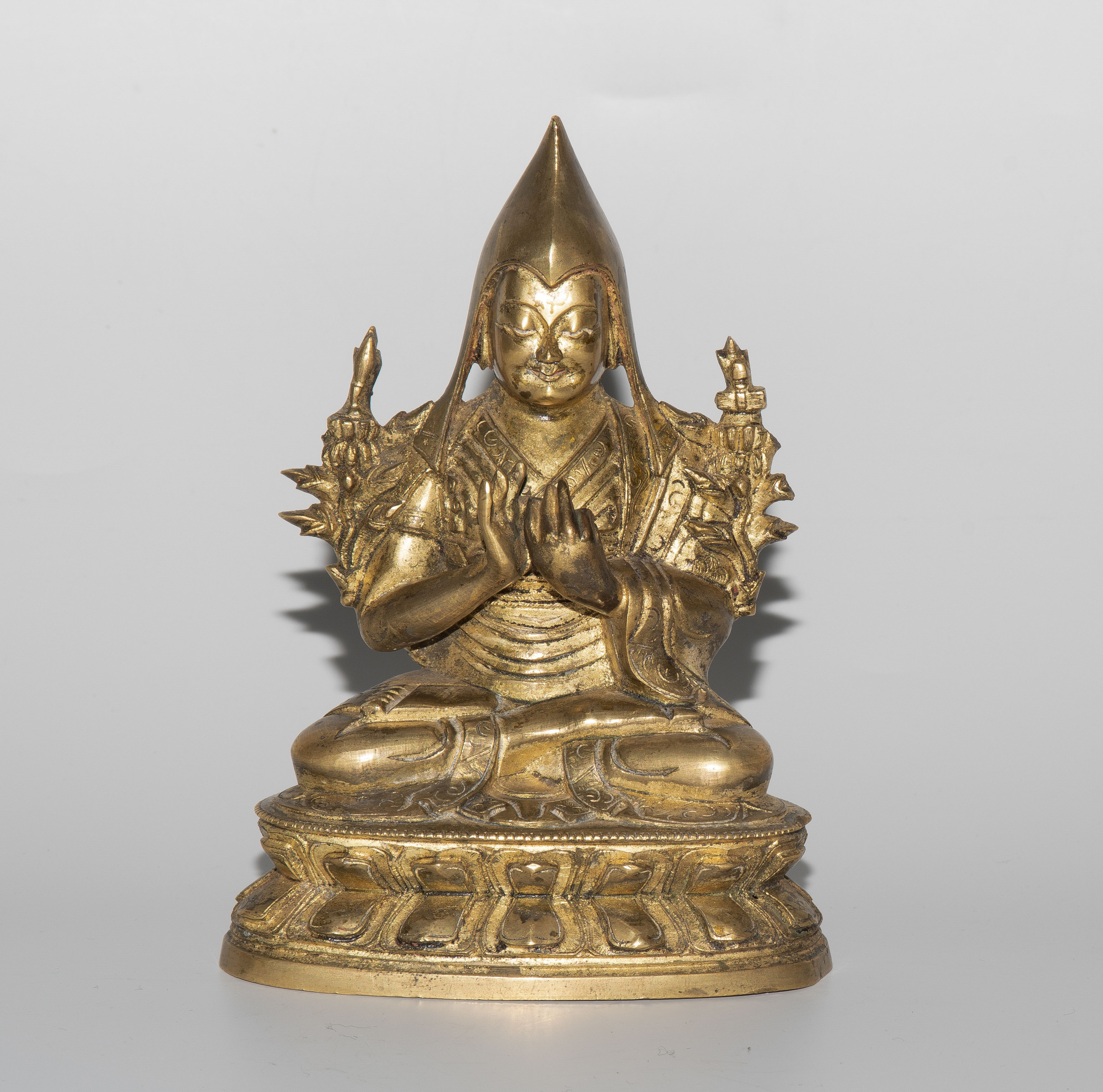 Tibet. Metall. Darstellung des reich gekleideten, meditierenden Tsongkhapa Lobsang Dragpa auf einem Lotossockel. H 14,5 cm.