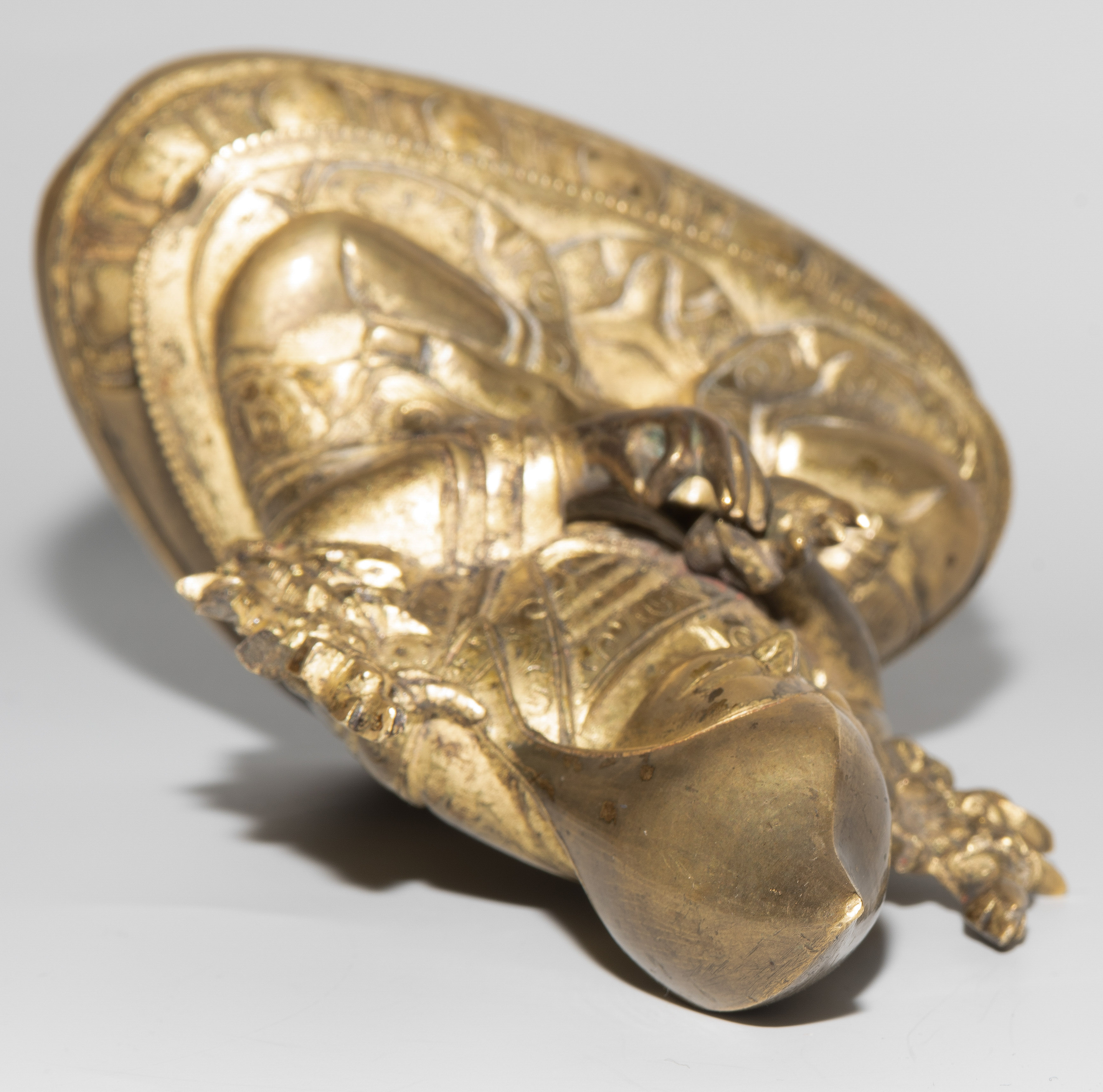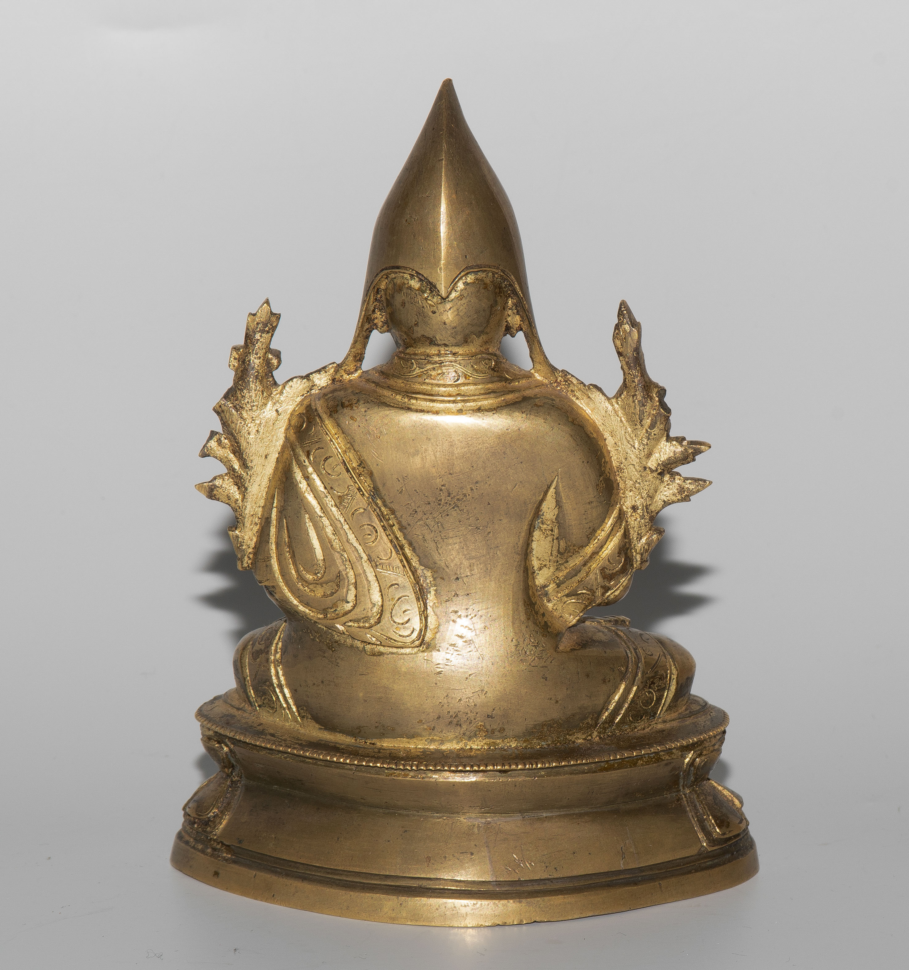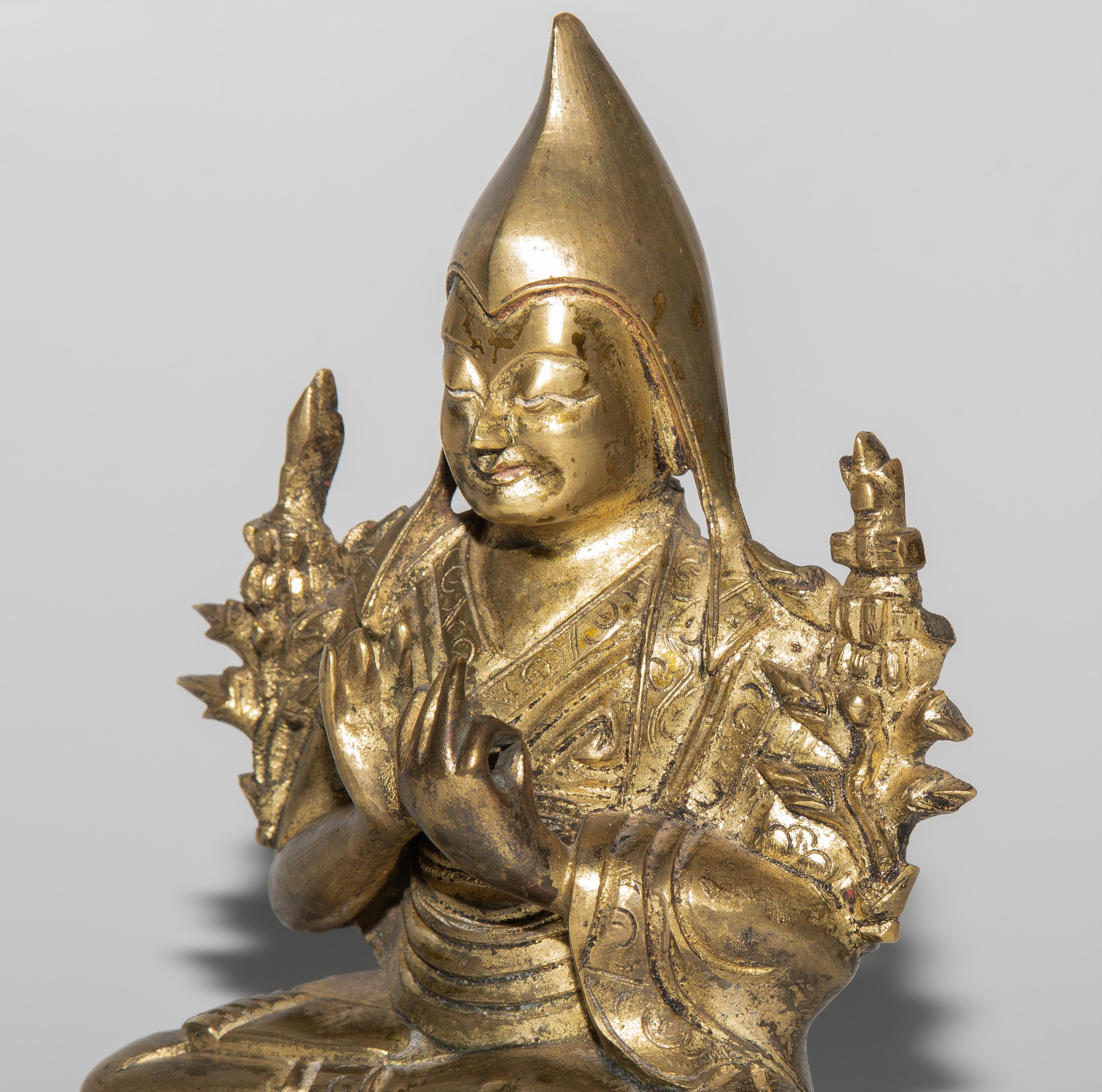 Tibet. Metall. Darstellung des reich gekleideten, meditierenden Tsongkhapa Lobsang Dragpa auf einem Lotossockel. H 14,5 cm.