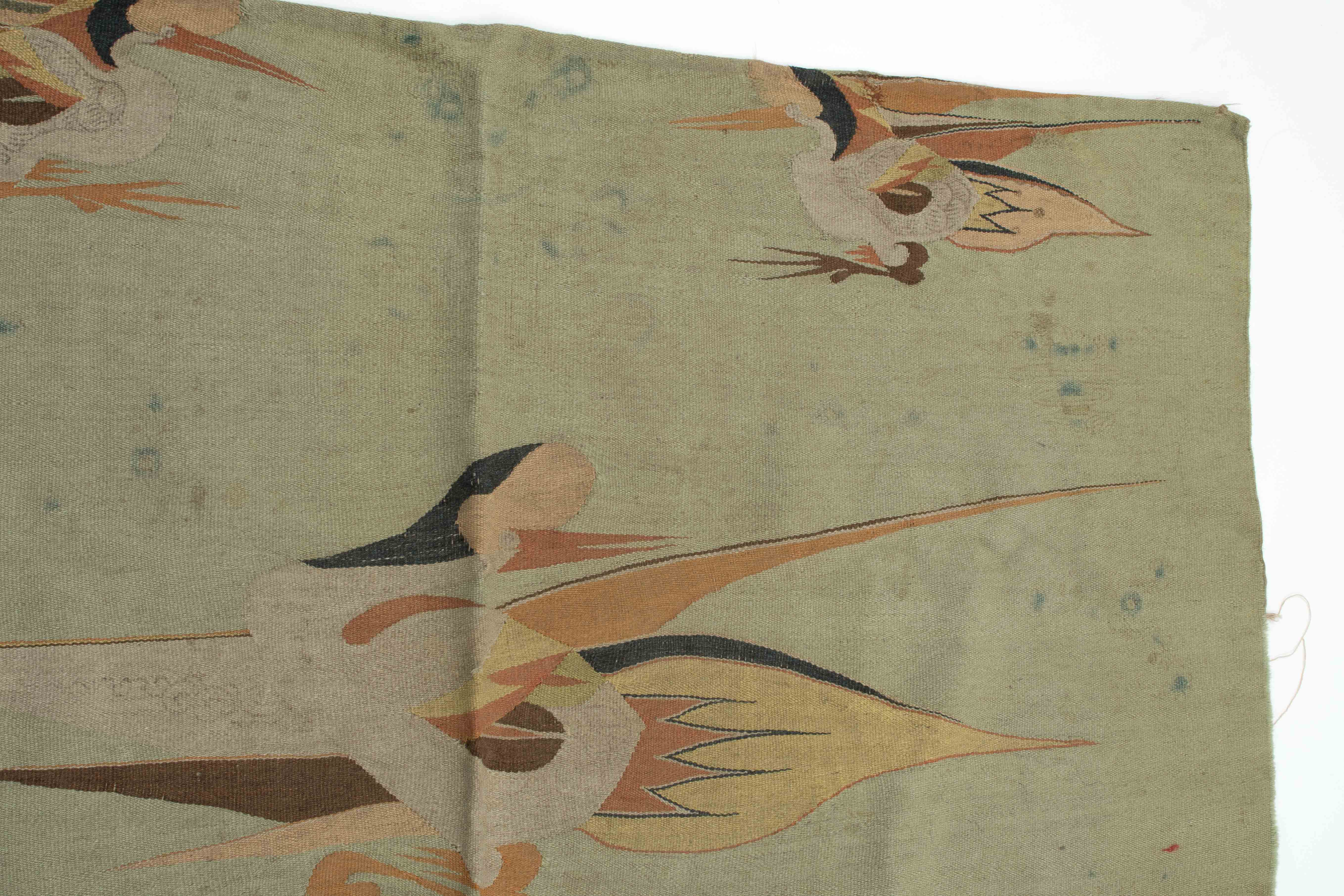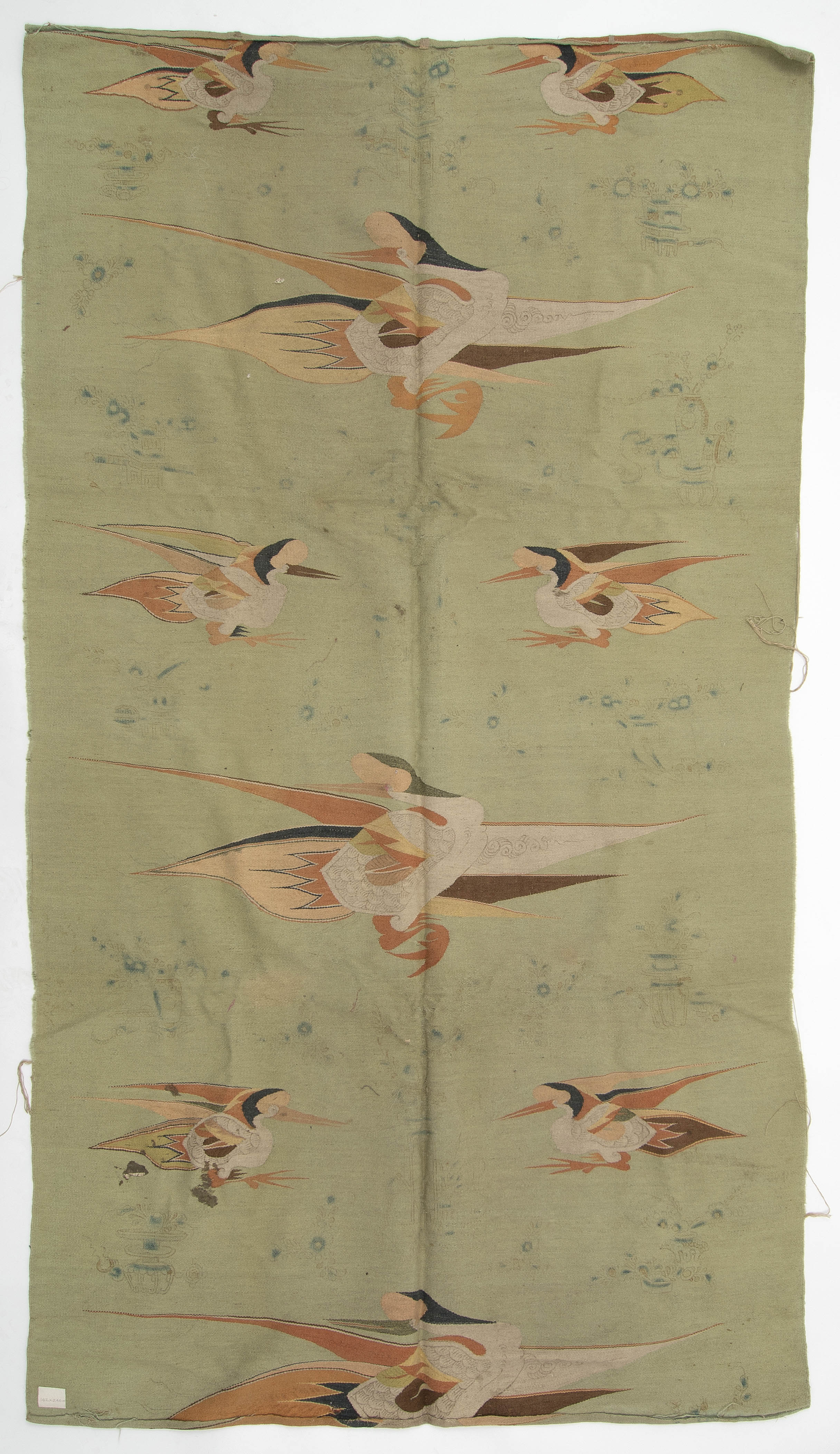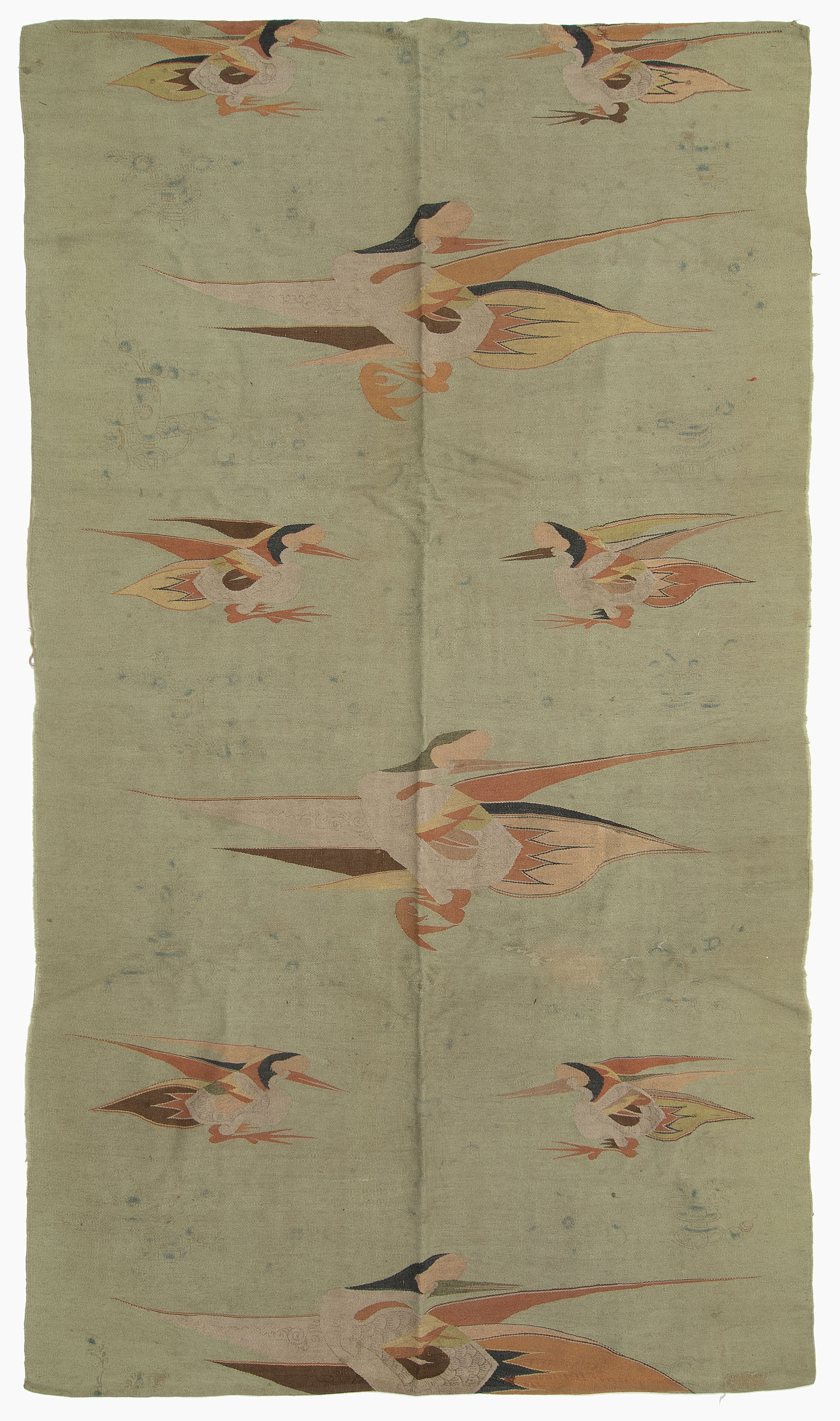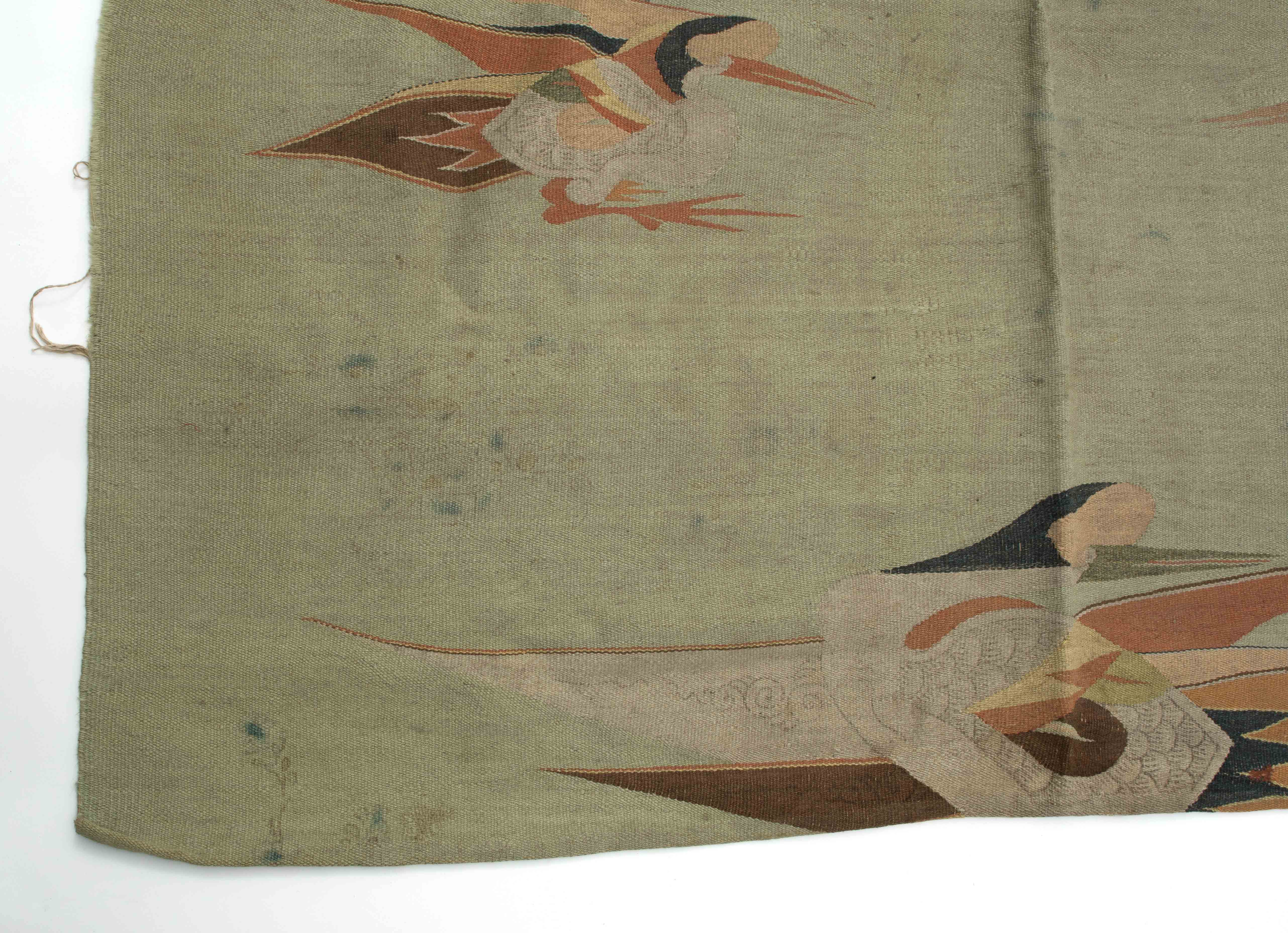 Mongolei, um 1920. Flachgewebe aus Wolle. Darstellungen von fliegenden Vögeln. 238x140 cm. - Alters- und Gebrauchspuren. Fleckig.