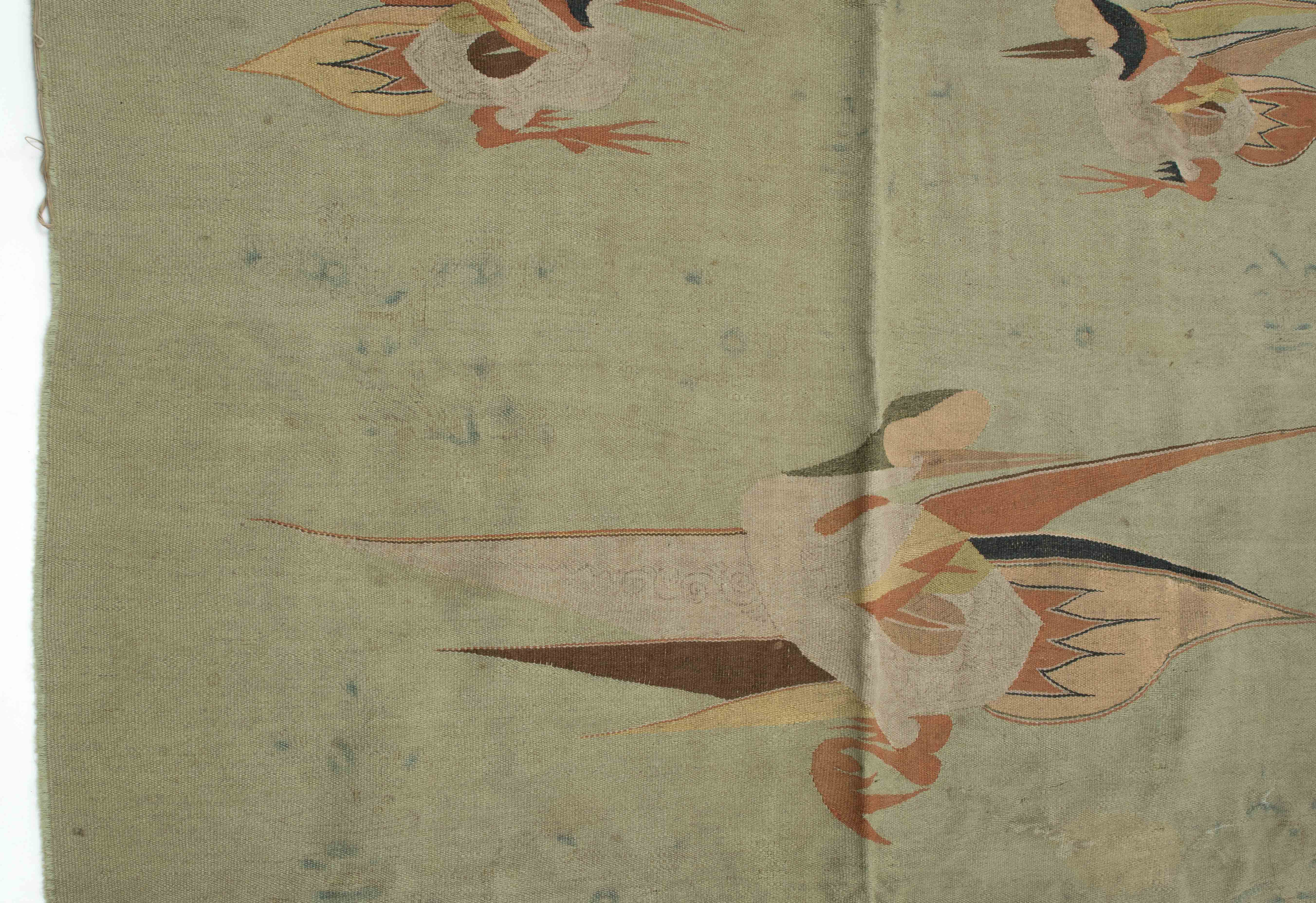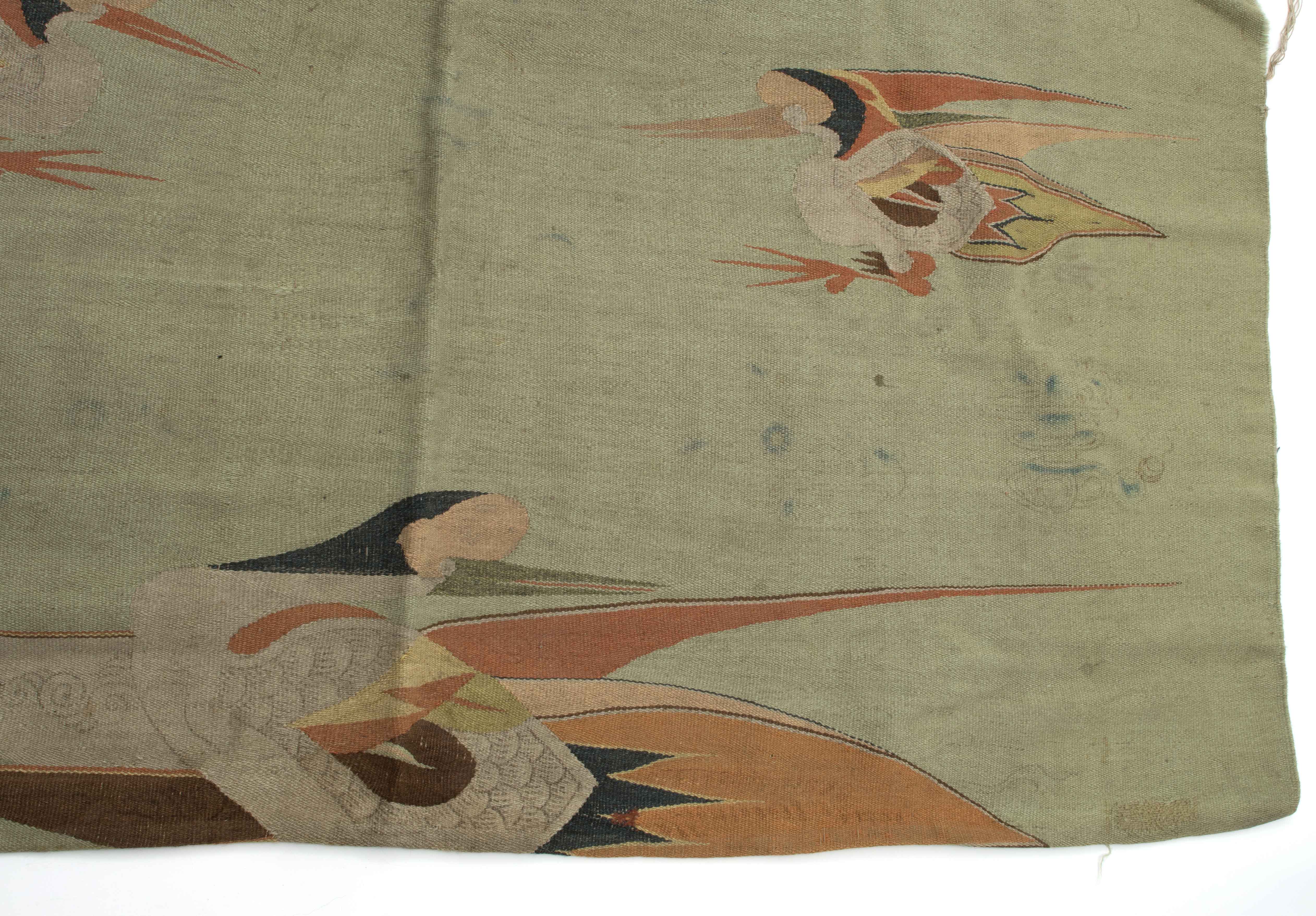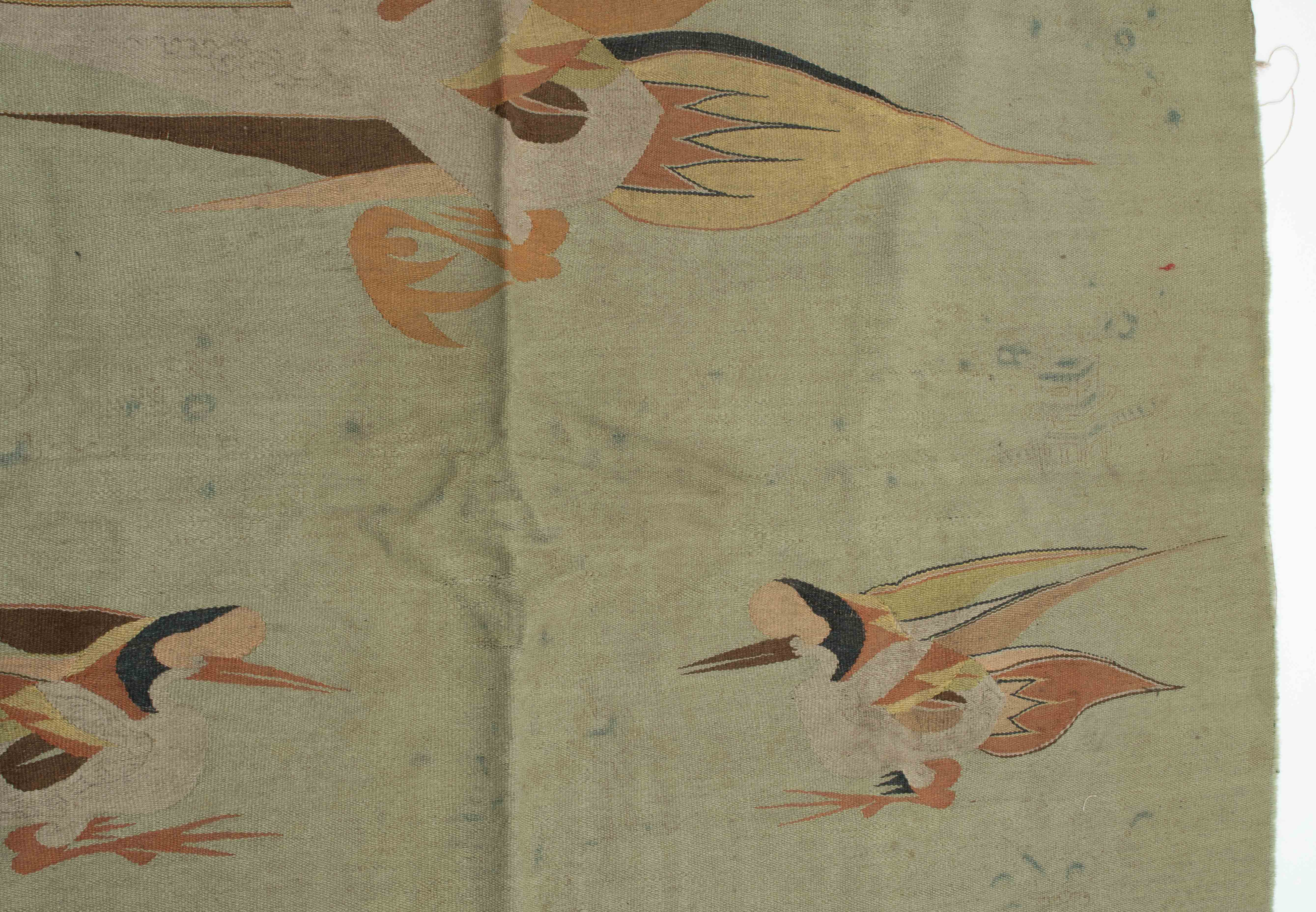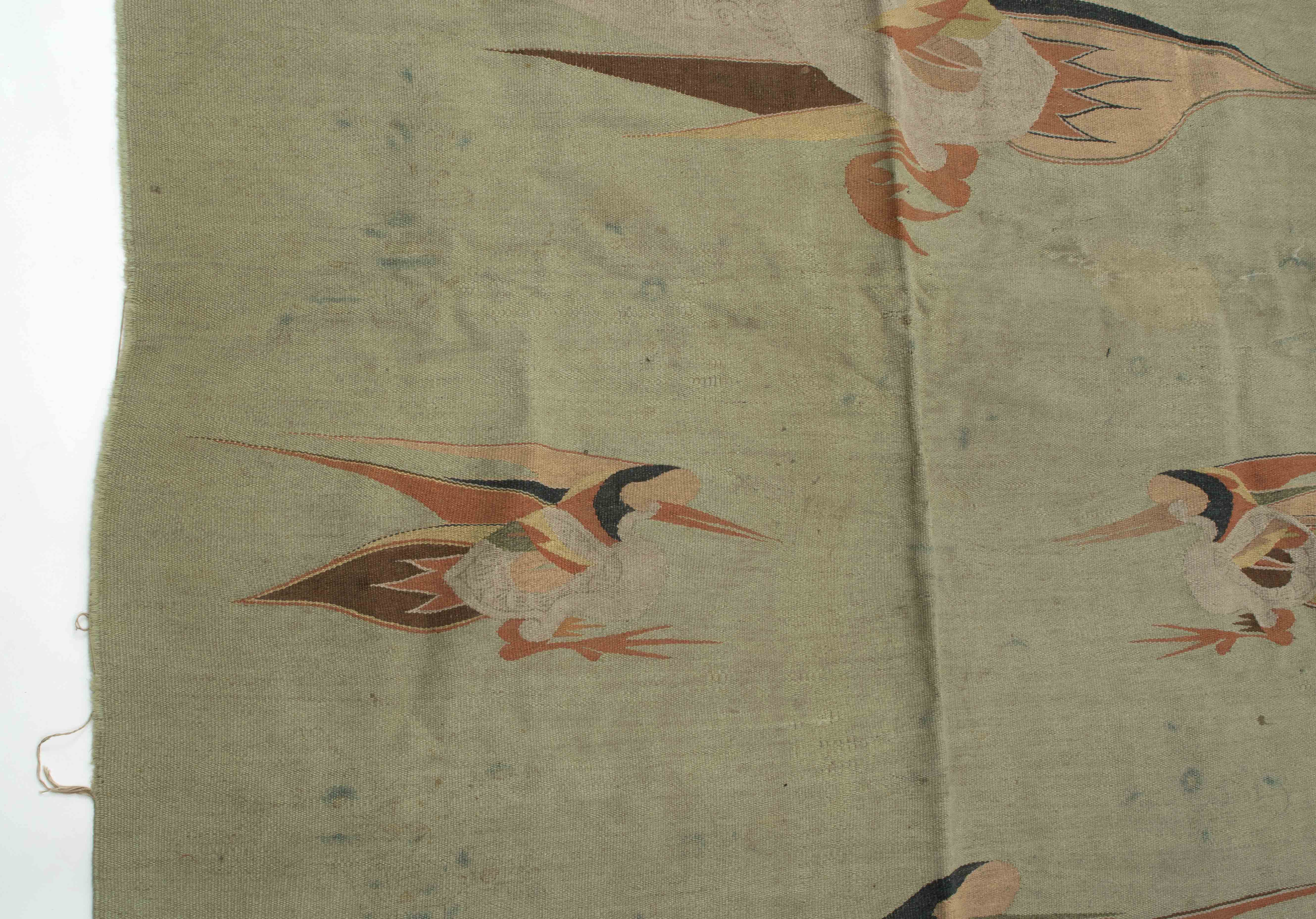 Mongolei, um 1920. Flachgewebe aus Wolle. Darstellungen von fliegenden Vögeln. 238x140 cm. - Alters- und Gebrauchspuren. Fleckig.