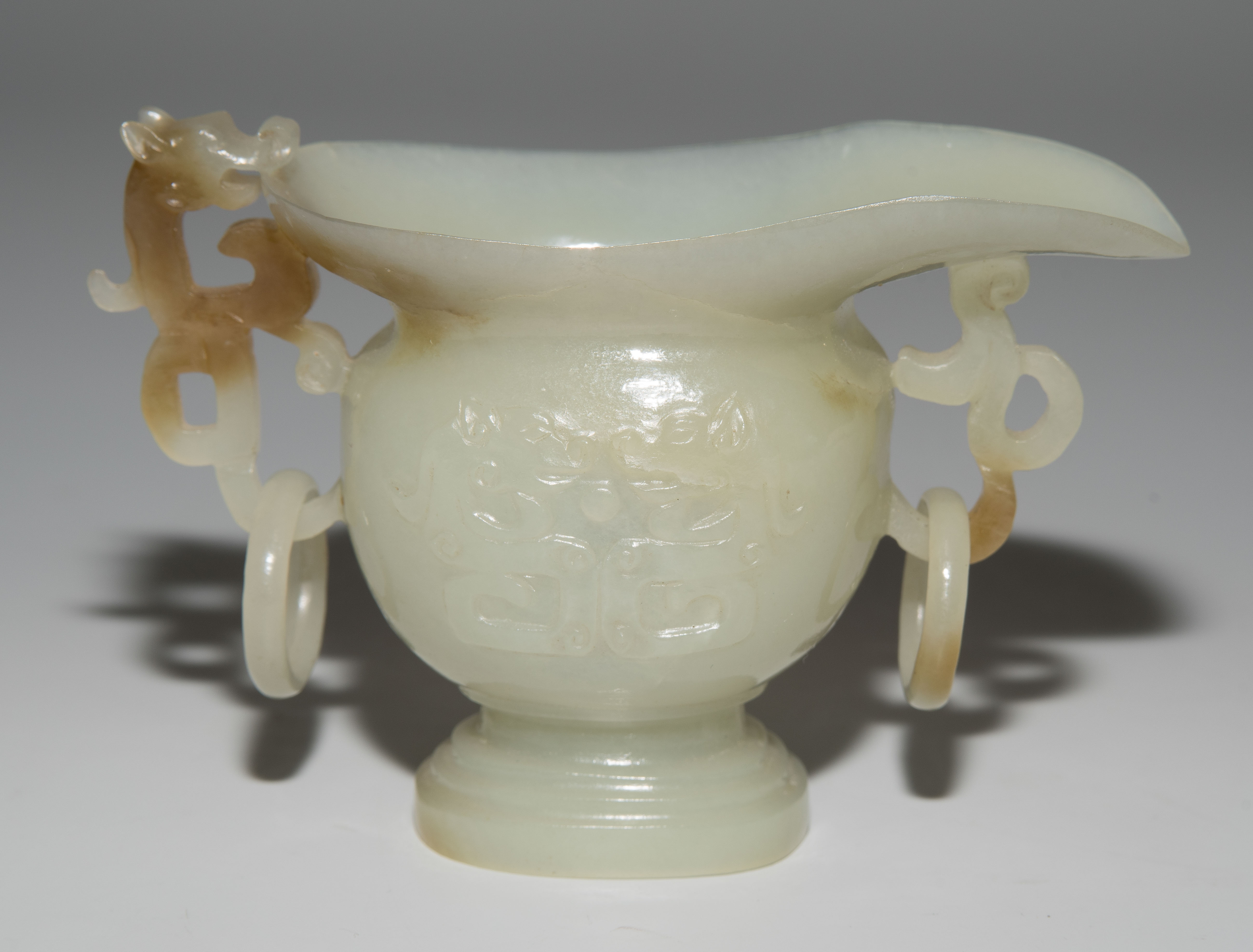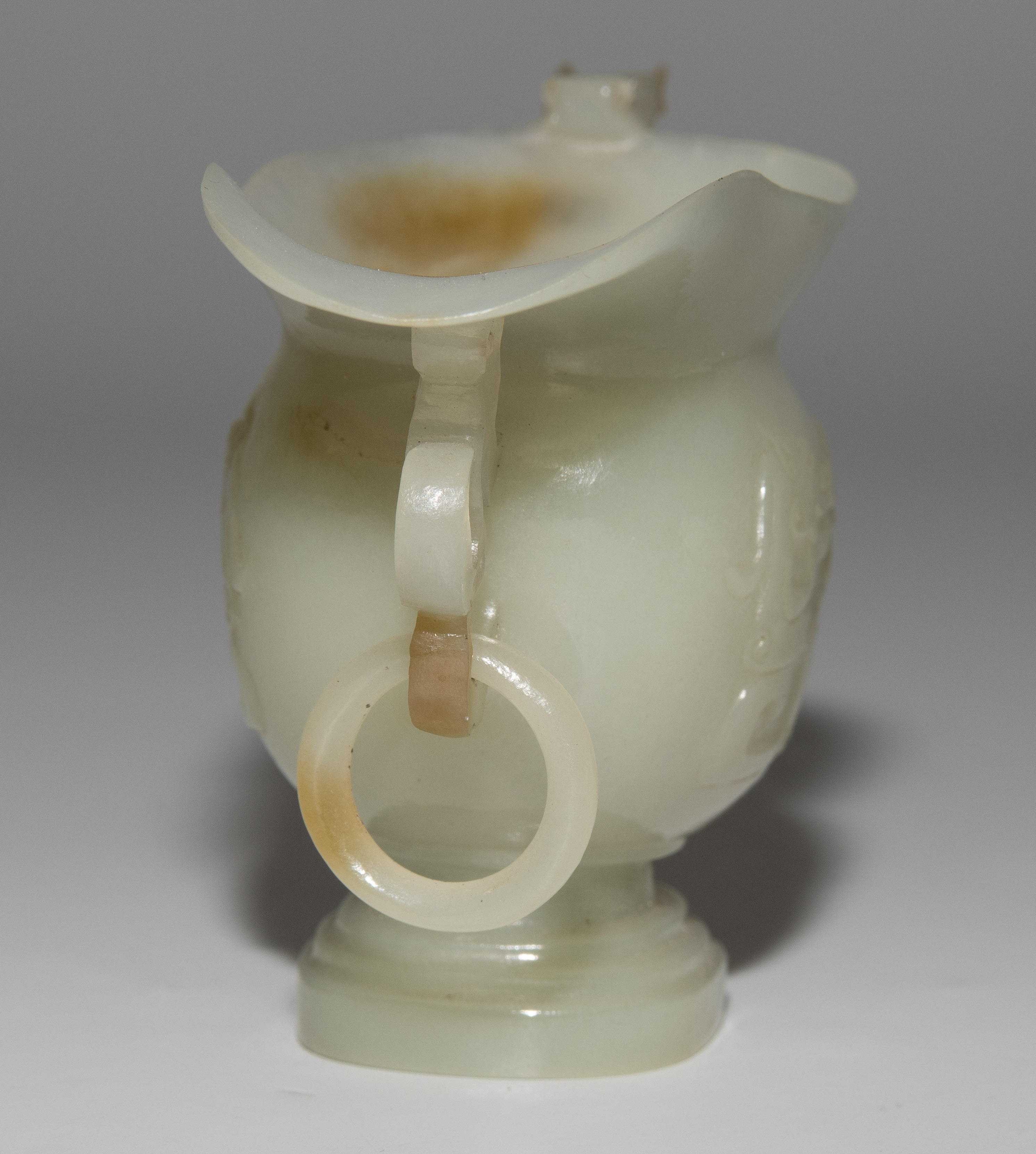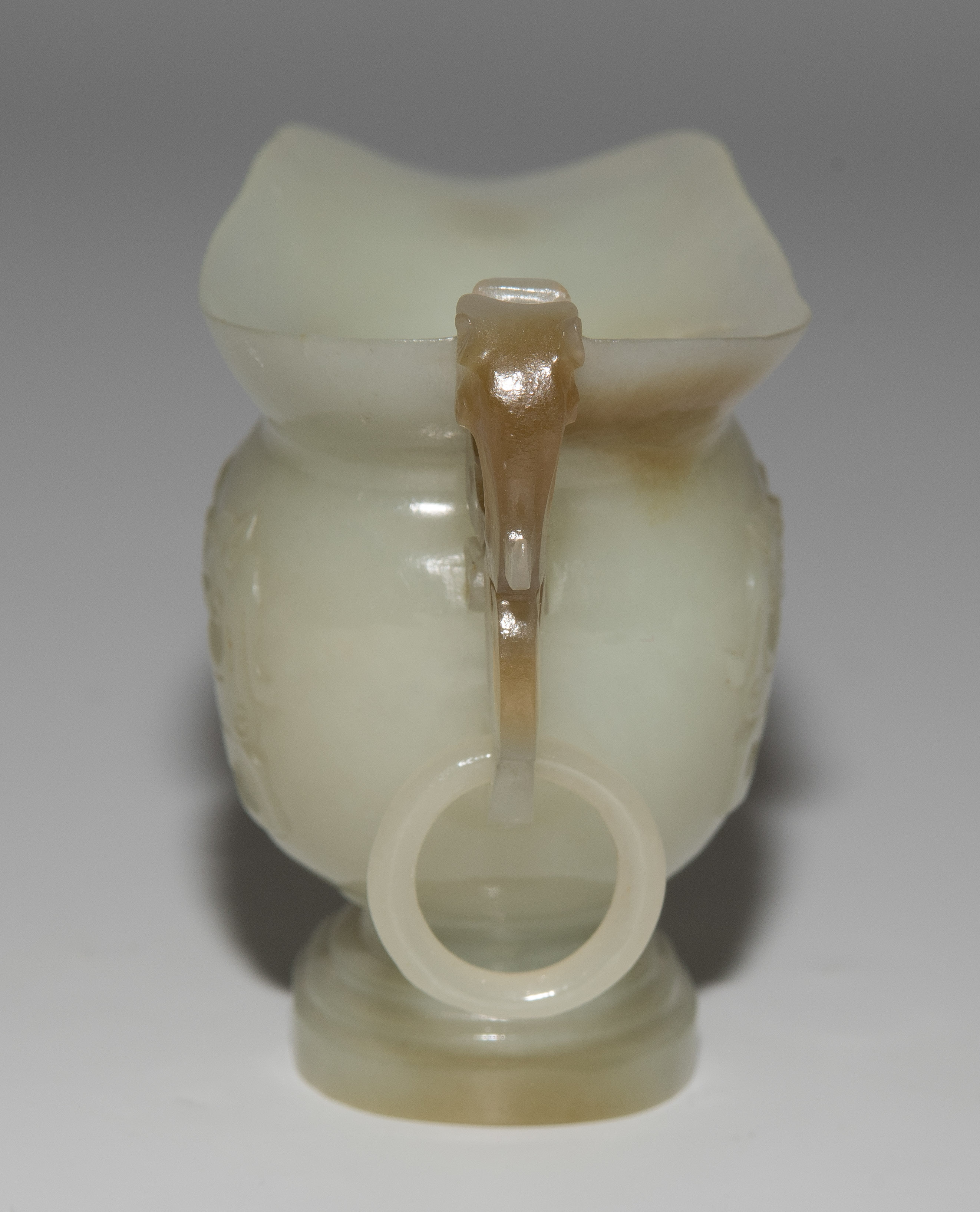China. Celadonfarbene Jade mit rostbraunen Zonen. Kugelige Form mit Ausguss und Standfuss. Mit reliefiertem Drachenhenkel. H 5,5 cm.