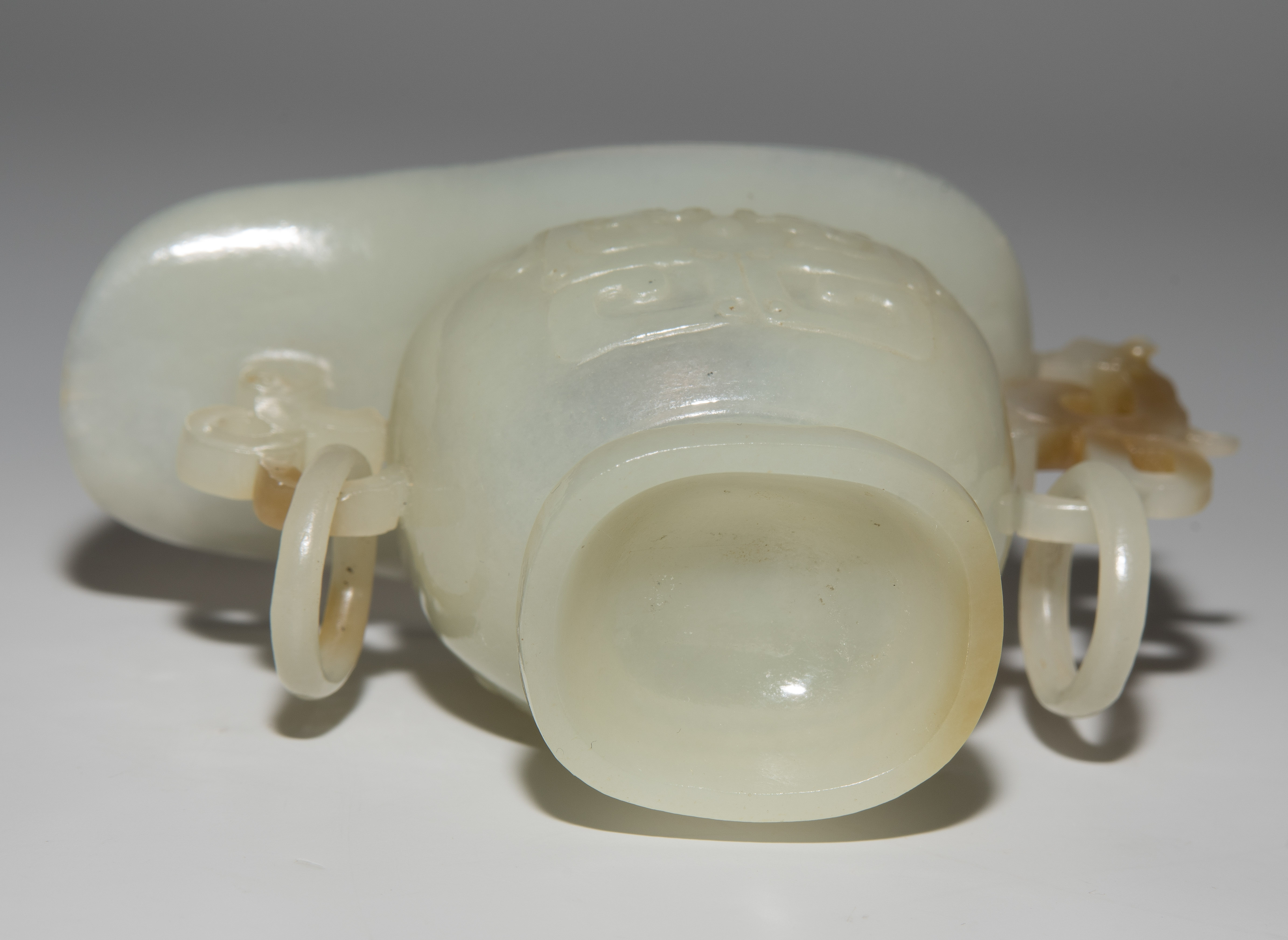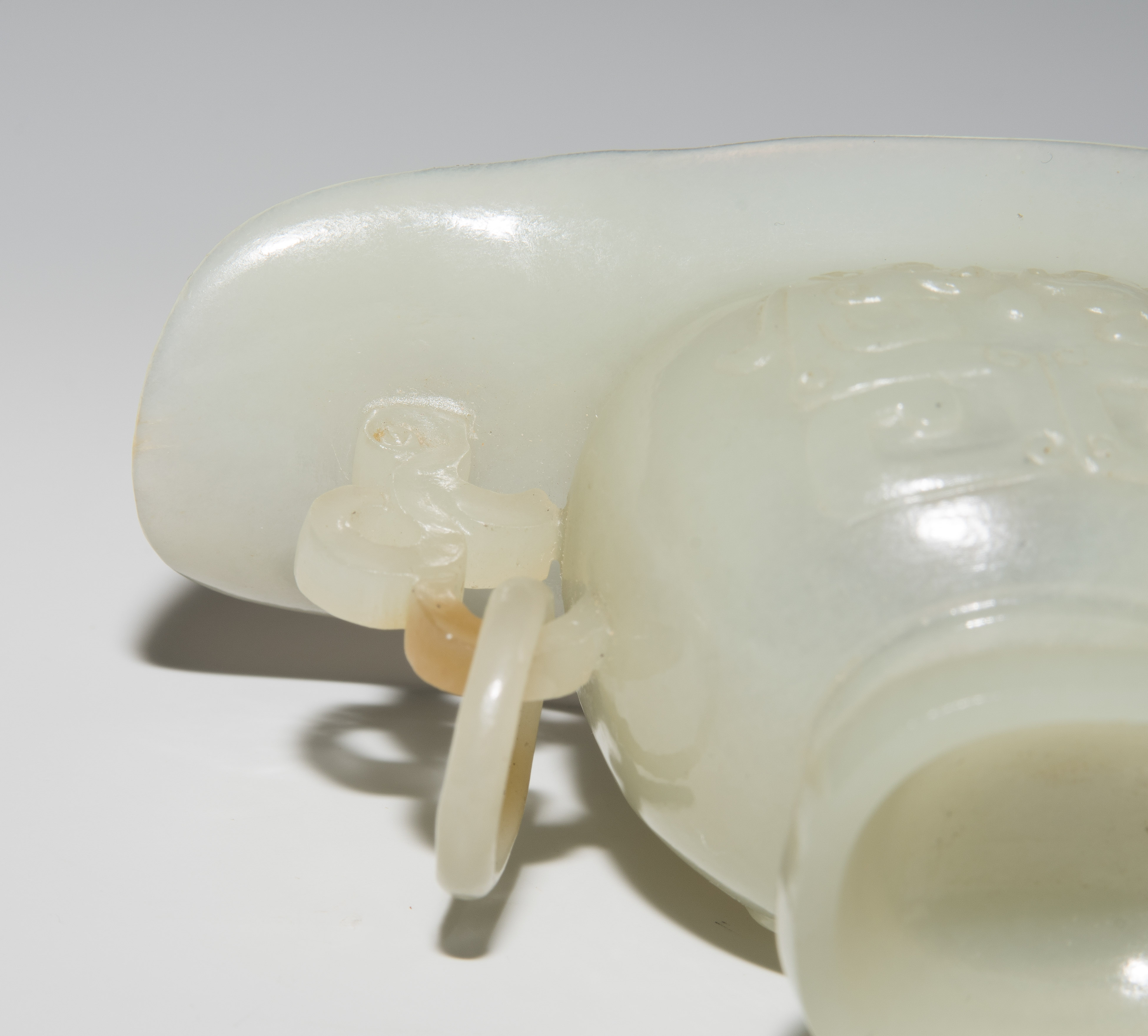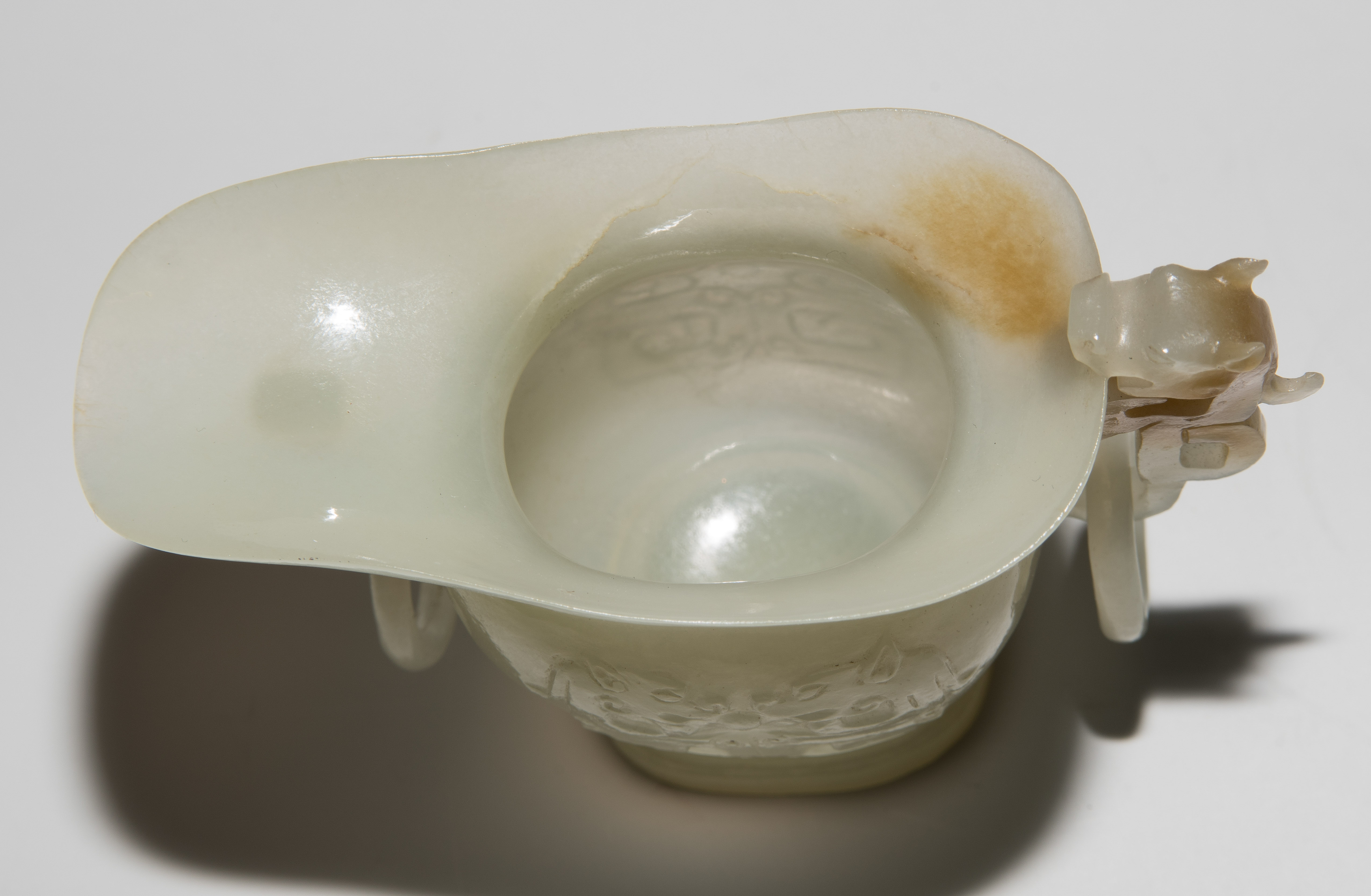 China. Celadonfarbene Jade mit rostbraunen Zonen. Kugelige Form mit Ausguss und Standfuss. Mit reliefiertem Drachenhenkel. H 5,5 cm.