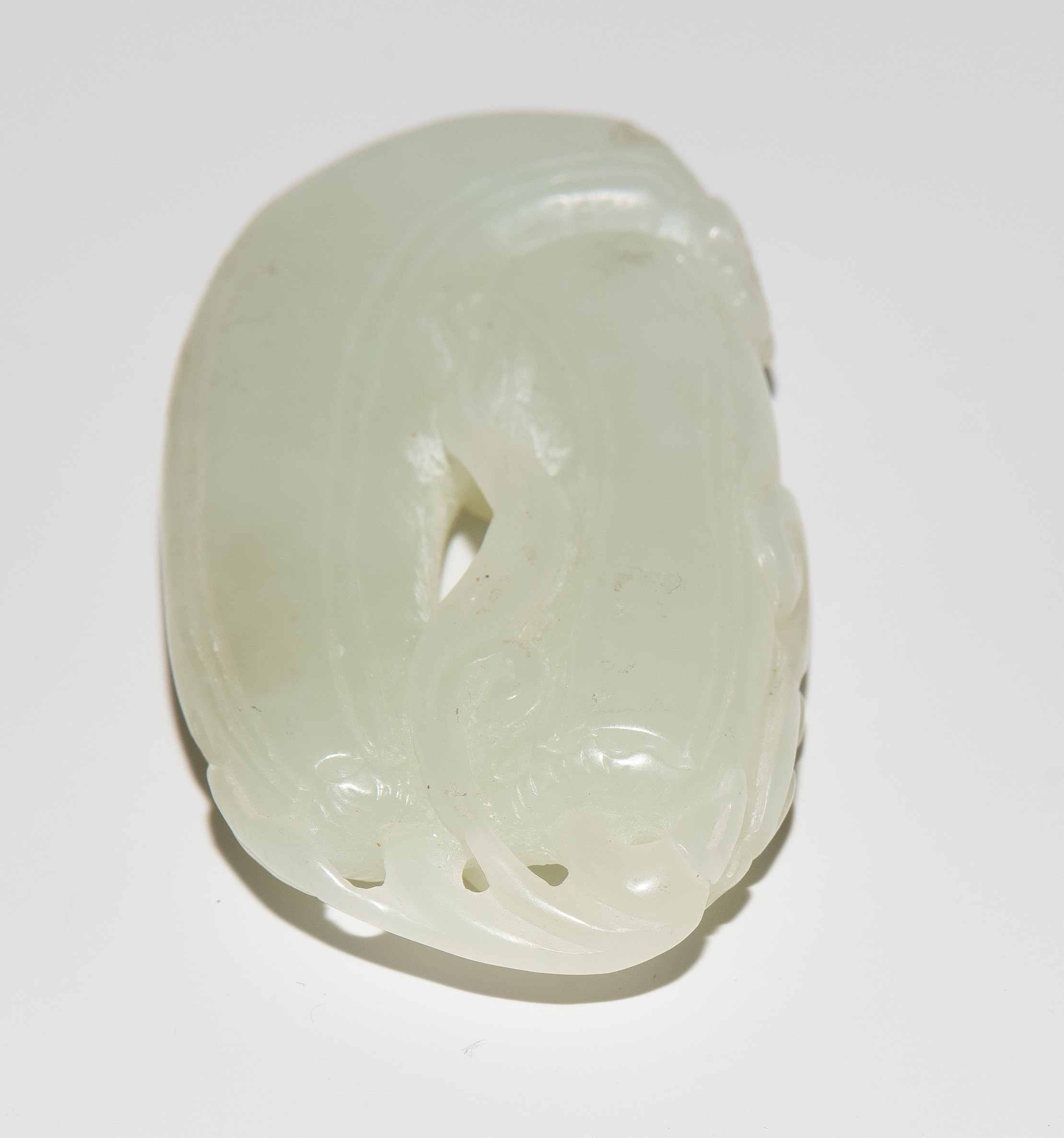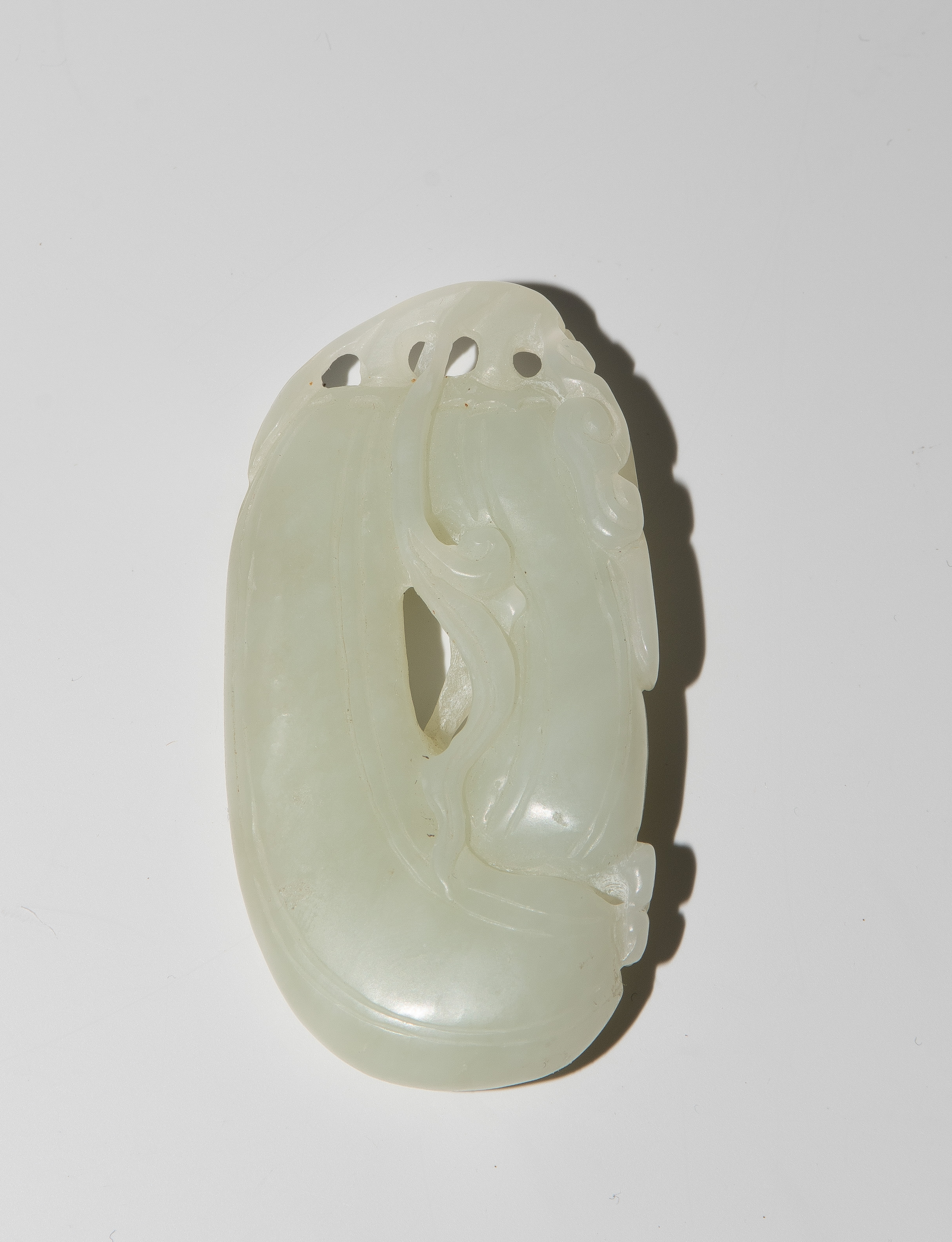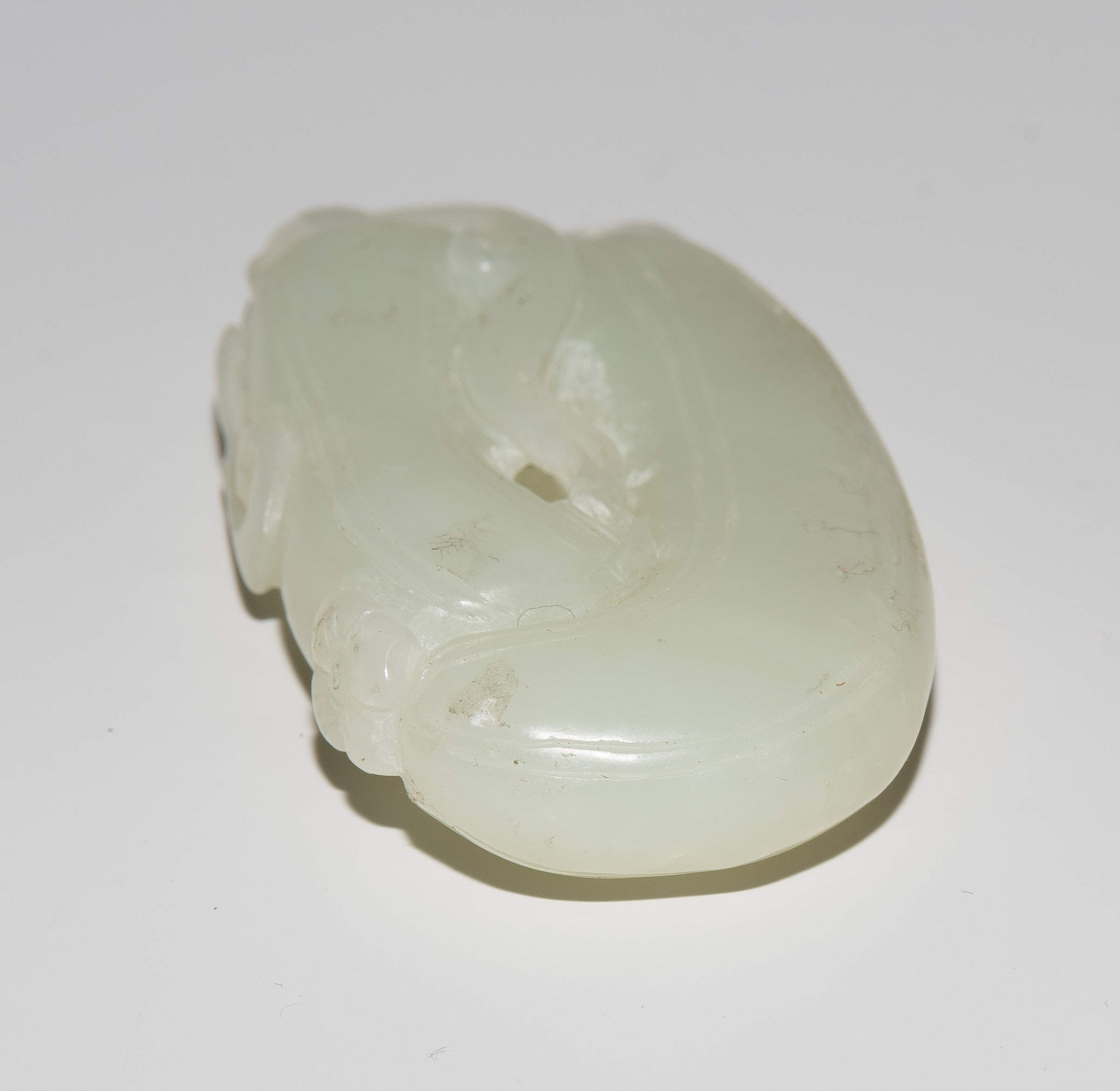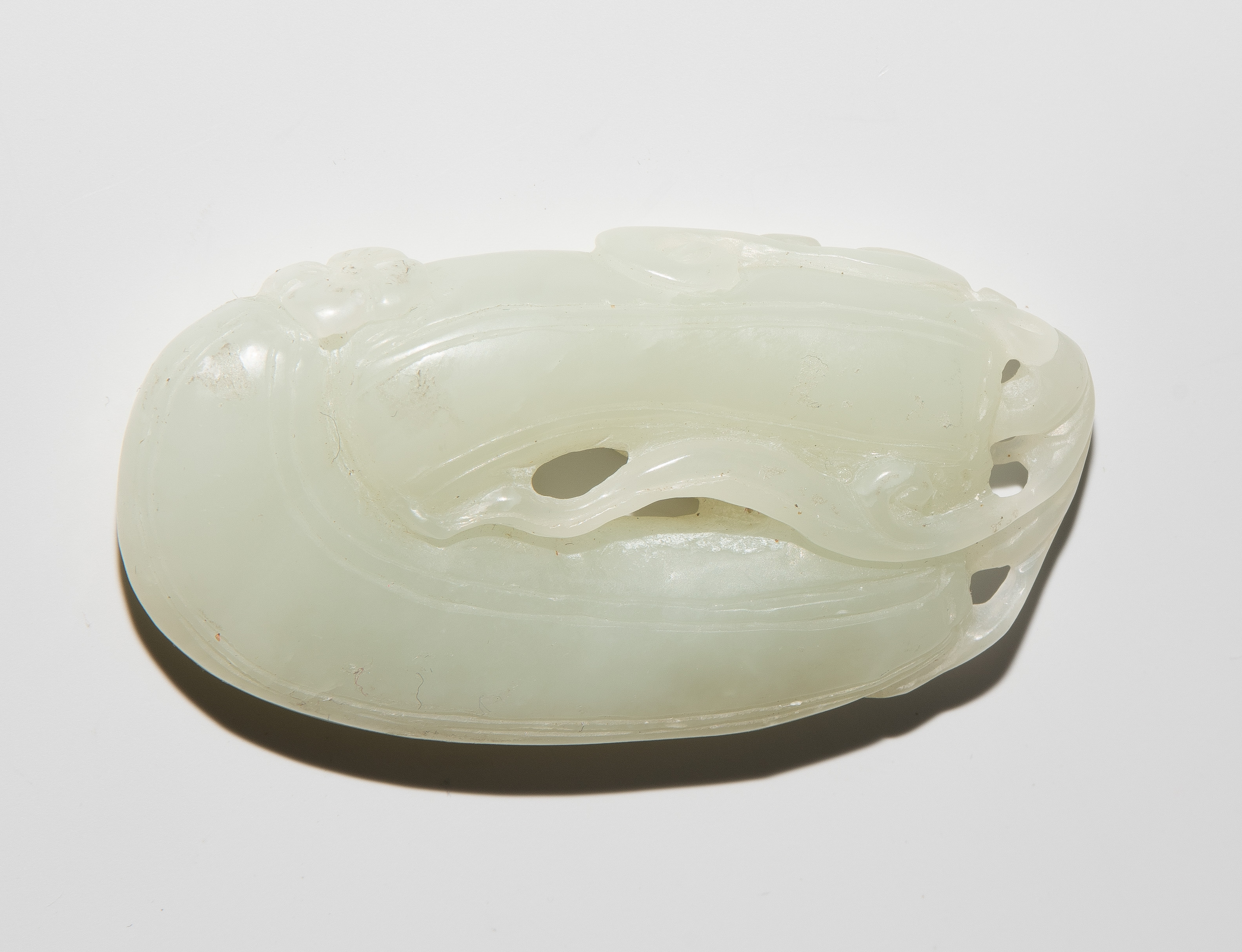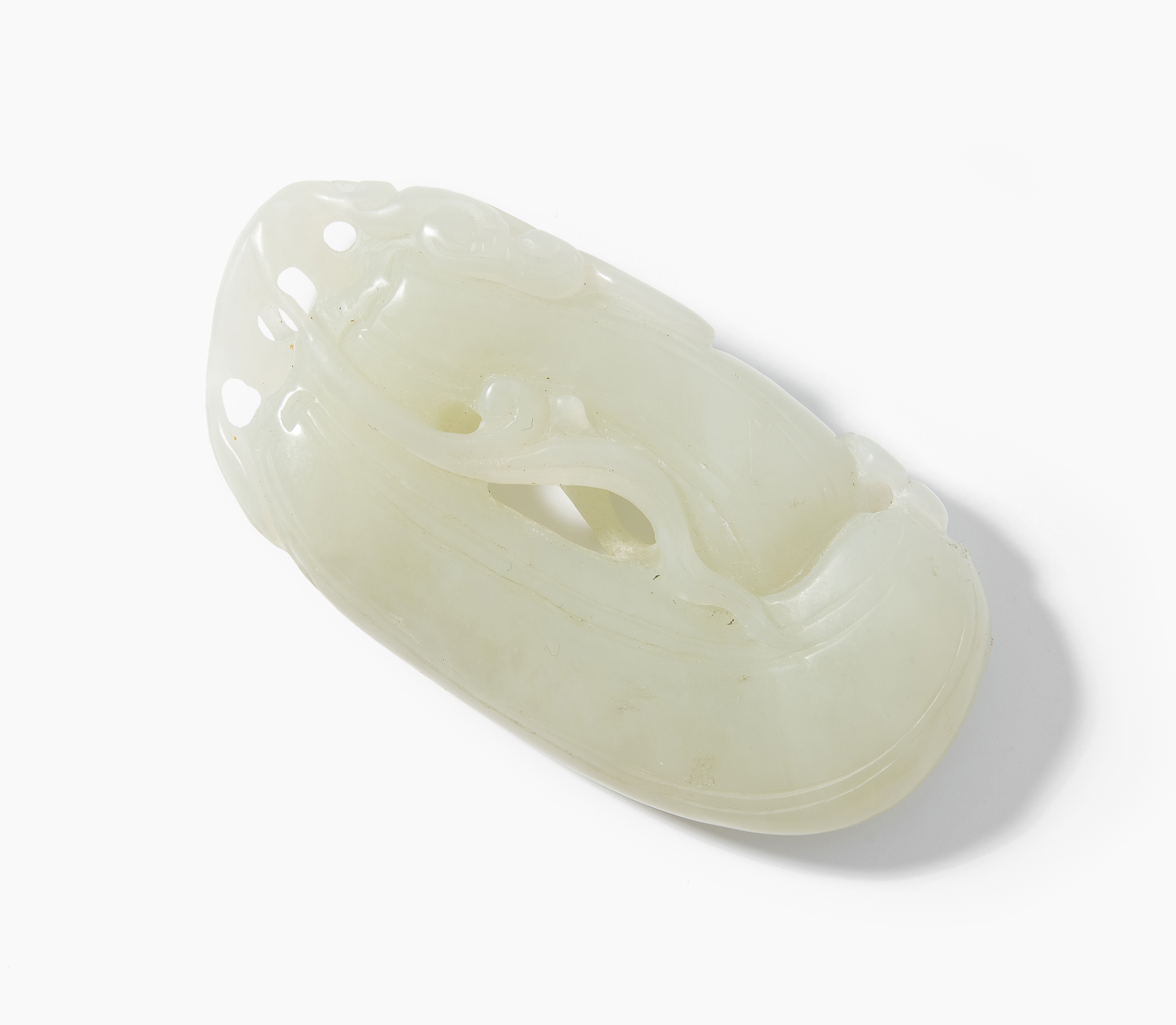 China, 20.Jh. Hell-celadonfarbene Jade. Zwei ineinander verschlungene Flaschenkürbisse. L 5,2 cm.