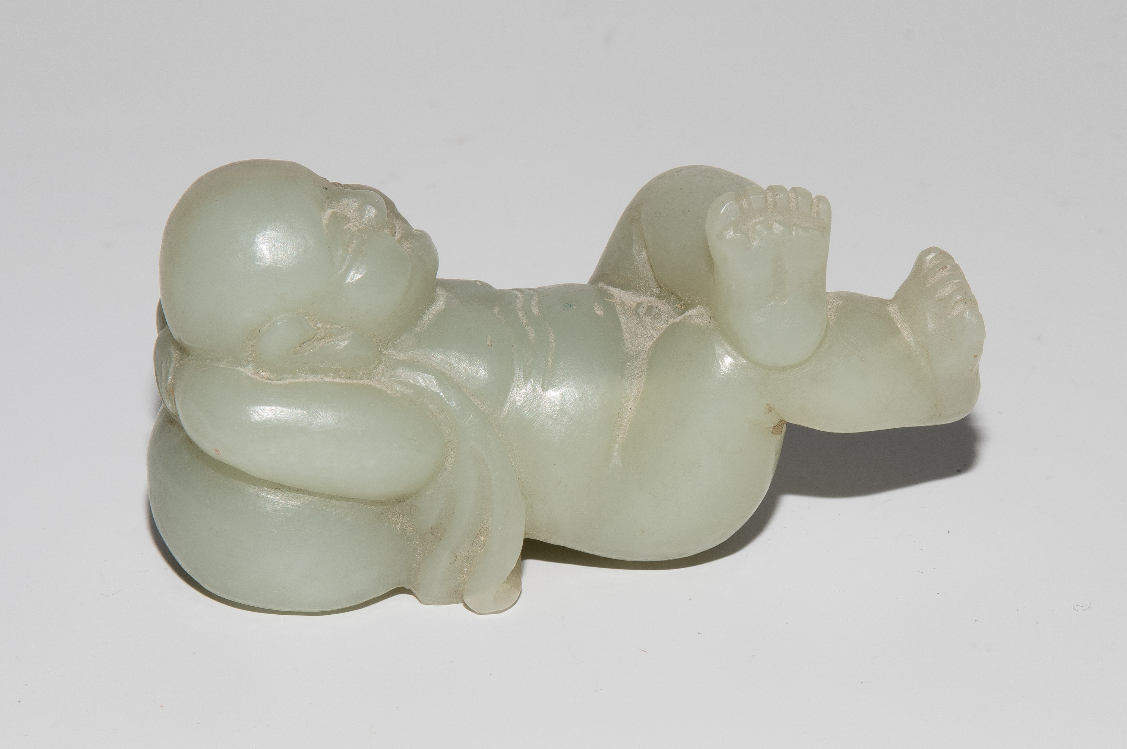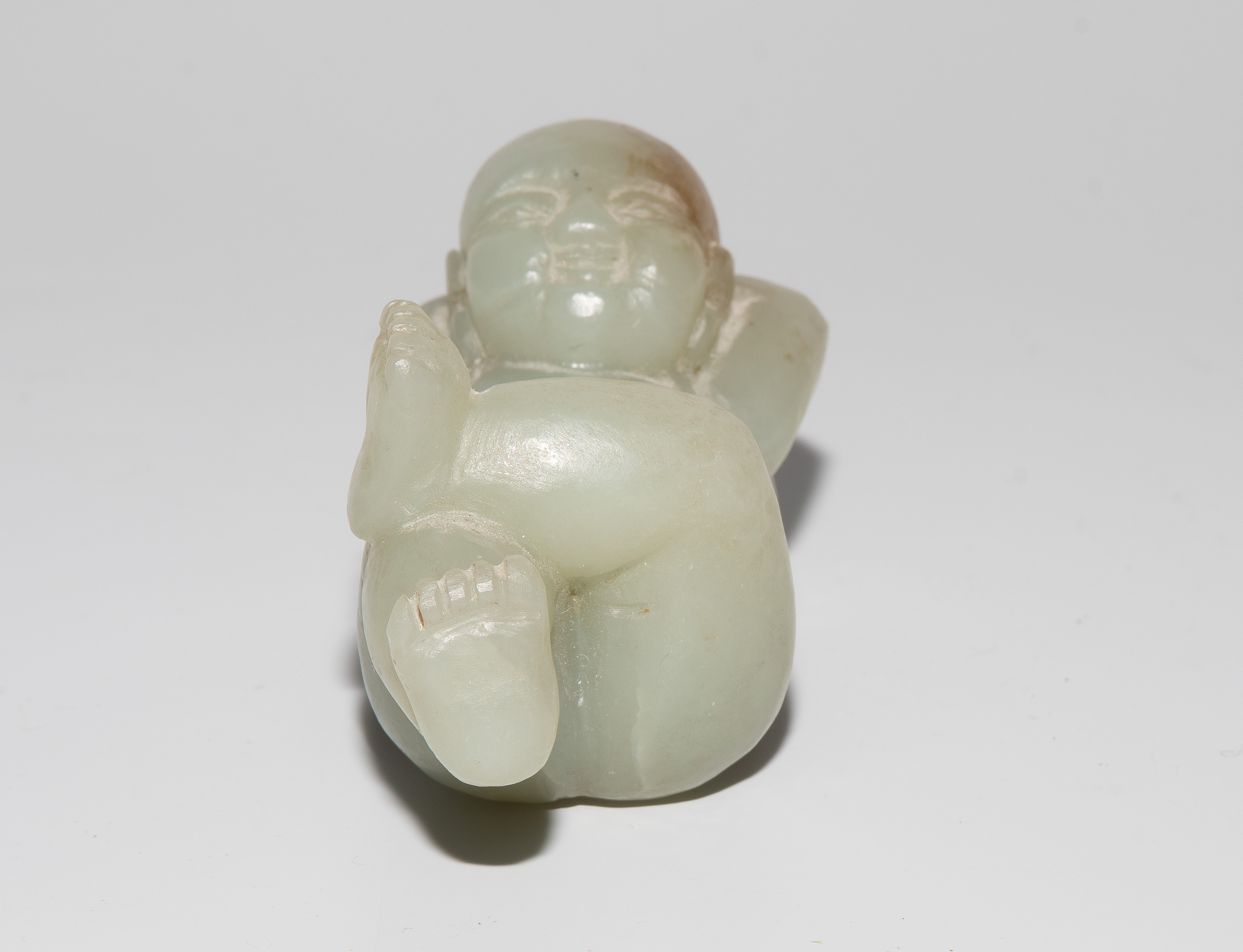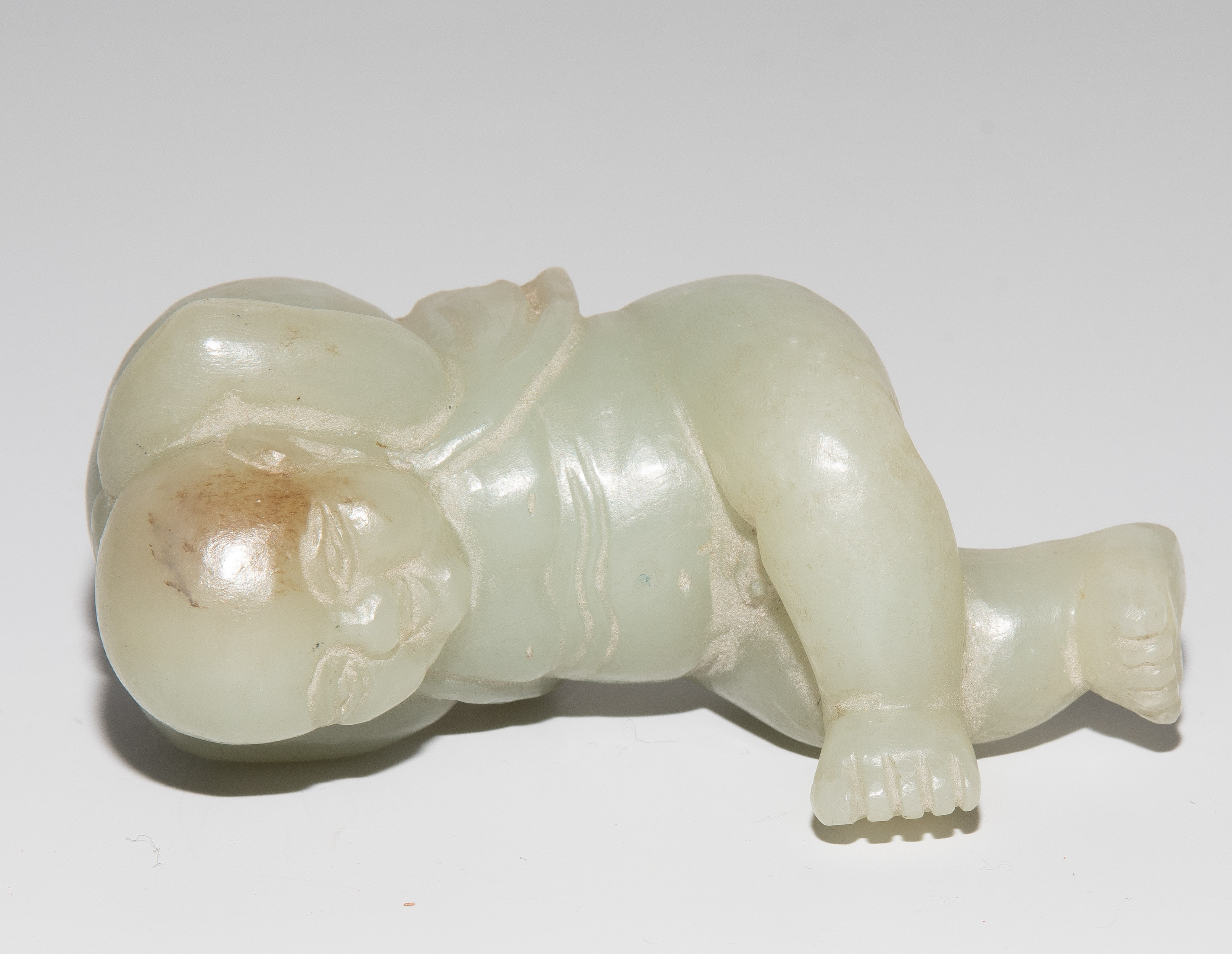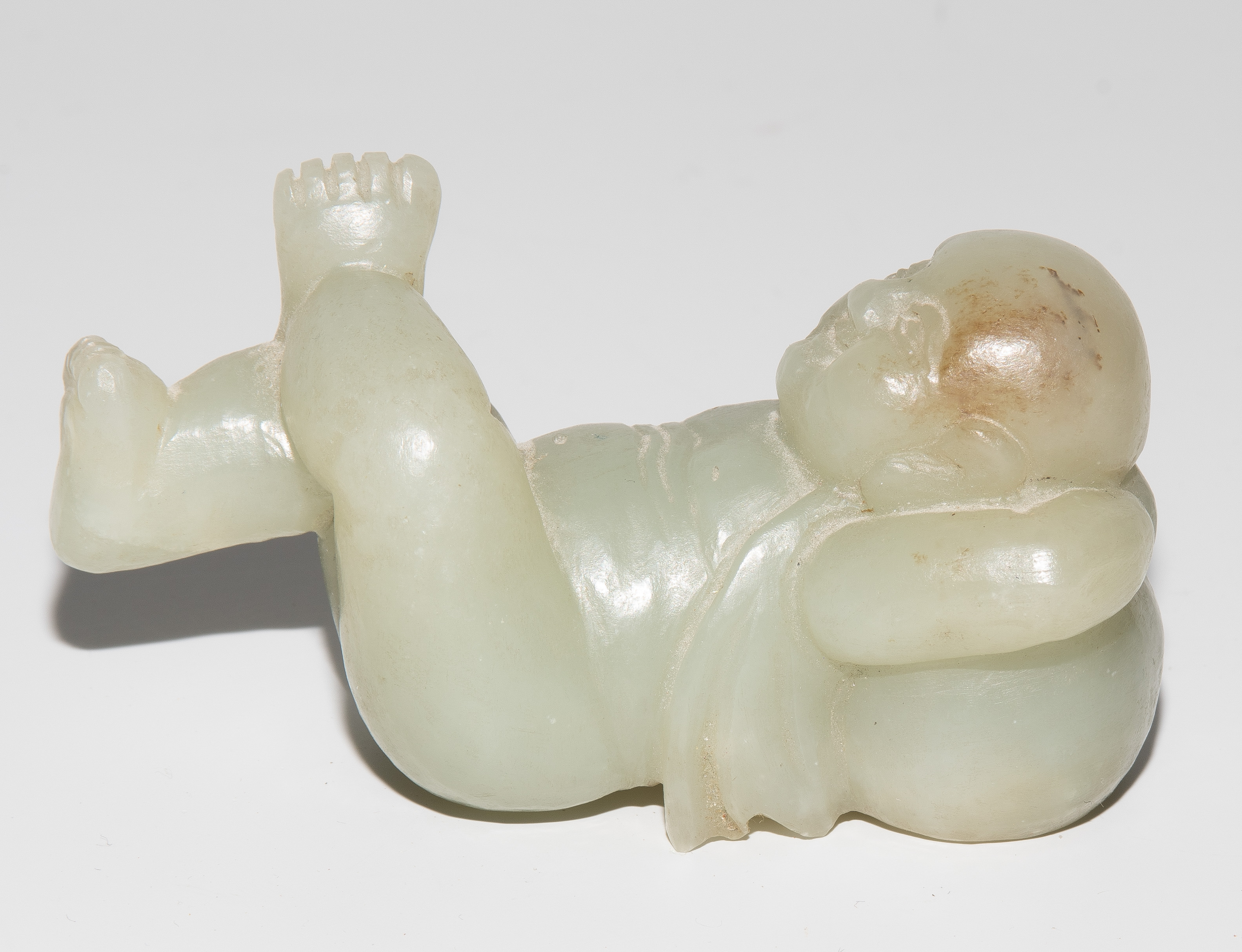 China, 20.Jh. Jade mit braunem Einschluss. Auf dem Rücken liegendes Kind. L 7,5 cm. - Fehlstelle.
