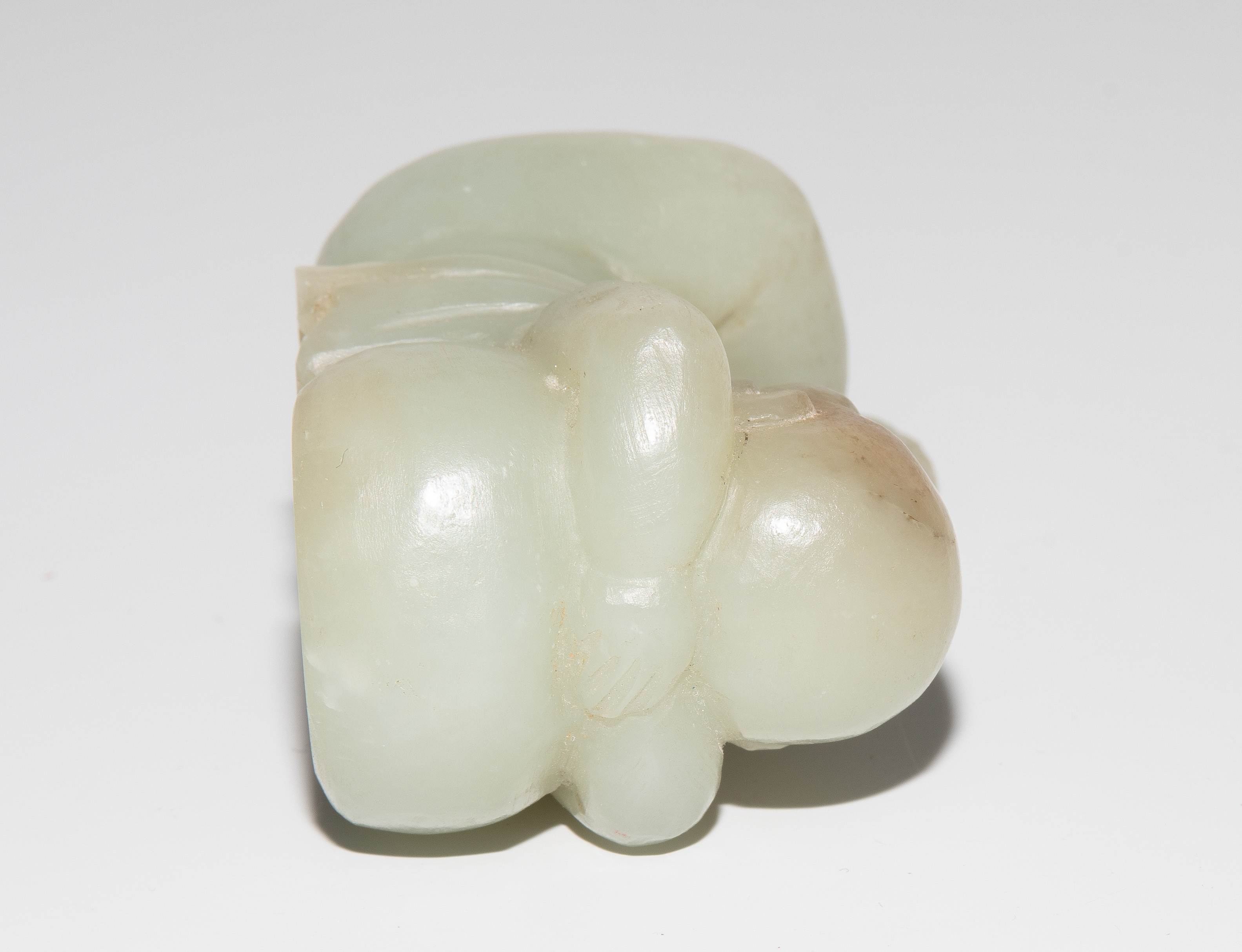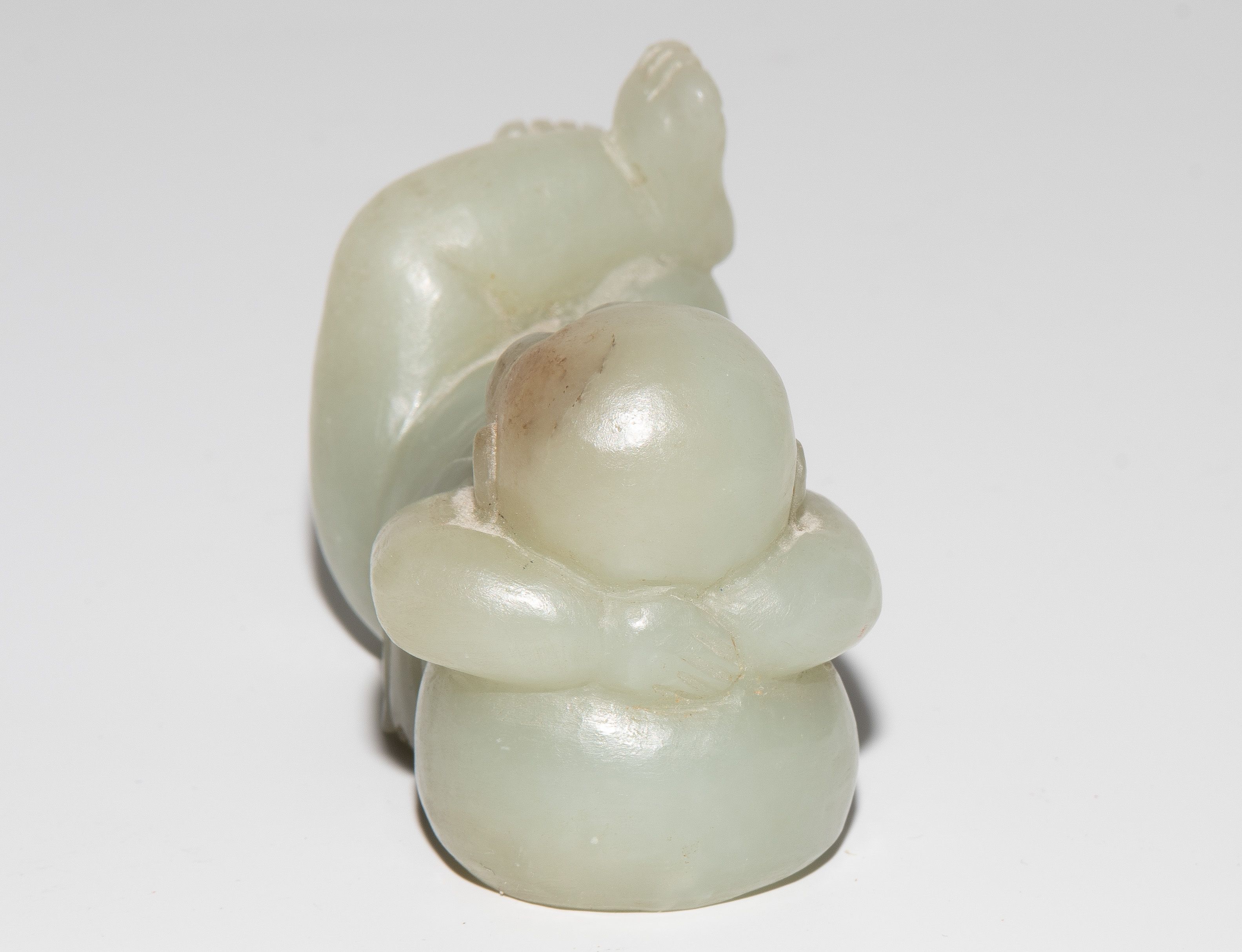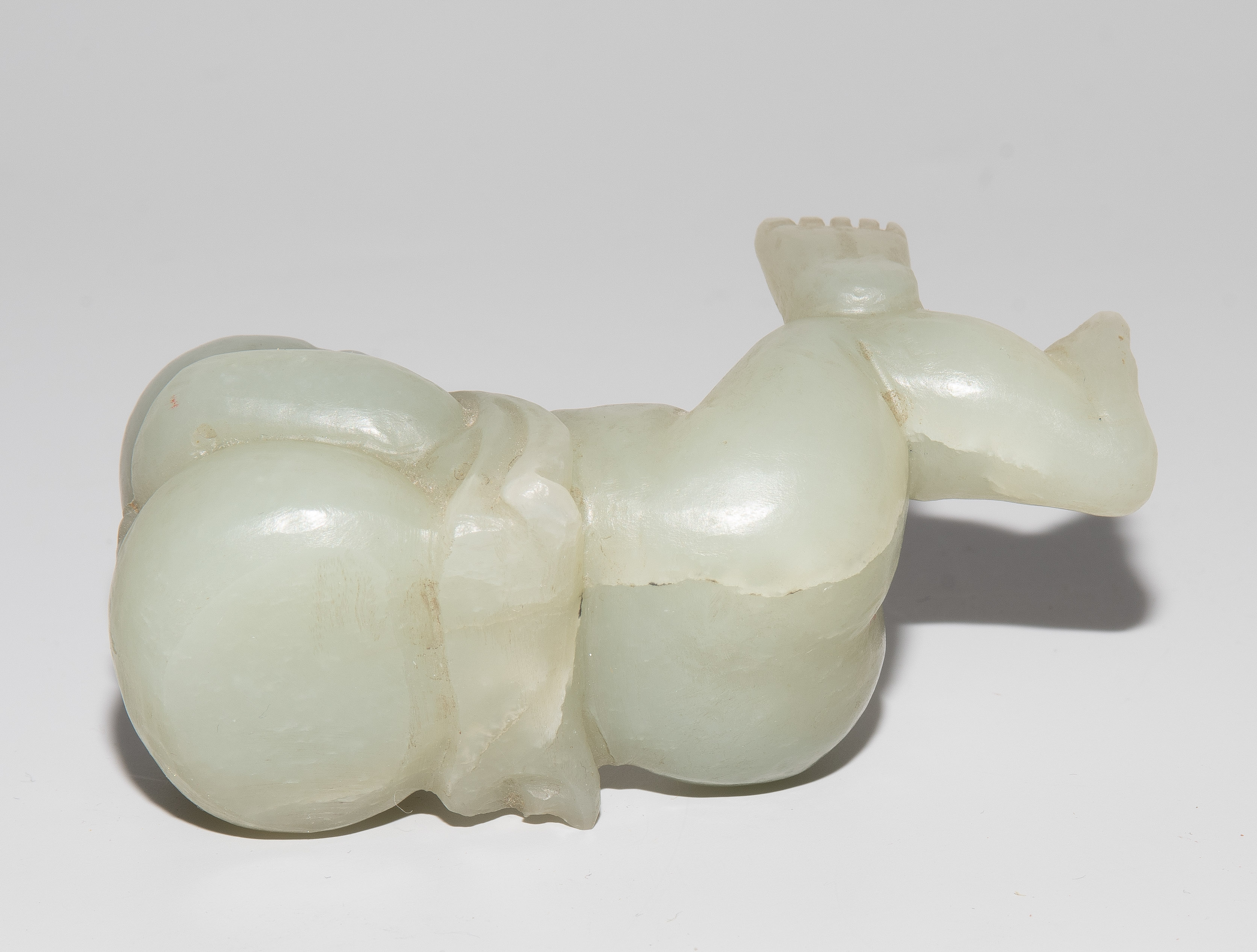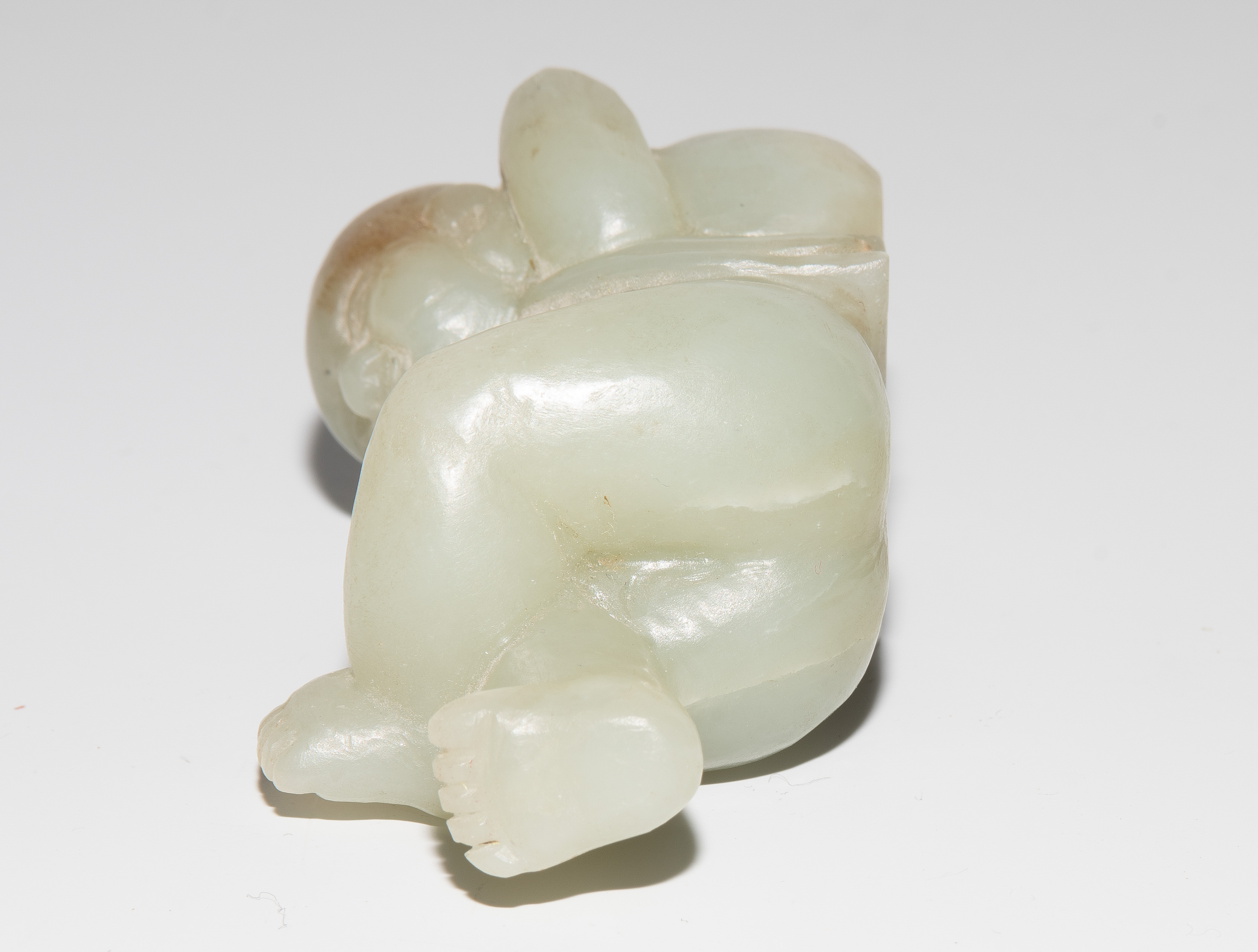 China, 20.Jh. Jade mit braunem Einschluss. Auf dem Rücken liegendes Kind. L 7,5 cm. - Fehlstelle.