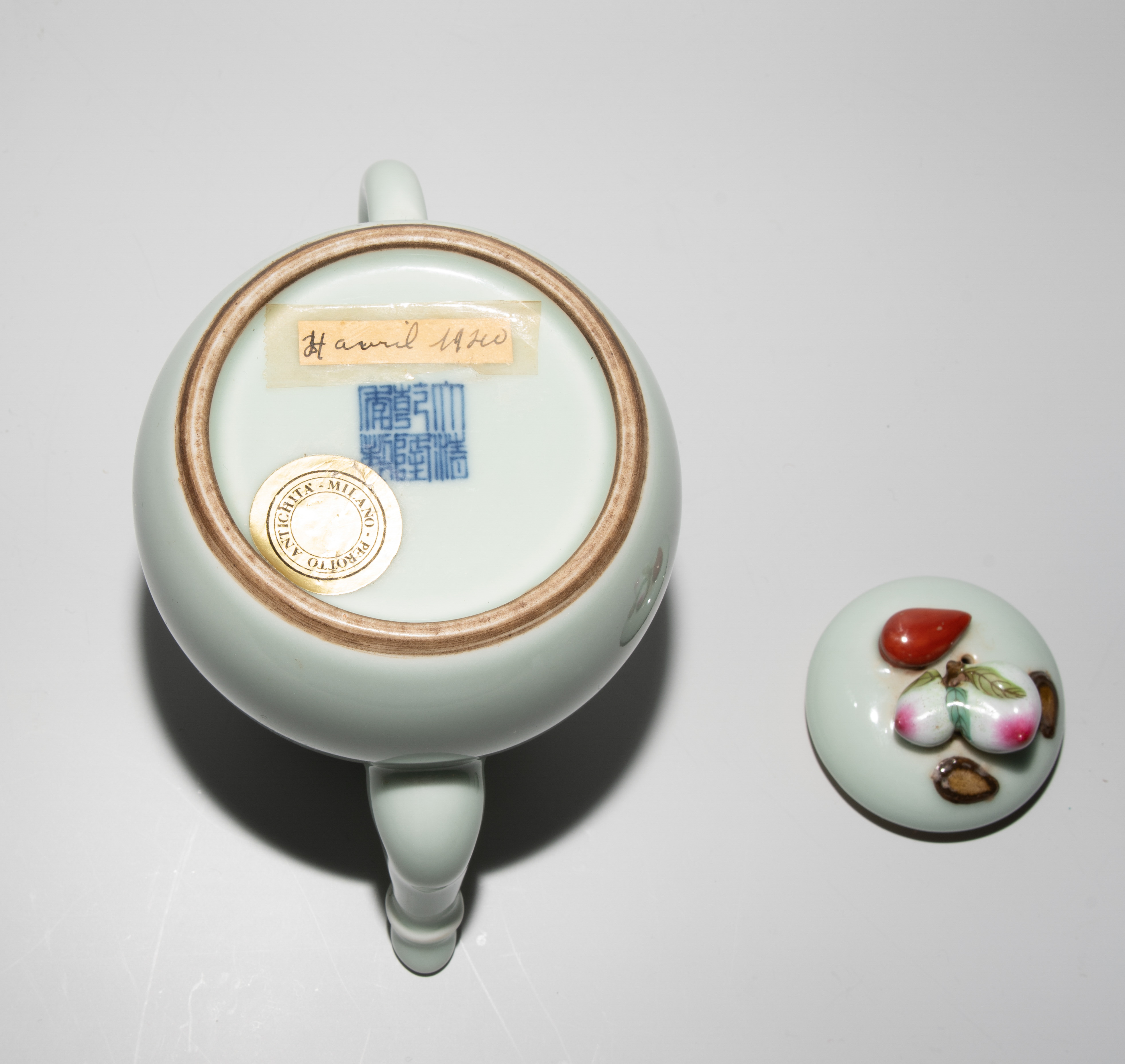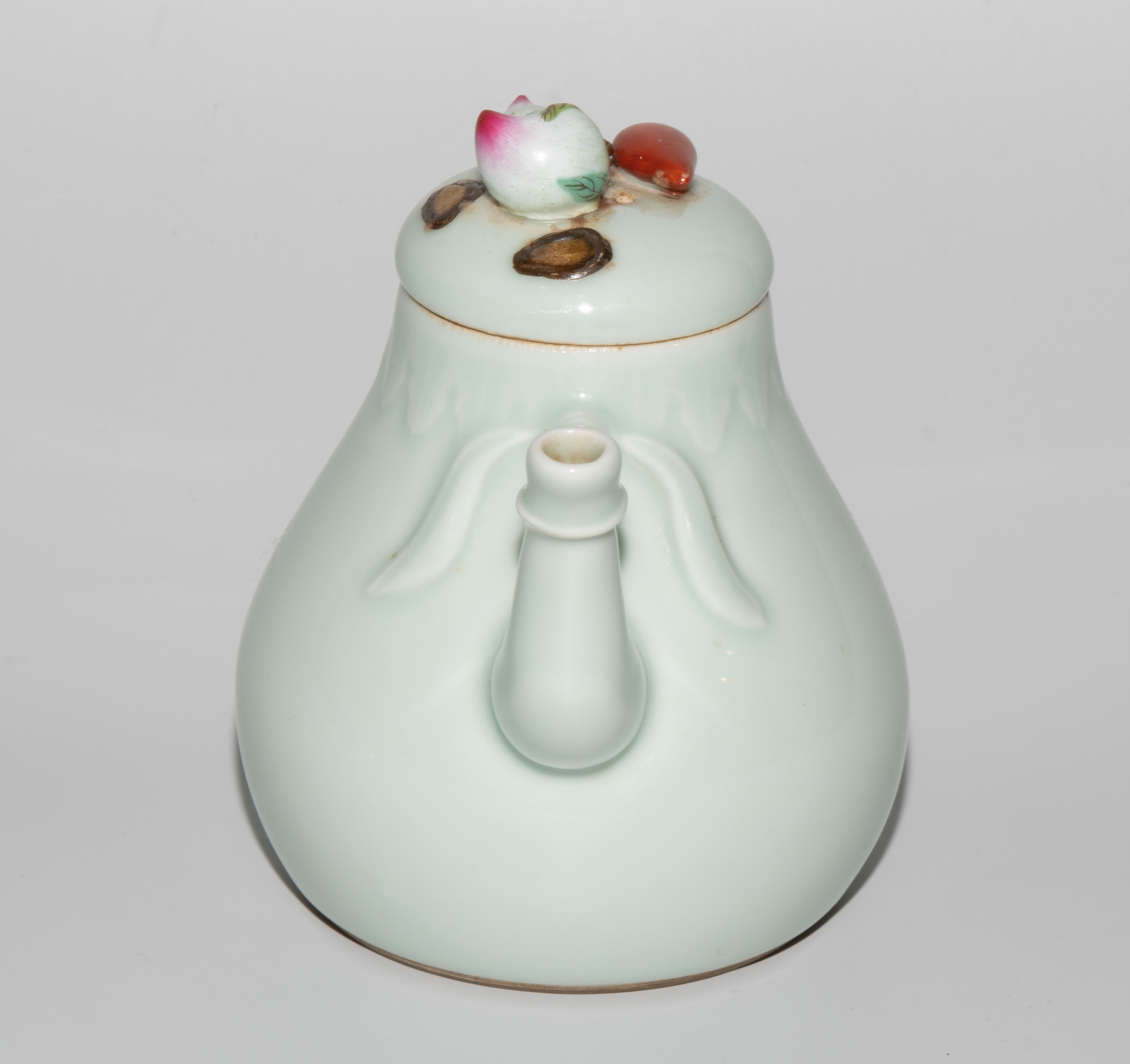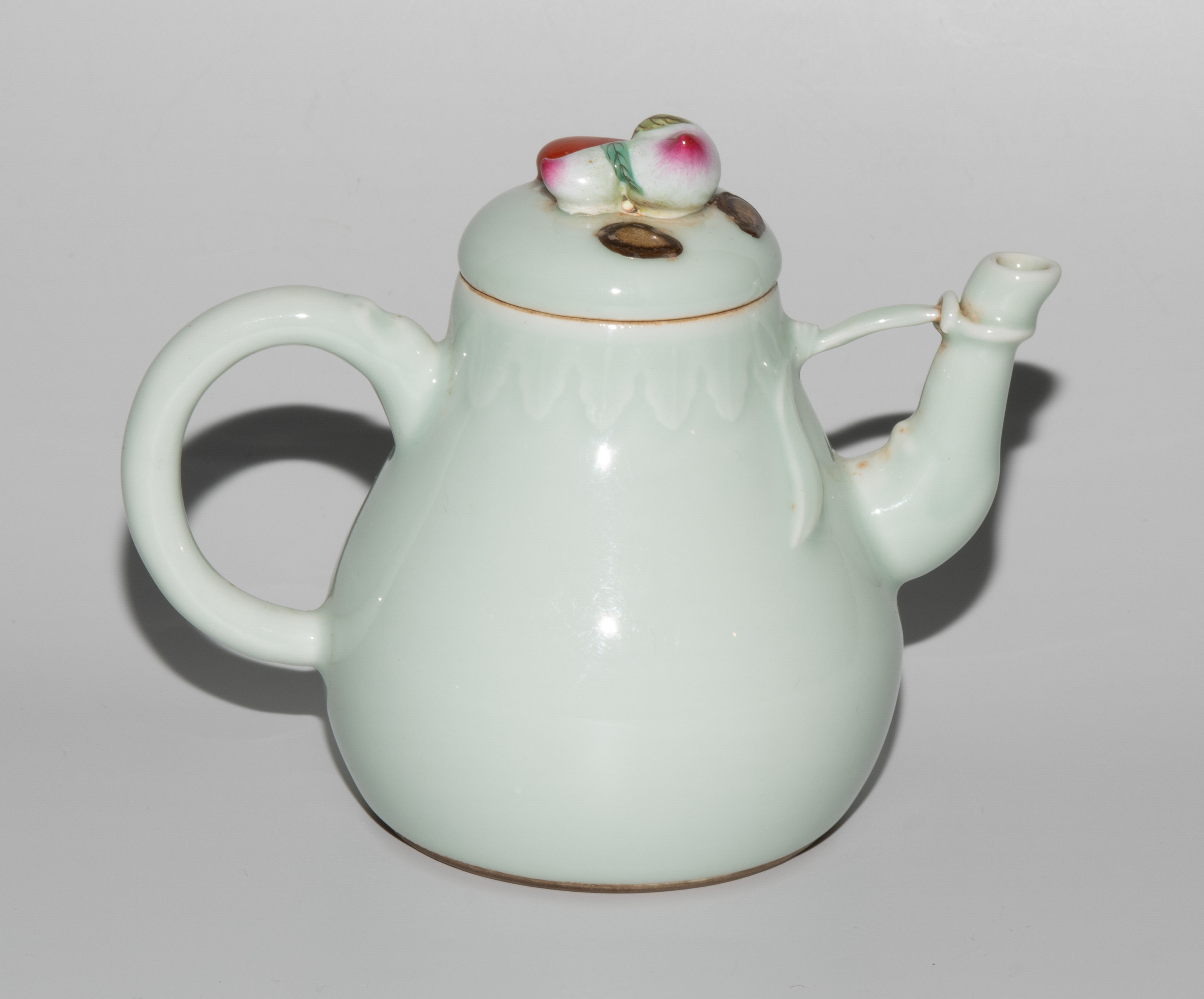 China, 19./20.Jh. Porzellan mit Celadonglasur. Unterglasurblaue Qianlong-Marke. Bauchige Form mit reliefiertem Pfirsich-Knauf, polychrom bemalt. H 12,5 cm.