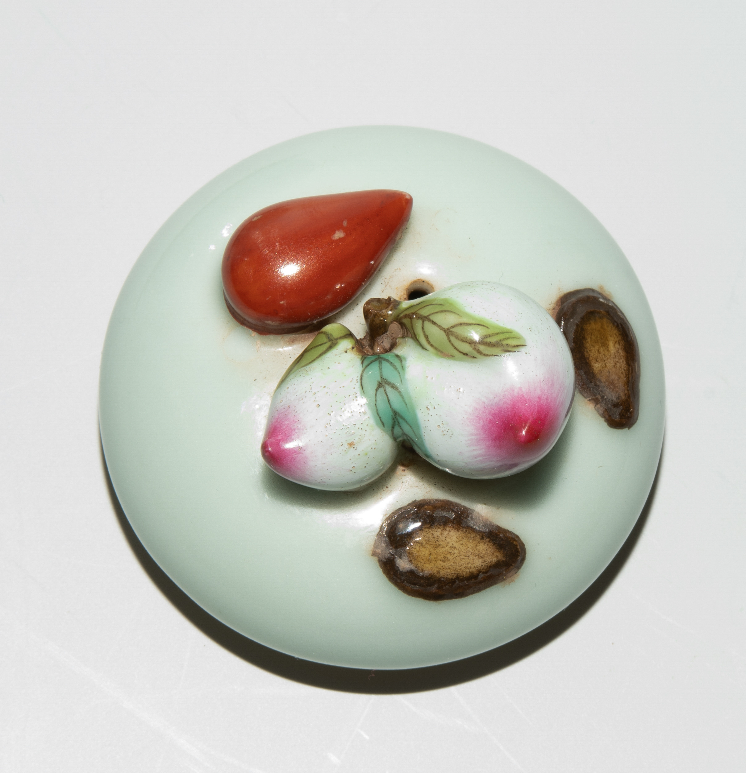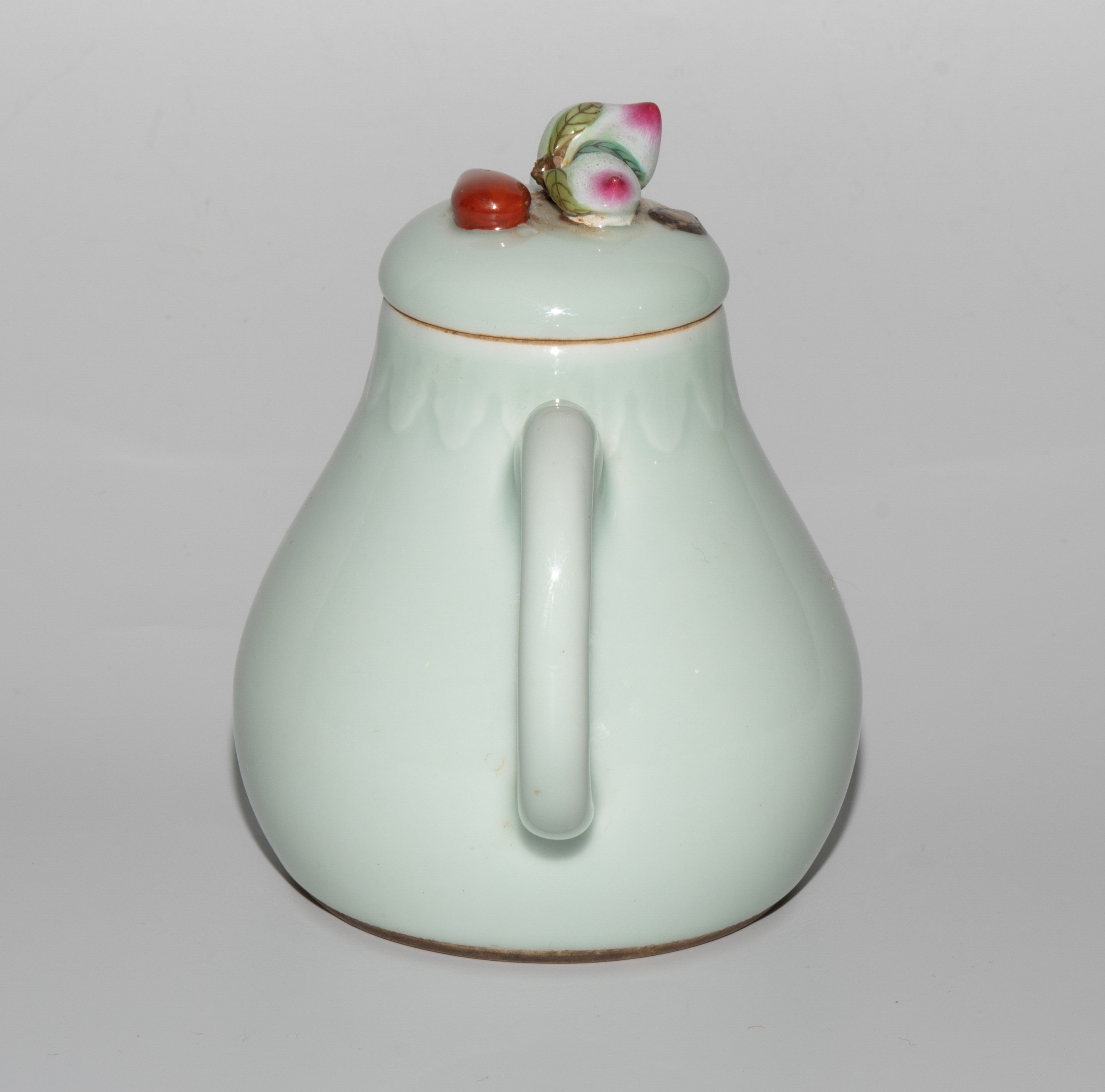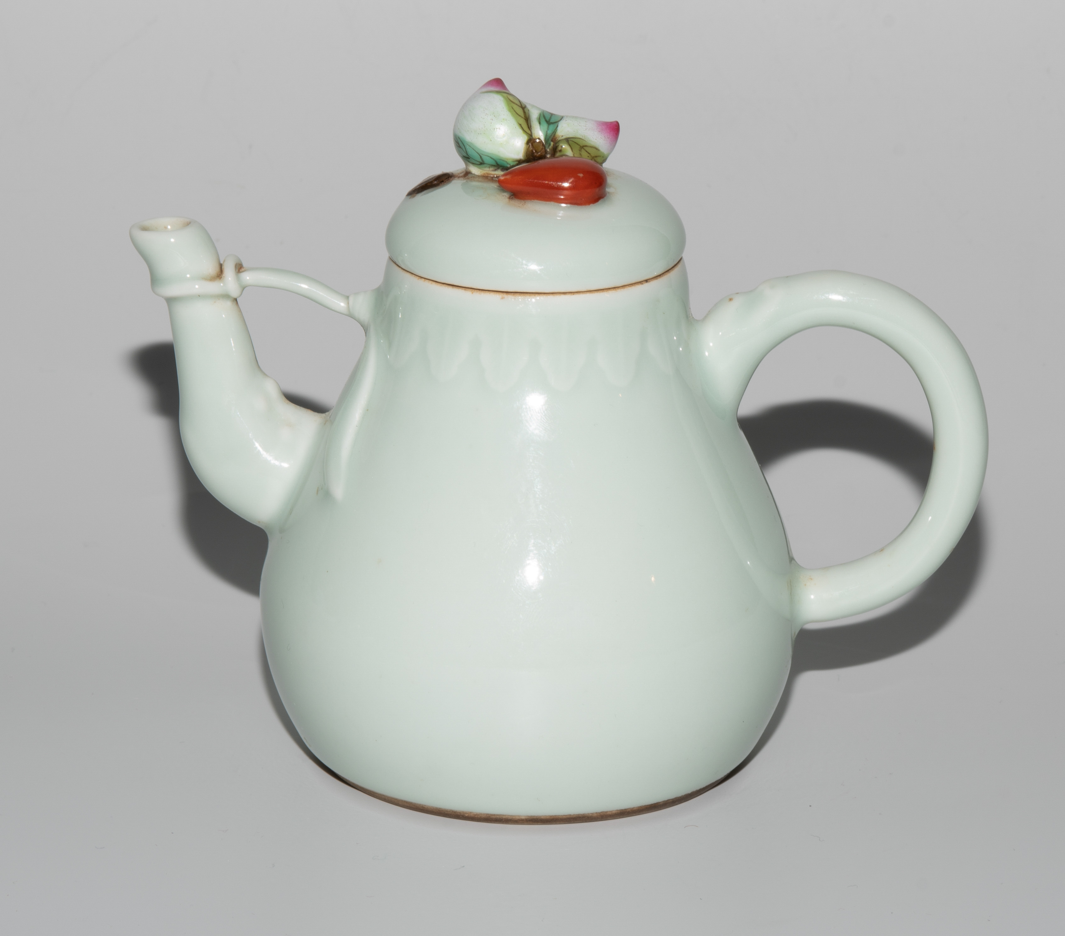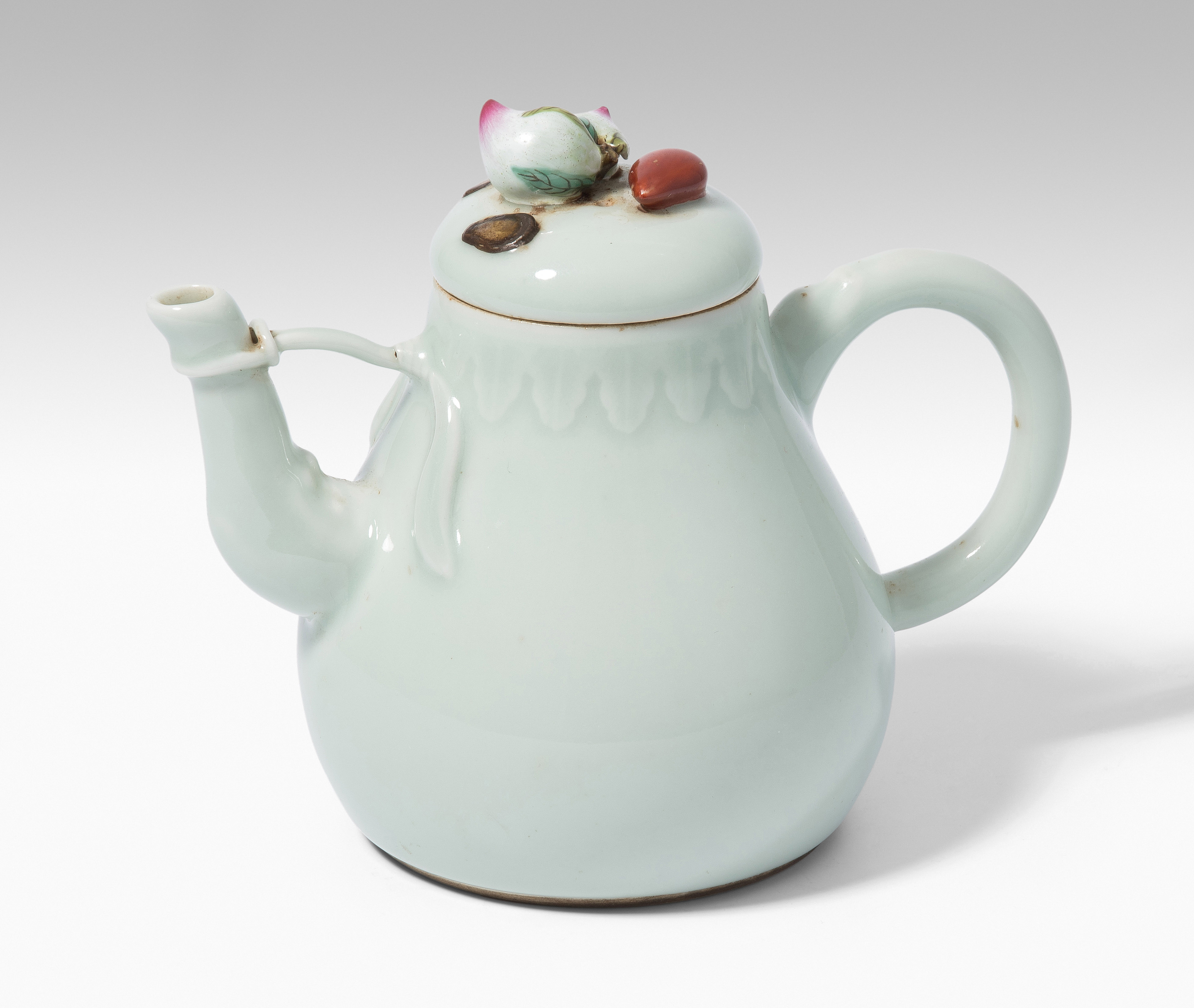 China, 19./20.Jh. Porzellan mit Celadonglasur. Unterglasurblaue Qianlong-Marke. Bauchige Form mit reliefiertem Pfirsich-Knauf, polychrom bemalt. H 12,5 cm.