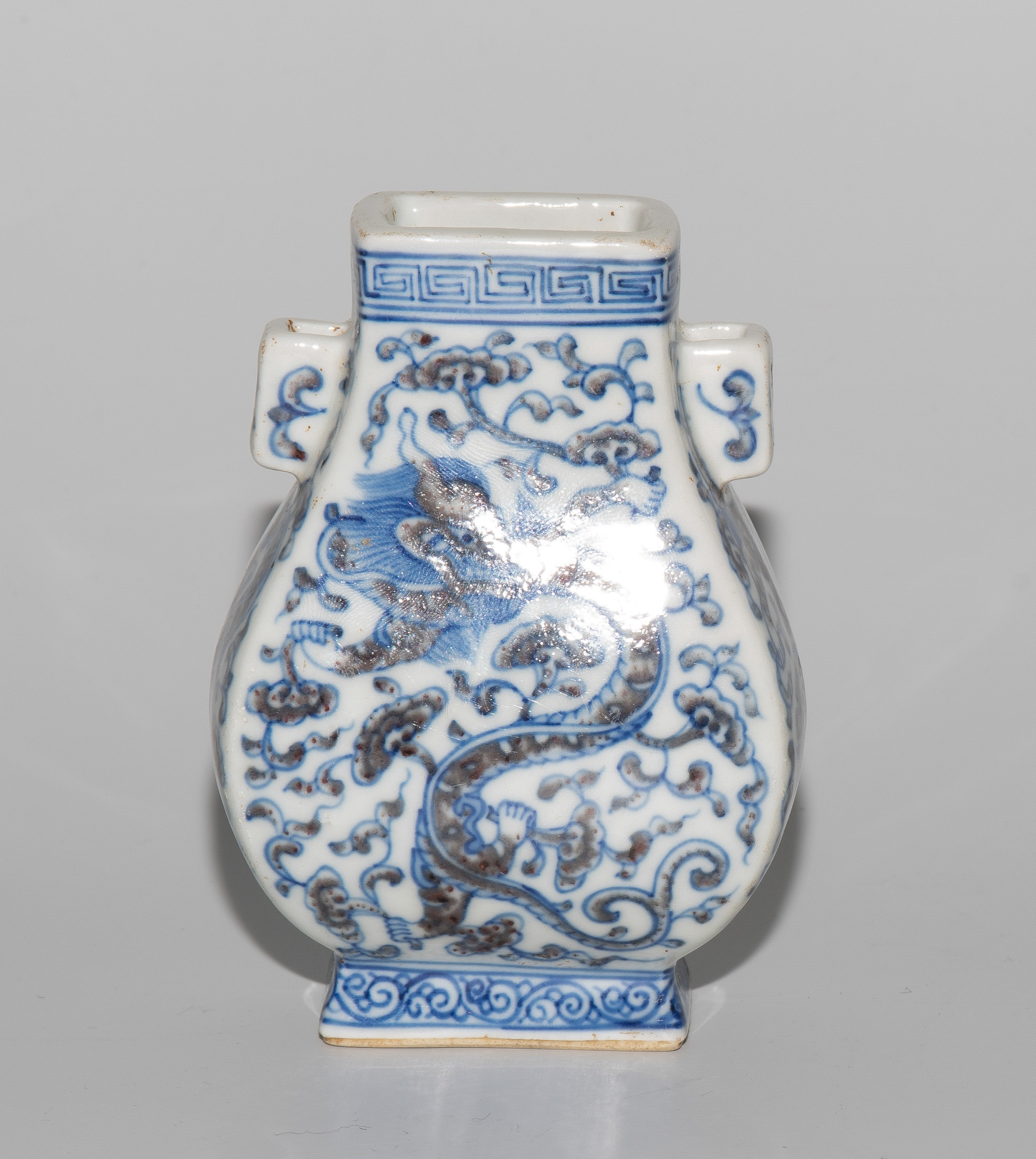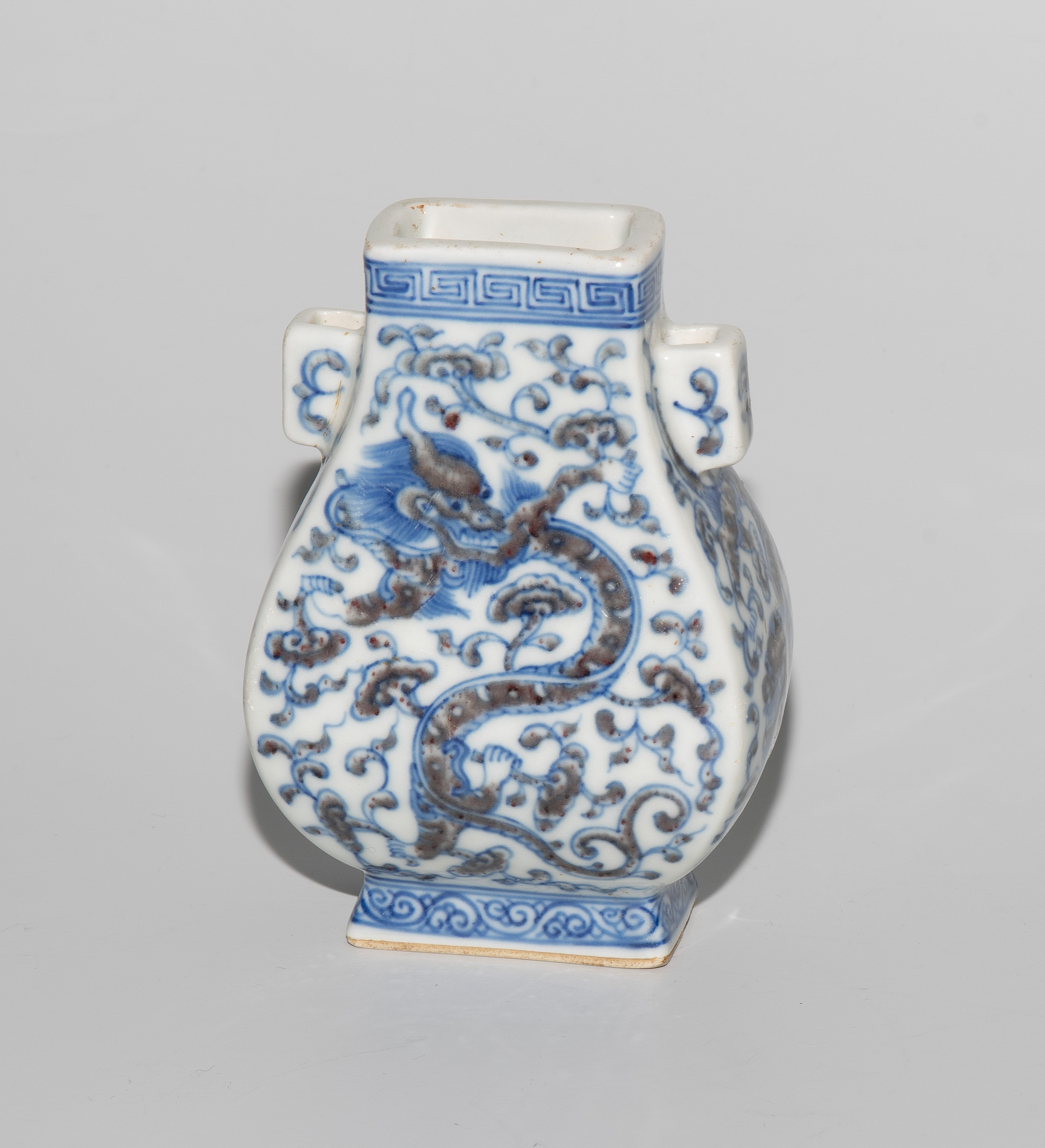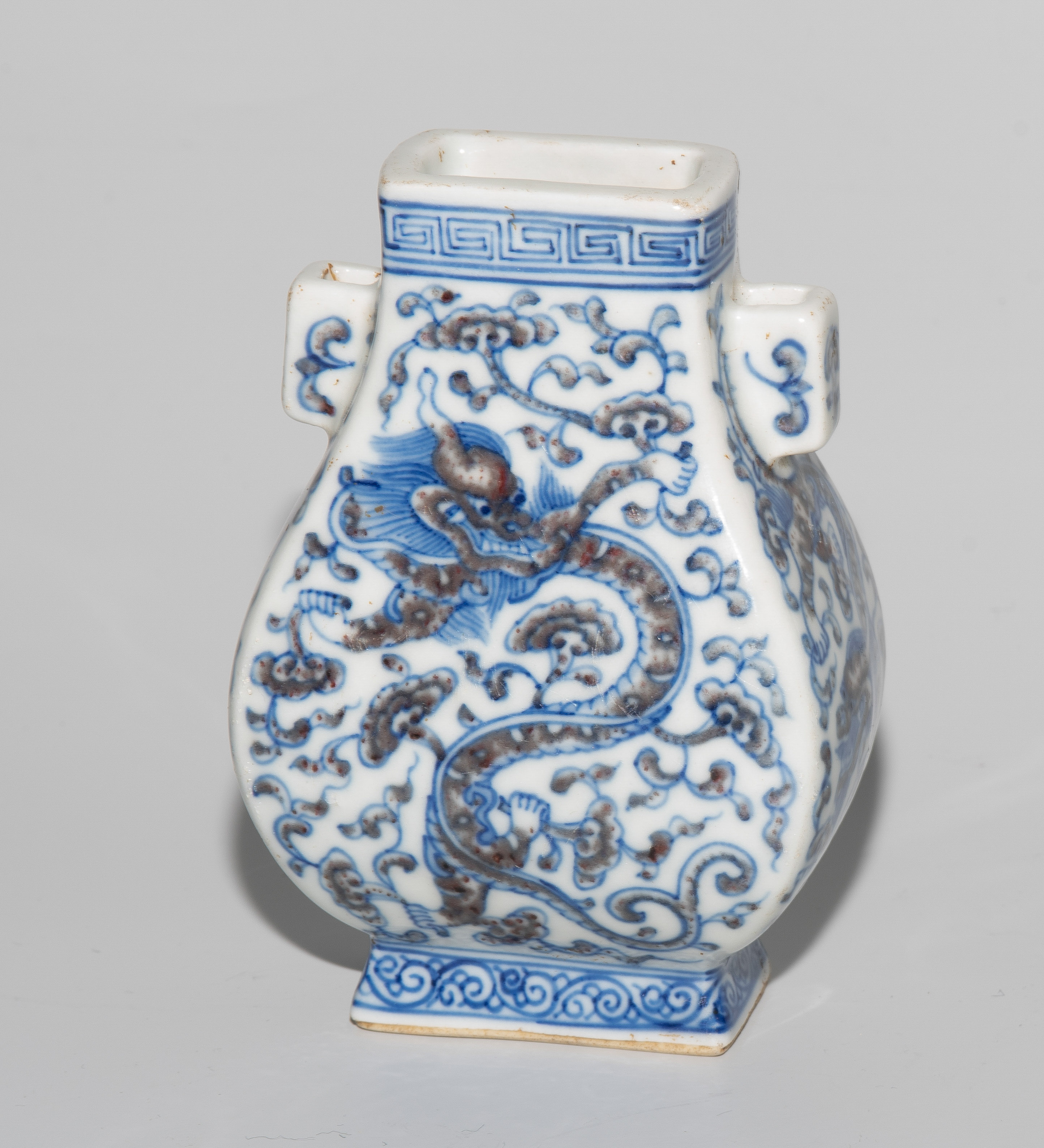 China, Anfang 20.Jh. Porzellan. Unterglasurblaue Qianlong-Marke. Unterglasurblau und -rot verzierter Drachendekor. H 9,5 cm.
