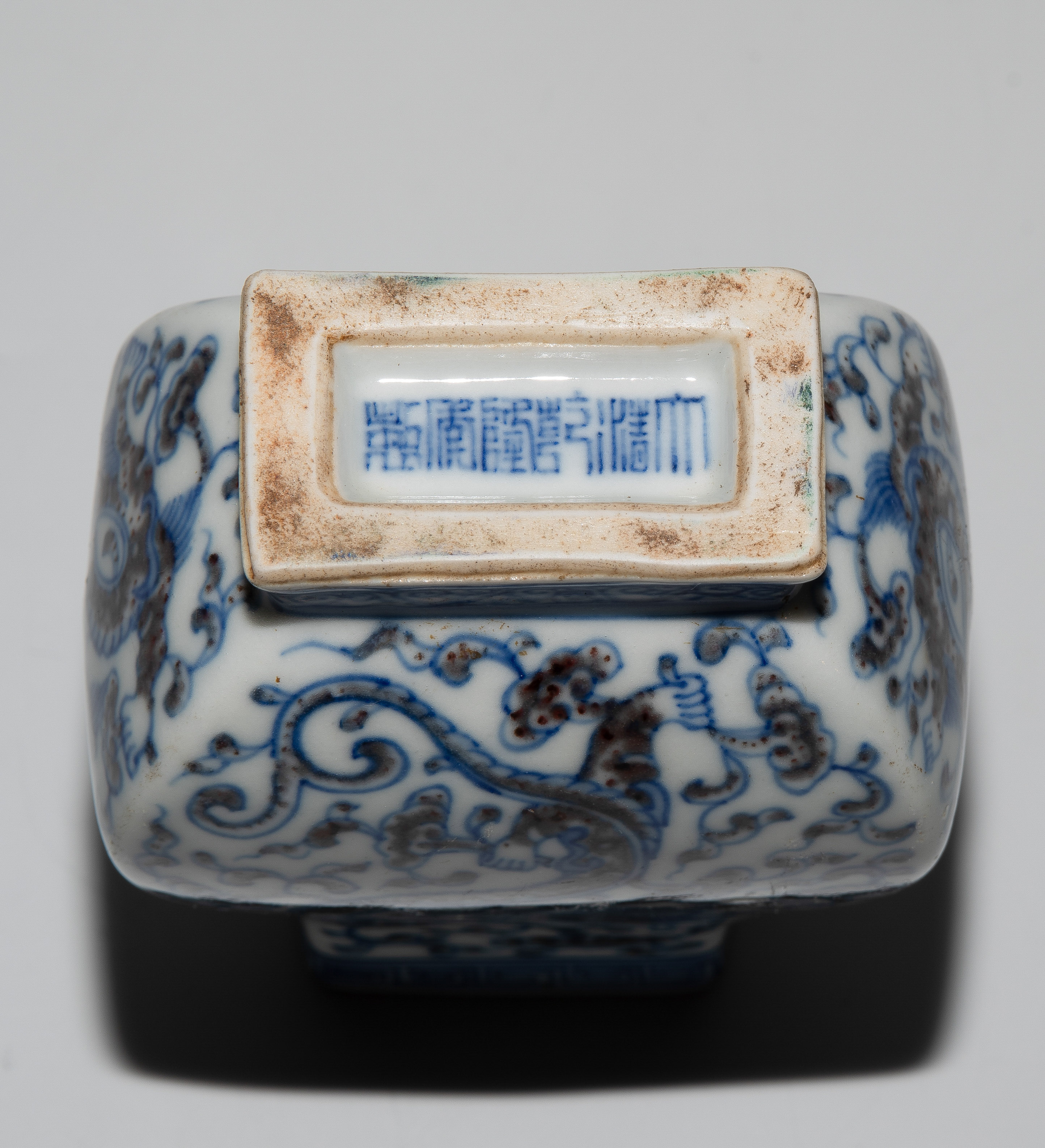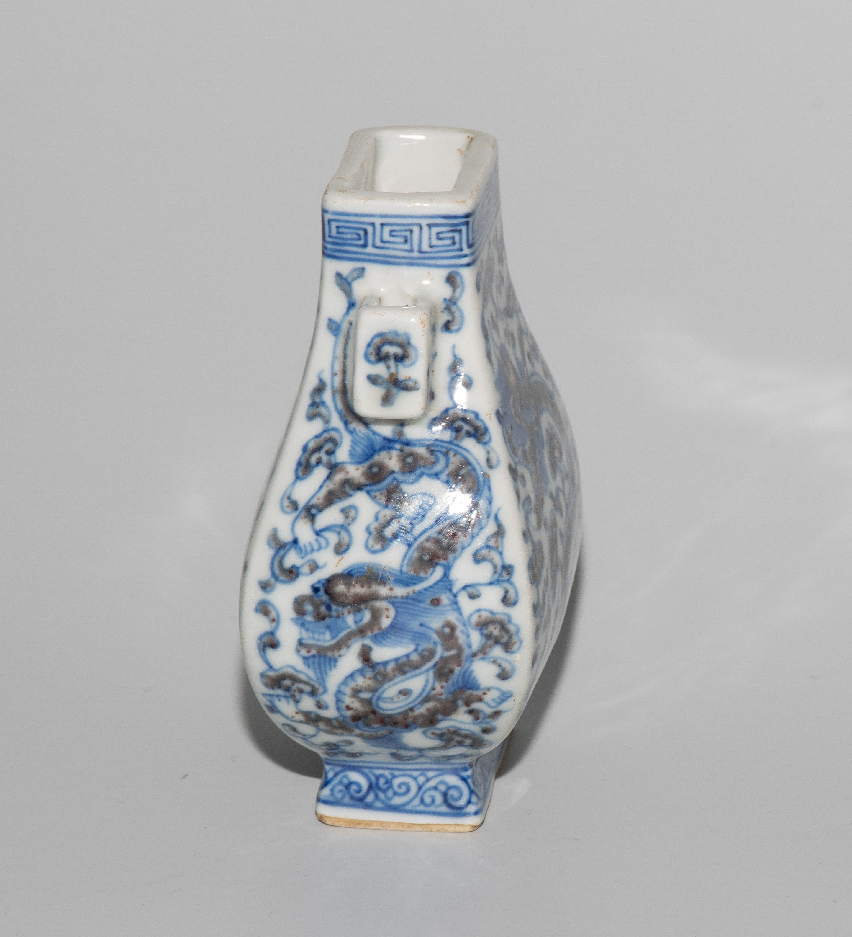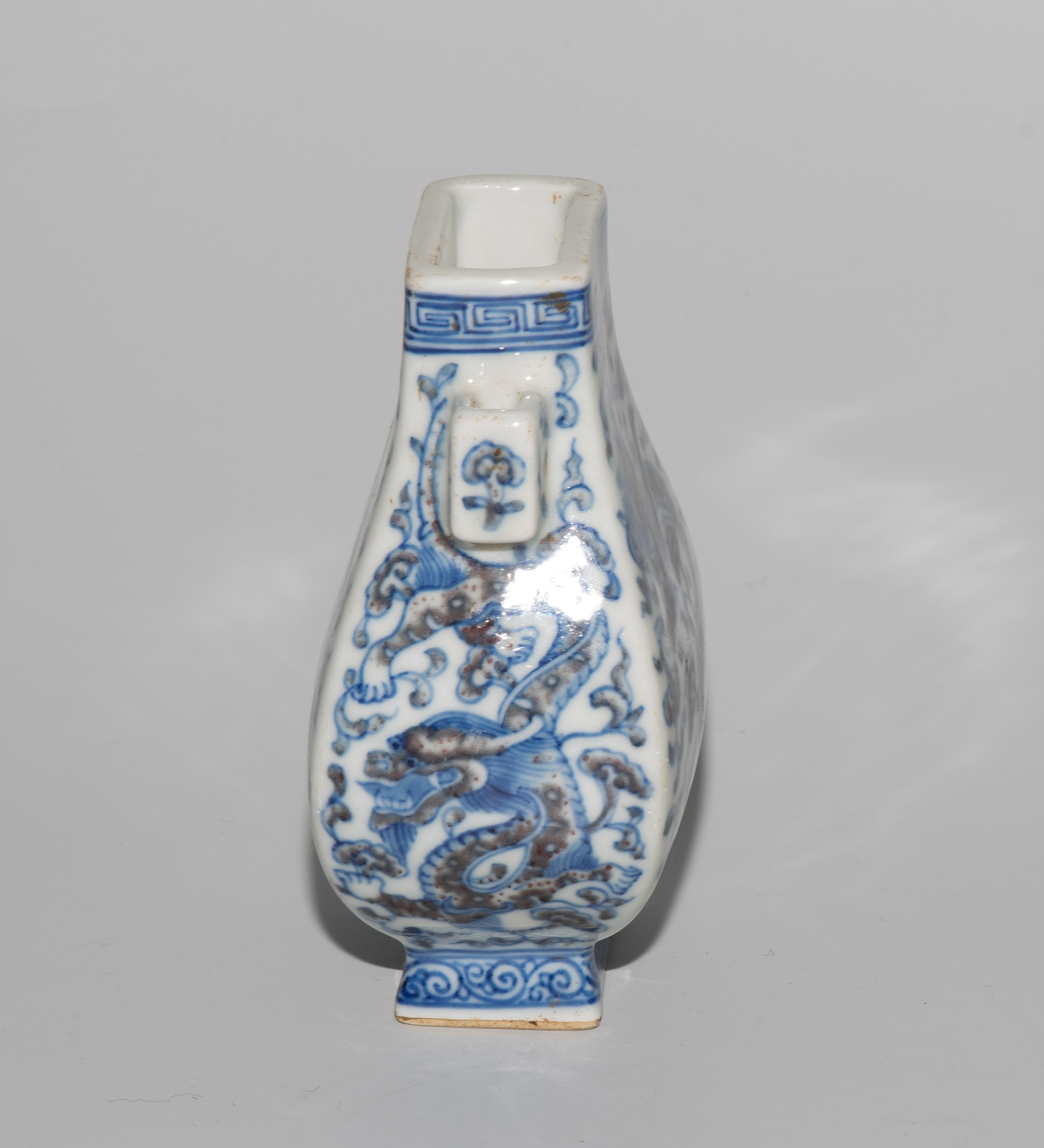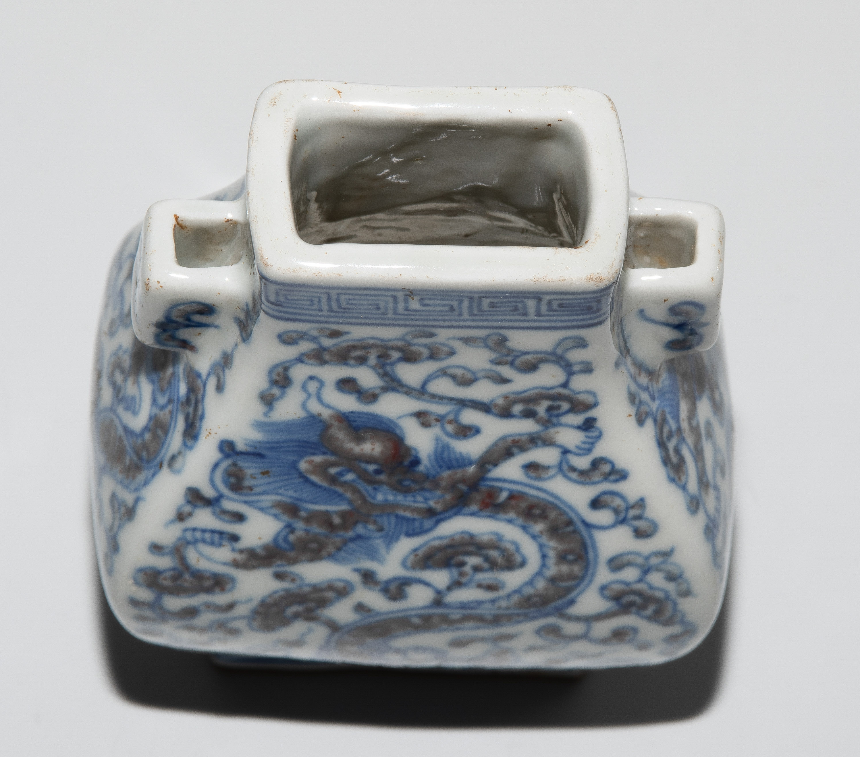 China, Anfang 20.Jh. Porzellan. Unterglasurblaue Qianlong-Marke. Unterglasurblau und -rot verzierter Drachendekor. H 9,5 cm.