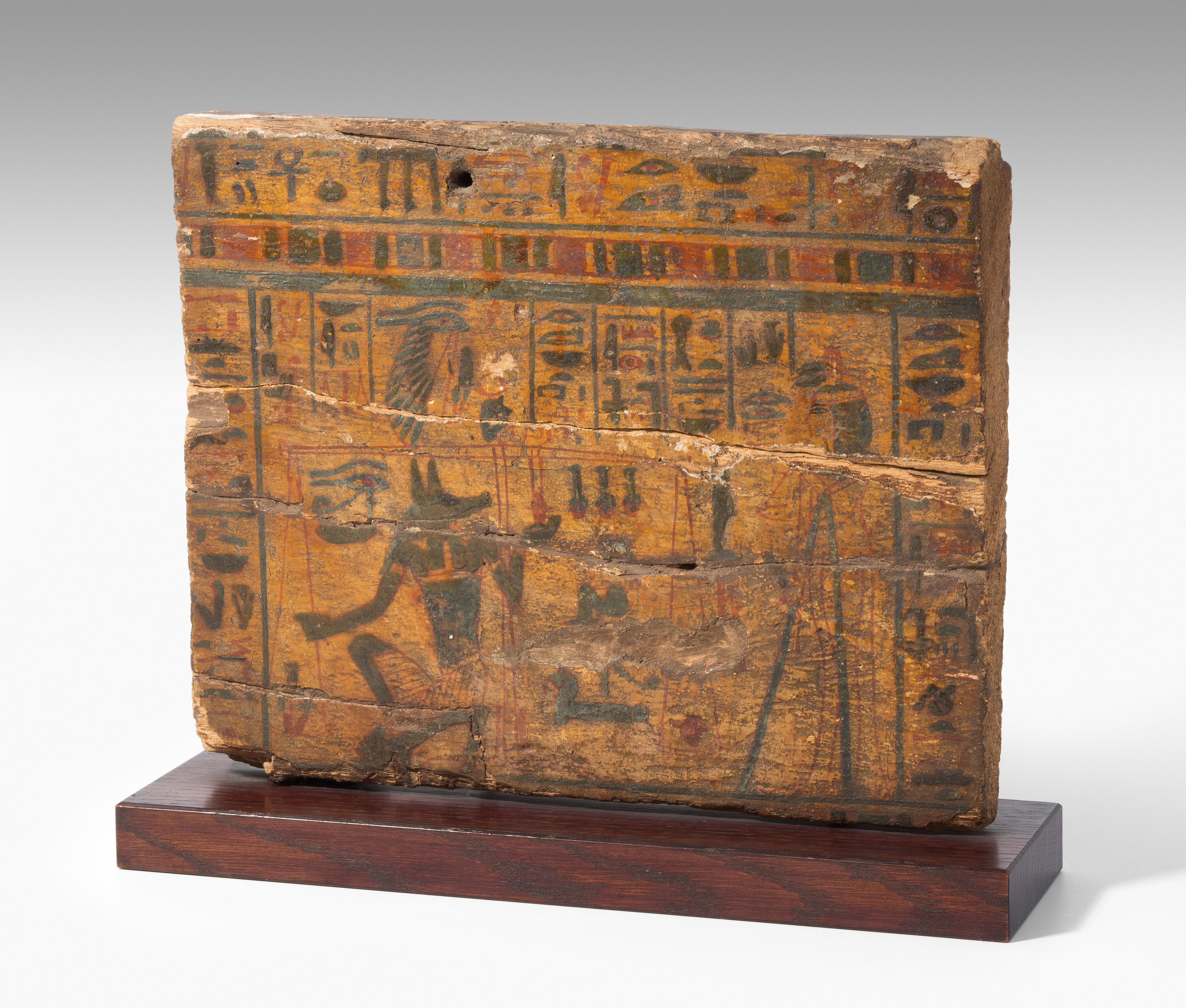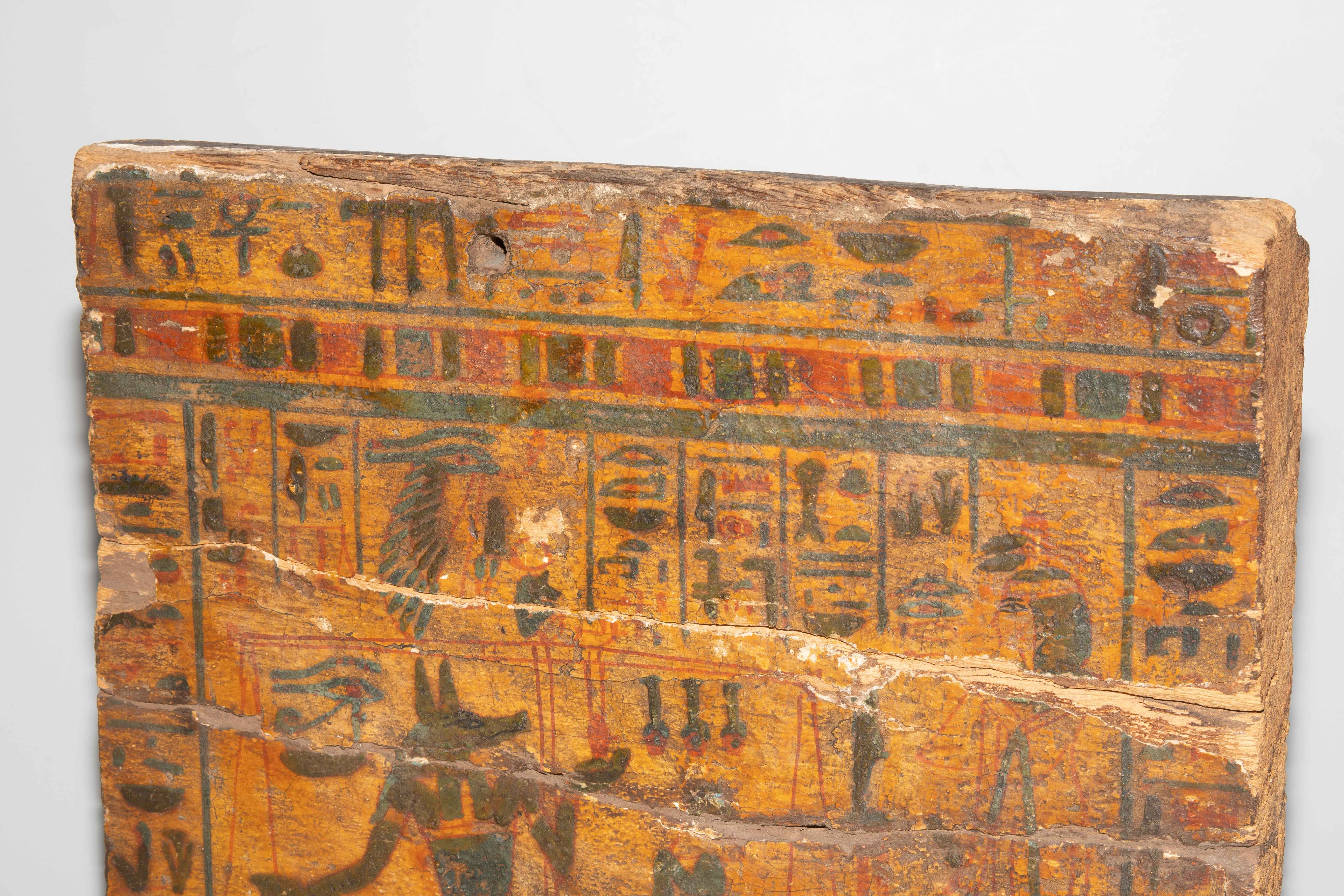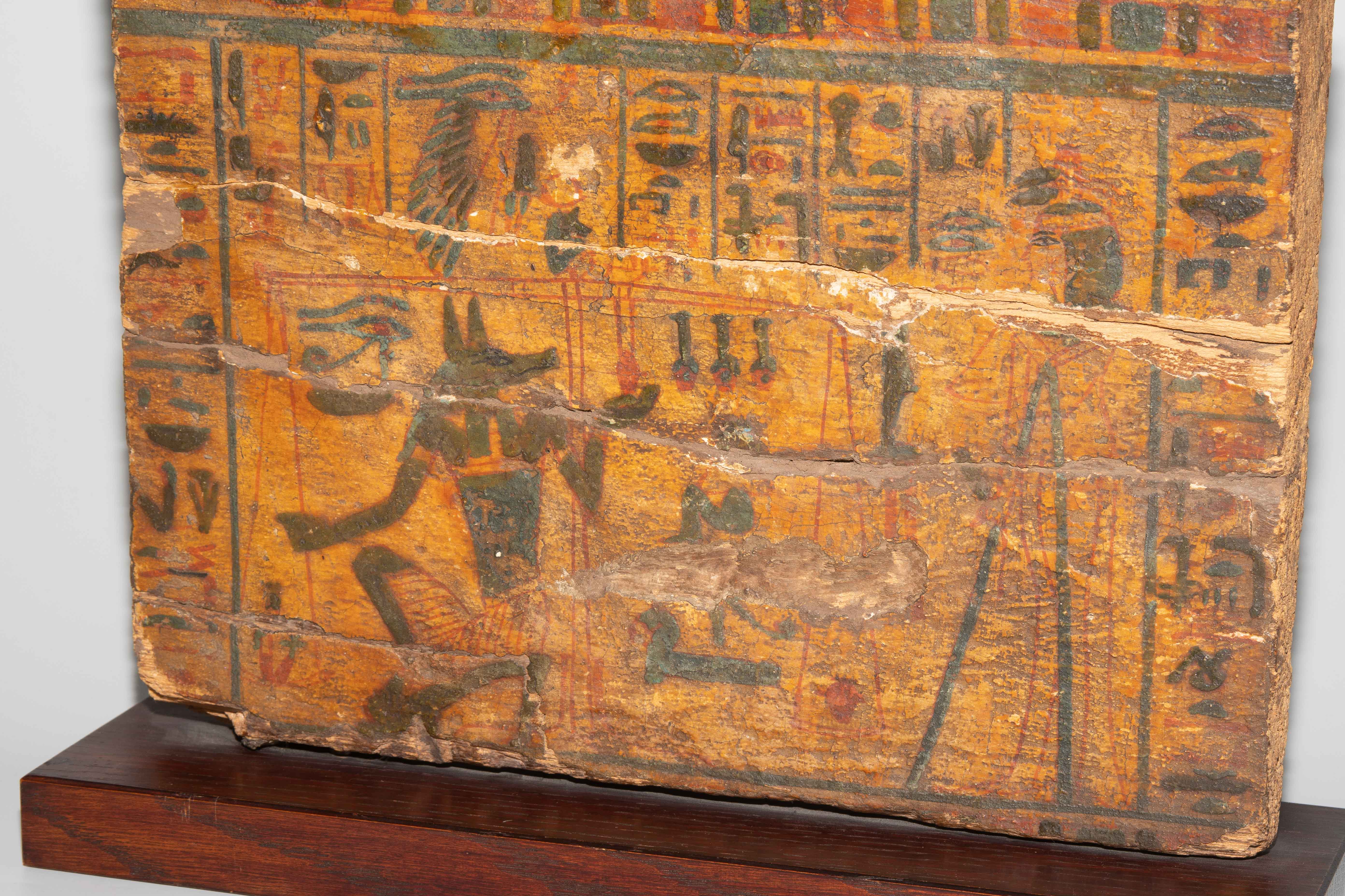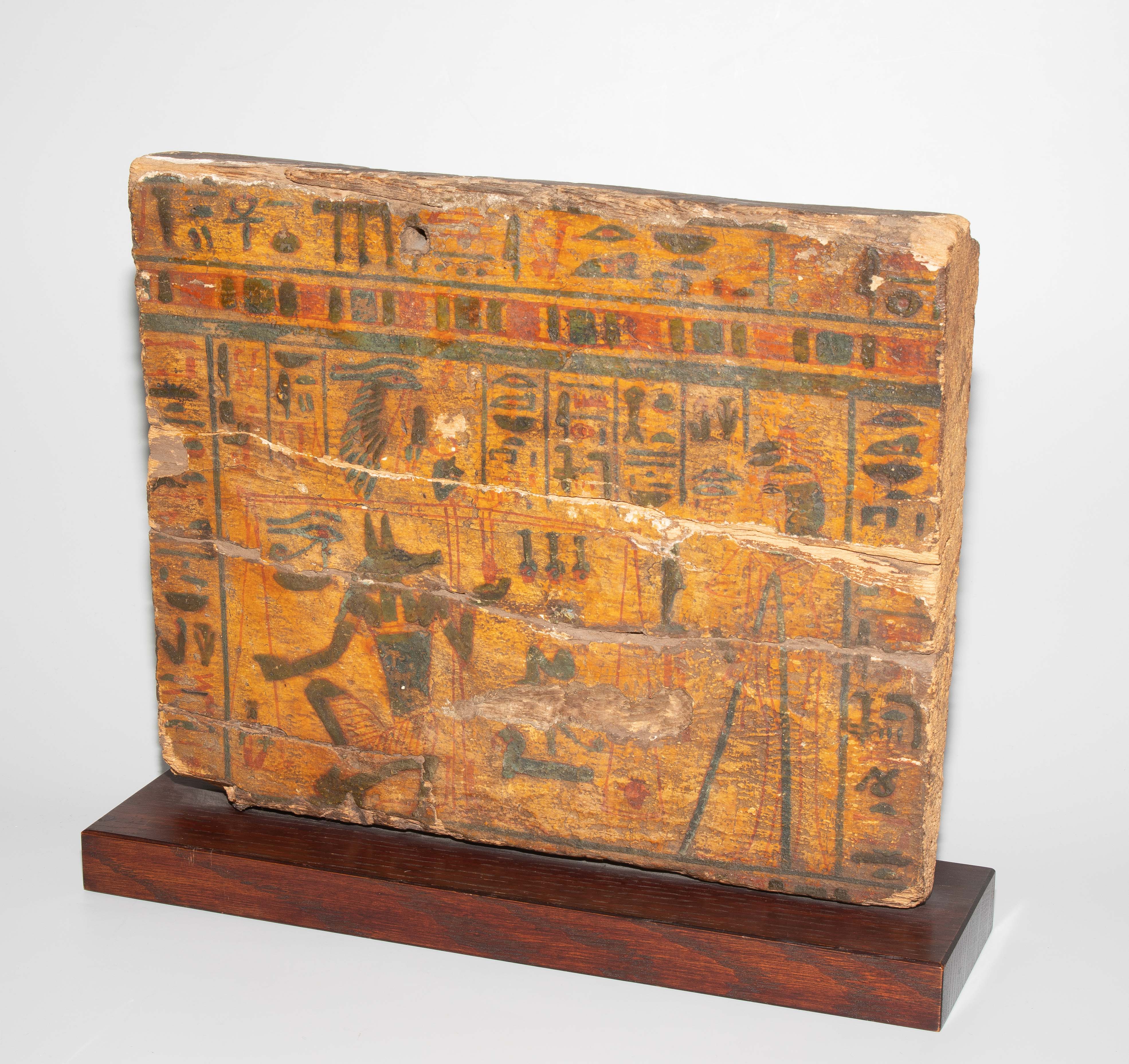 Ägypten, 3. Zwischenzeit, 21. Dynastie. Holz mit Stuckauflage und Bemalung. Wohl Seitenwand eines Sarkophags mit polychromer Darstellung aus dem Buch der Toten: Anubis, kniend, wiegt das Herz der Verstorbenen, die an seiner Seite steht. Umlaufende Inschrift: "Der Osiris, die Hausfrau und Sängerin des Amun Re, König der Götter, Hut-ta-neb, selig". 29x23 cm. Auf Holzsockel montiert. - An mehreren Stellen gebrochen und repariert.
