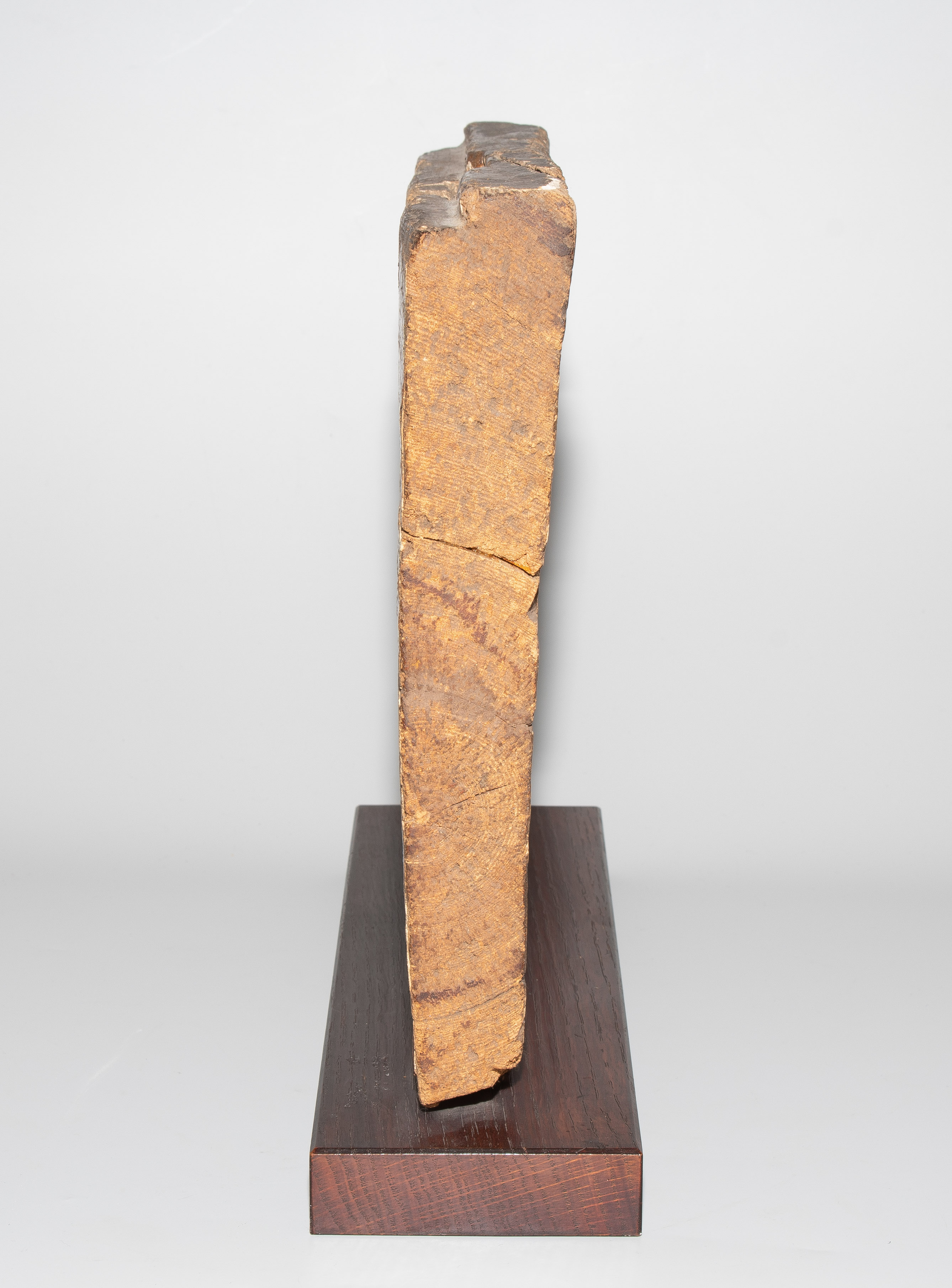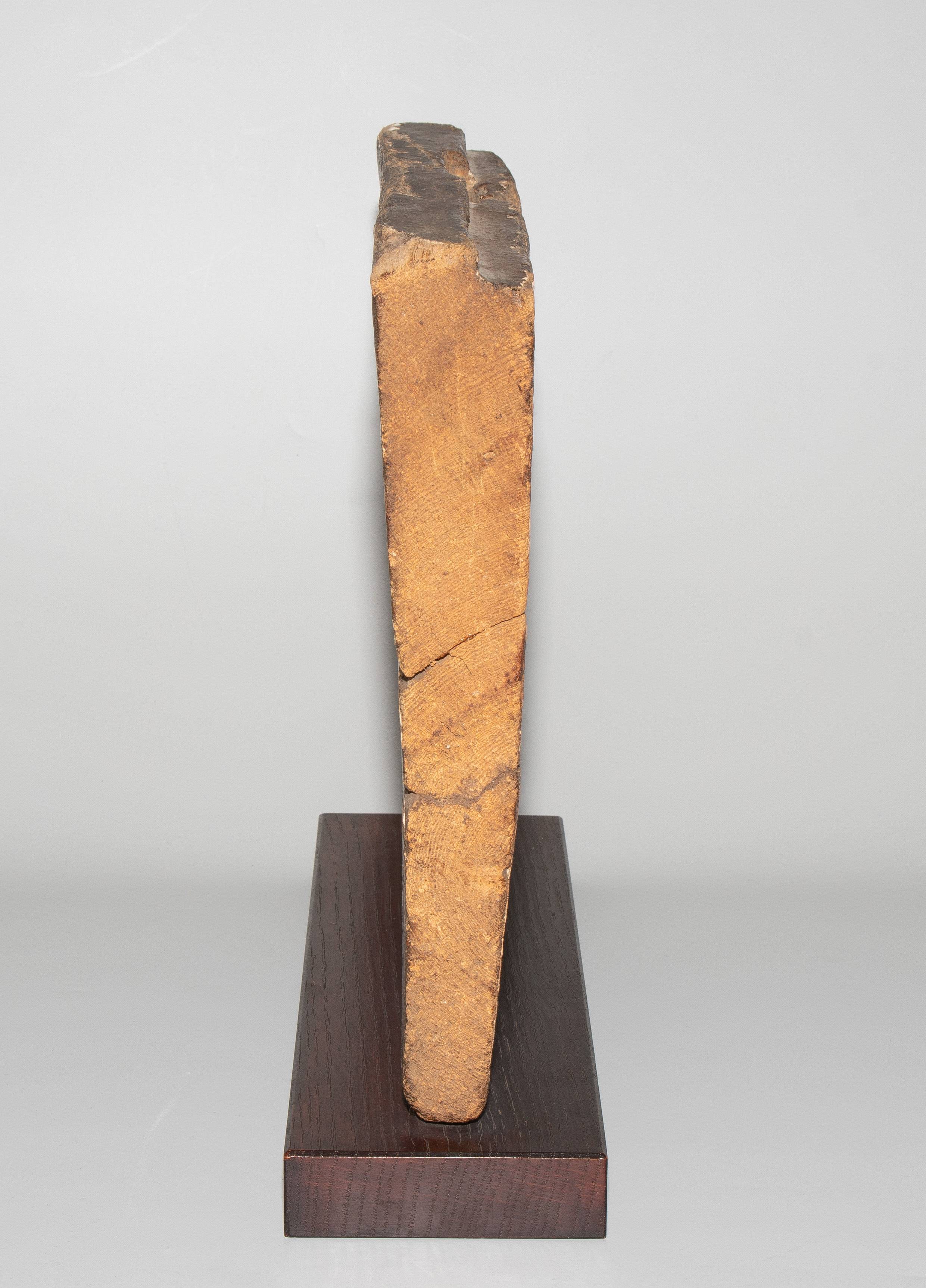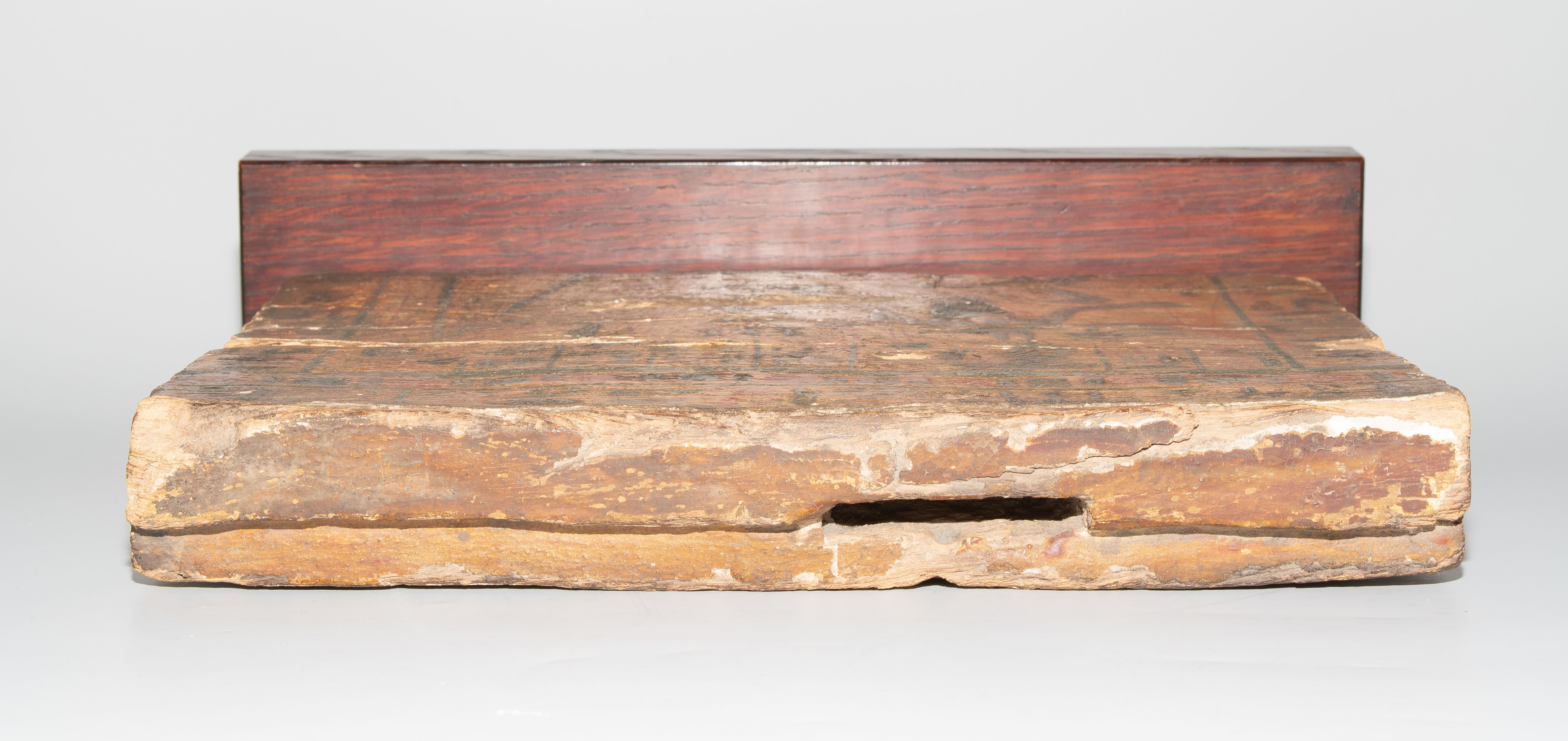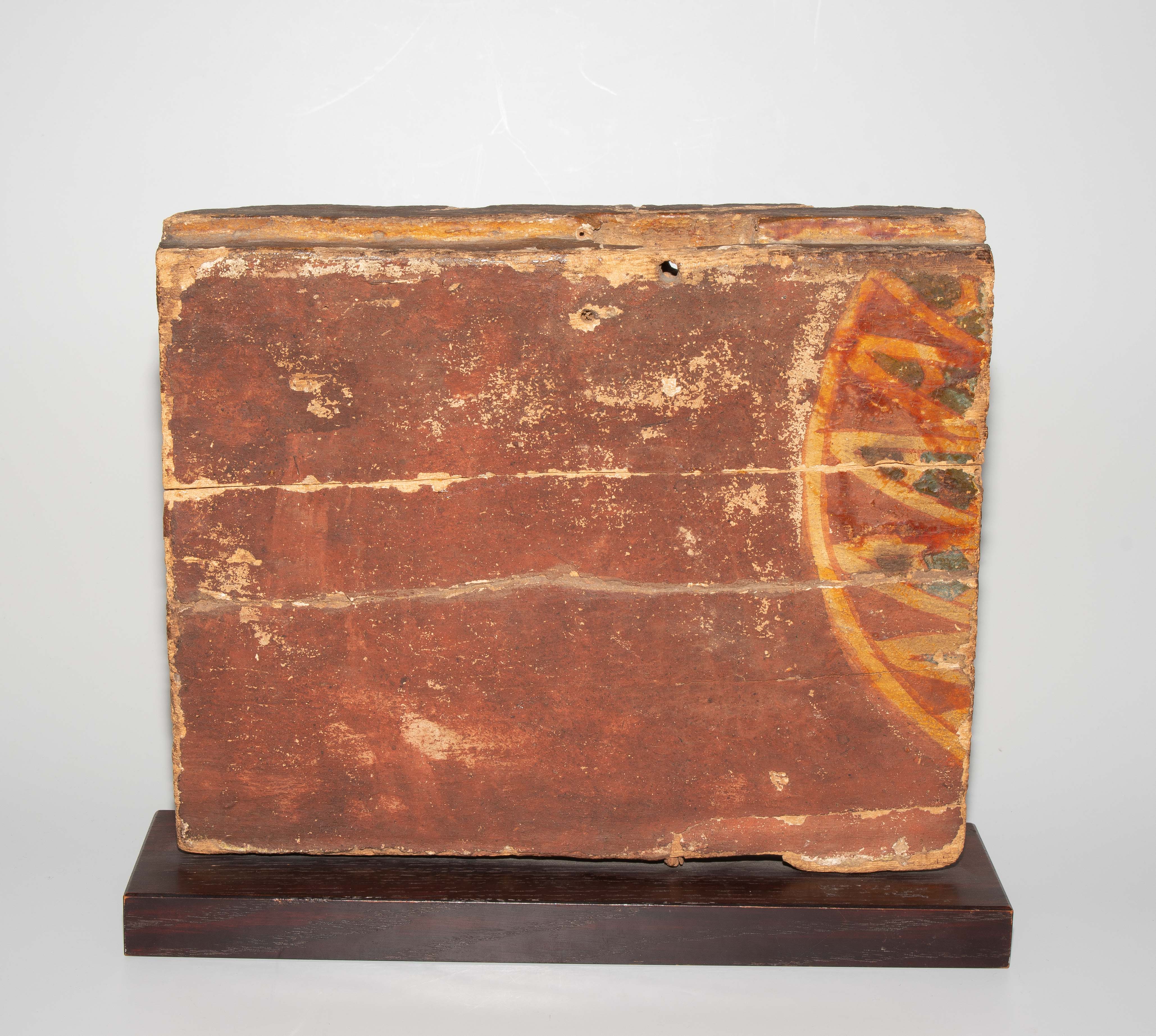 Ägypten, 3. Zwischenzeit, 21. Dynastie. Holz mit Stuckauflage und Bemalung. Wohl Seitenwand eines Sarkophags mit polychromer Darstellung aus dem Buch der Toten: Anubis, kniend, wiegt das Herz der Verstorbenen, die an seiner Seite steht. Umlaufende Inschrift: "Der Osiris, die Hausfrau und Sängerin des Amun Re, König der Götter, Hut-ta-neb, selig". 29x23 cm. Auf Holzsockel montiert. - An mehreren Stellen gebrochen und repariert.