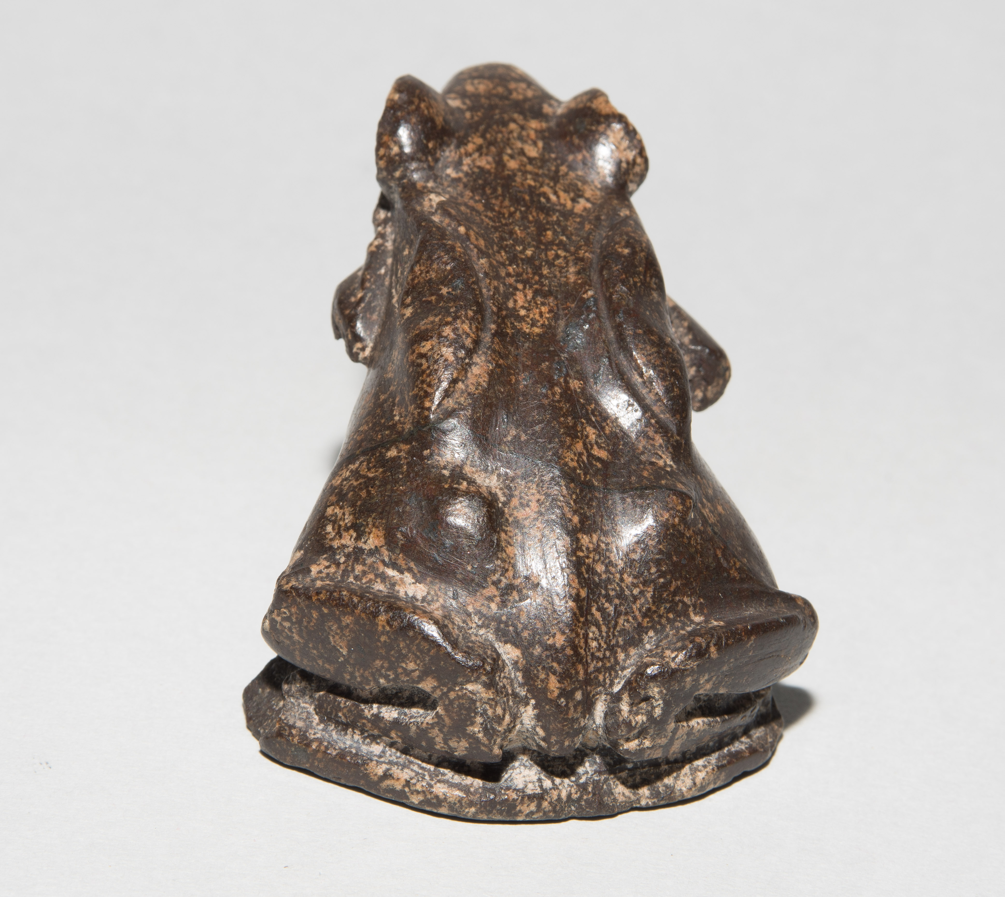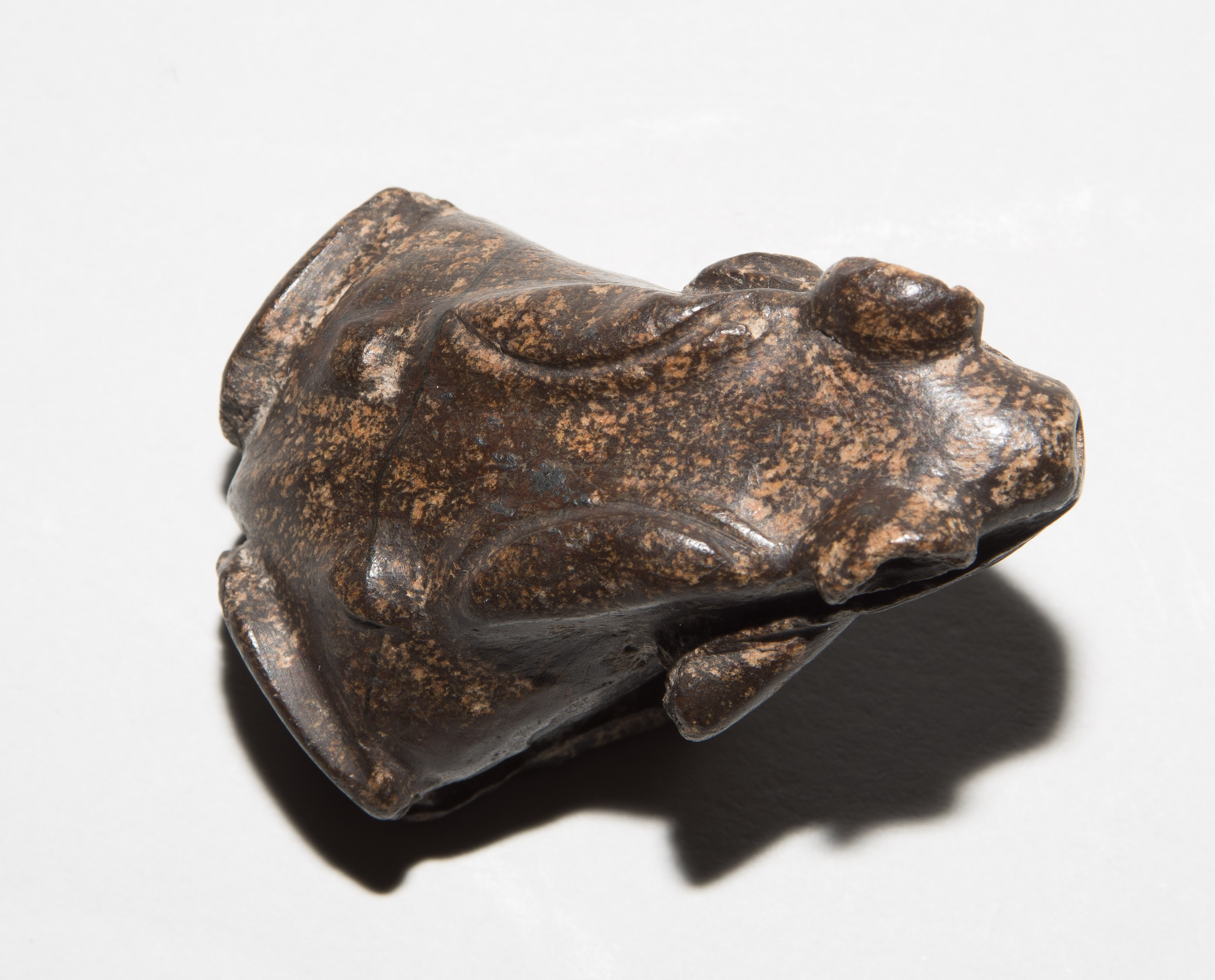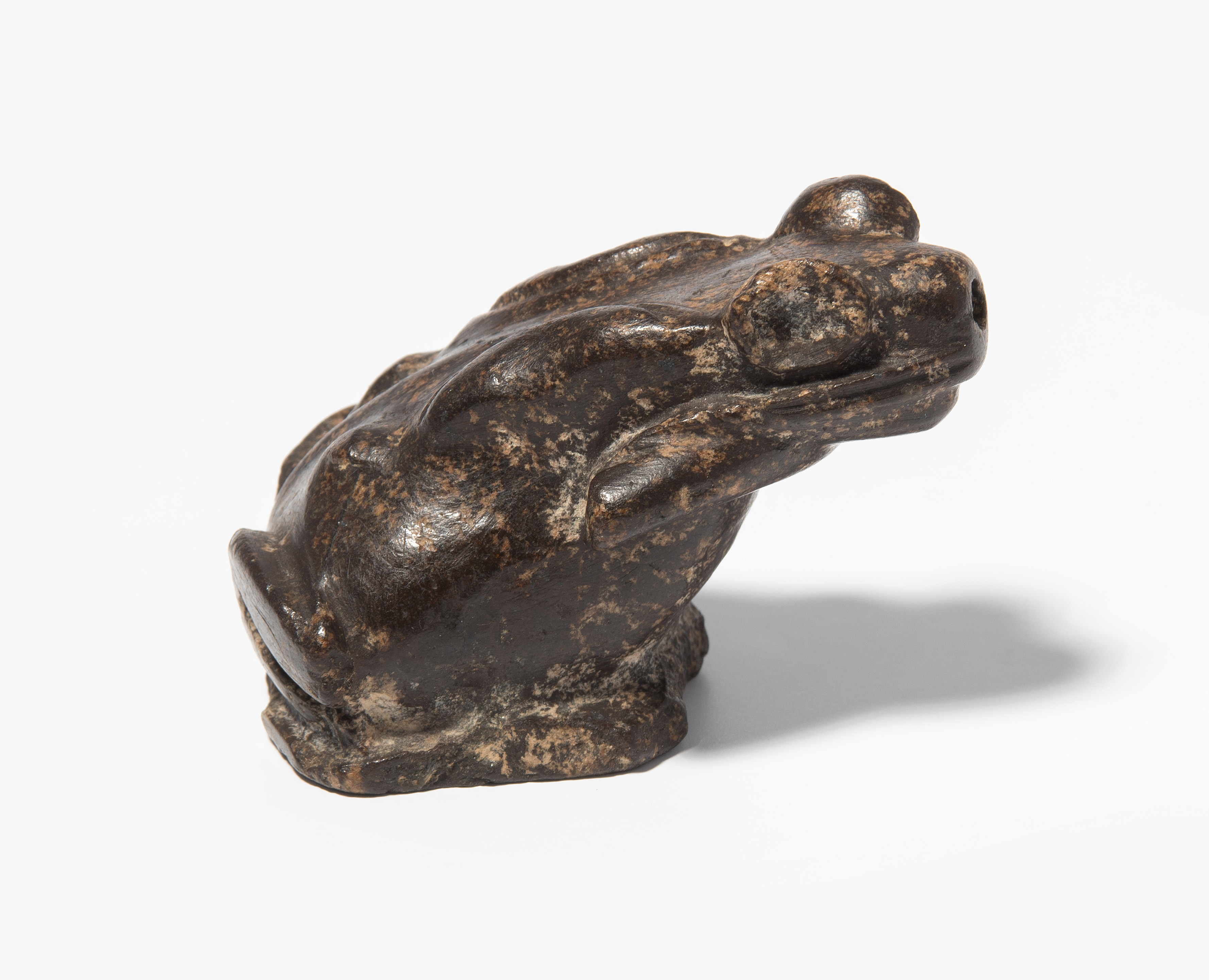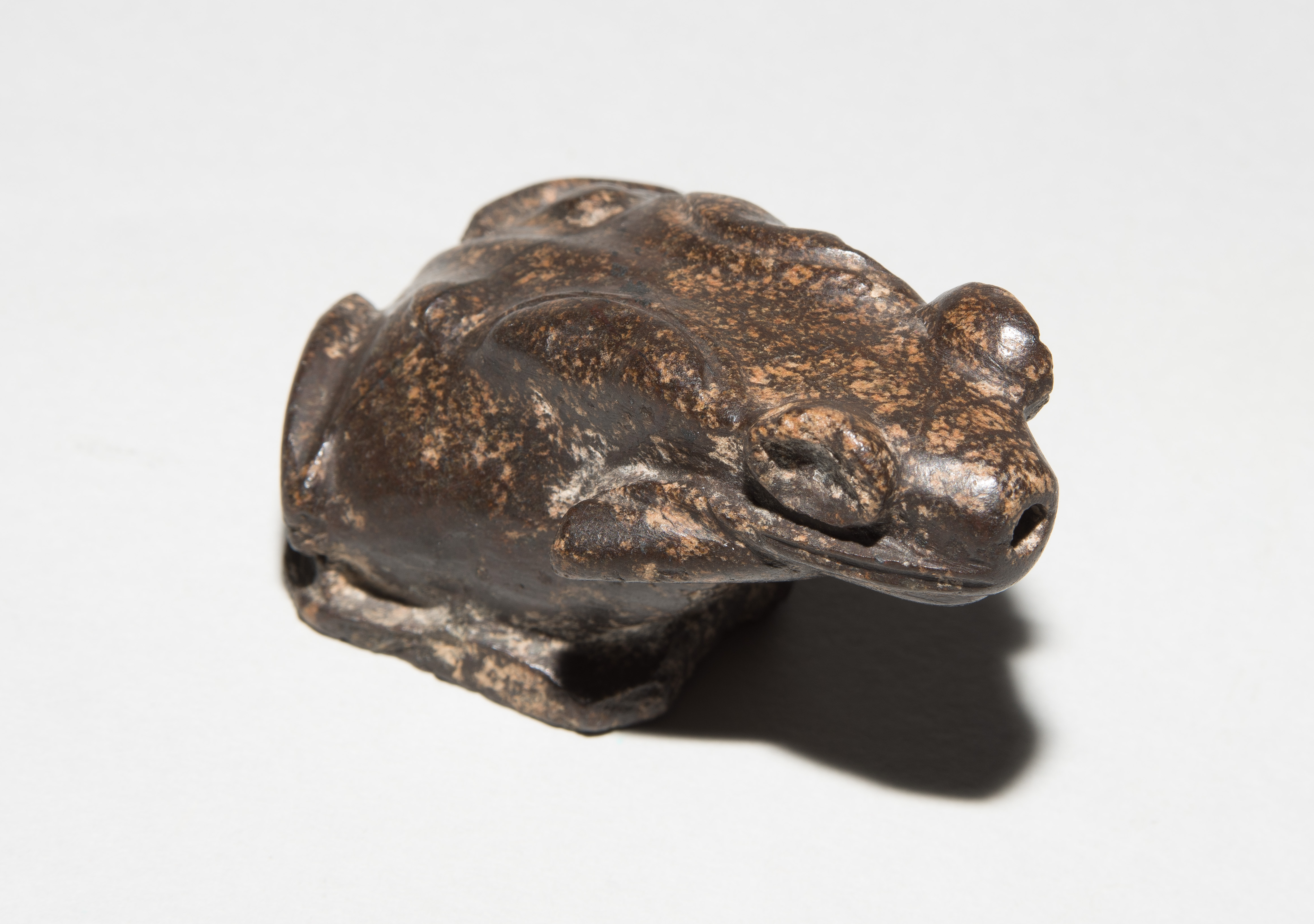 Ägypten, griechisch-römische Zeit. Wahrscheinlich Diorit/Marmor. Plastisch gestalteter Frosch, zum Sprung ansetzend. Vom Maul aus nach unten durchbohrt. H 4,5 cm.