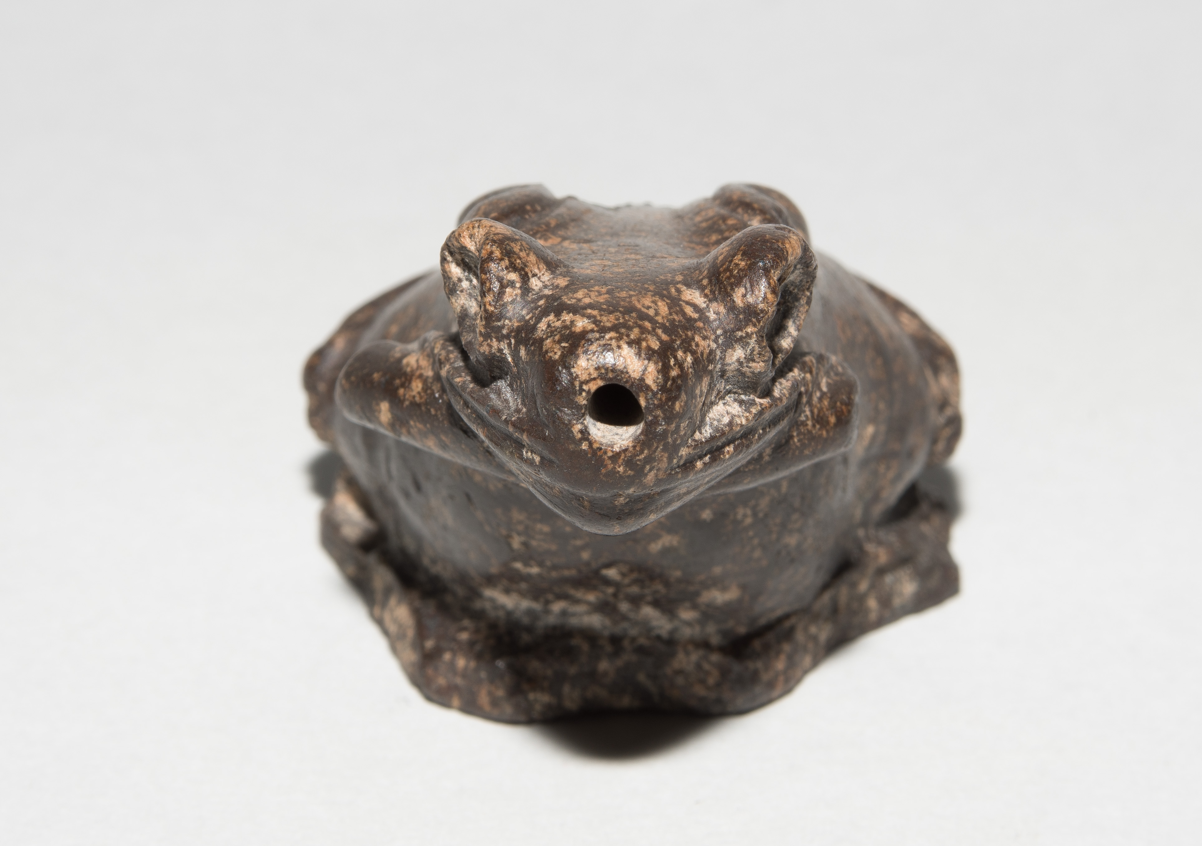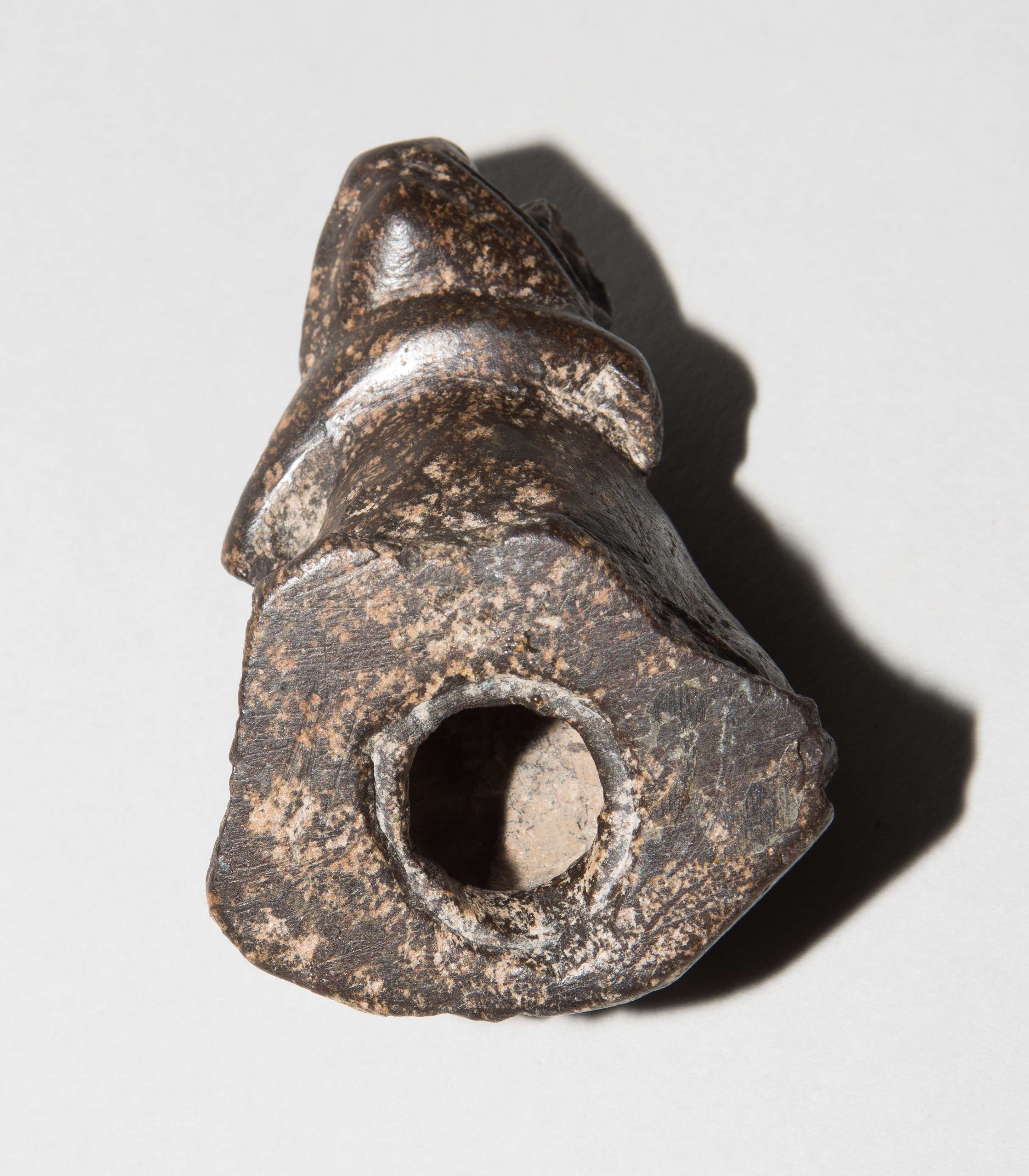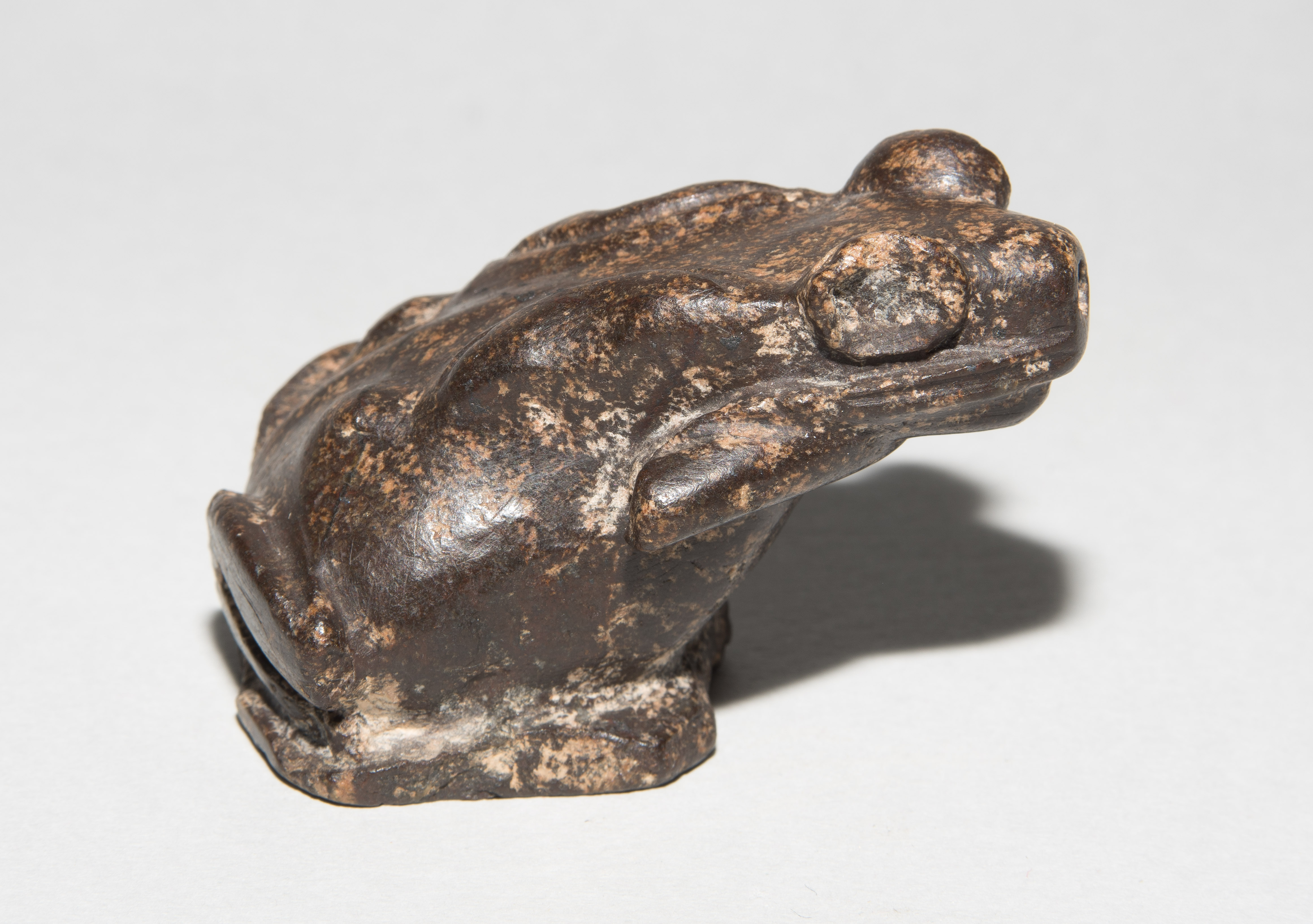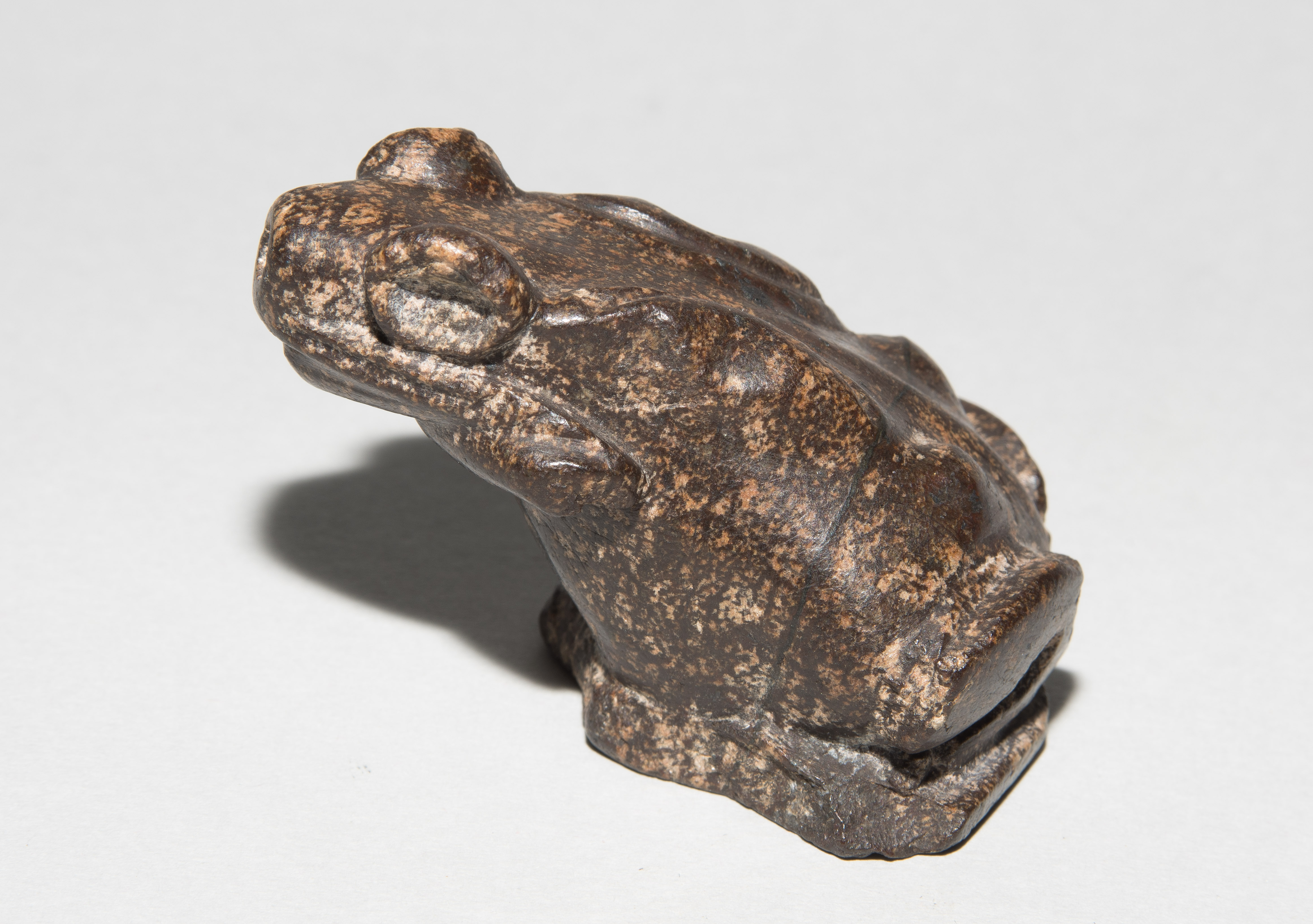 Ägypten, griechisch-römische Zeit. Wahrscheinlich Diorit/Marmor. Plastisch gestalteter Frosch, zum Sprung ansetzend. Vom Maul aus nach unten durchbohrt. H 4,5 cm.