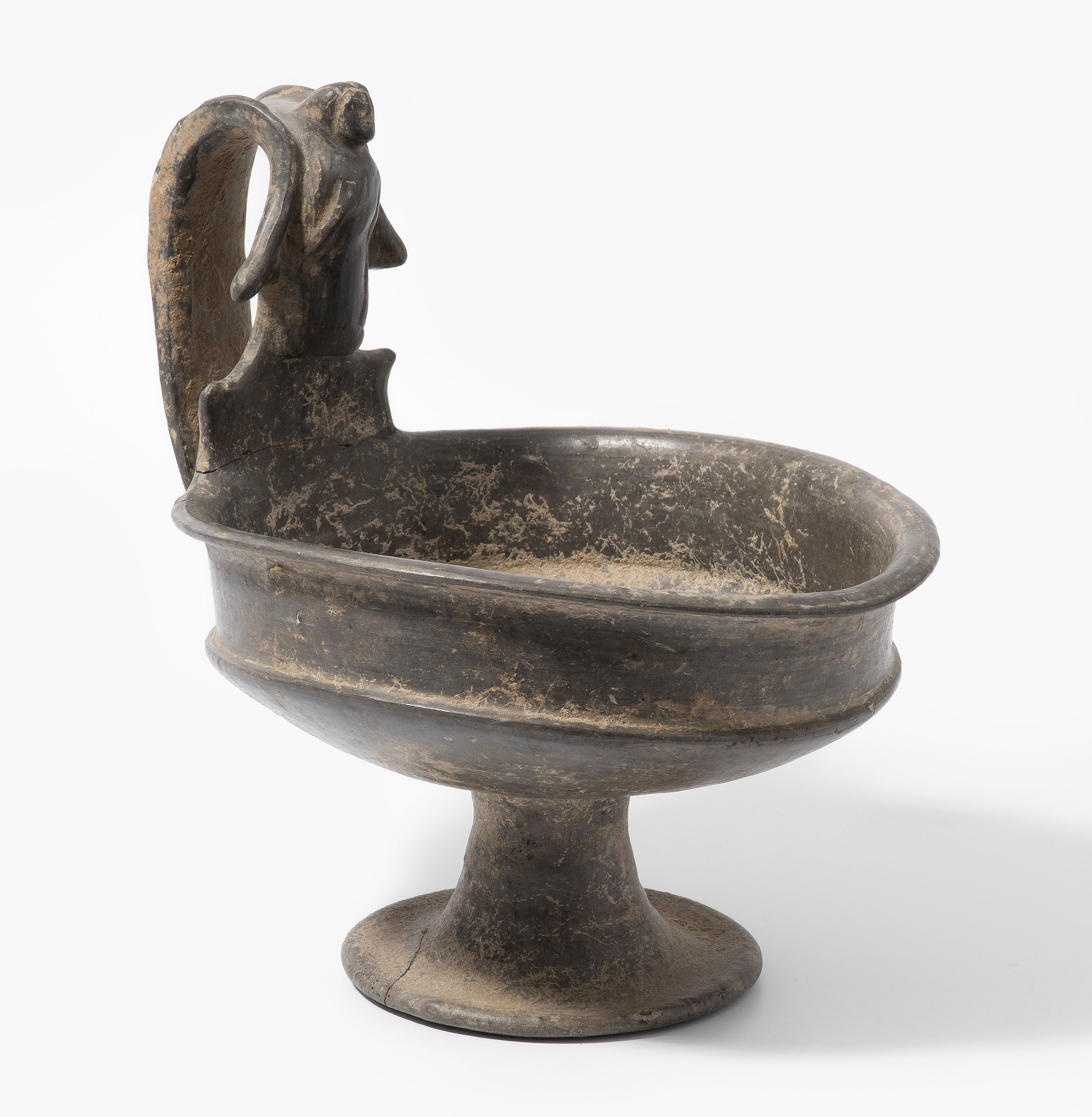 Villanova/frühetruskisch, 8./7.Jh. v. Chr. Dunkelbraunes Impasto. Schale auf hohem Fuss. Senkrechter Henkel mit reliefierter Figur. Spiegel verziert mit konzentrischen Kreisen. H 23, D 17,5 cm. - Fuss repariert, Henkel angesetzt, Risse.
