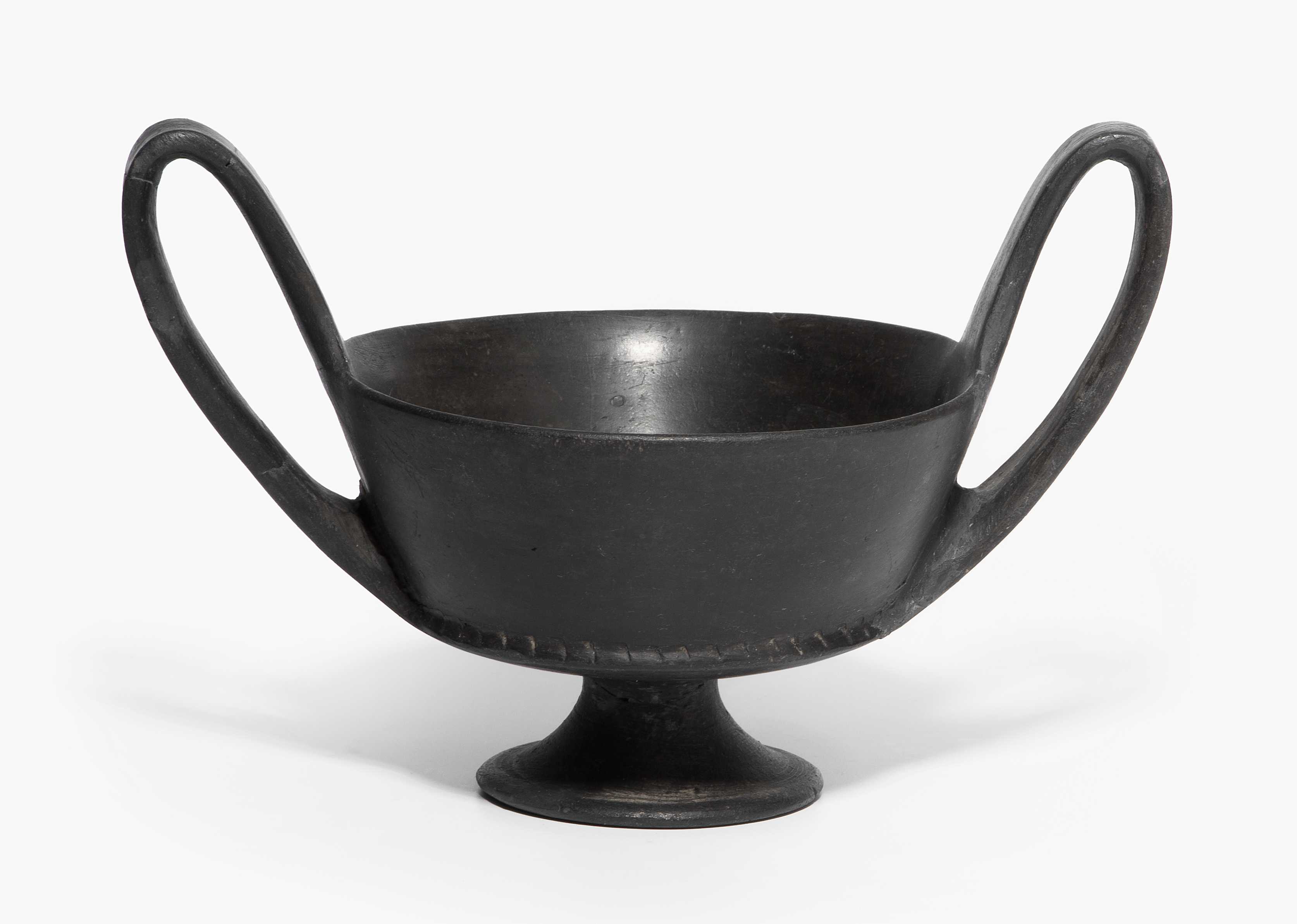 Italien, 6.Jh v. Chr. Bucchero-Keramik. Trinkgefäss mit zwei hochgezogenen Henkeln und niedrigem Fuss. Kerbendekor. D 11,8 cm, H 11,7 cm. - Zusammengesetzt, ergänzt.
