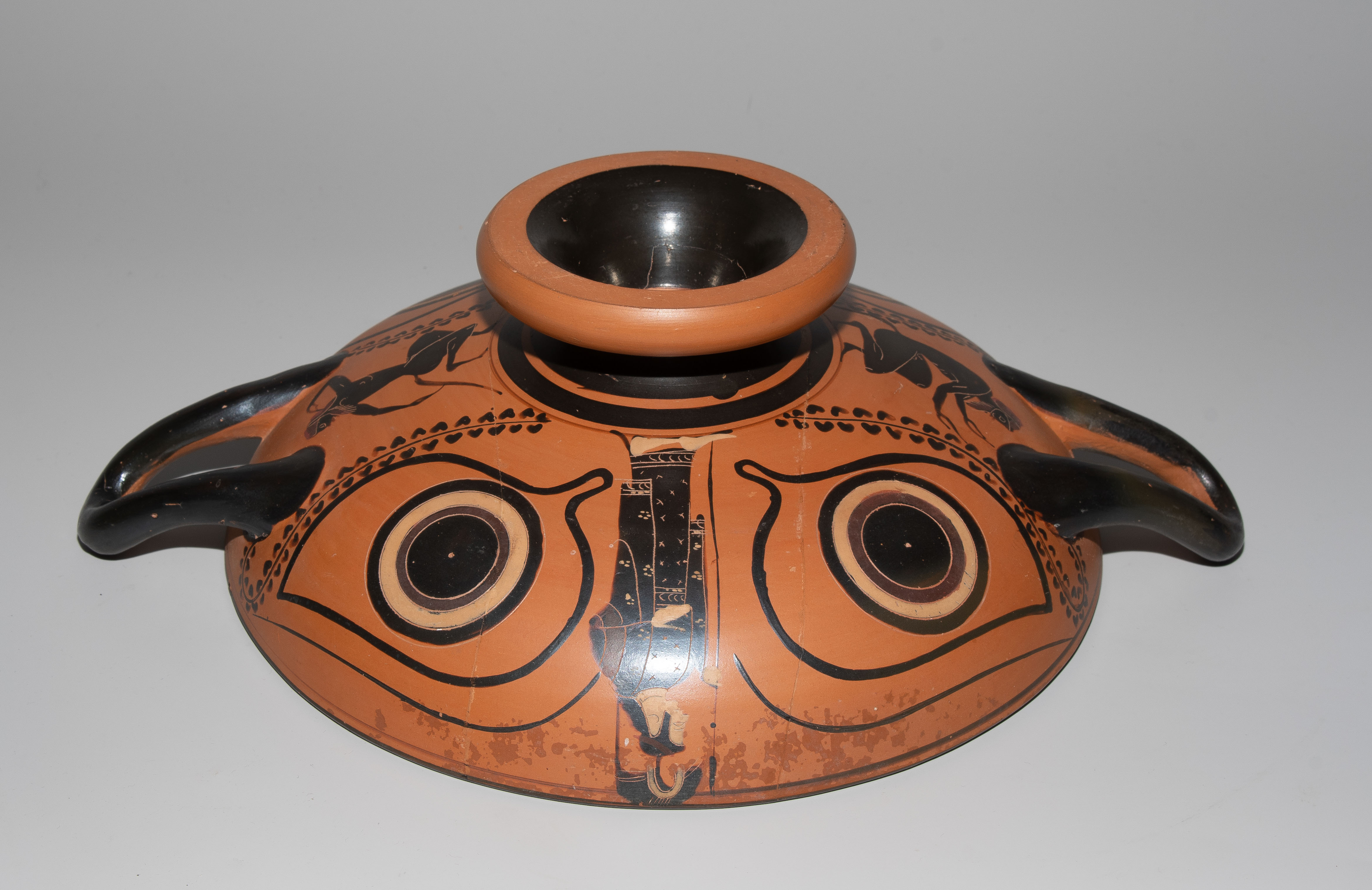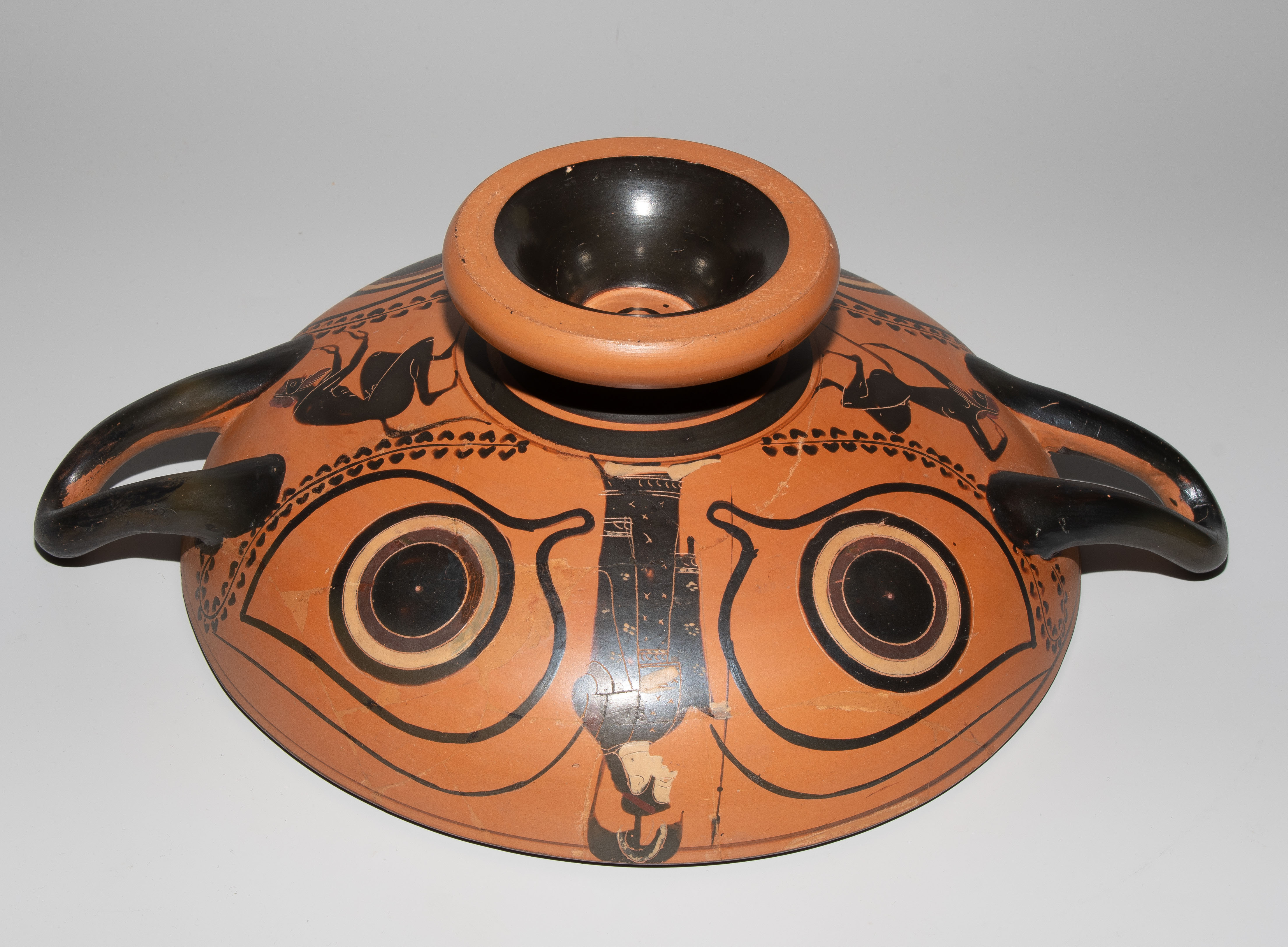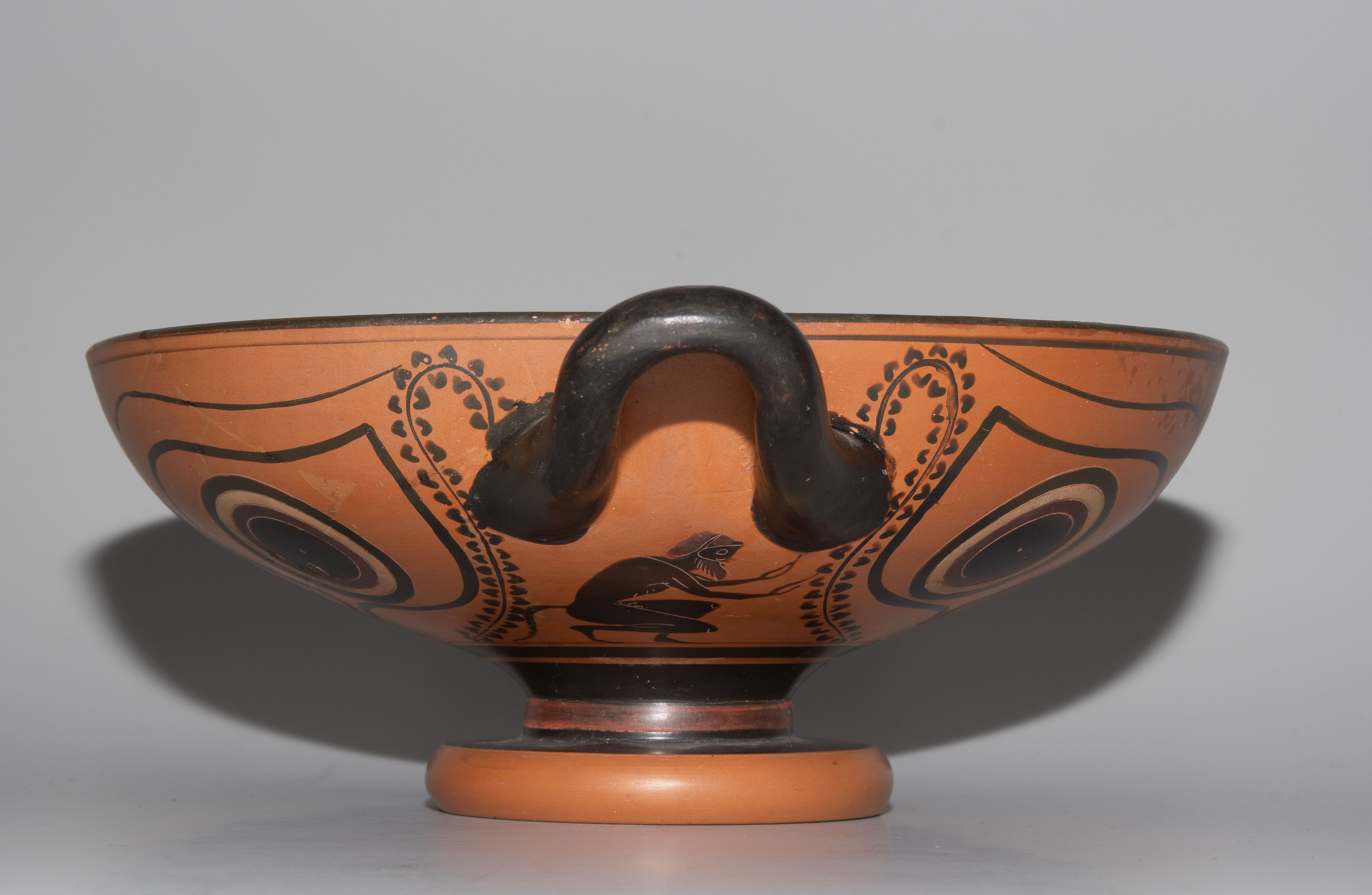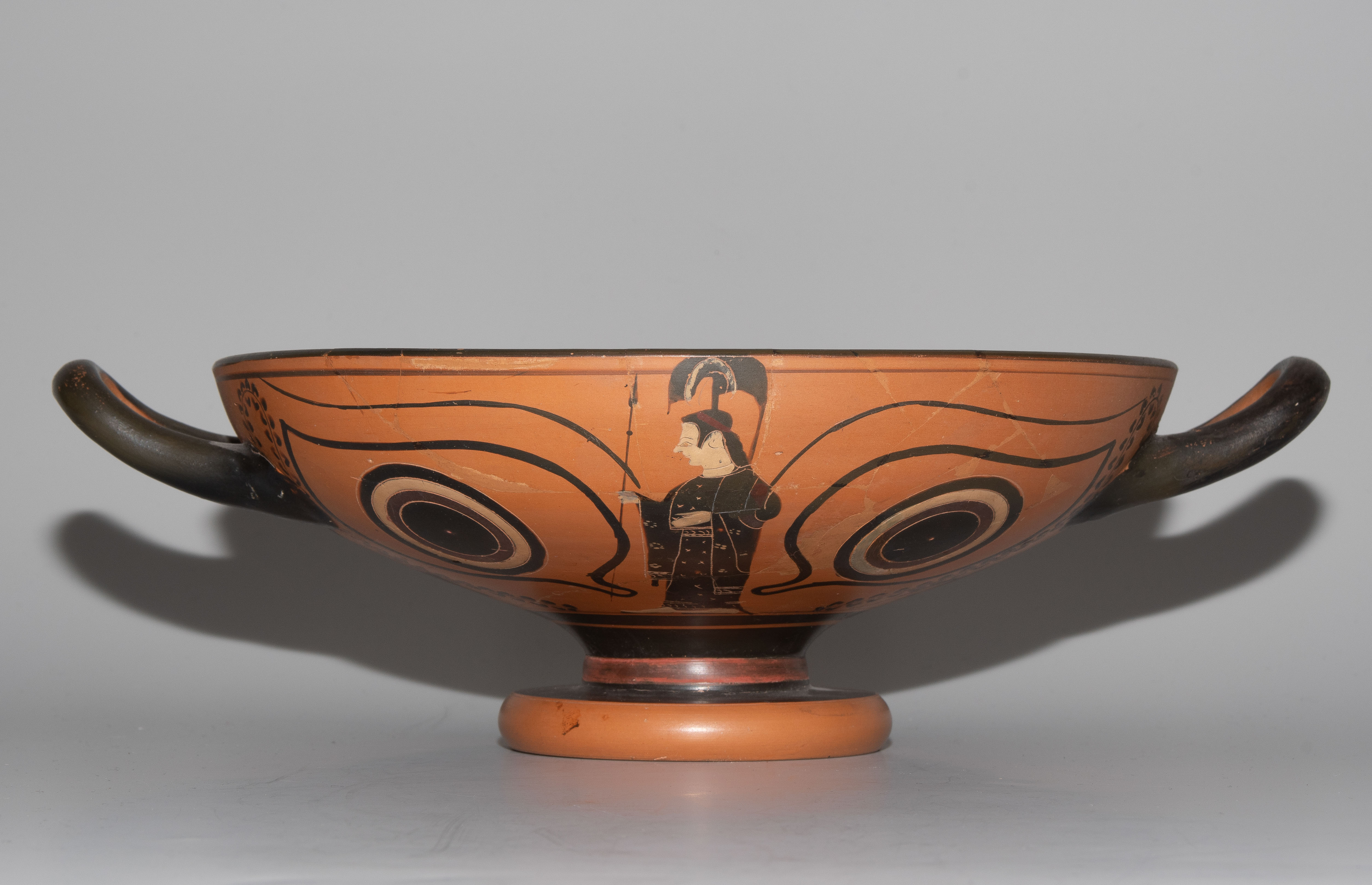 Attisch, 530–520 v. Chr. Schwarzfigurig. Zwischen grossen, schwarzen Augenpaaren mit roter Iris jeweils die Göttin Athene. Unter den Henkeln je ein Satyr. H 8,7, D 28,5 cm.