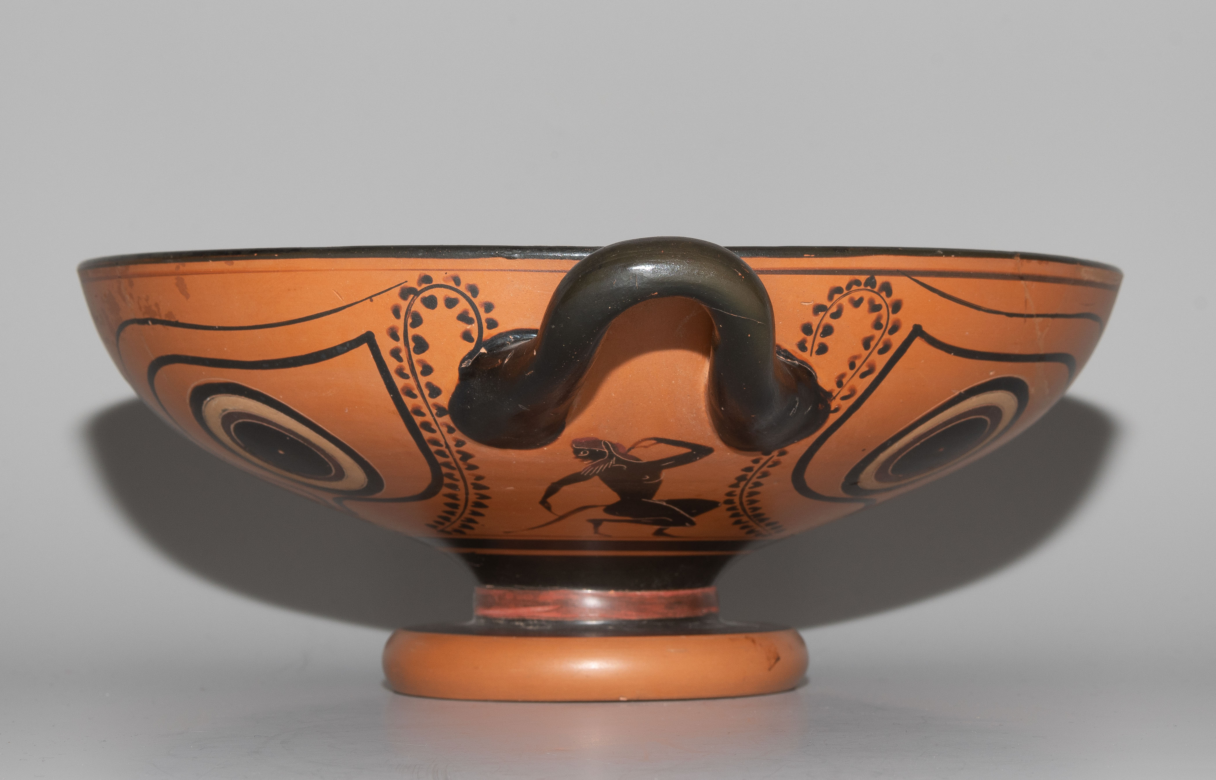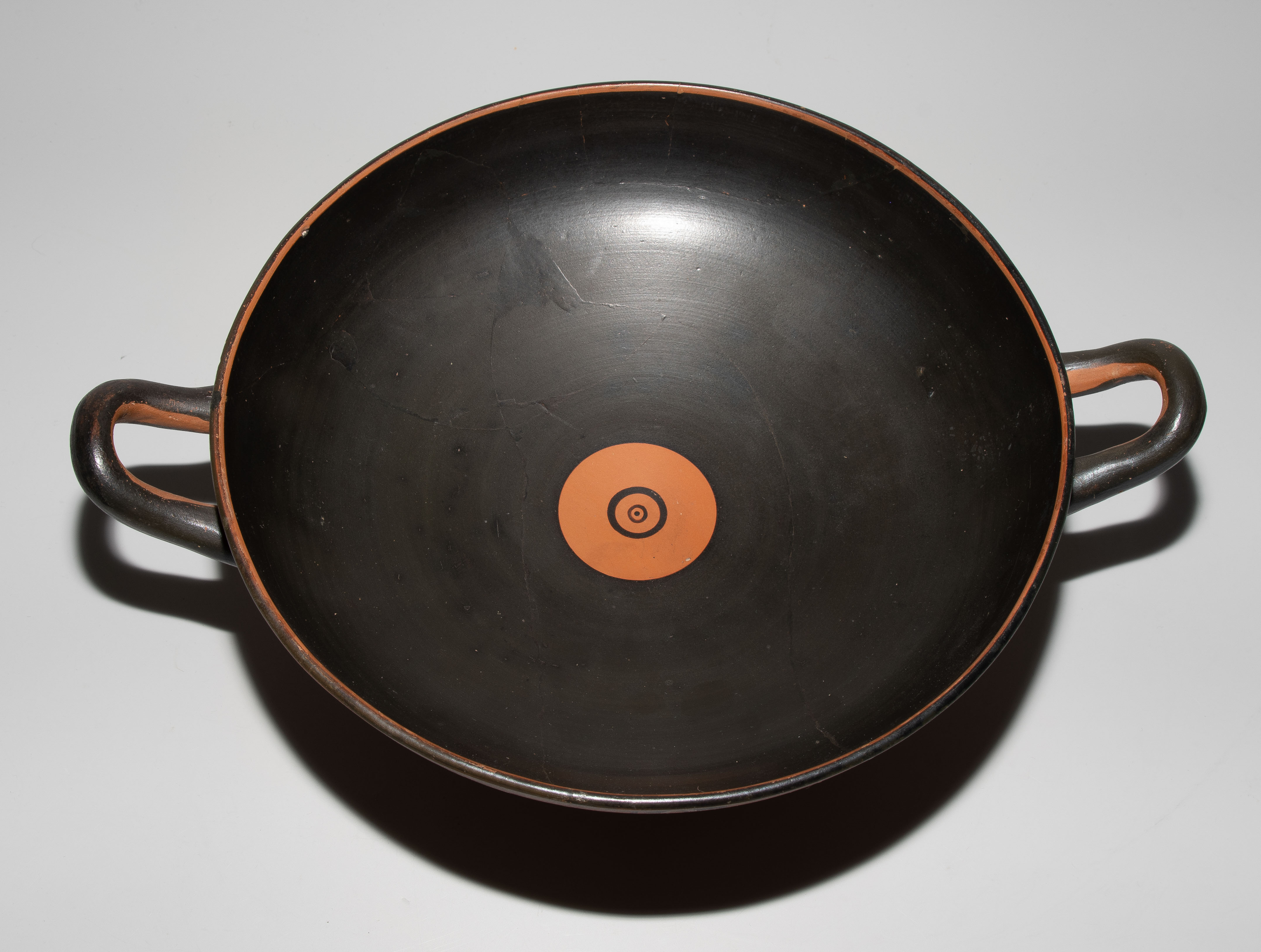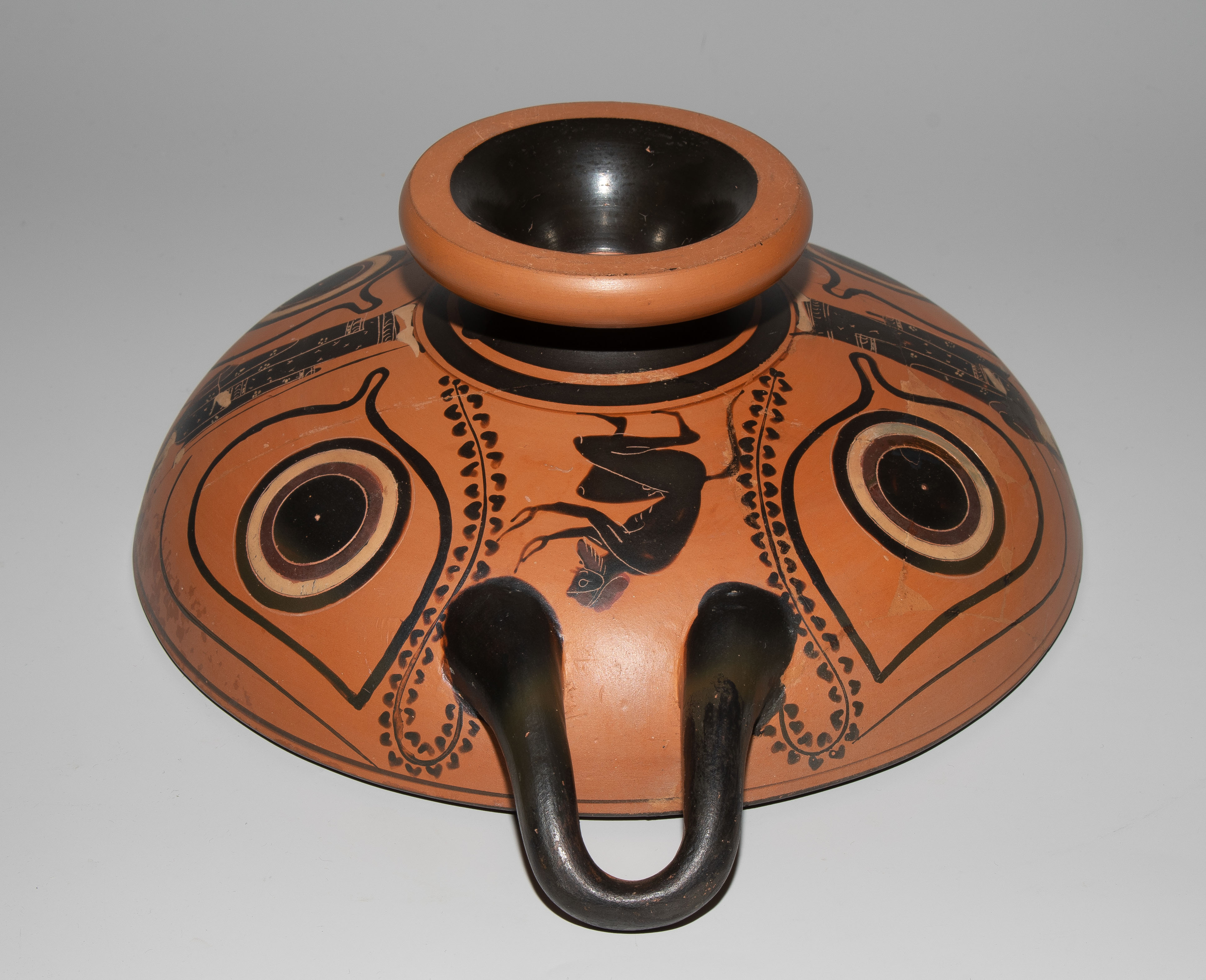 Attisch, 530–520 v. Chr. Schwarzfigurig. Zwischen grossen, schwarzen Augenpaaren mit roter Iris jeweils die Göttin Athene. Unter den Henkeln je ein Satyr. H 8,7, D 28,5 cm.