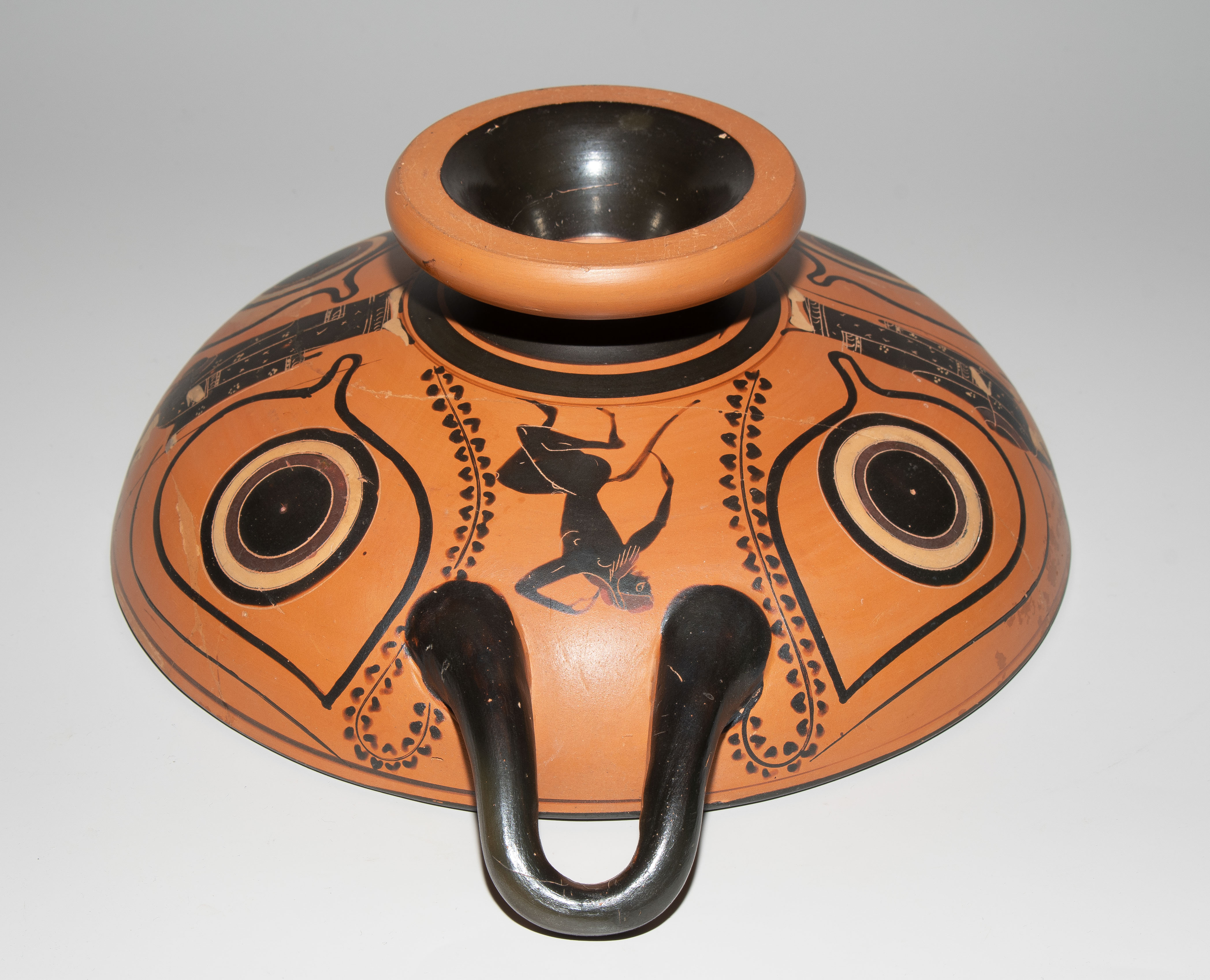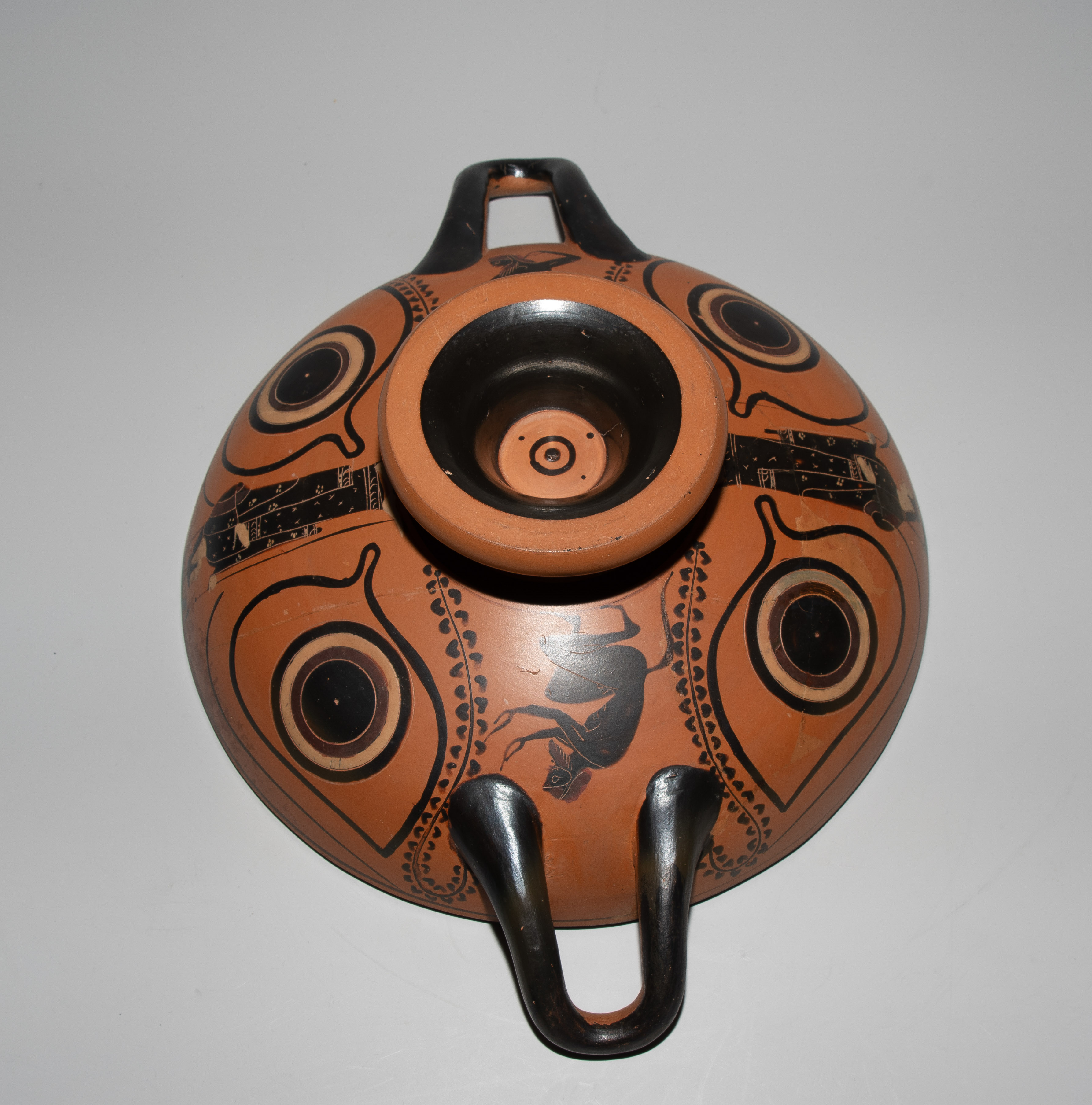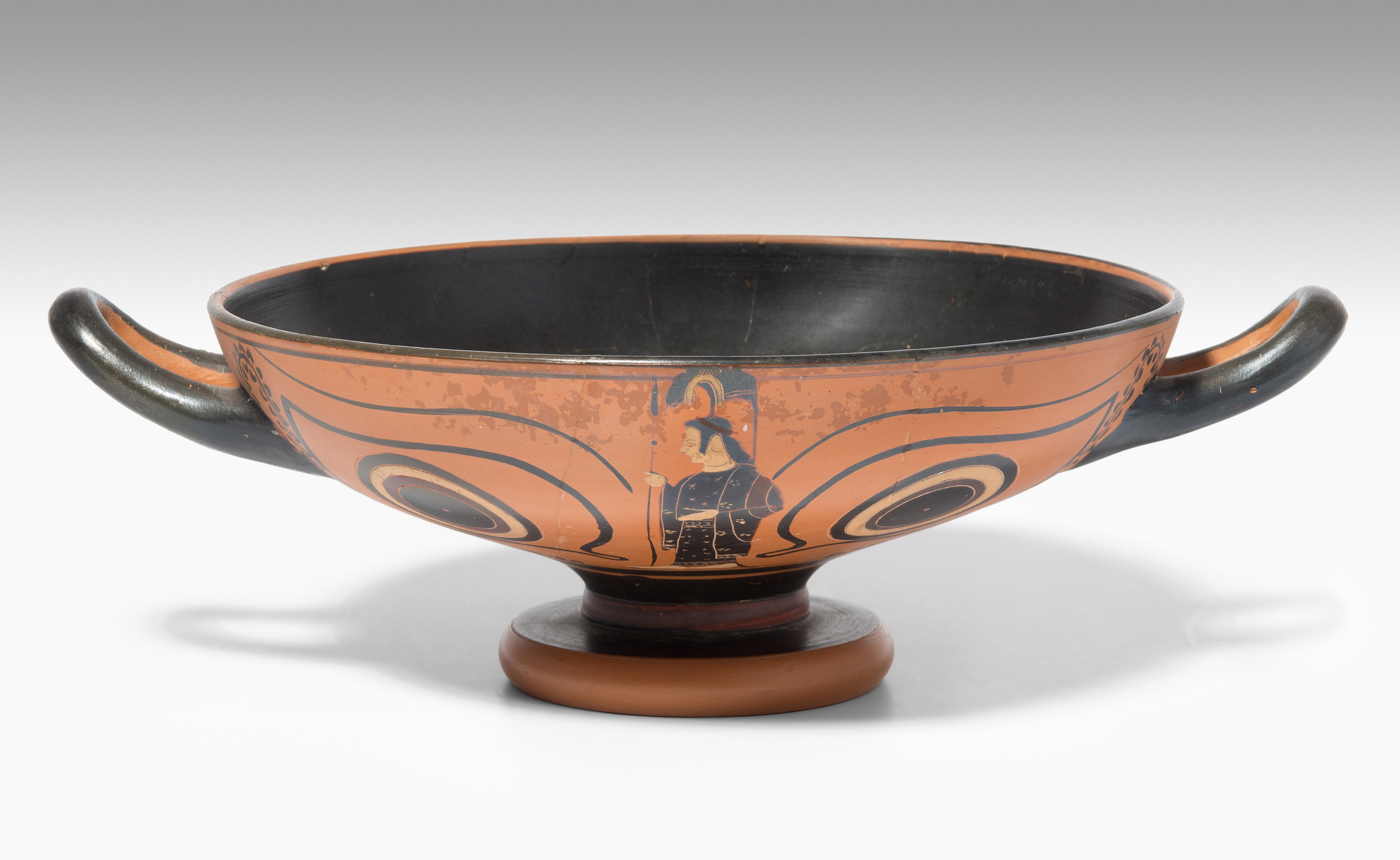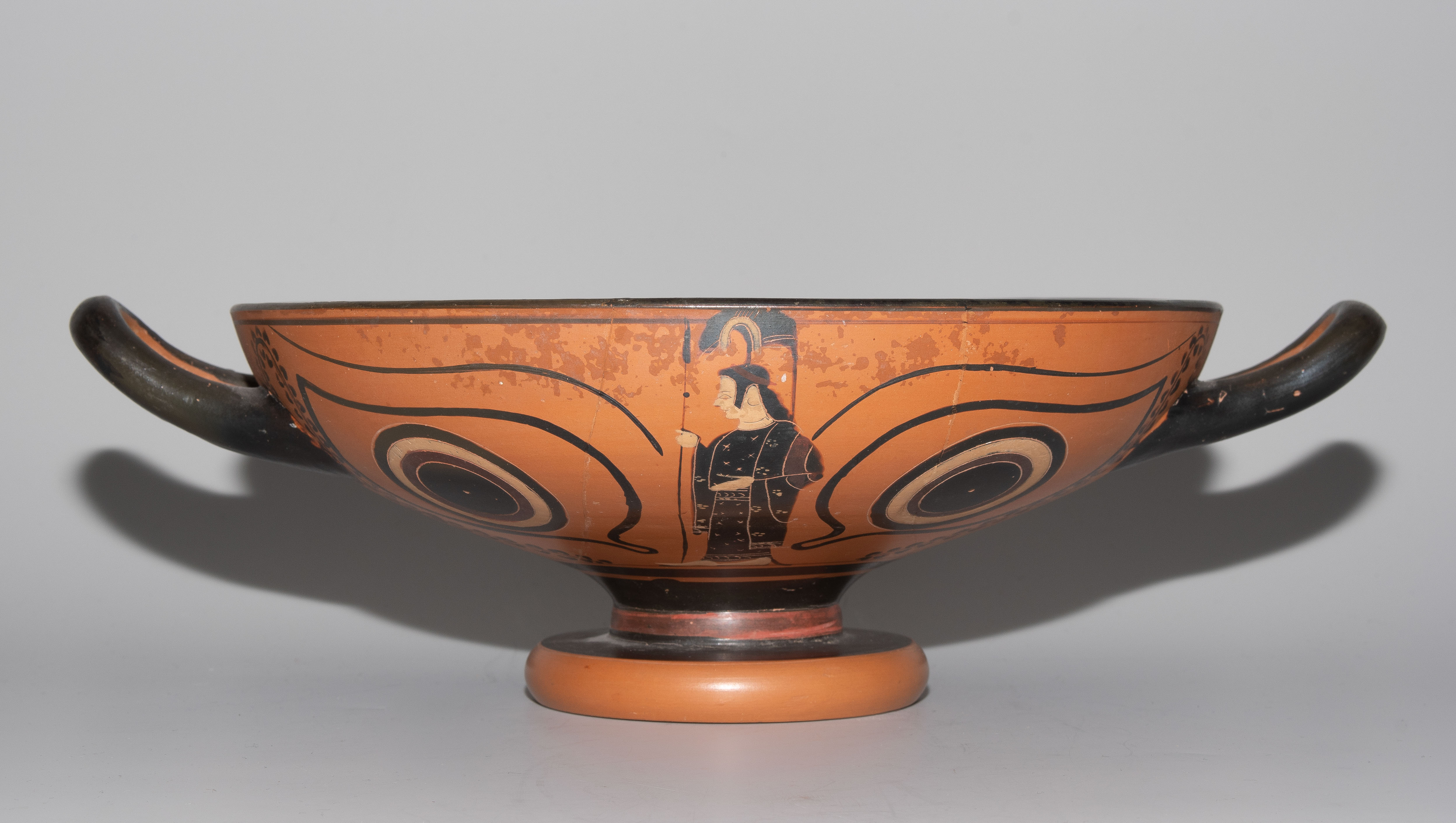 Attisch, 530–520 v. Chr. Schwarzfigurig. Zwischen grossen, schwarzen Augenpaaren mit roter Iris jeweils die Göttin Athene. Unter den Henkeln je ein Satyr. H 8,7, D 28,5 cm.