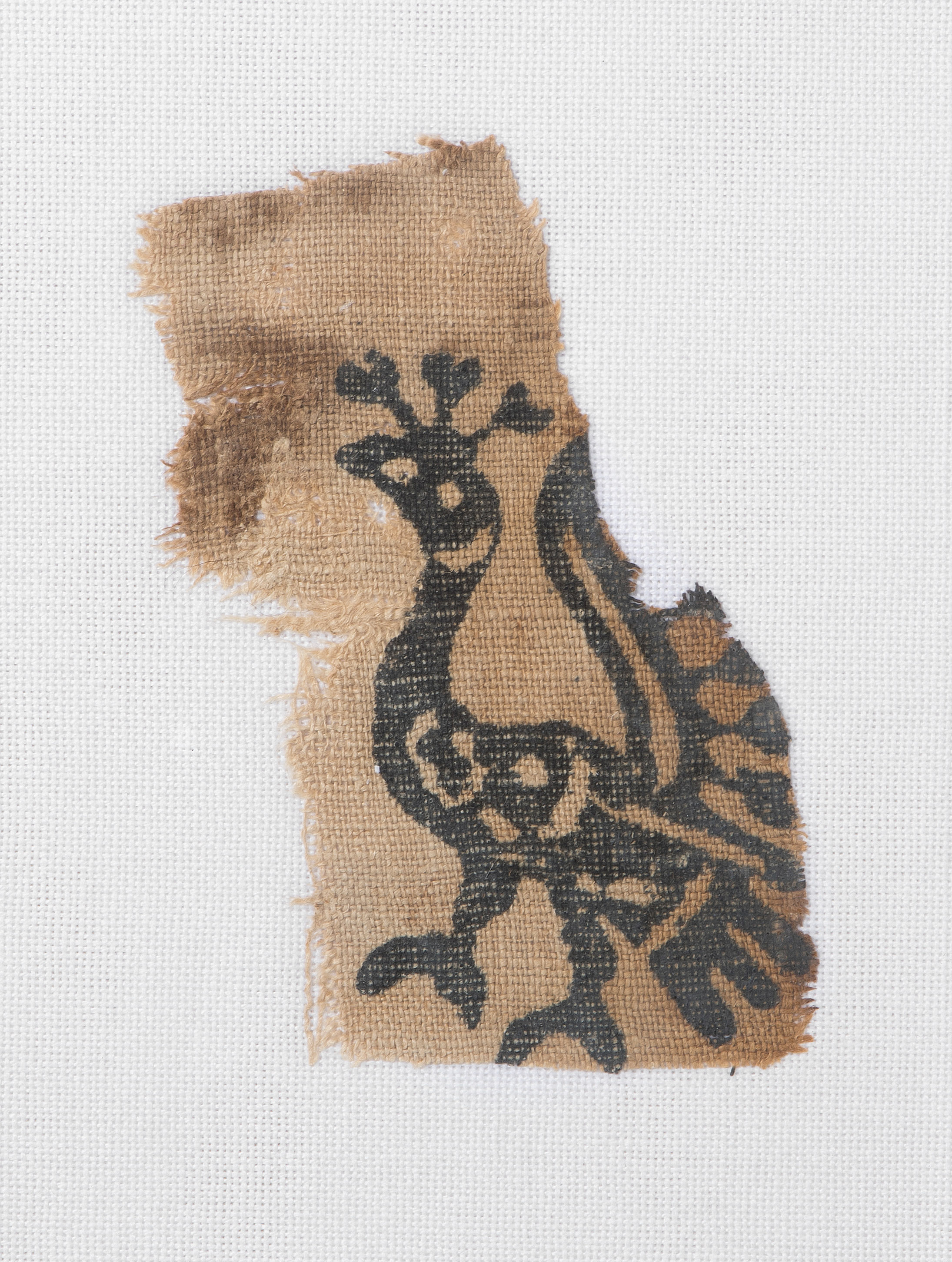 Vorderasien, 11.–12. Jh. Leinen. Gedruckte Darstellung eines Pfaus in schwarz auf naturfarbenem Grund. 11x8 cm. Gerahmt.