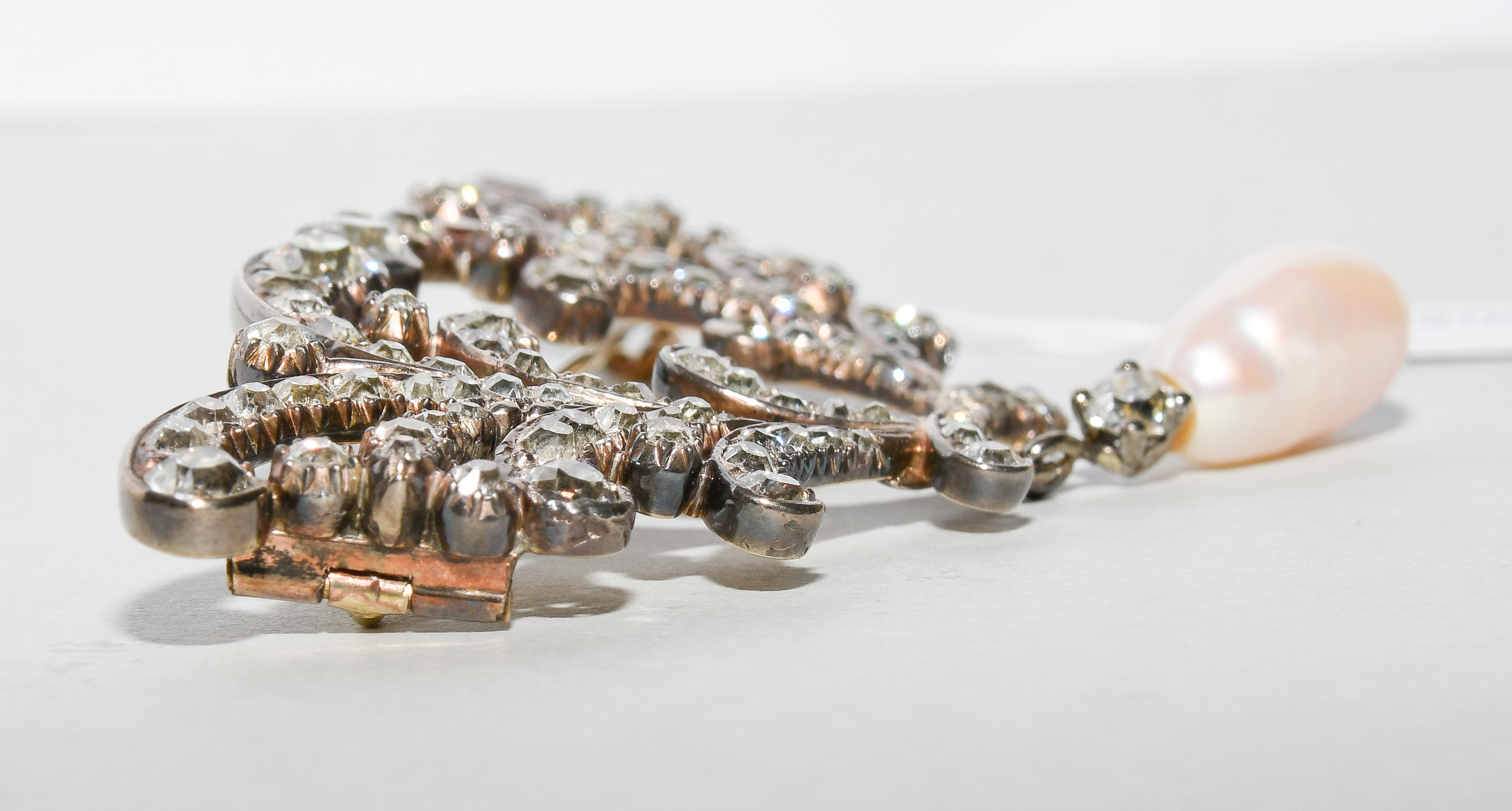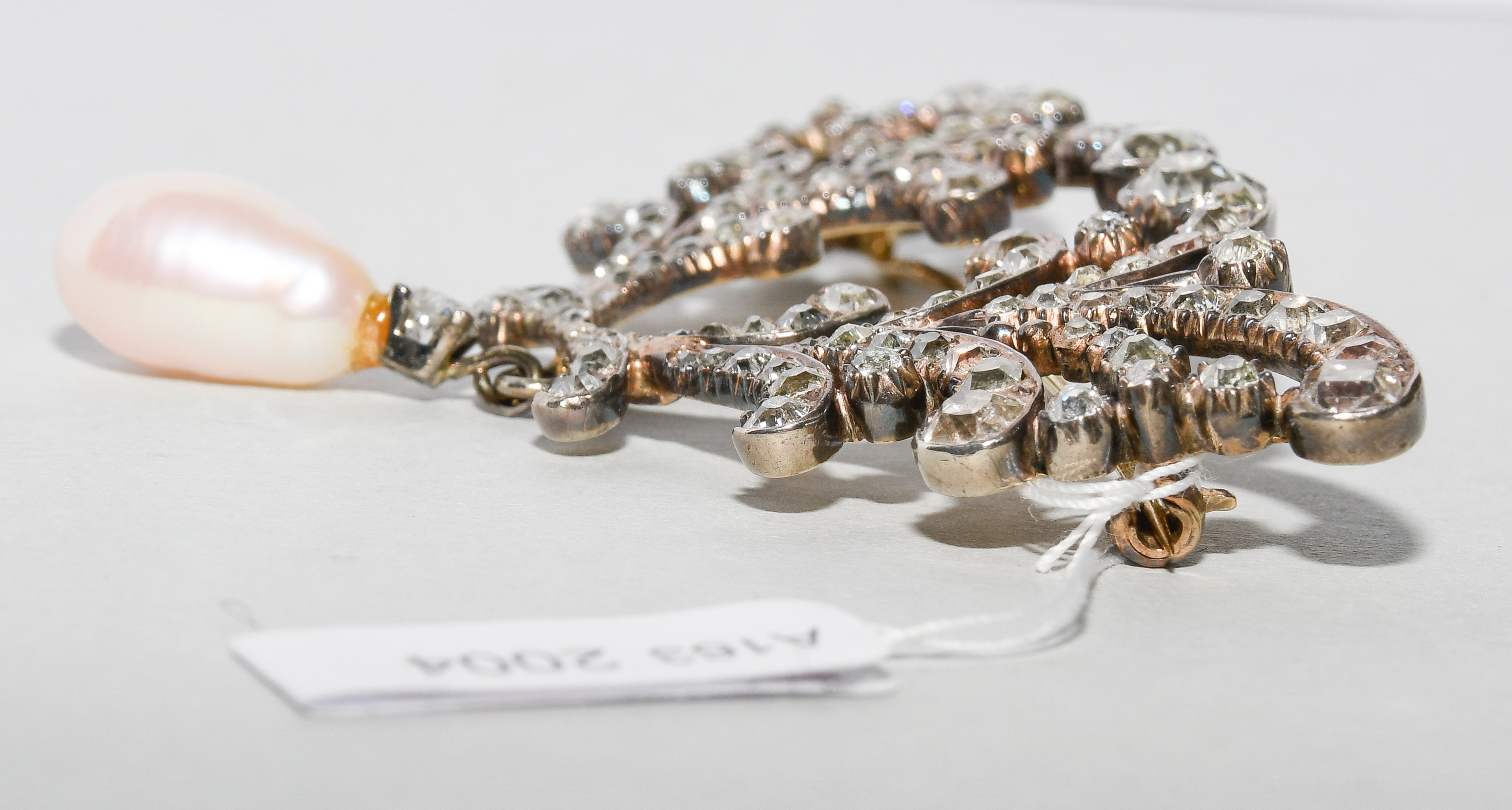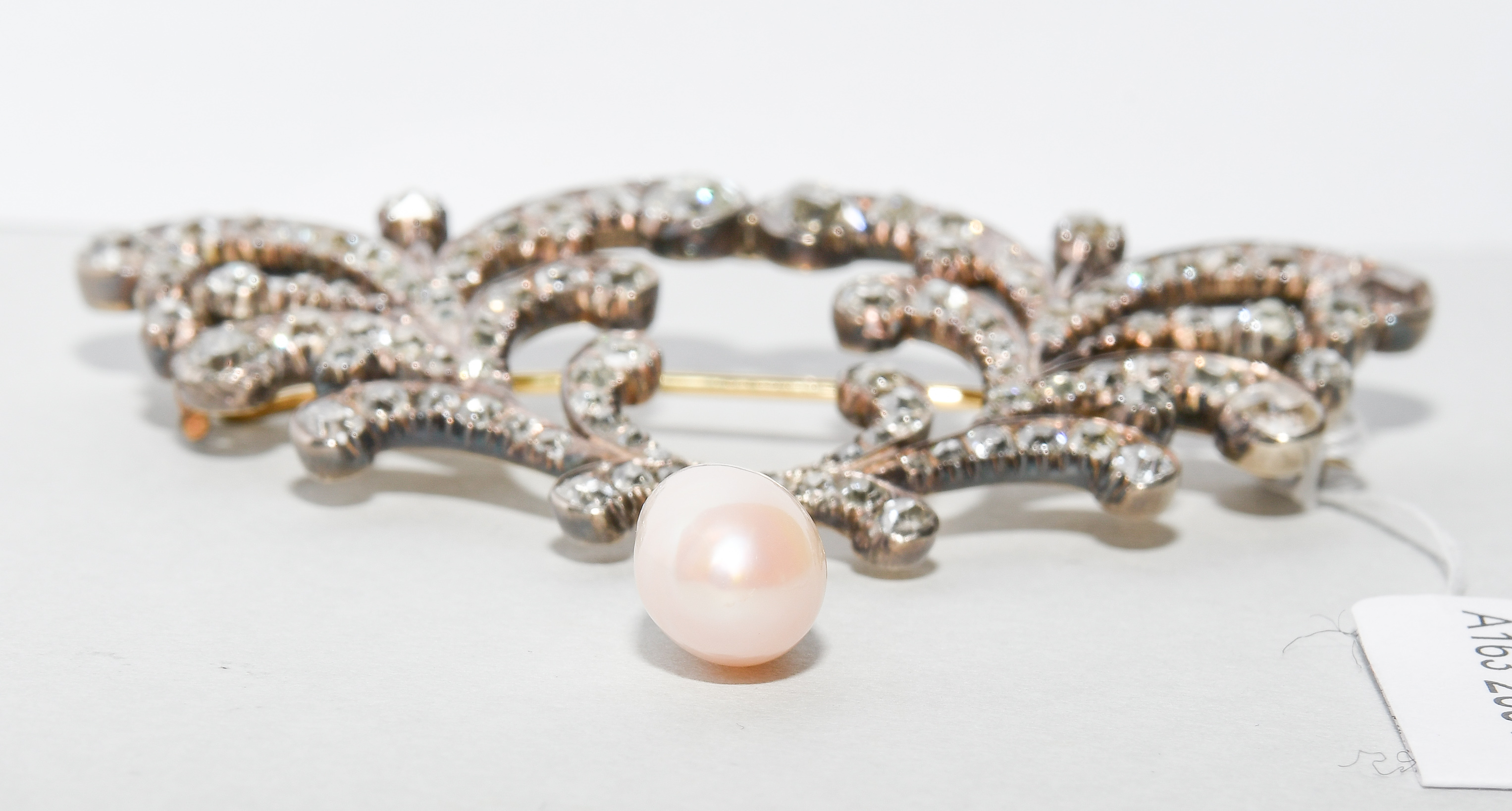 1.H. 19.Jh. Modifiziert. Silber/Gelbgold. Federmotive ausgefasst mit Altschliff-Diamanten ca. 3.80 ct, hängend ein Süsswassperltropfen (neuer). 6x5 cm, 14,1 g.